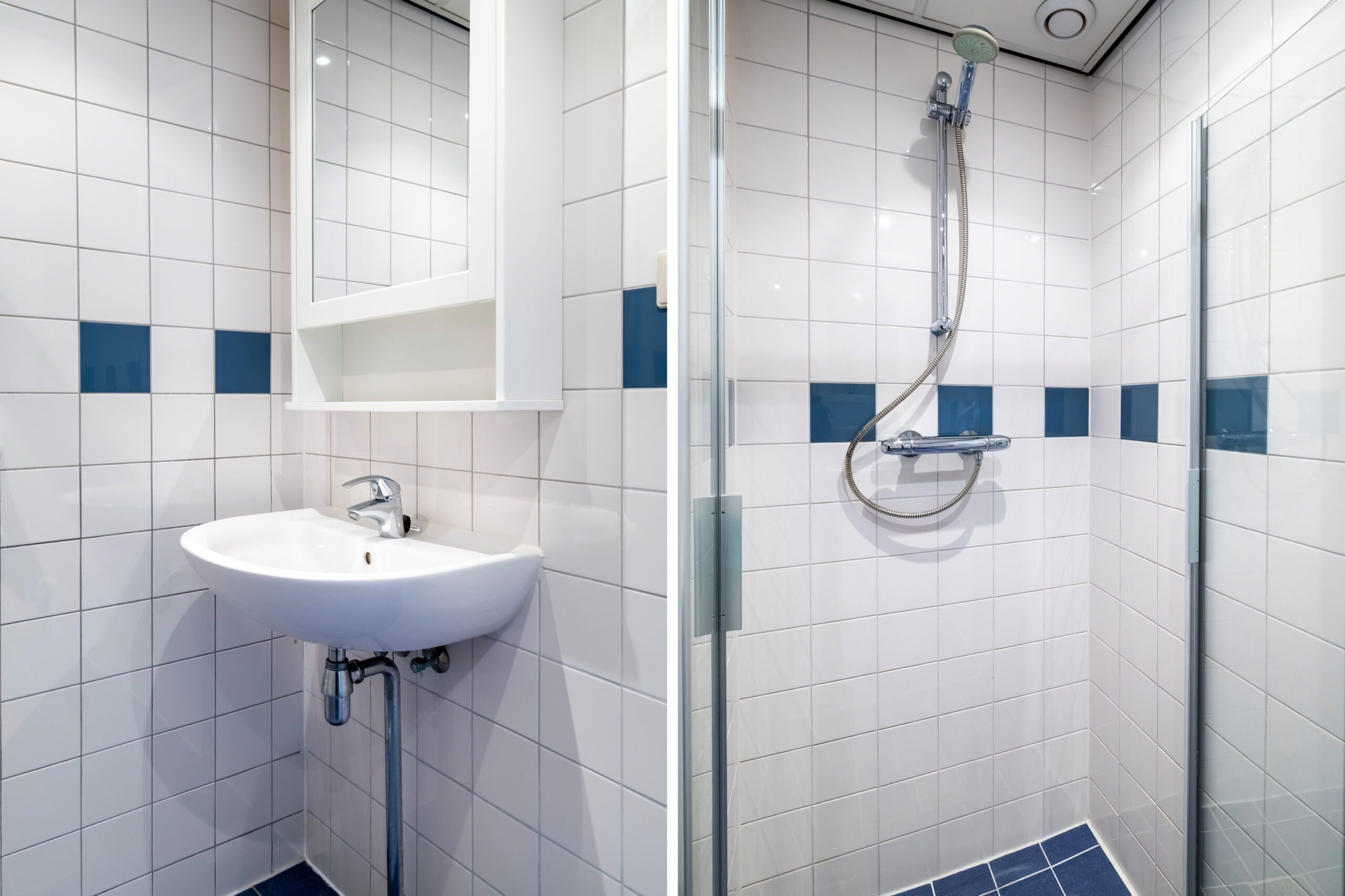 - Inpandige geheel betegelde badkamer voorzien van douche, wastafelmeubel, designradiator en wasmachine-aansluiting.