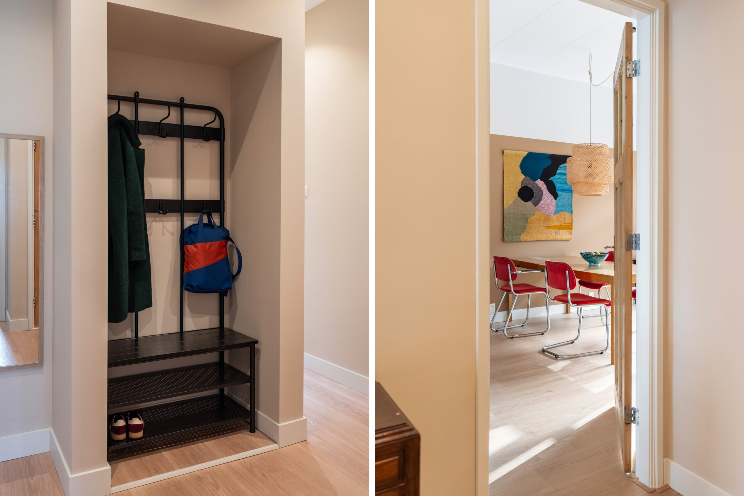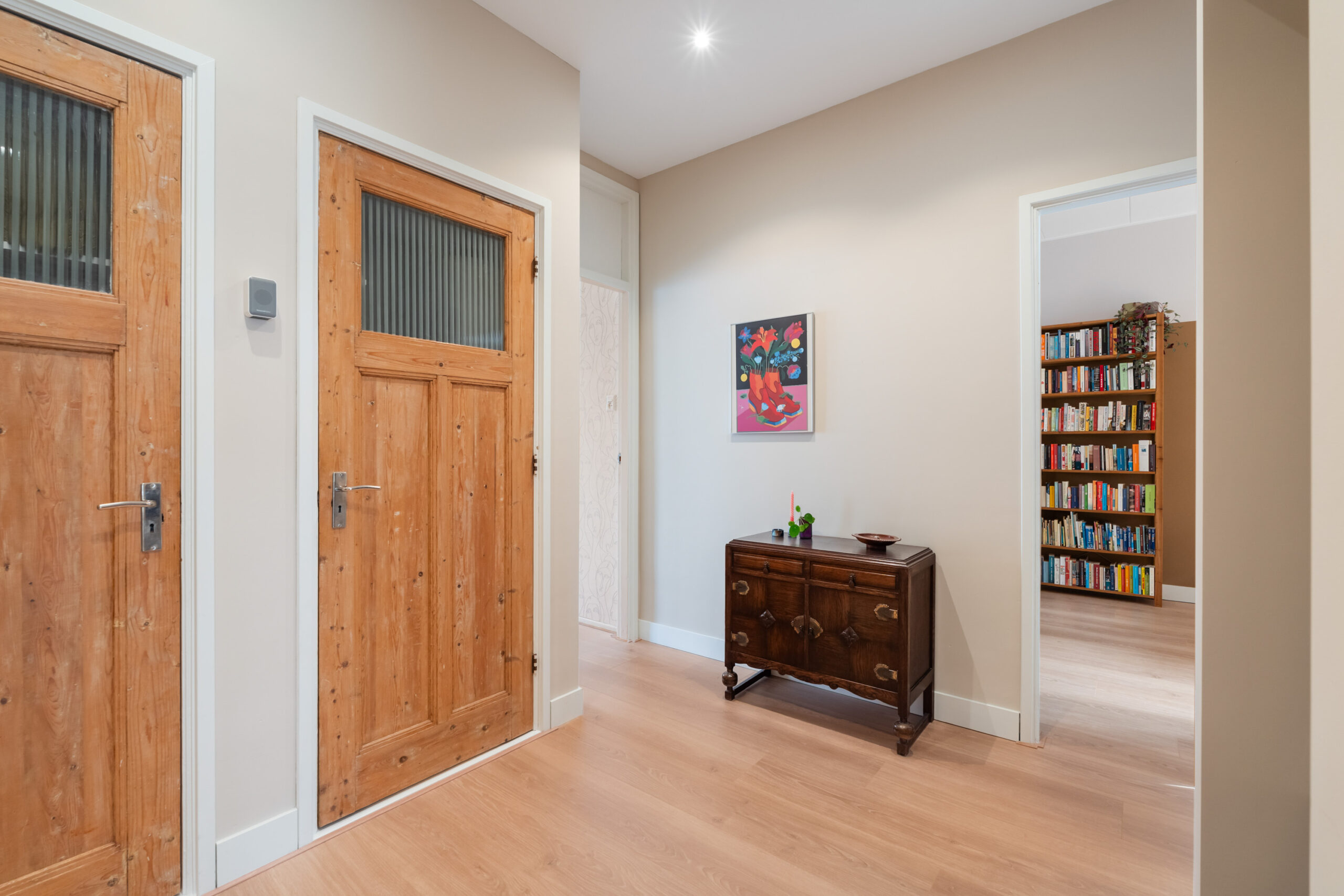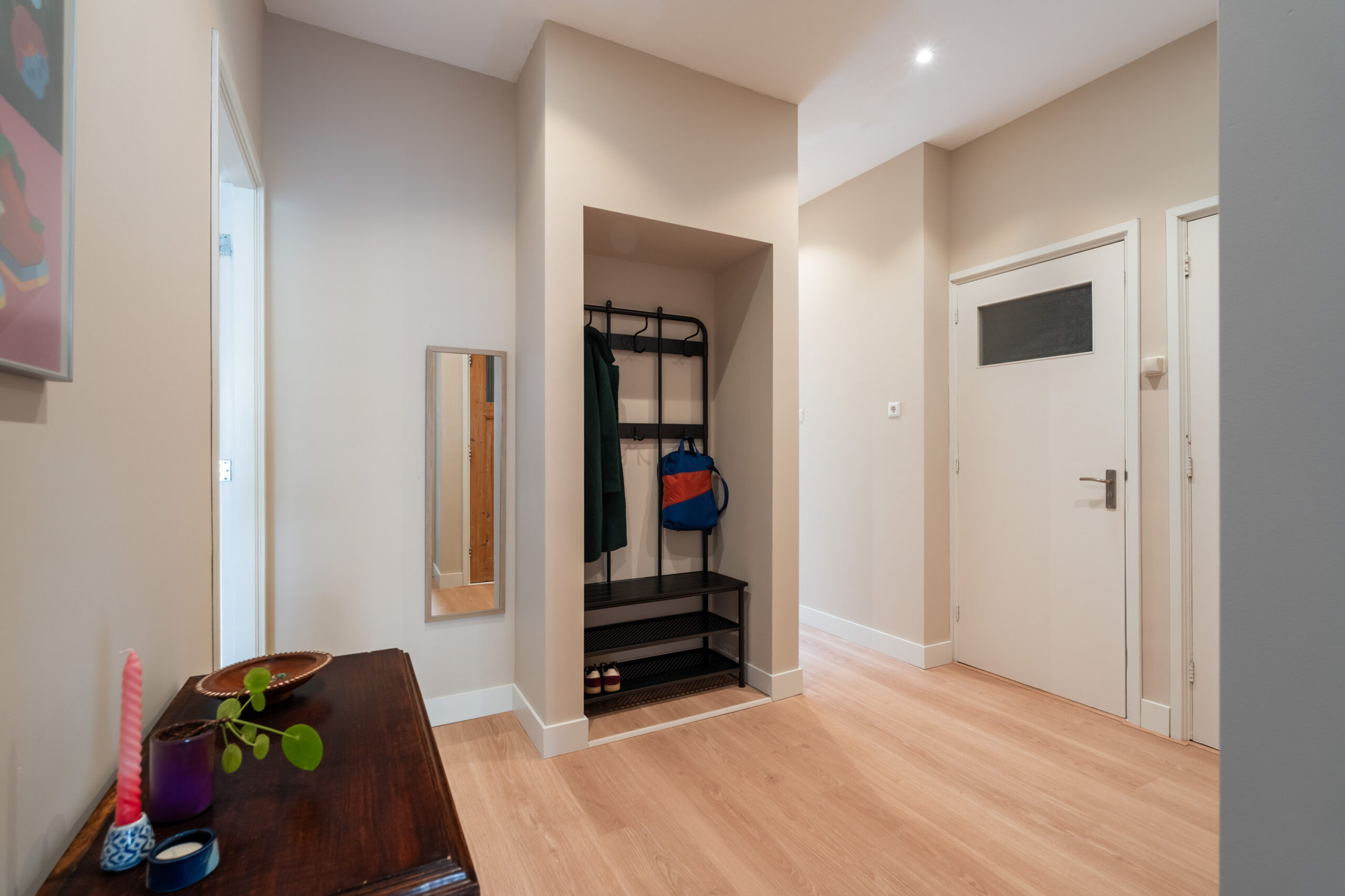 - Tevens is de hal voorzien van diverse vaste kasten, waaronder die met de wasmachineaansluiting en een handige garderobe;