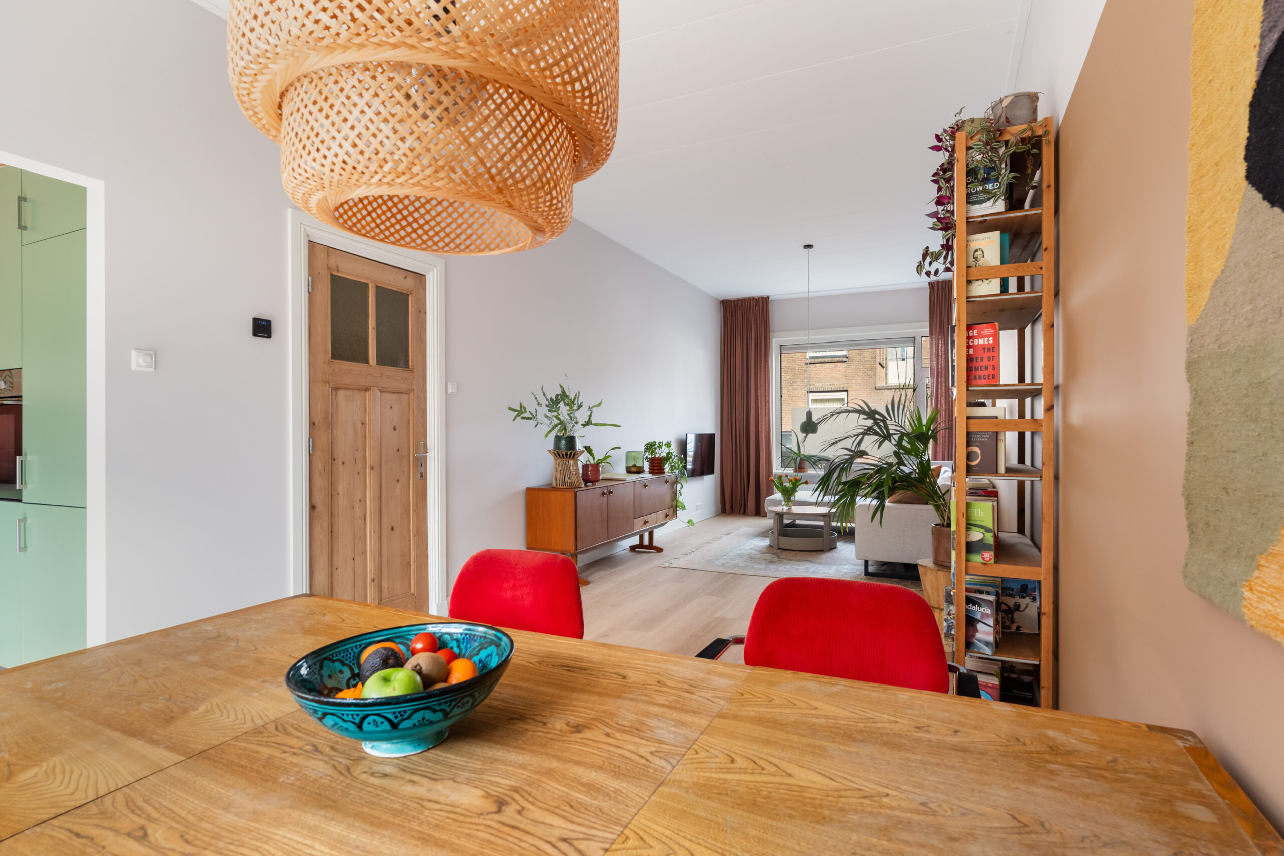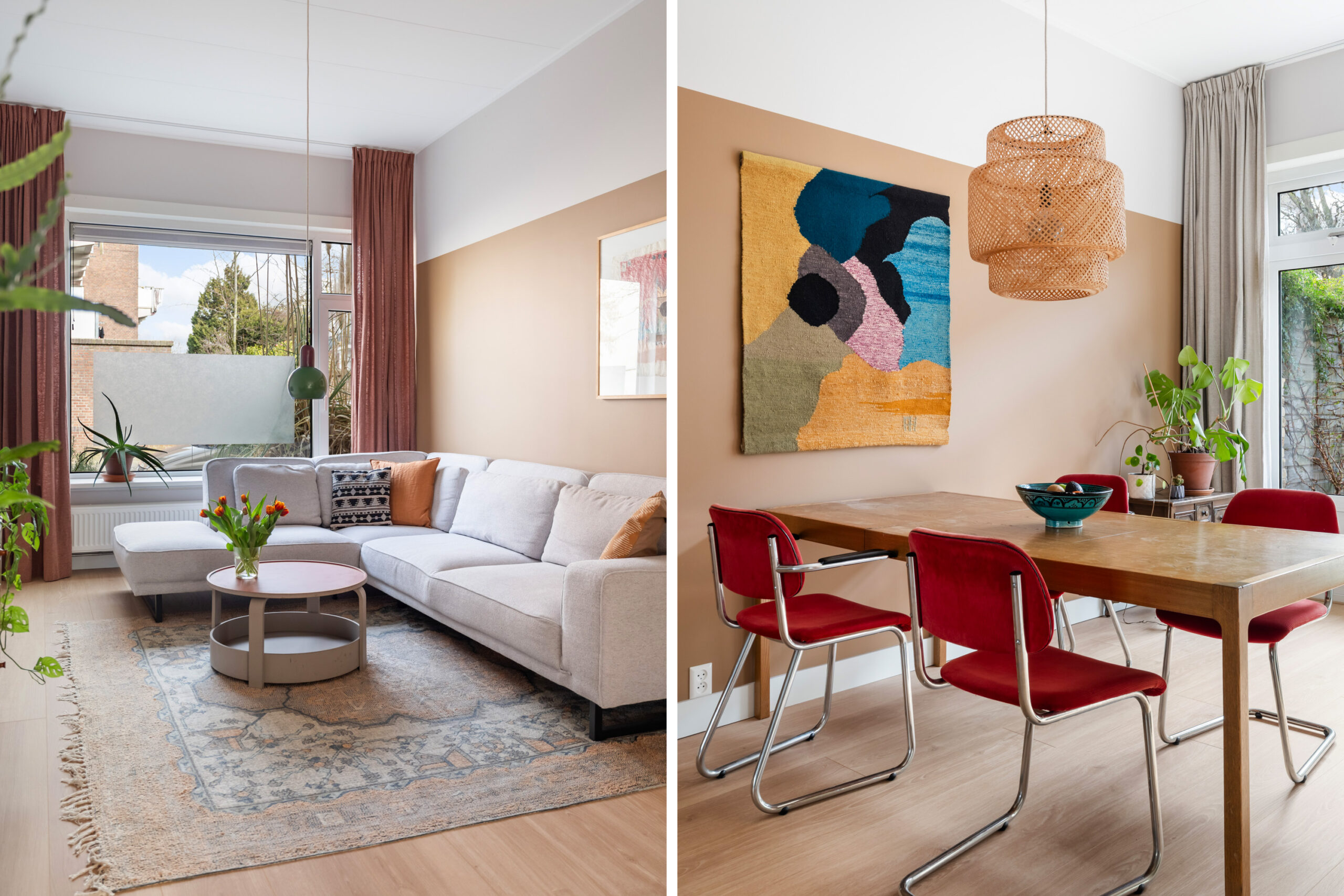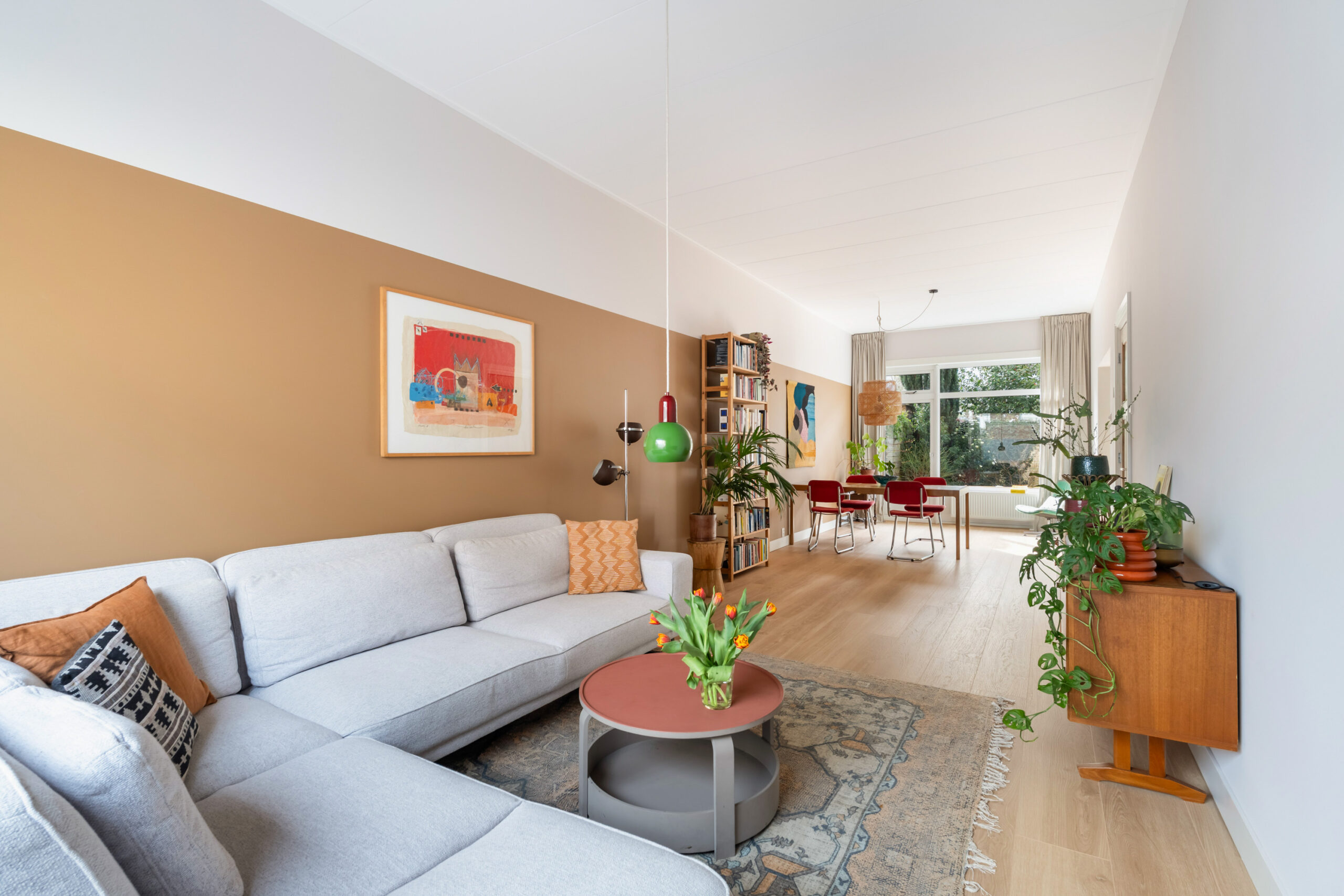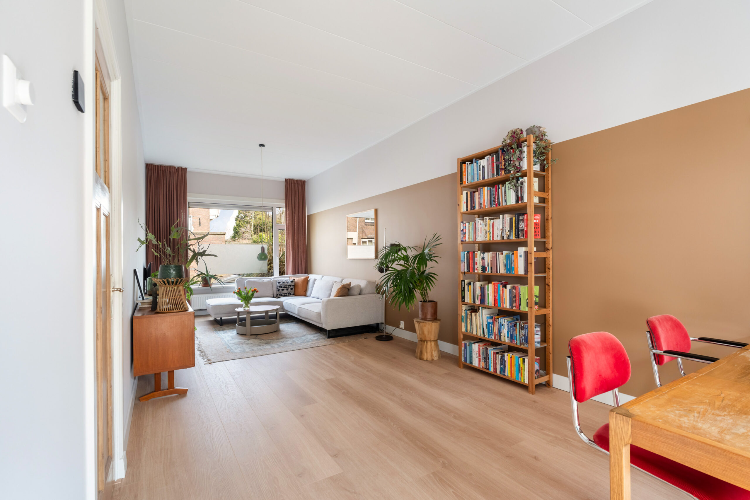 - De woonkamer is licht, met hoge plafonds,ruim van opzet en verdeeld in een eet- en zitgedeelte;