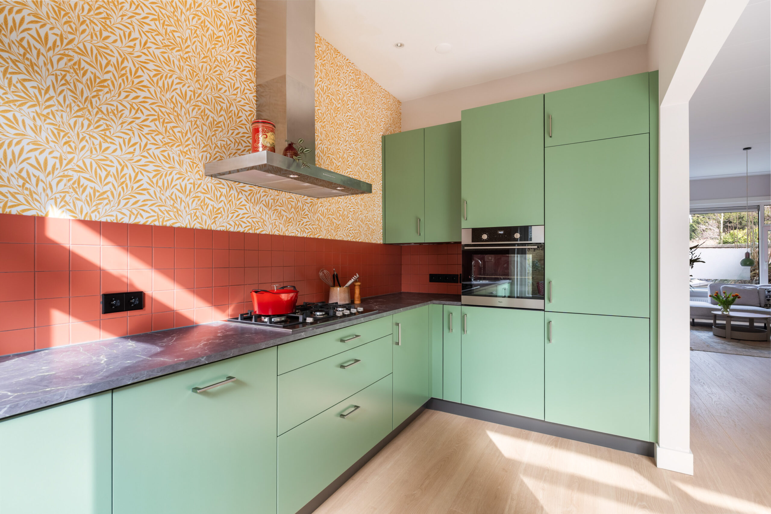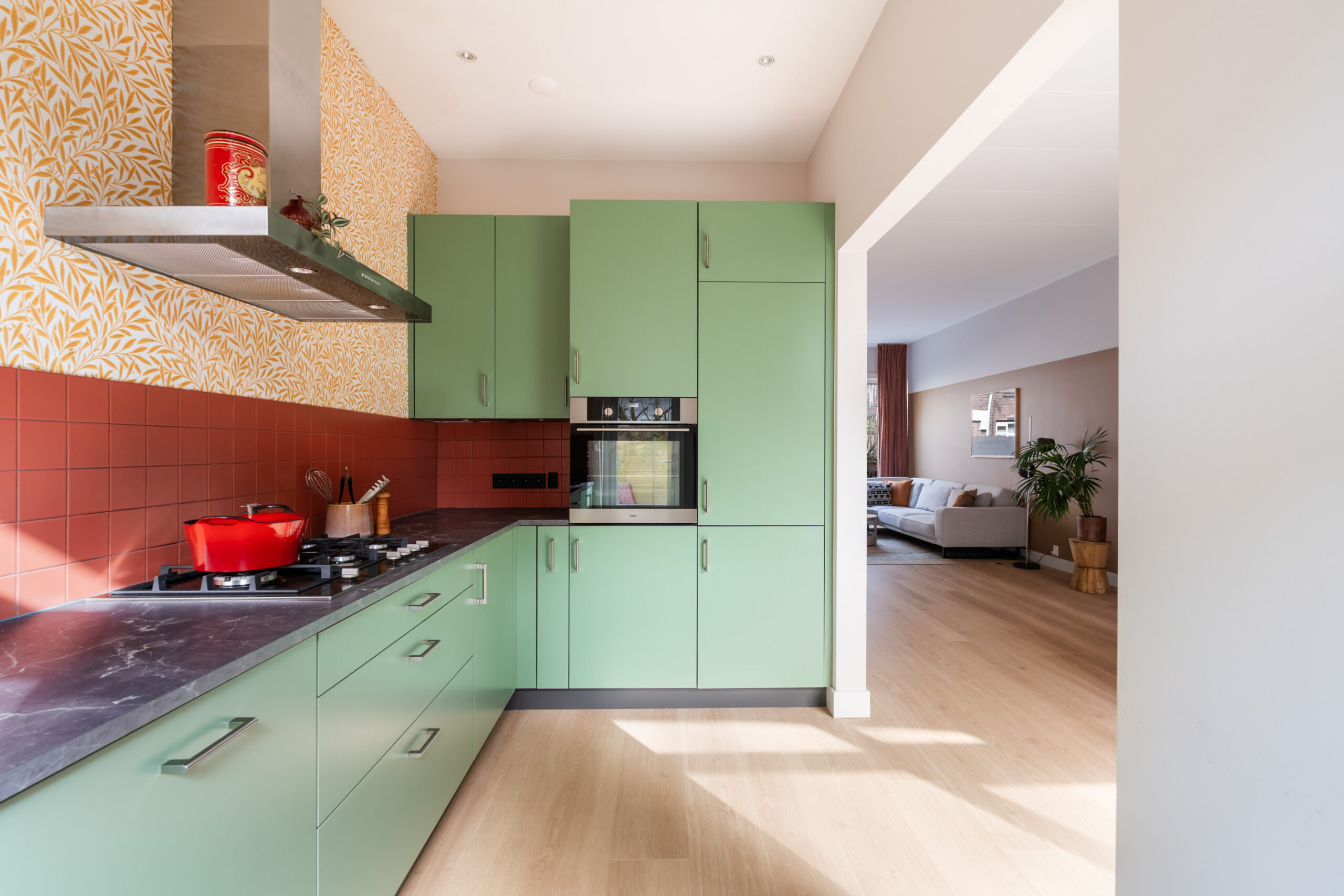- Aan de tuinzijde bevindt zich de half- open keuken, modern (2021) en voorzien van diverse apparatuur;