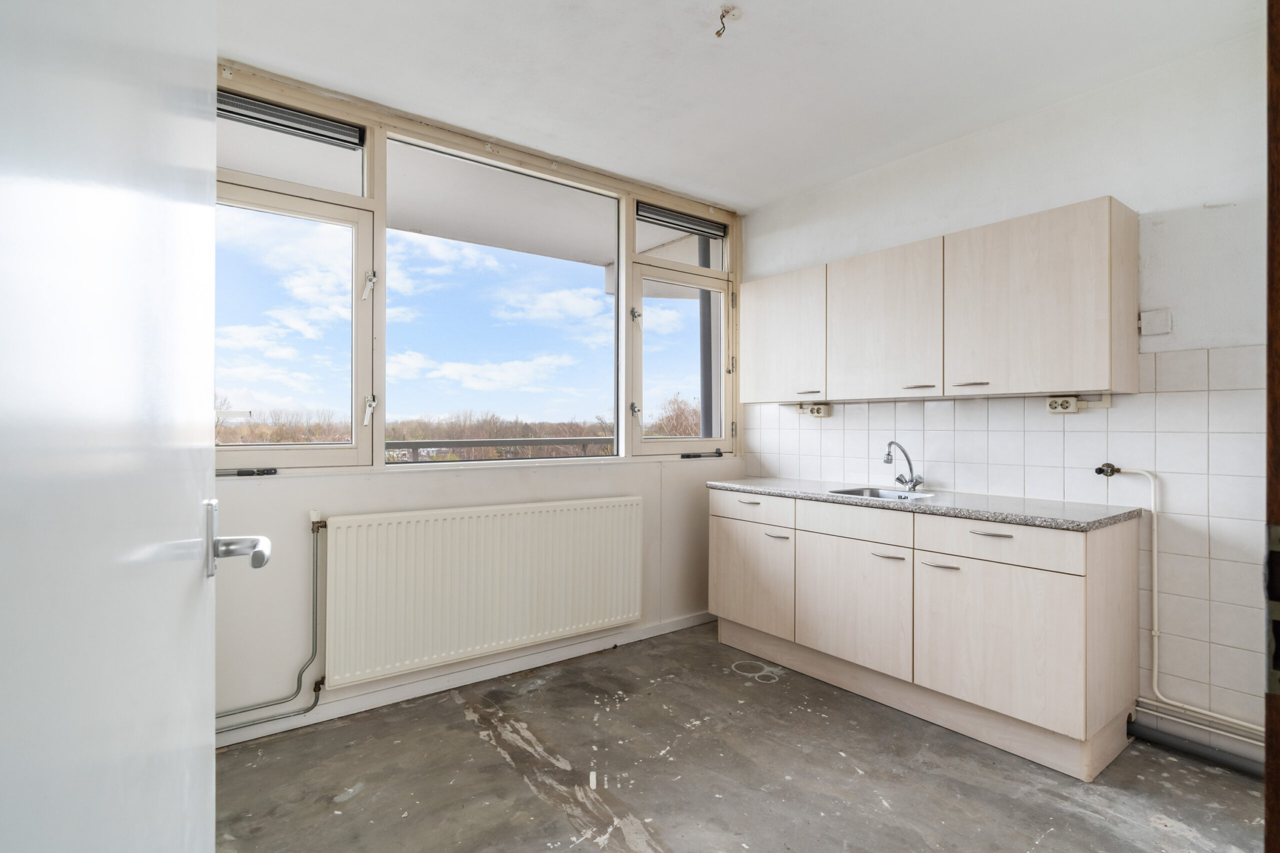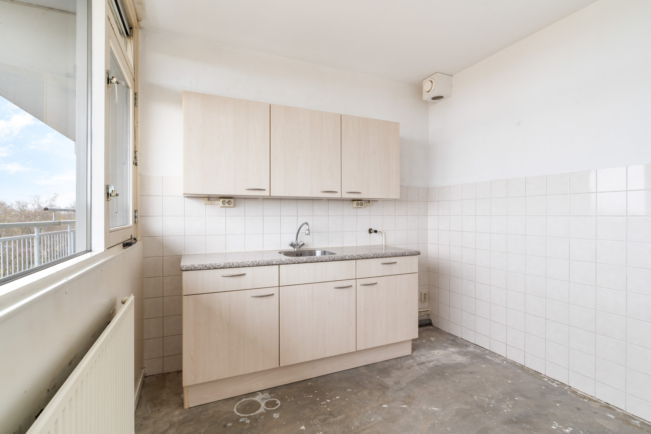 - Keukenruimte met grote raampartij en eenvoudig keukenblok.