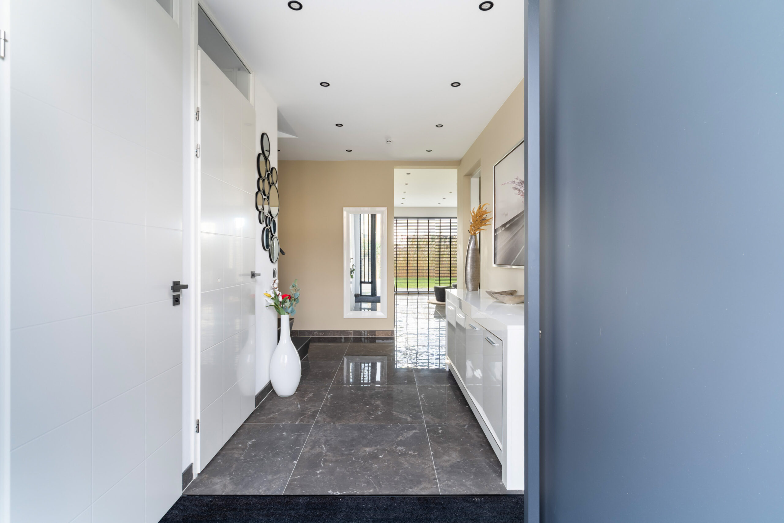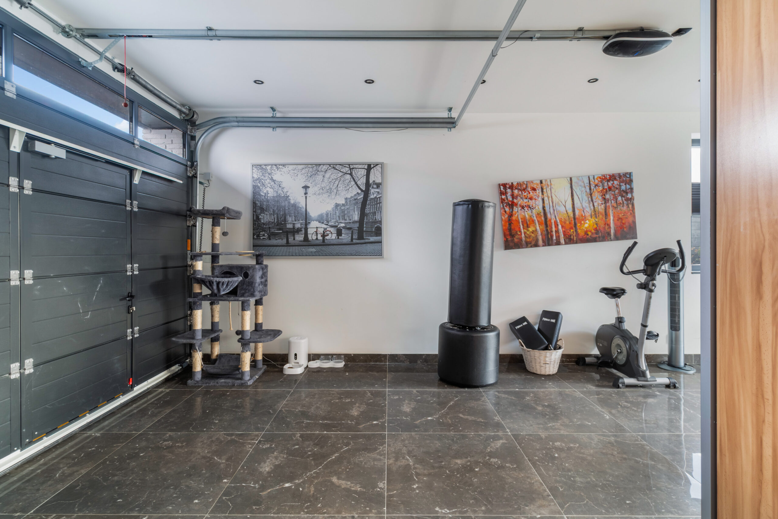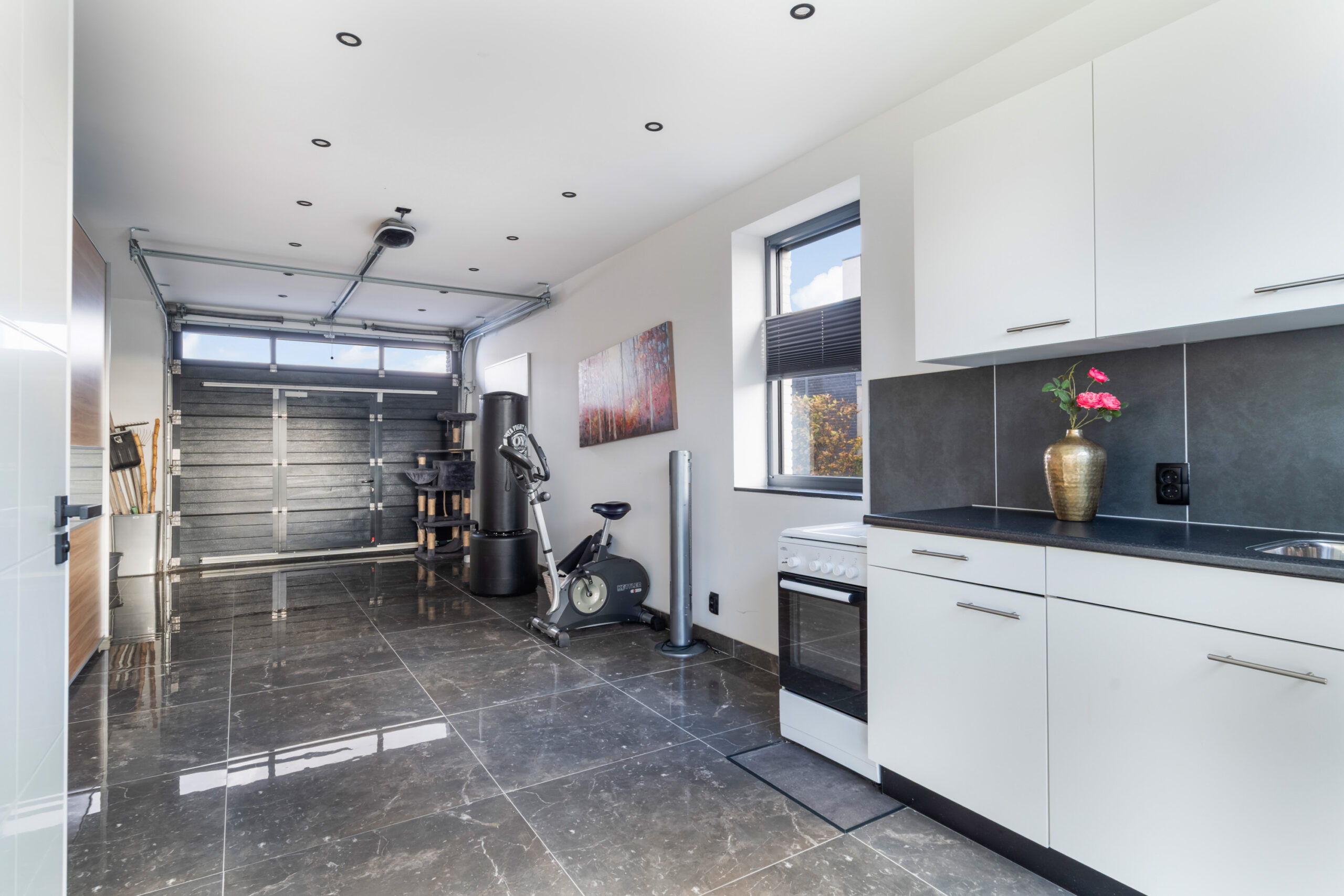 -Entree van de woning in de ruime hal met vide en trapopgang (Z vormig) naar de eerste verdieping, moderne toiletruimte voorzien van hangend closet, toegang tot de garage/berging welke is voorzien van voorbereiding voor een sauna. Tevens voorzien van doucheruimte met toilet, keukenblokje, entree naar de achtertuin en elektrisch bedienbare sectionaal garagedeur.