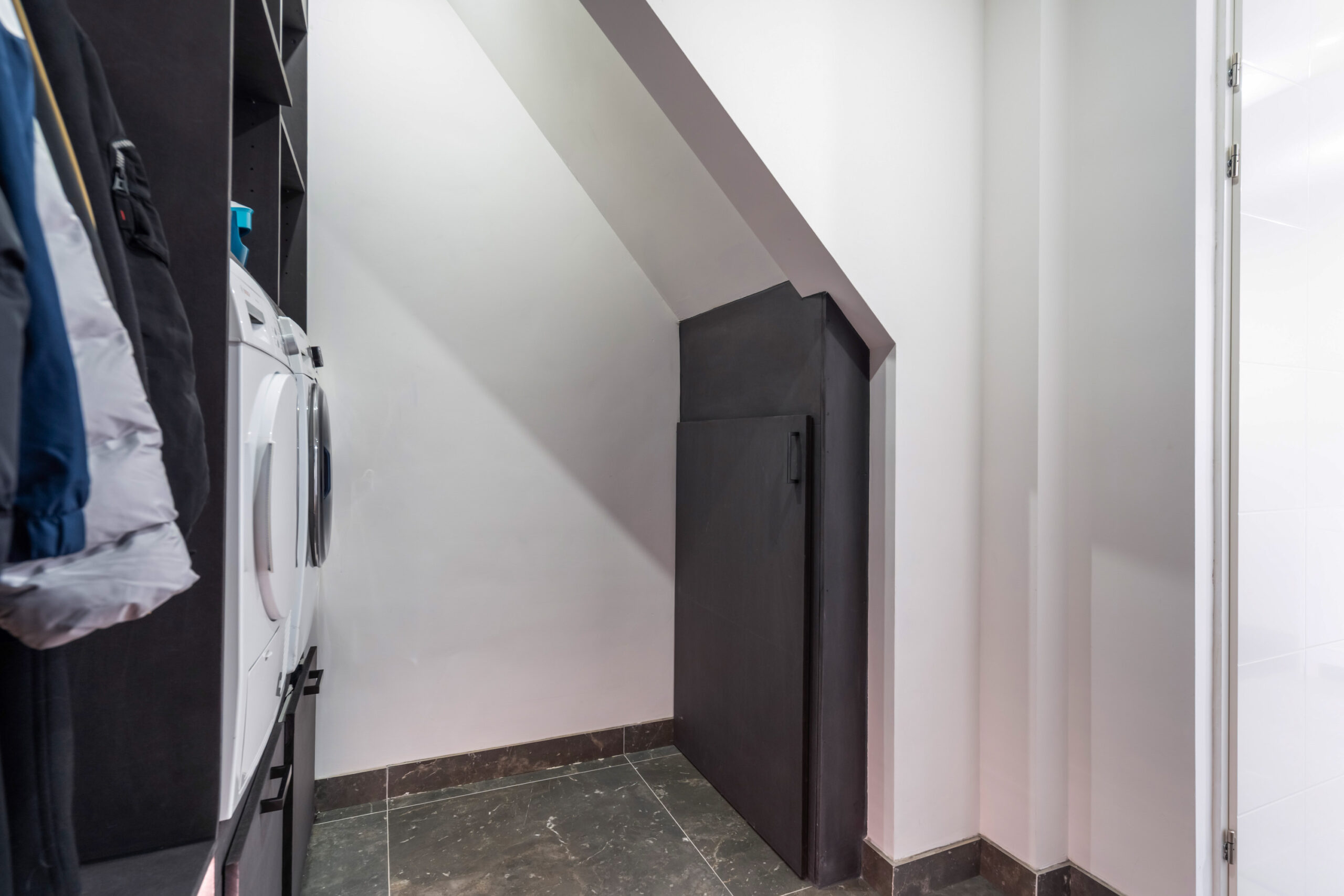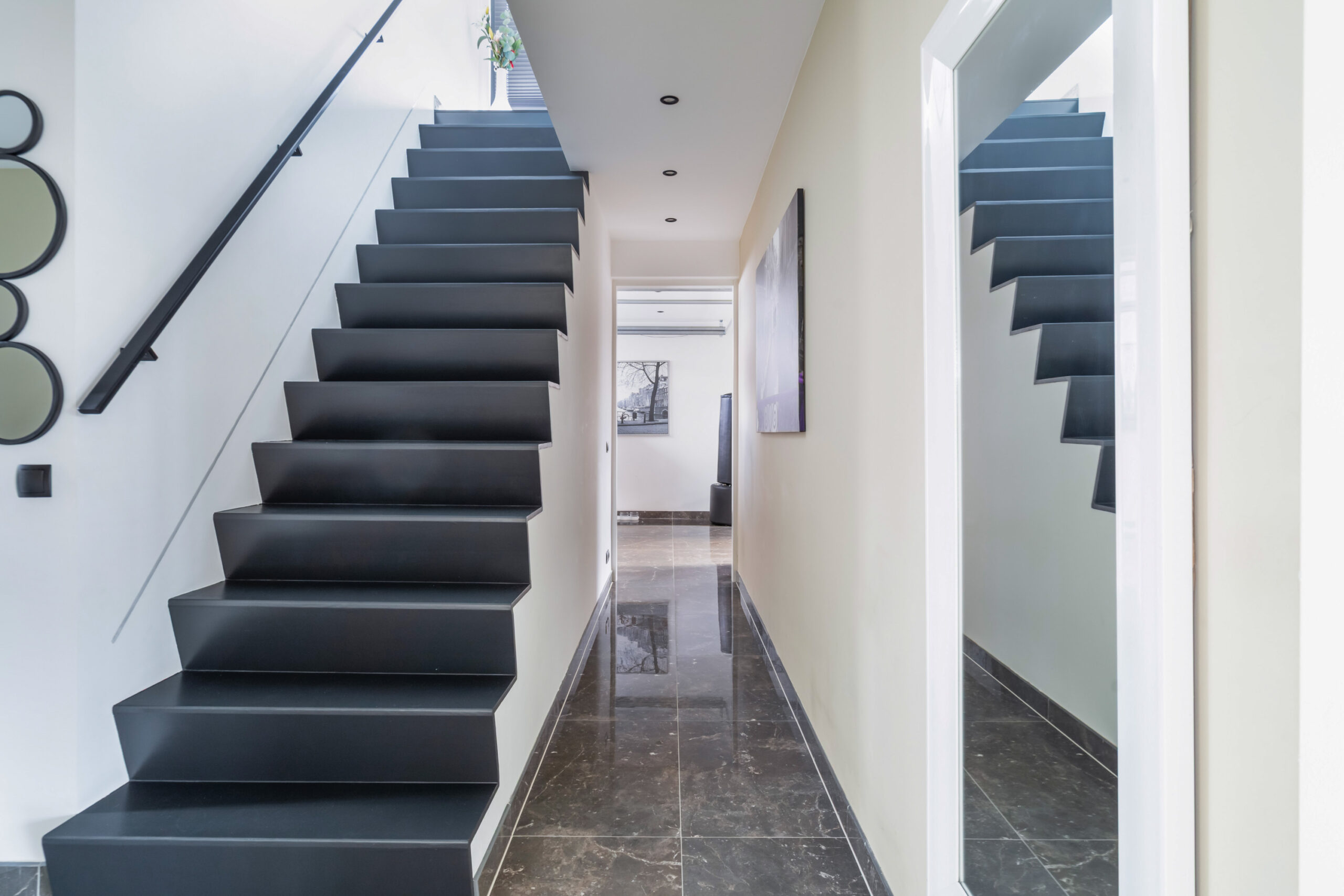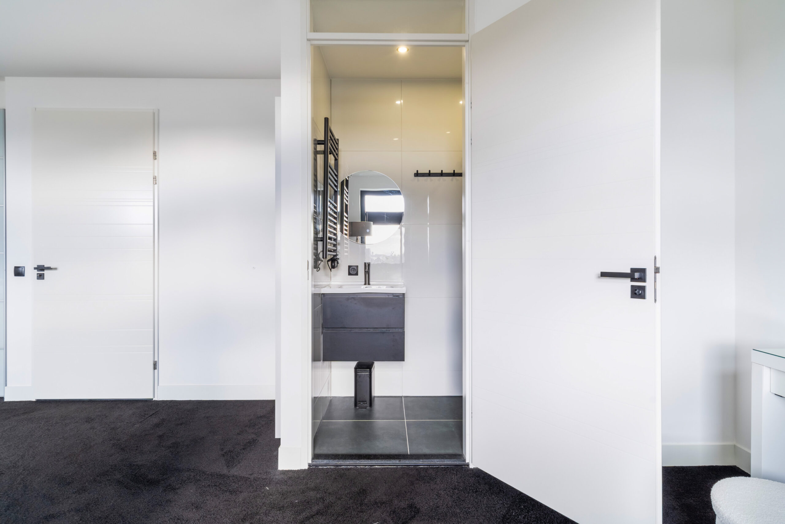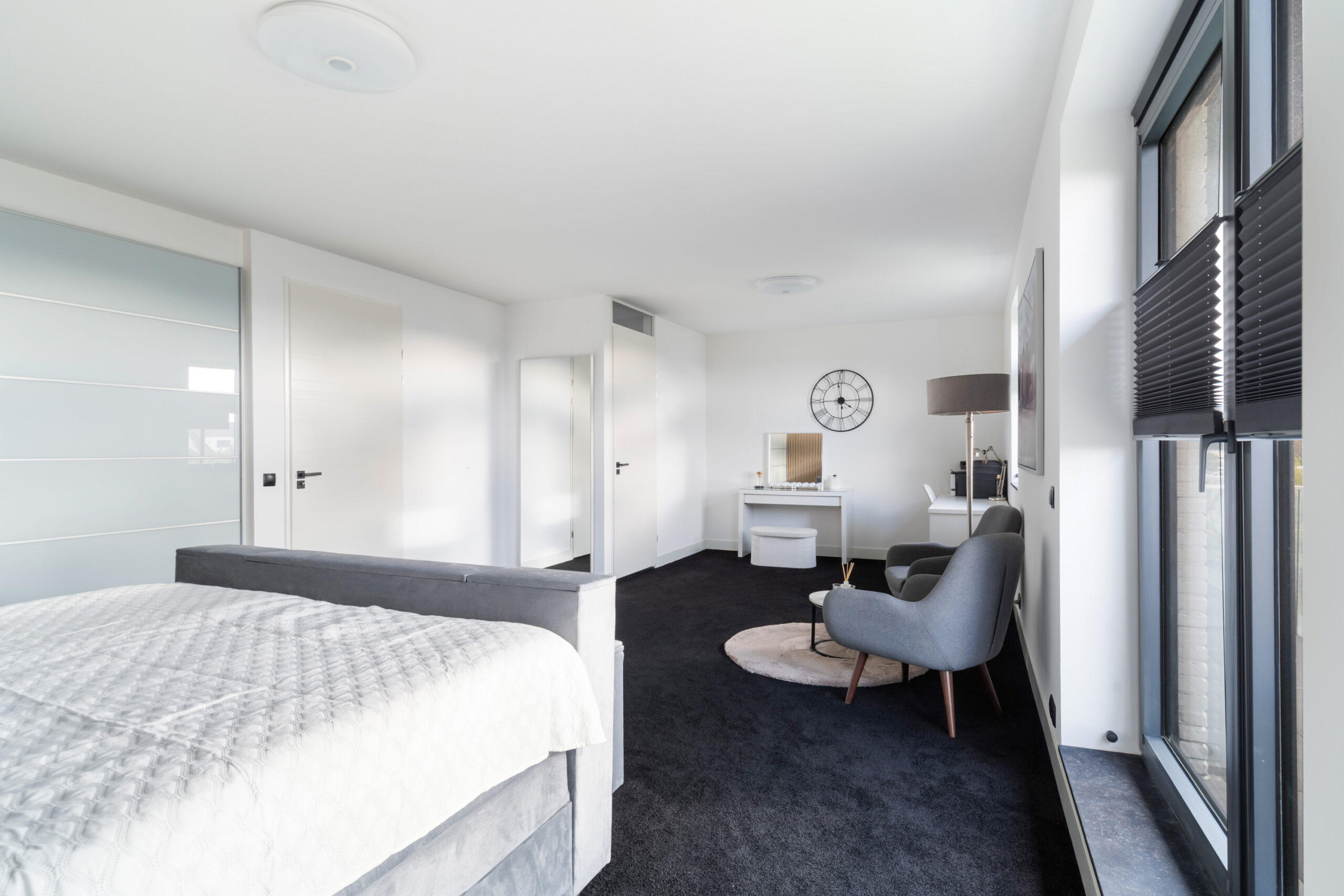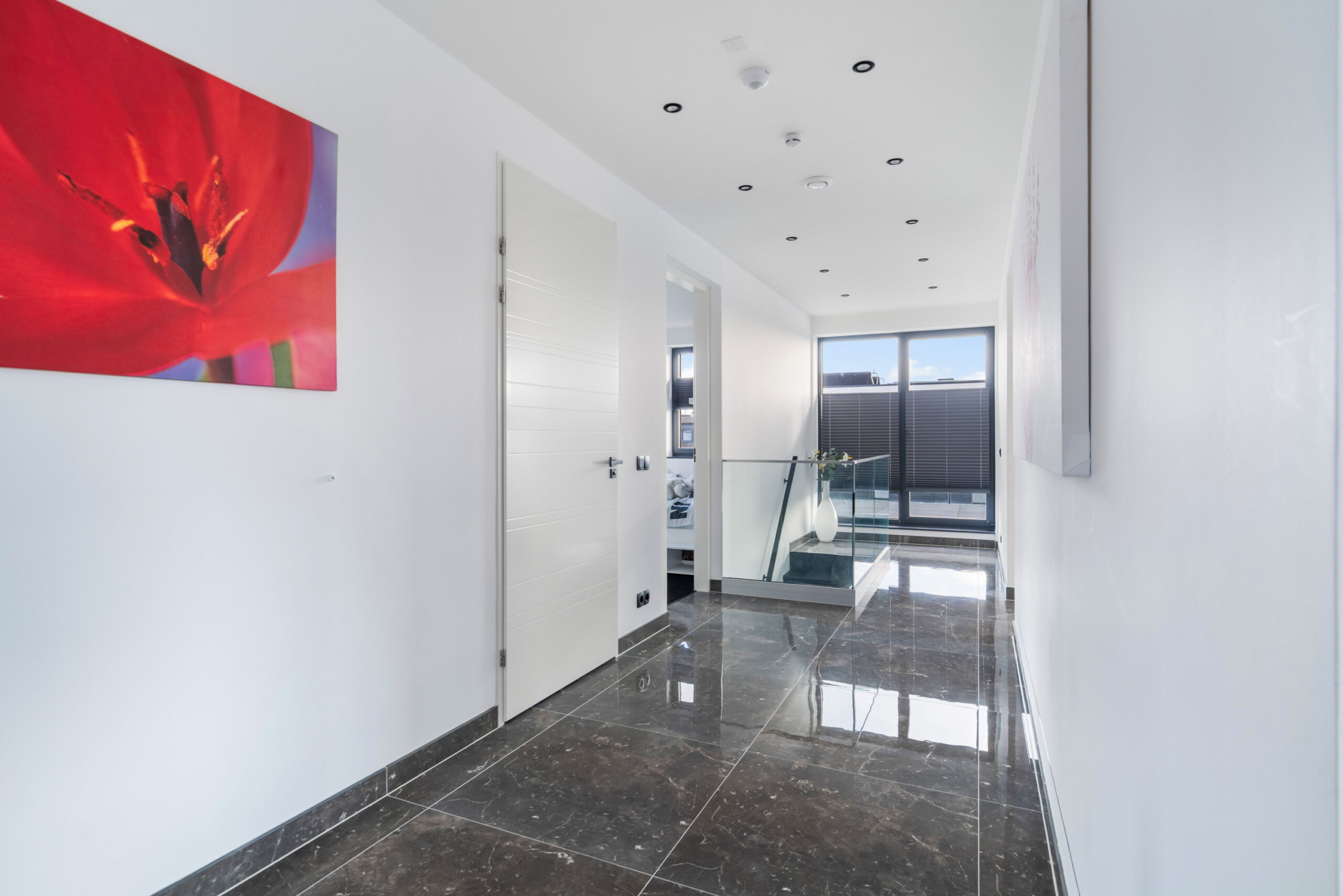 -Via de trap vanuit de hal bereikt u de slaapverdieping. Vanuit de hal (met vloerverwarming) is een heerlijk groot dakterras bereikbaar.