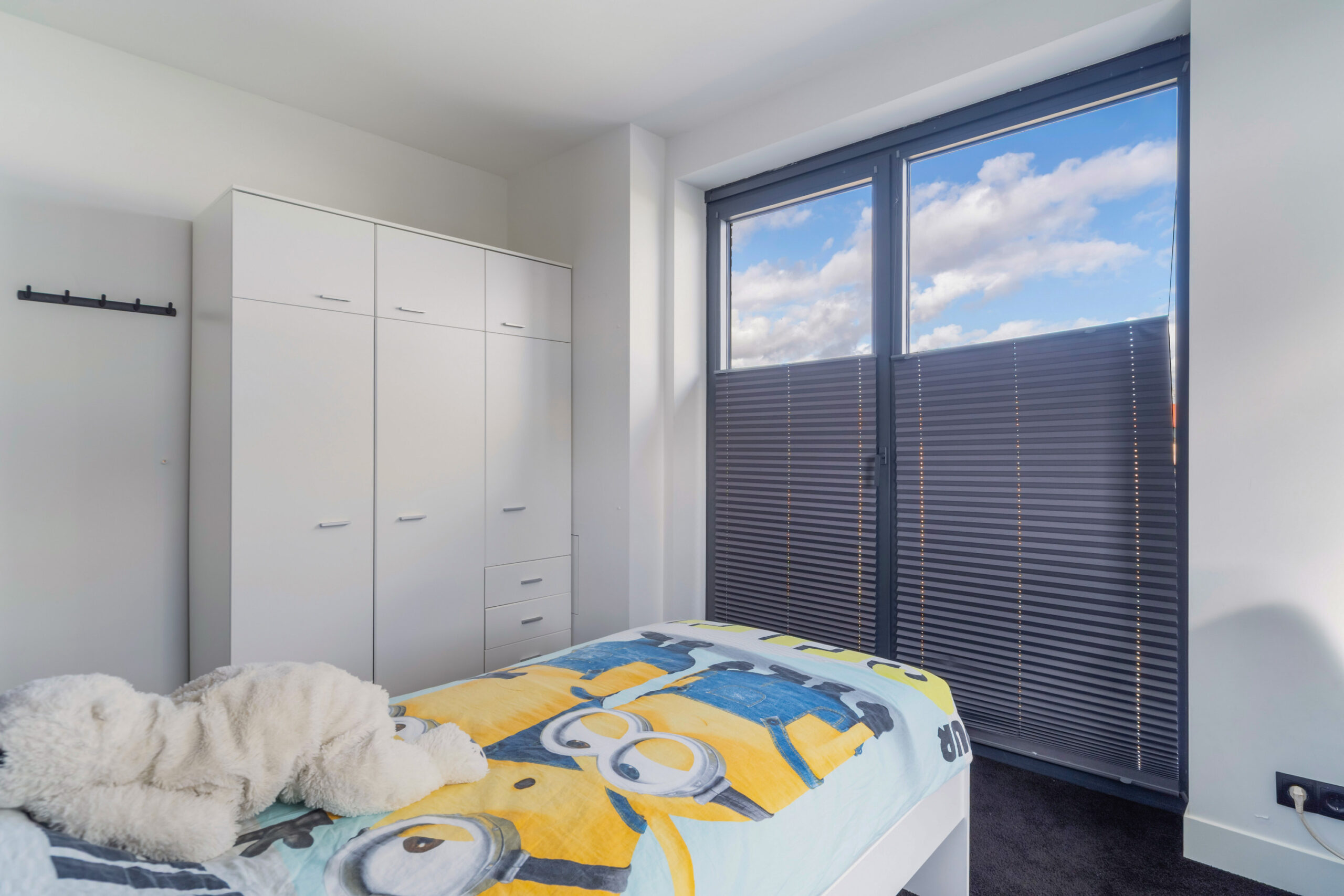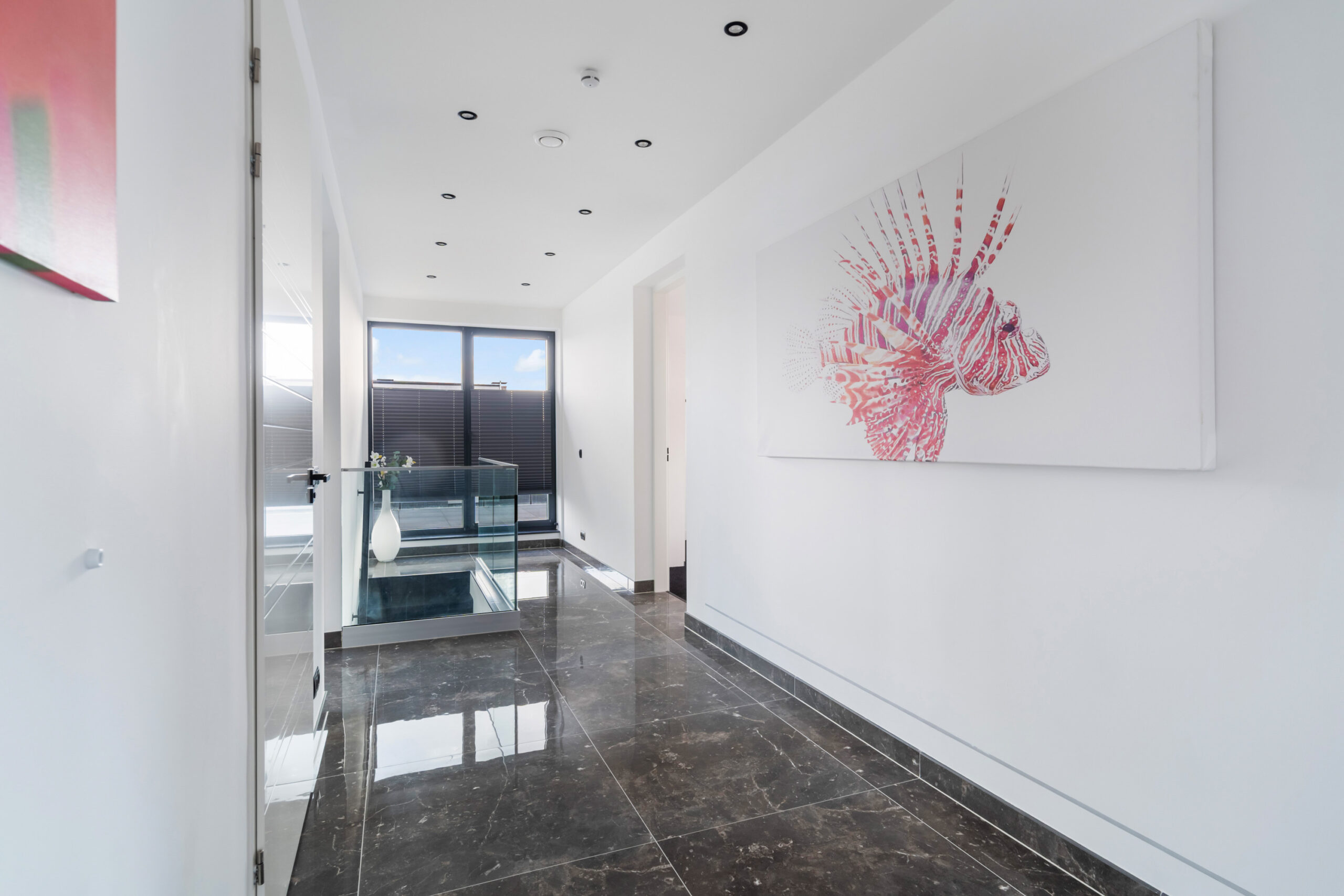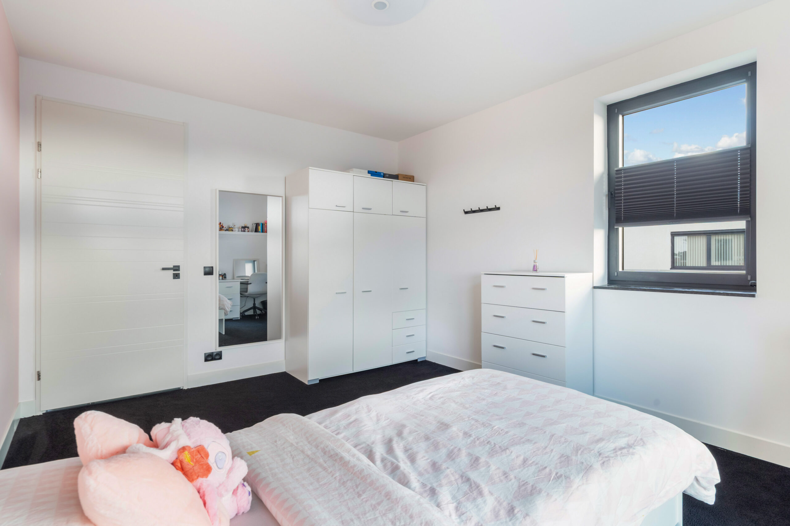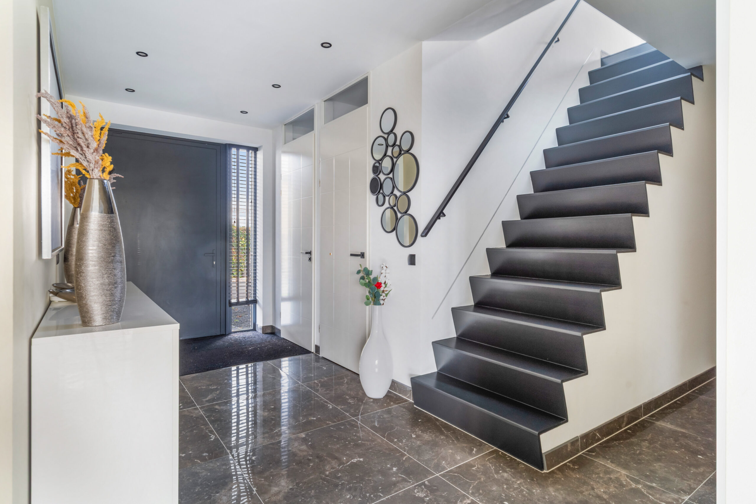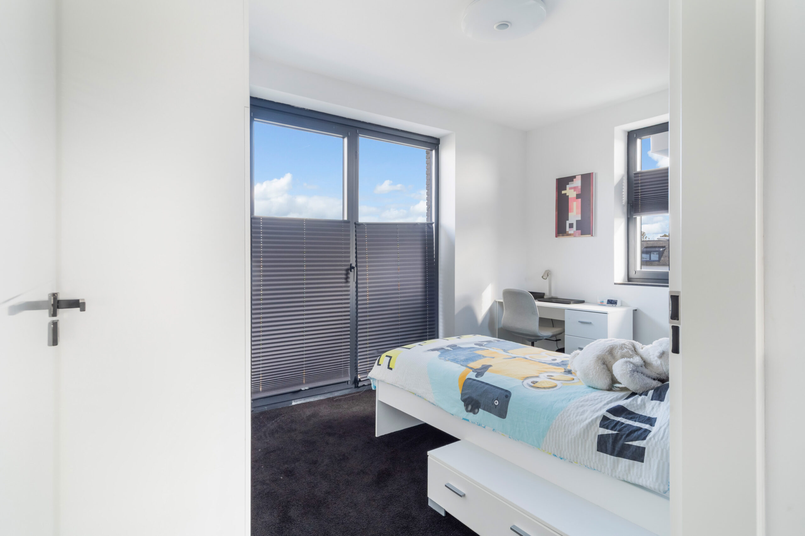-Via de trap vanuit de hal bereikt u de slaapverdieping. Vanuit de hal (met vloerverwarming) is een heerlijk groot dakterras bereikbaar.