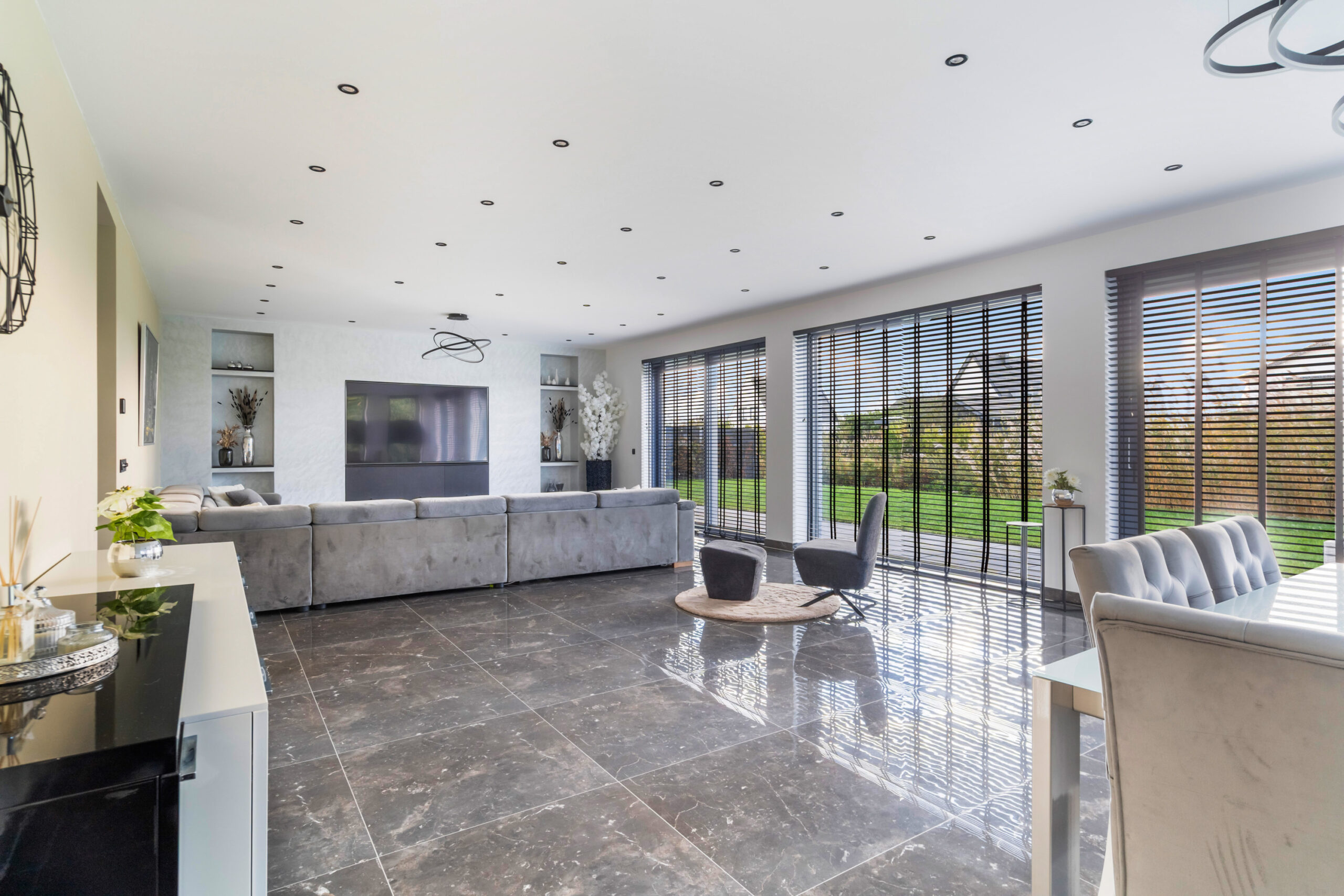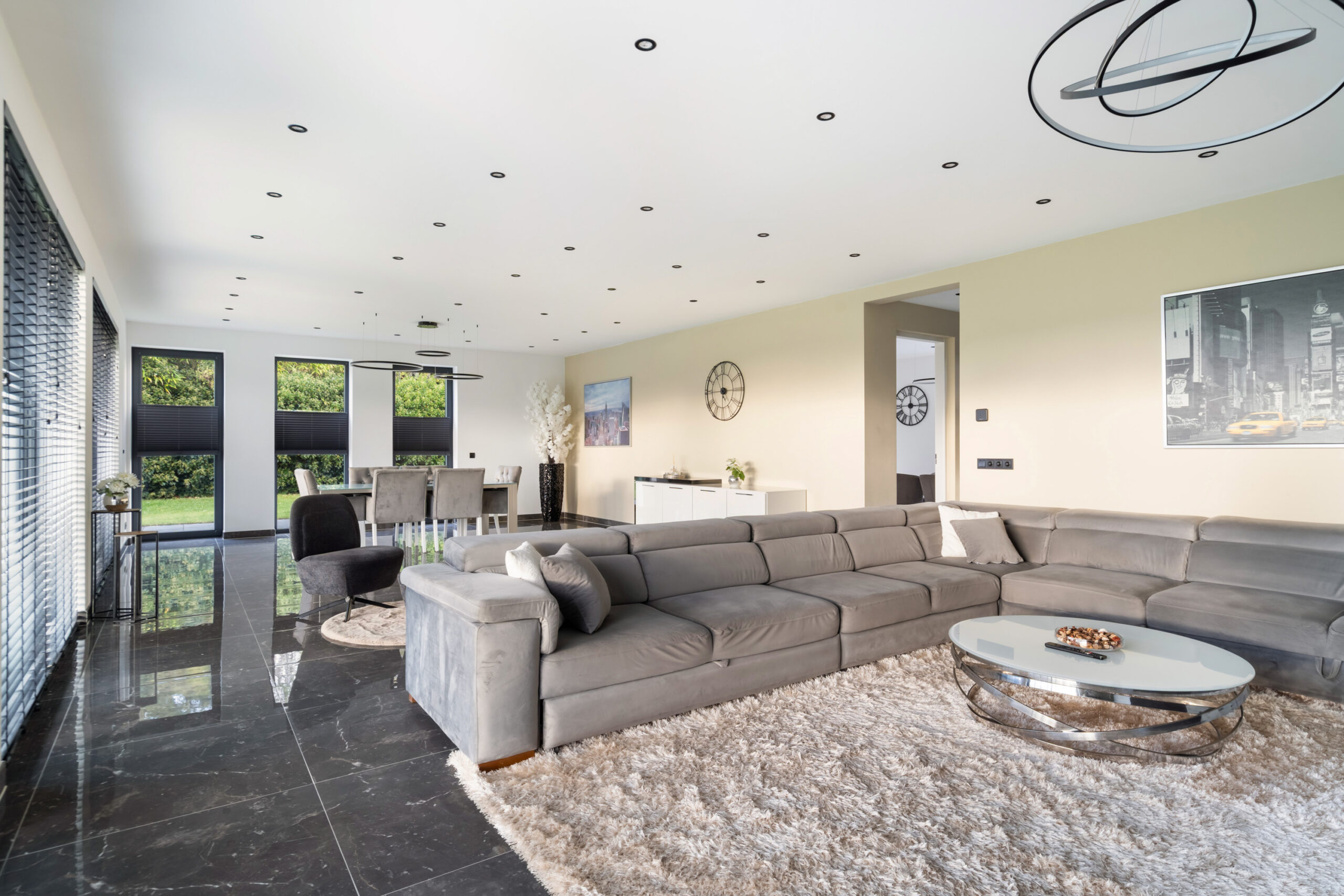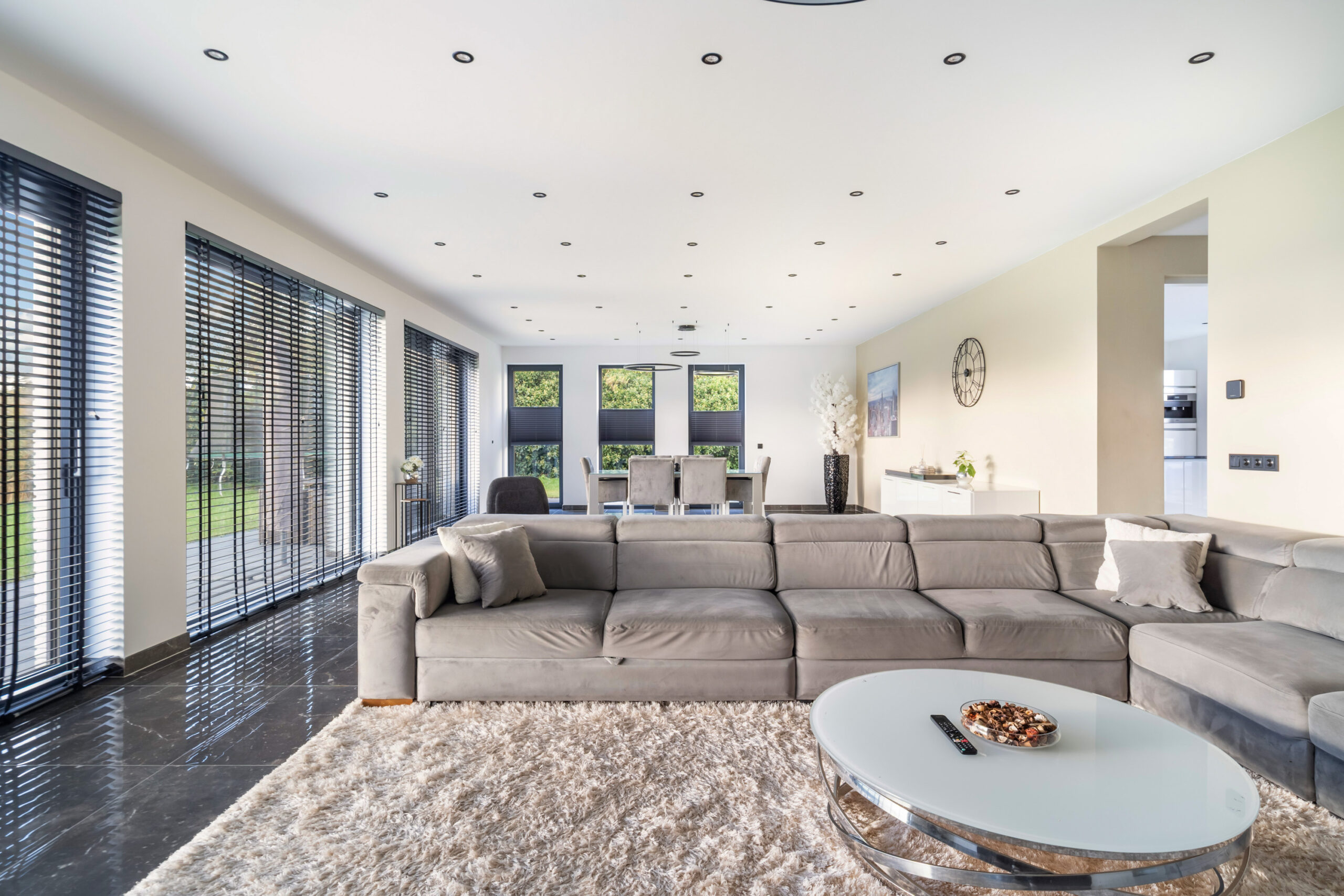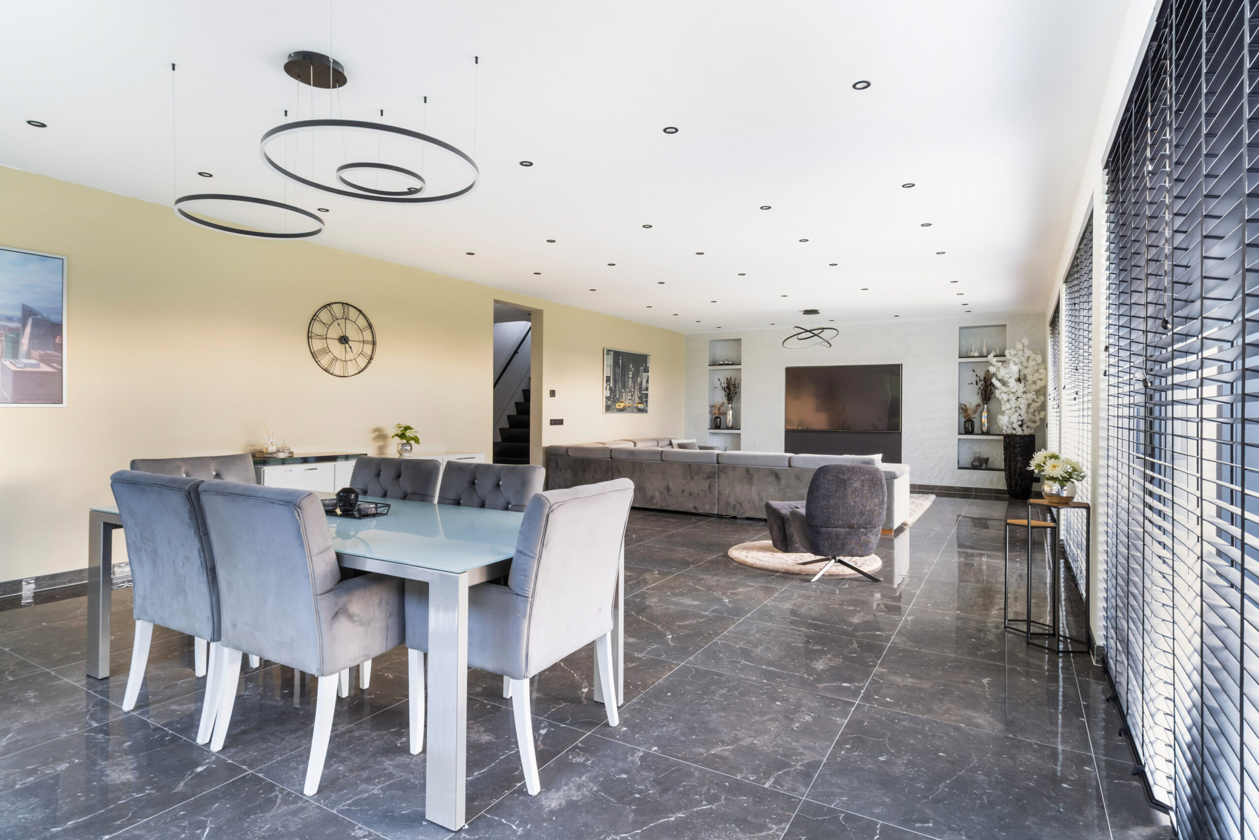 -De zeer lichte, royale woonkamer is voorzien van vloertegels, grote raampartijen, dubbele schuifpuien, dubbele deuren naar de tuin.