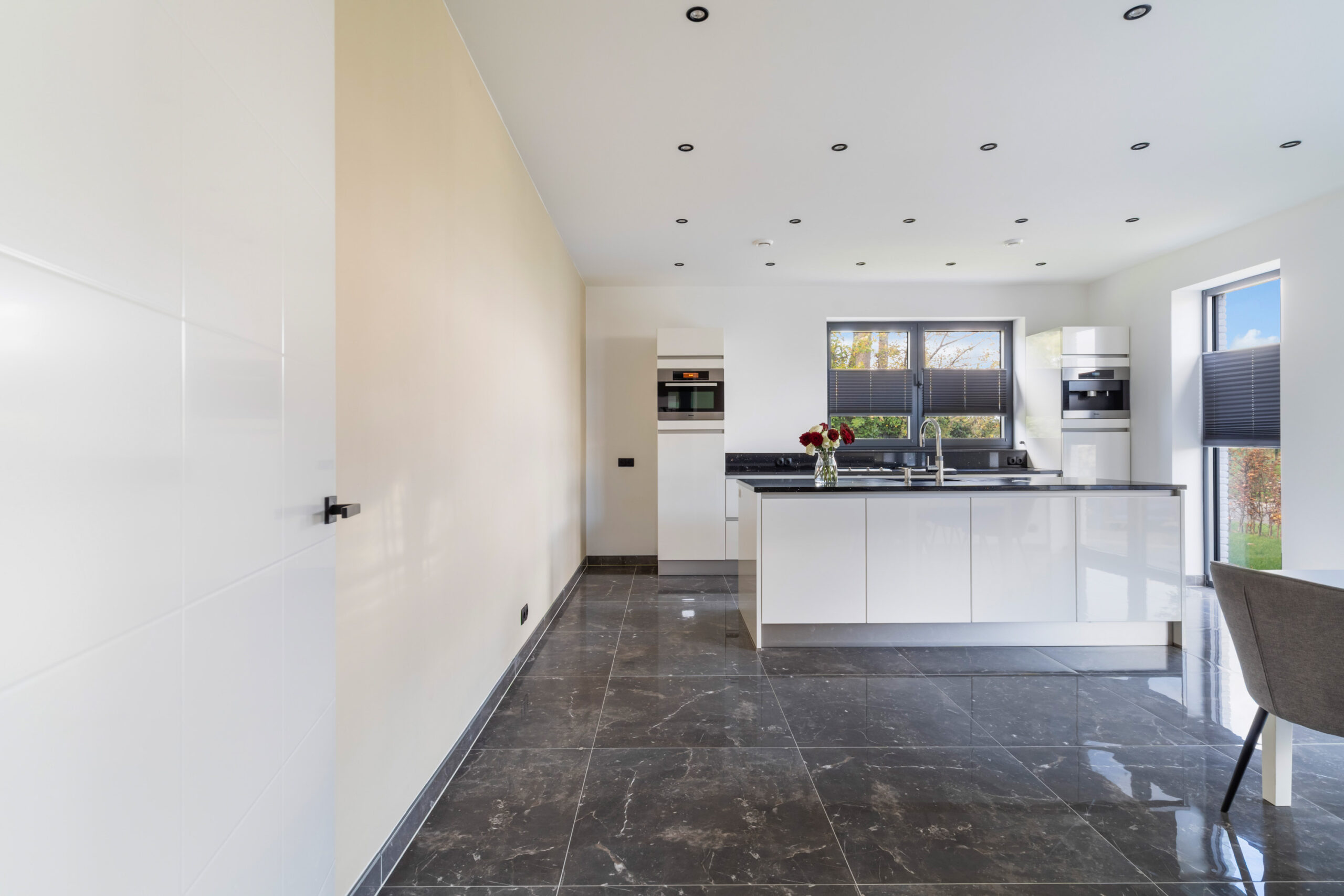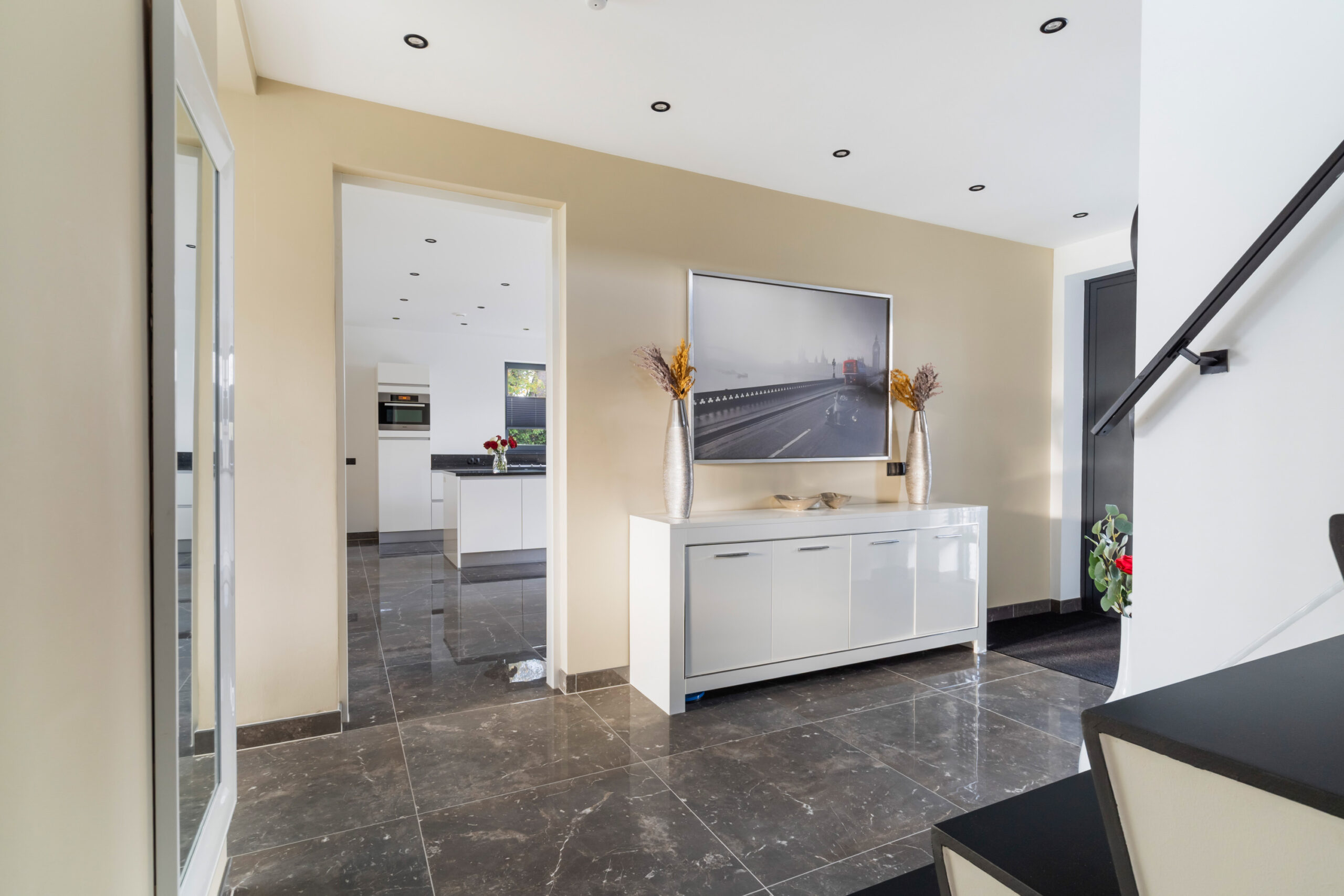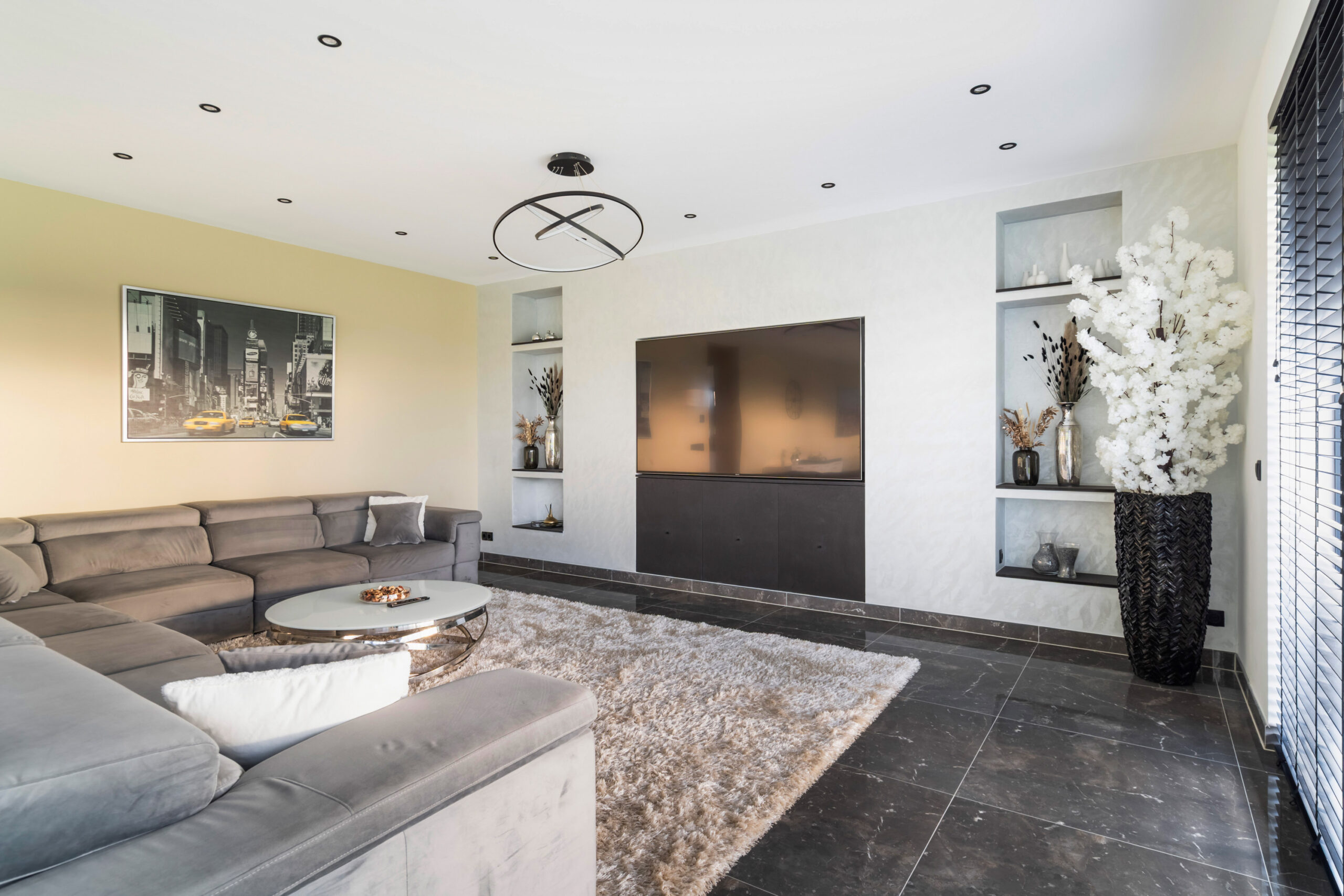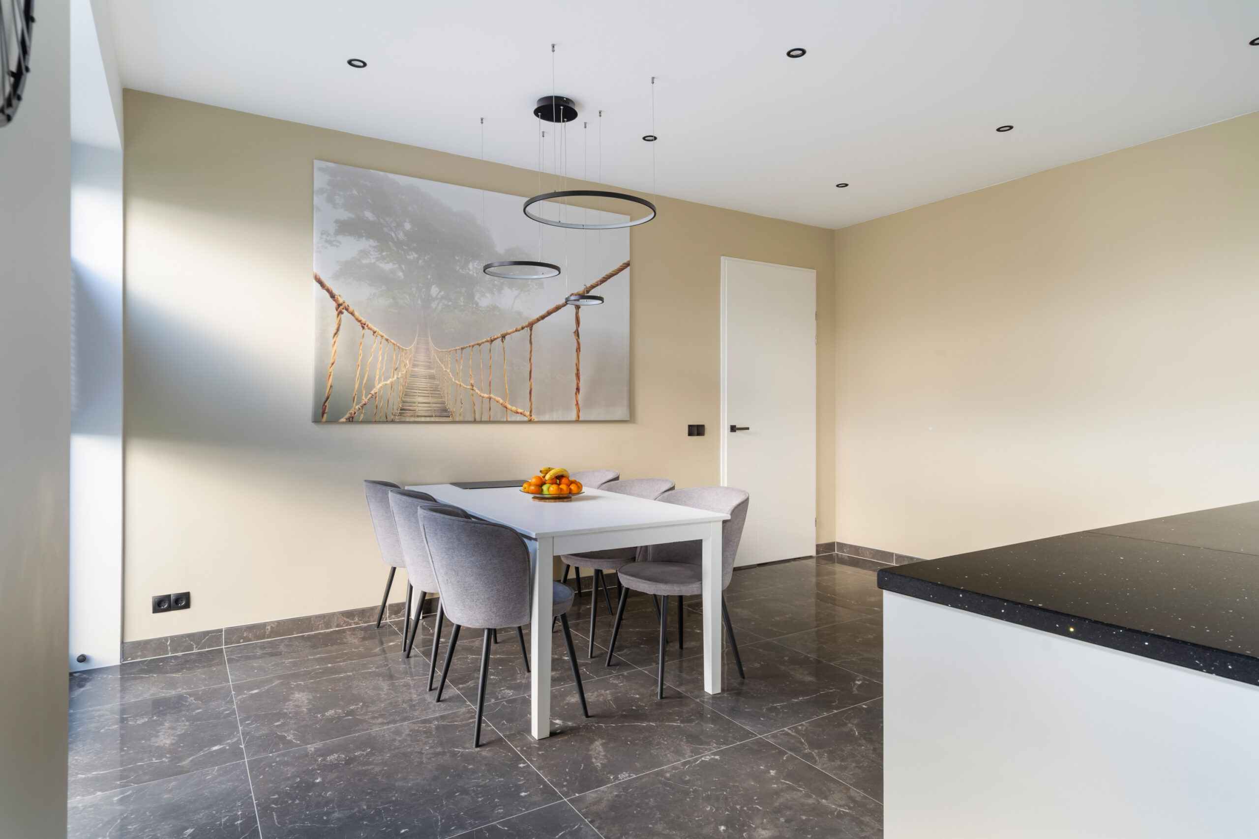 -De zeer lichte, royale woonkamer is voorzien van vloertegels, grote raampartijen, dubbele schuifpuien, dubbele deuren naar de tuin.