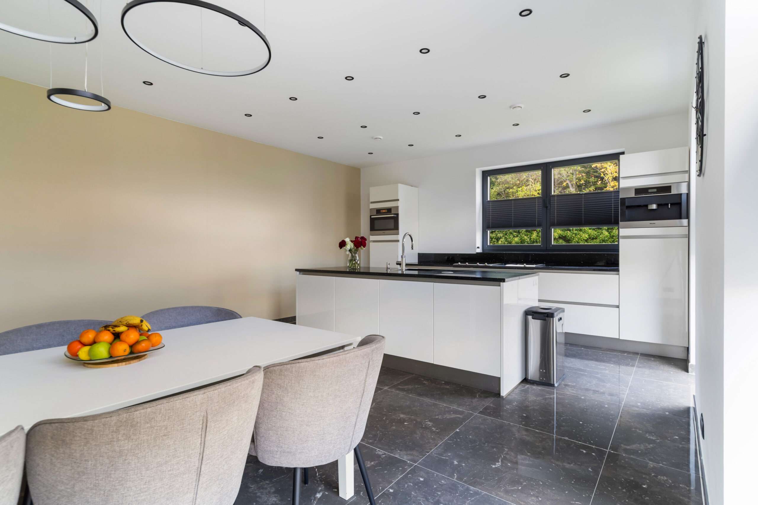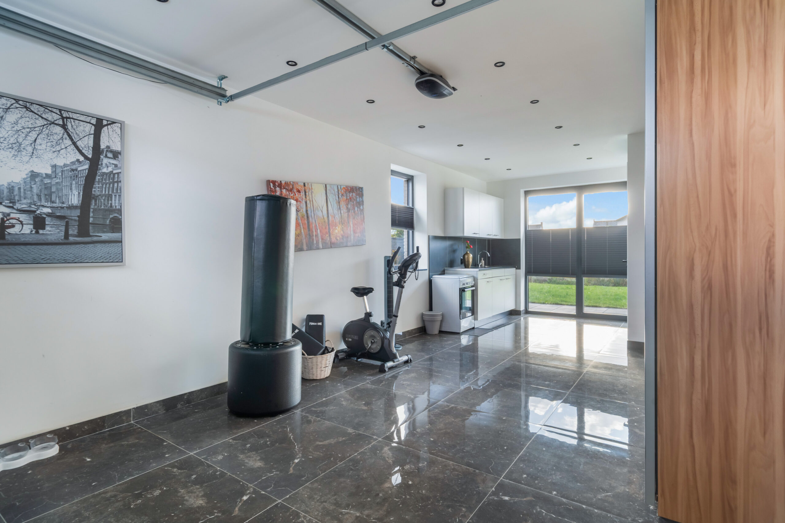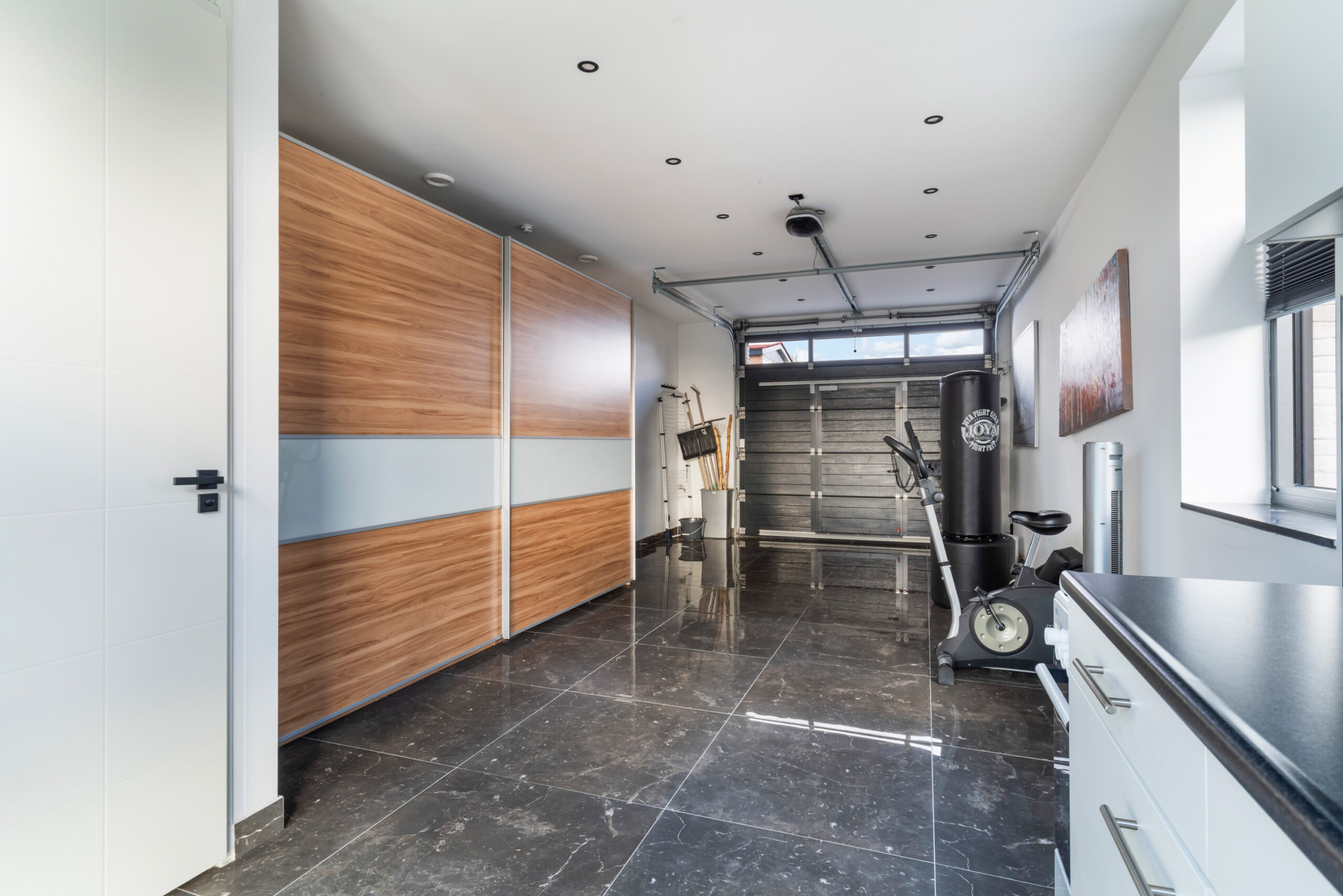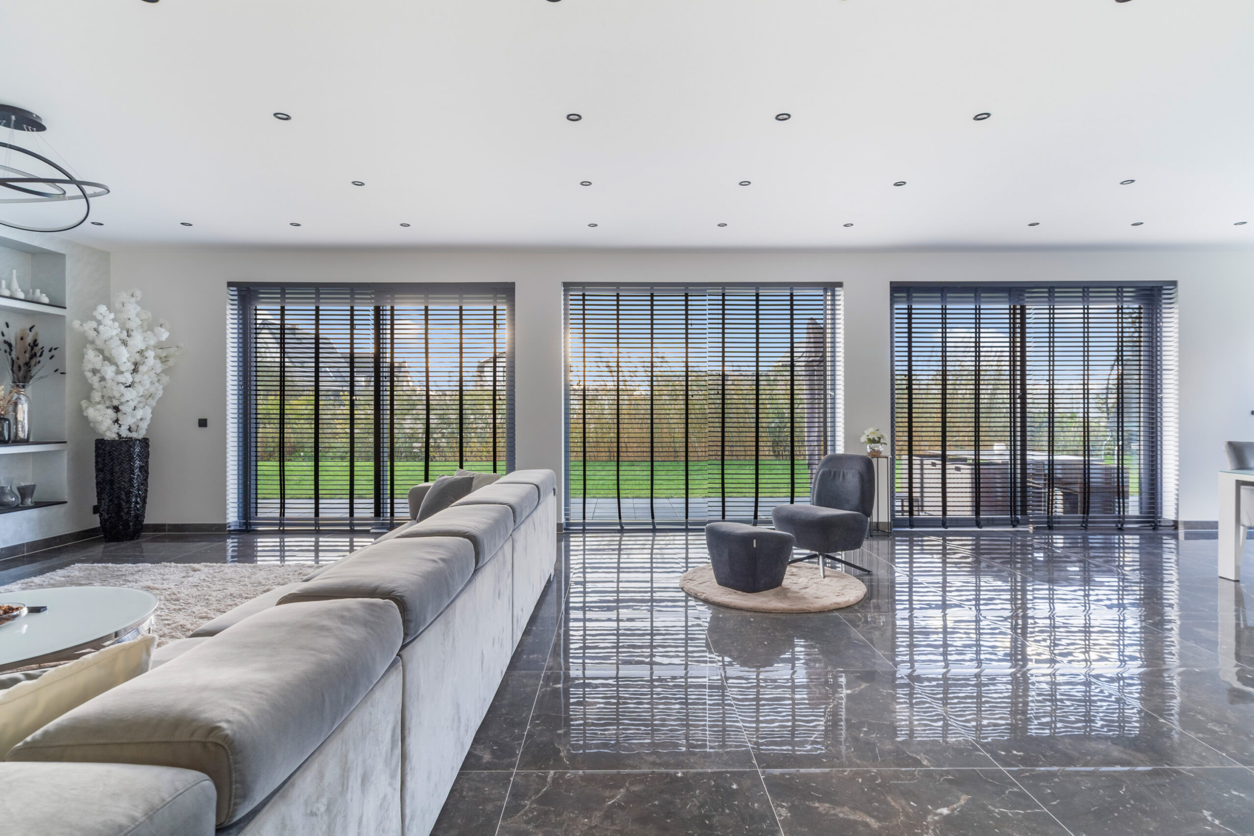 -De zeer lichte, royale woonkamer is voorzien van vloertegels, grote raampartijen, dubbele schuifpuien, dubbele deuren naar de tuin.