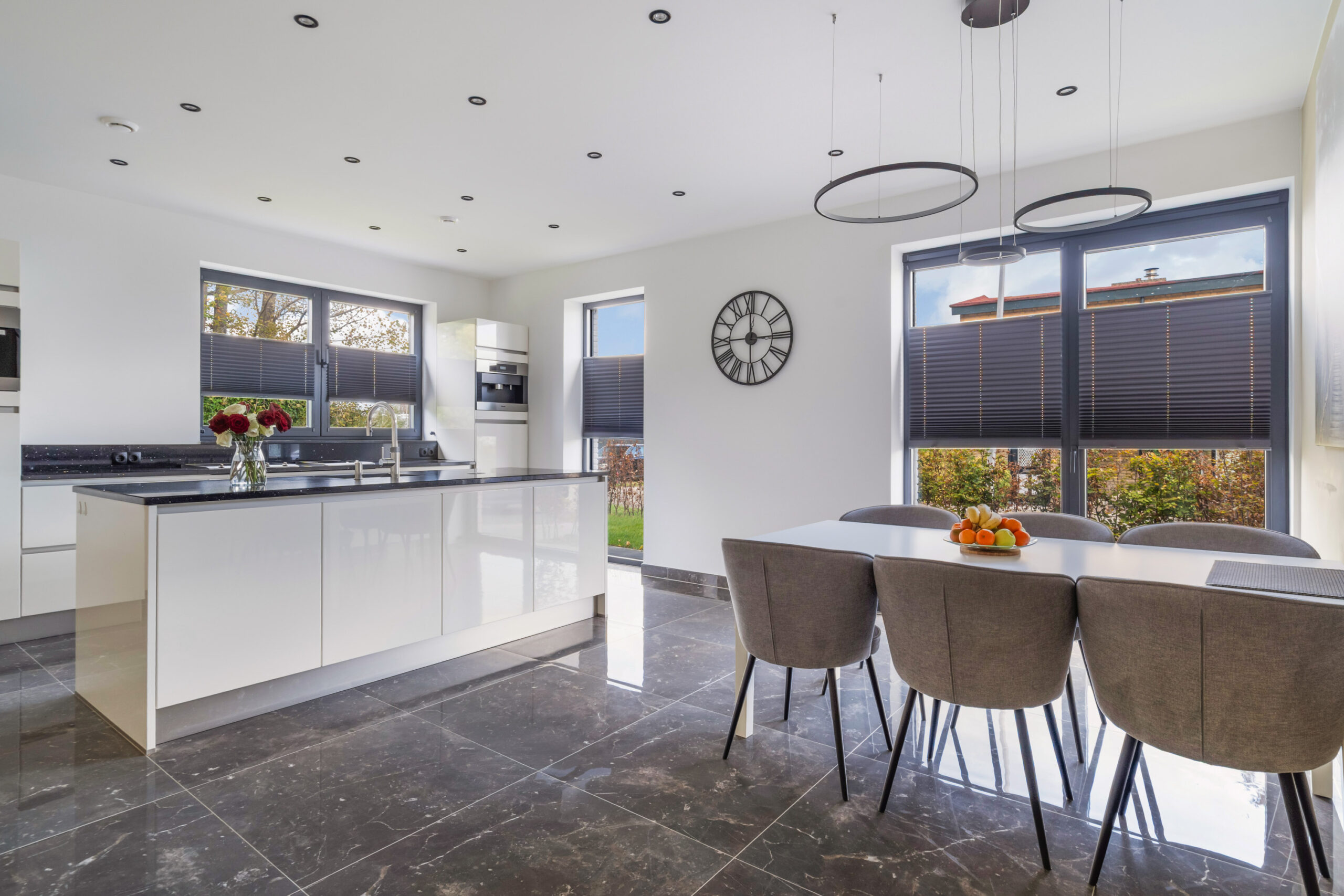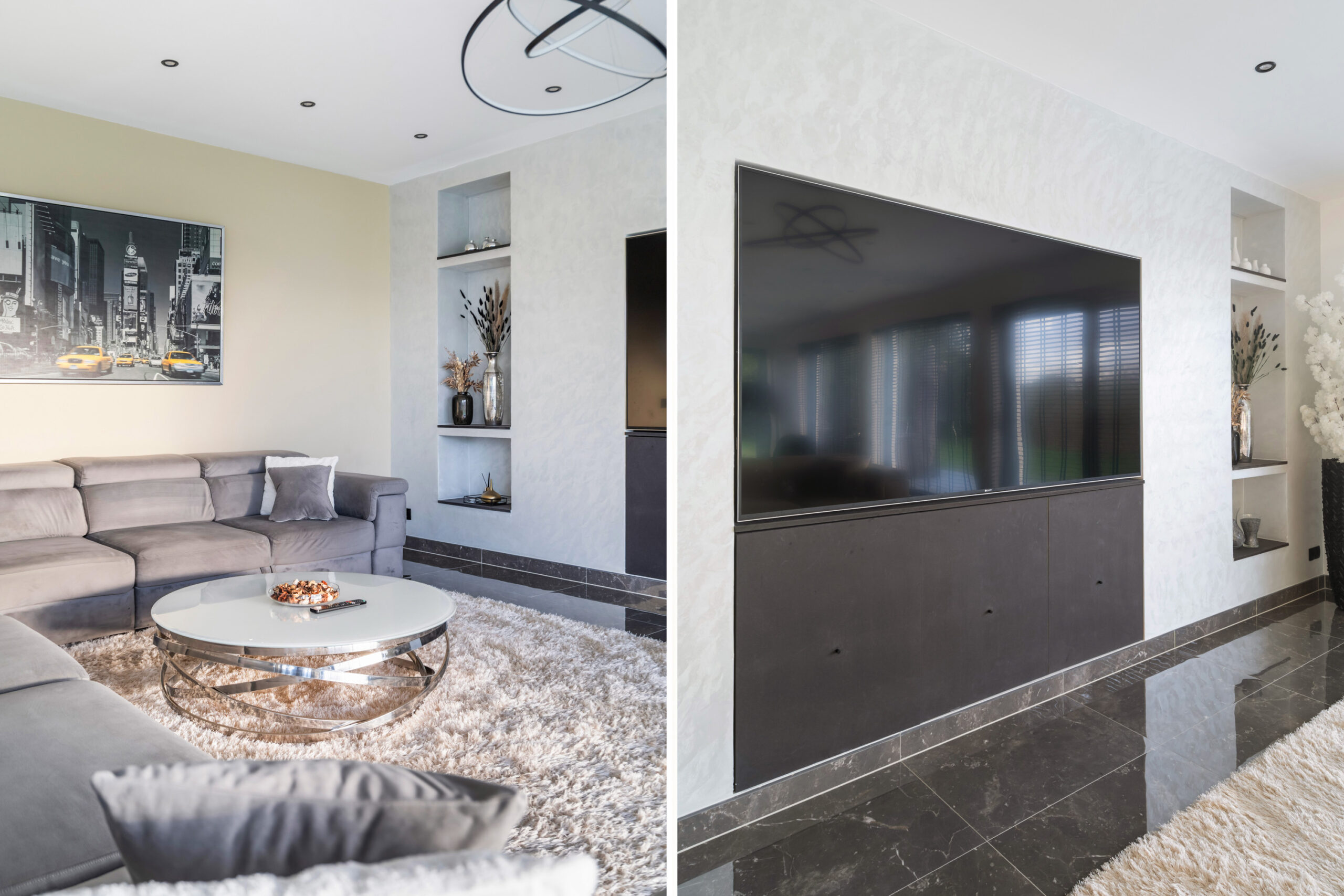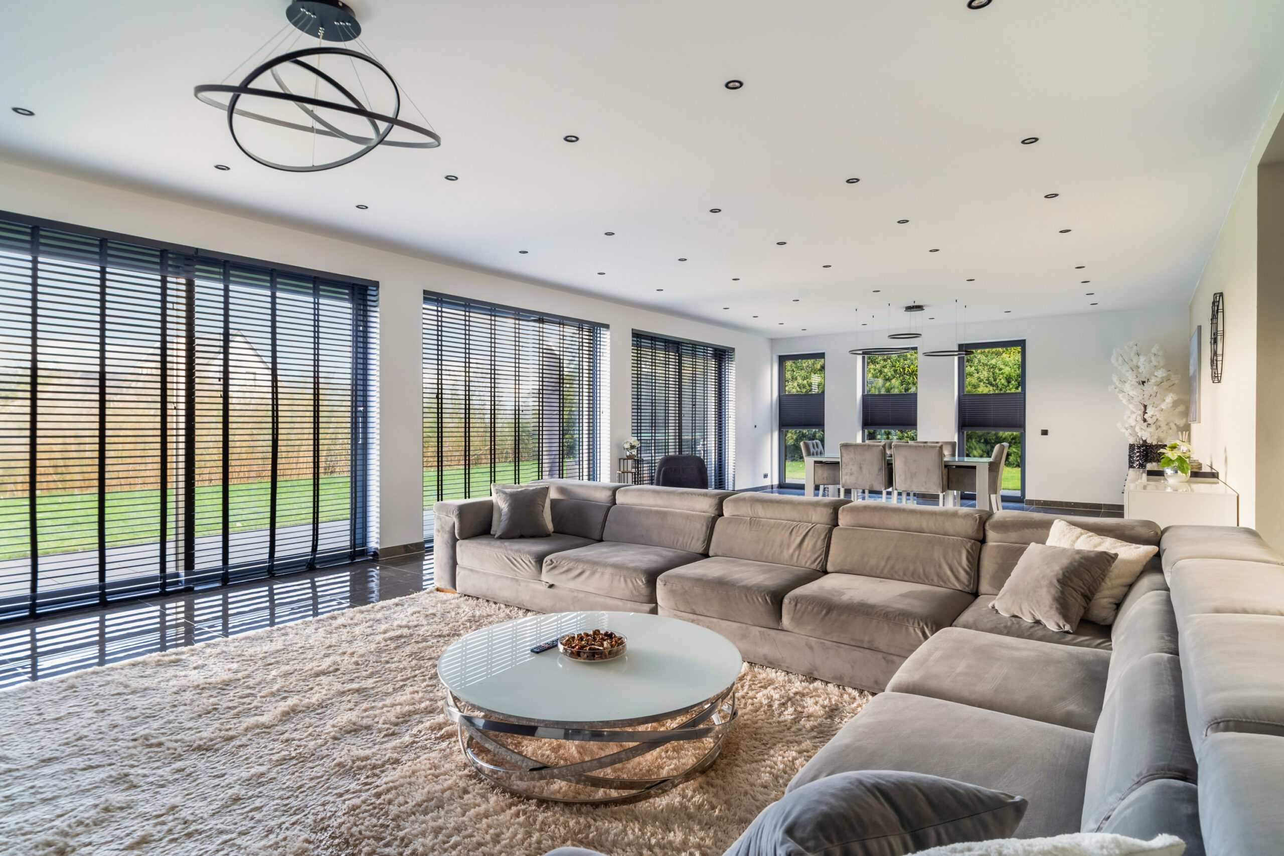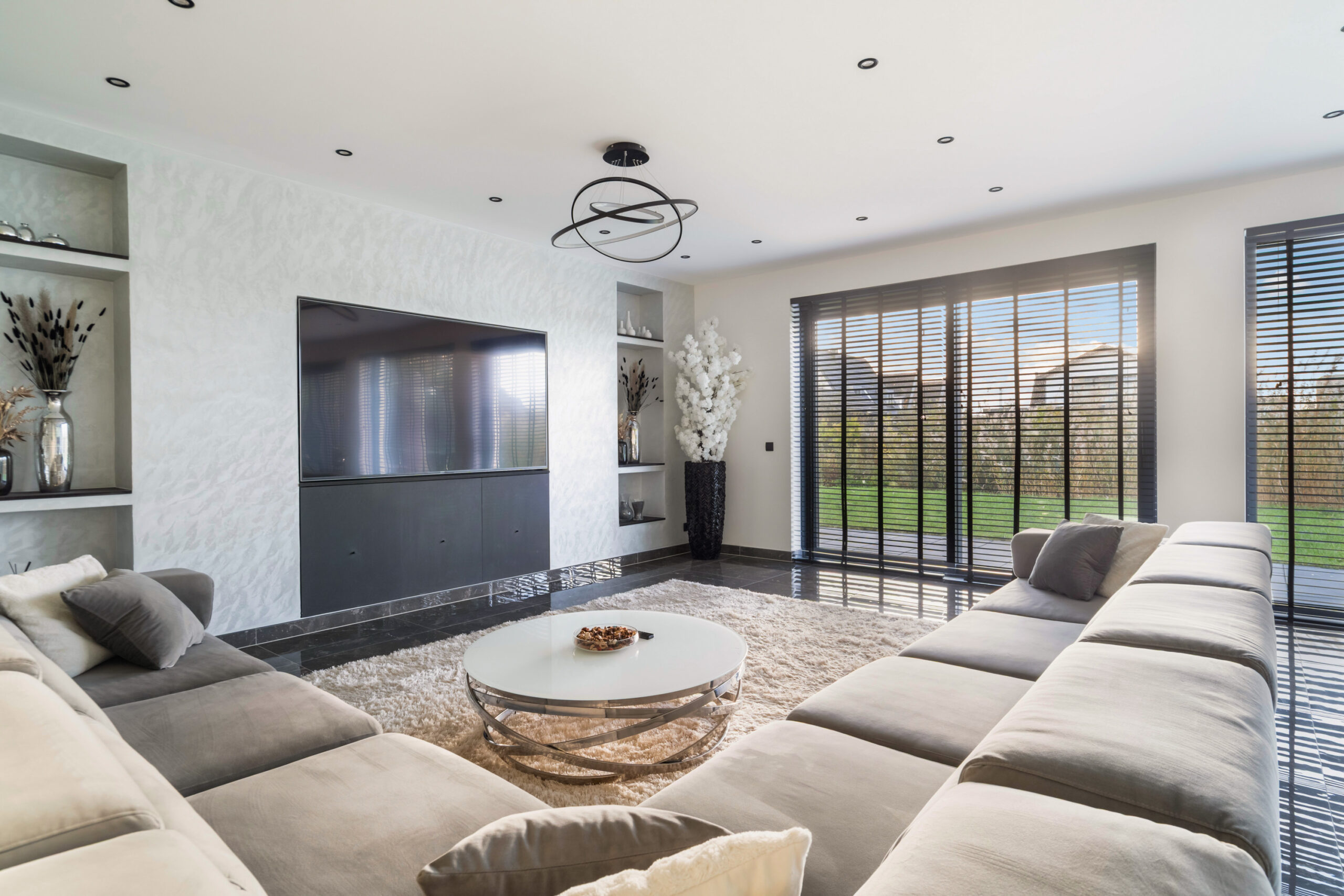 -De zeer lichte, royale woonkamer is voorzien van vloertegels, grote raampartijen, dubbele schuifpuien, dubbele deuren naar de tuin.