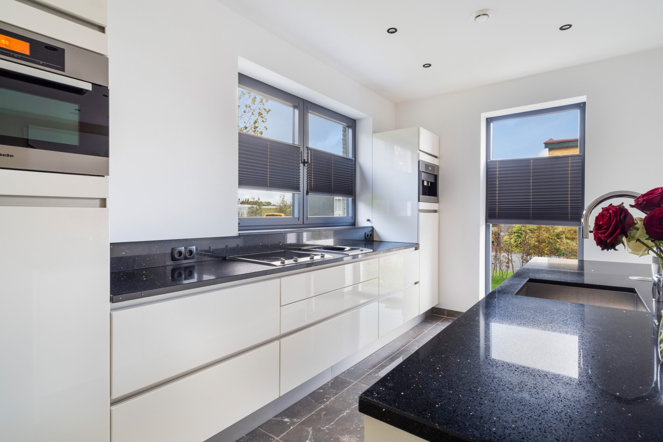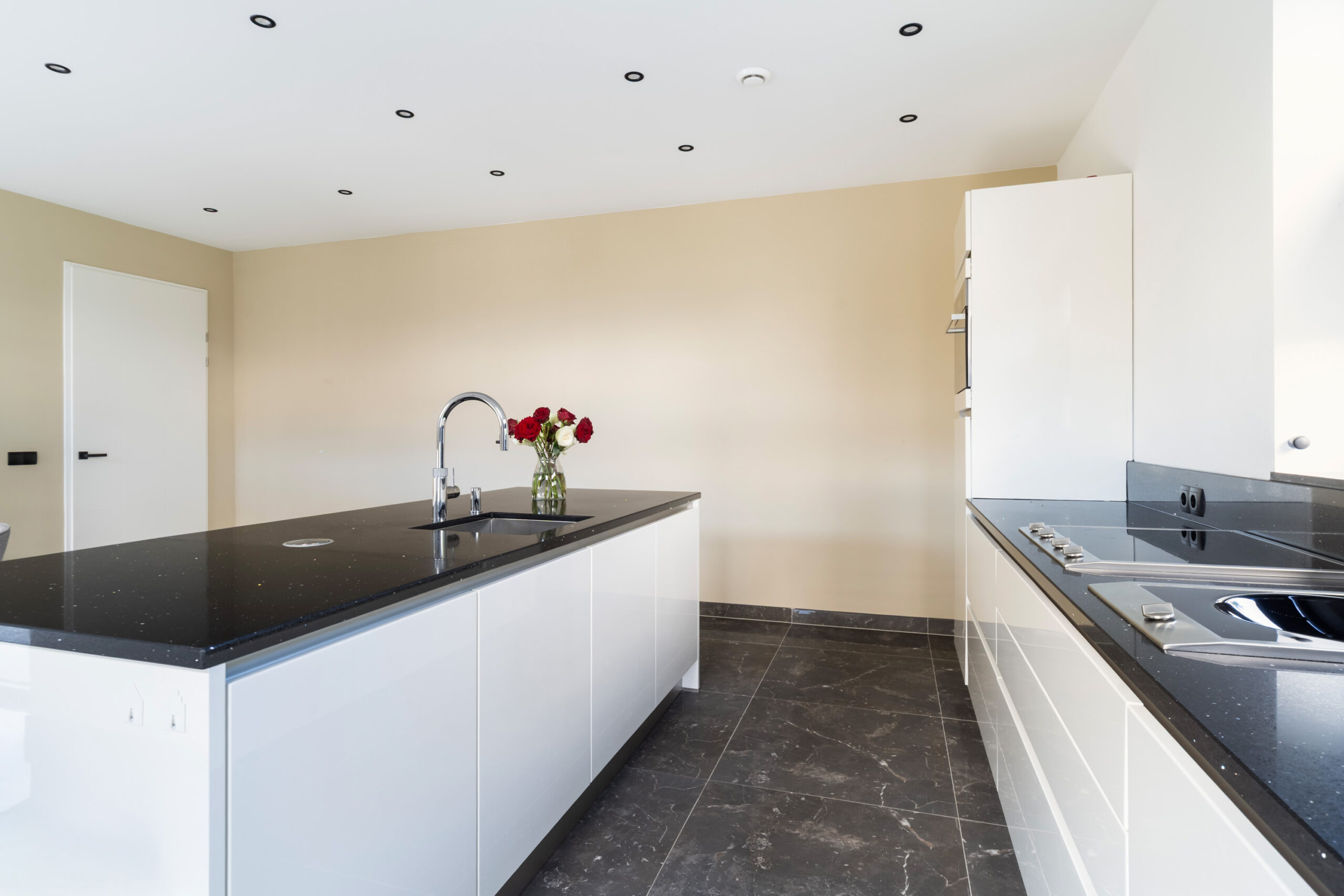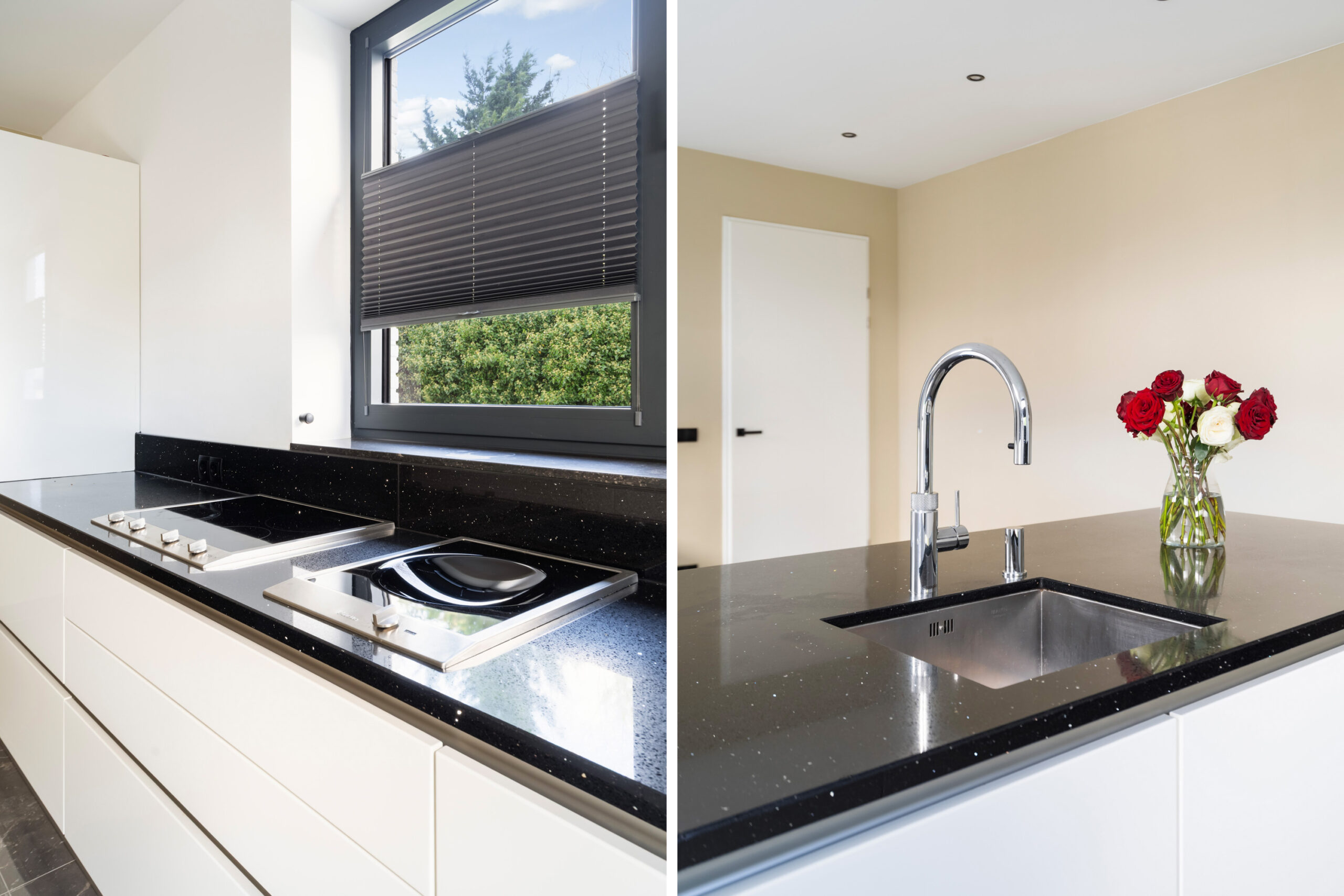 -Moderne woonkeuken met spoeleiland, die van alle comfort voorzien is: waaronder veel kastruimte en moderne Miele apparatuur: een inductie kookplaat met aparte wokbrander, vaatwasmachine, quooker, koelkast en vriezer en combi magnetron.