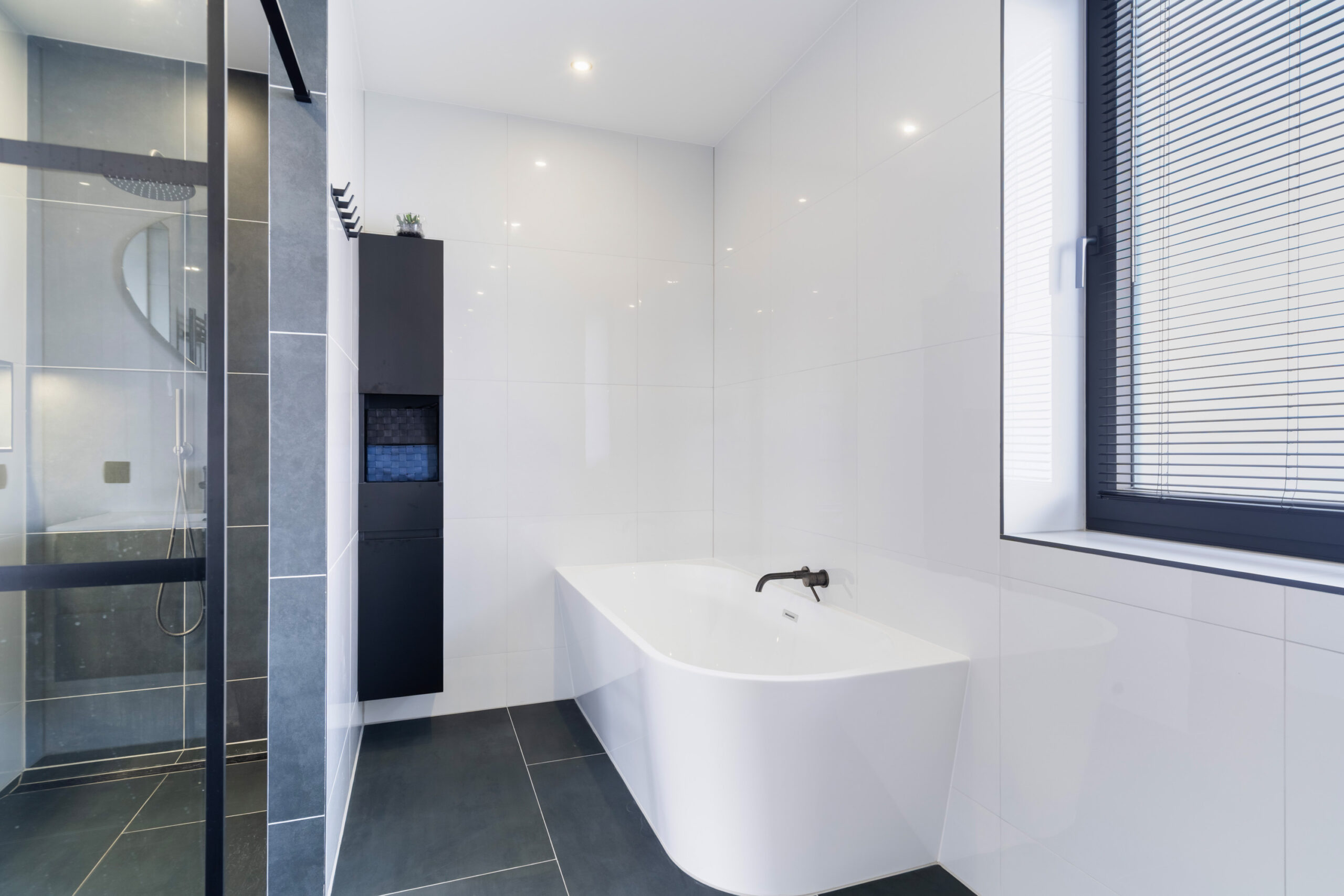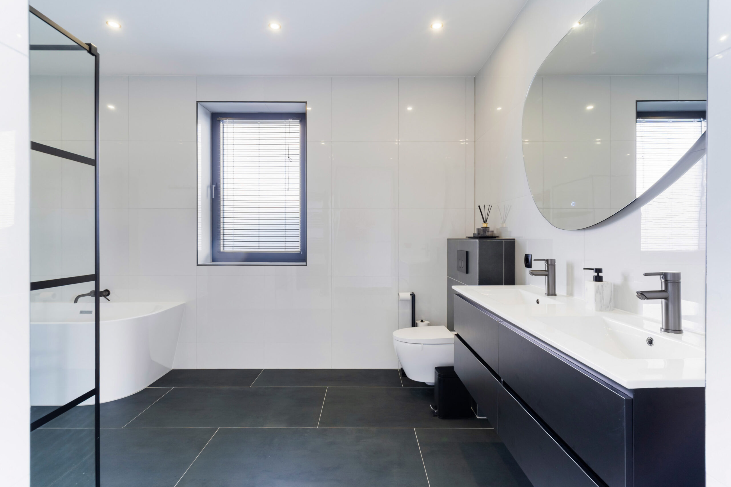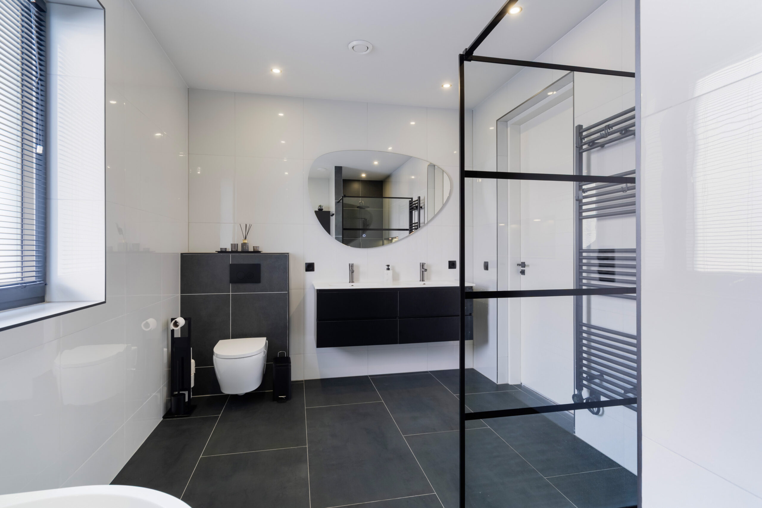 -Moderne lichte badkamer in lichte kleurstelling, toilet, inloopdouche, ligbad en wastafelmeubel met 2 spoelbakken