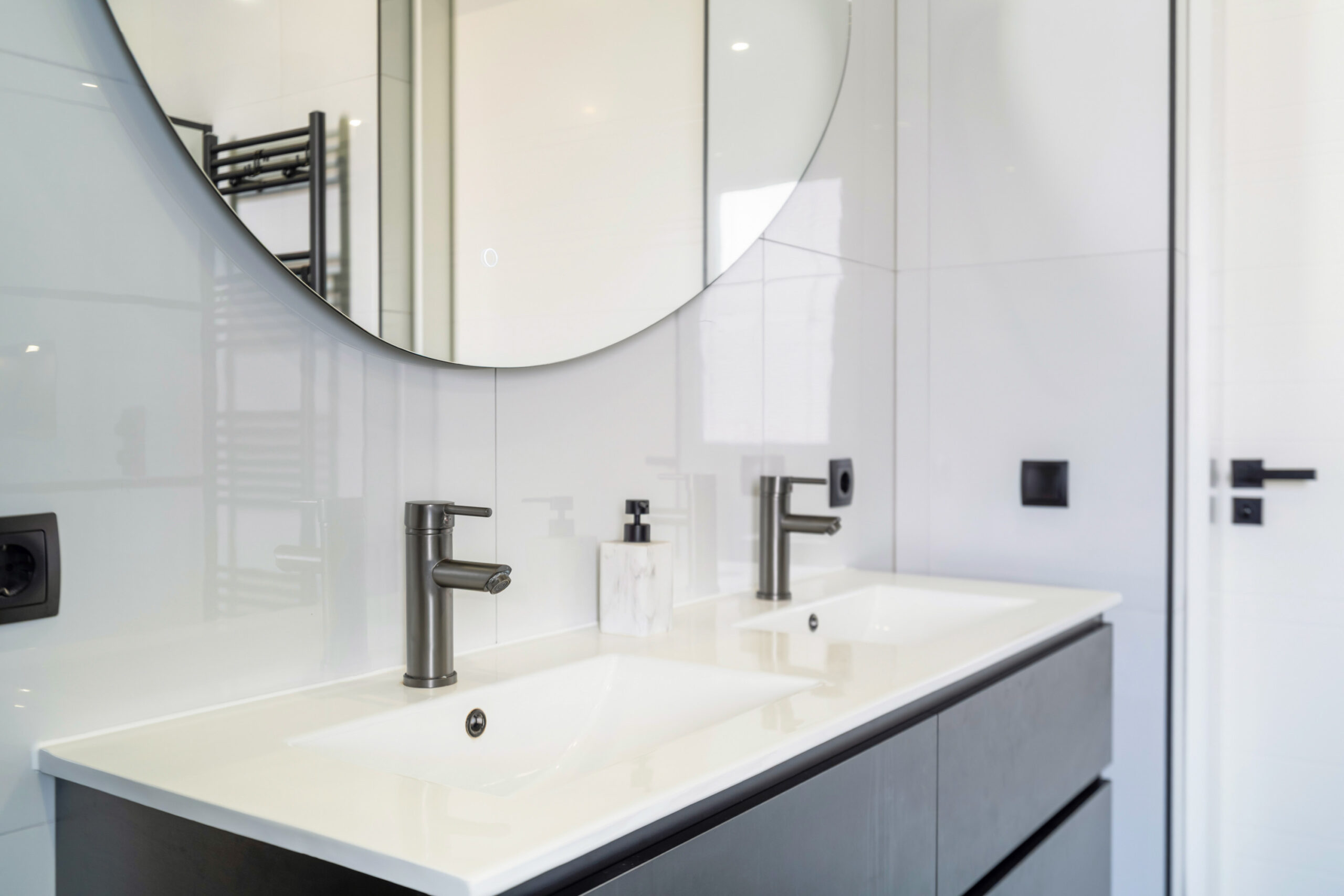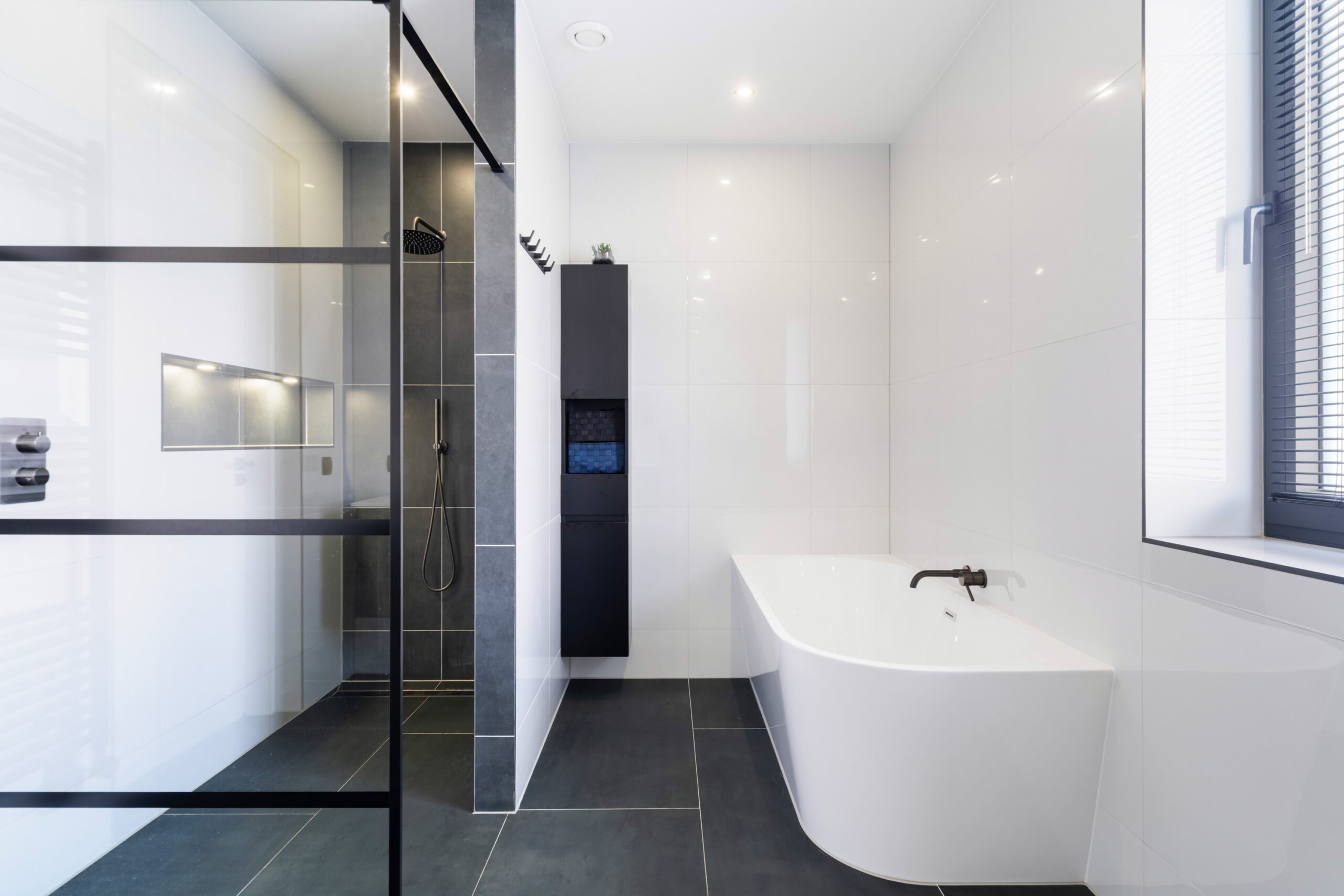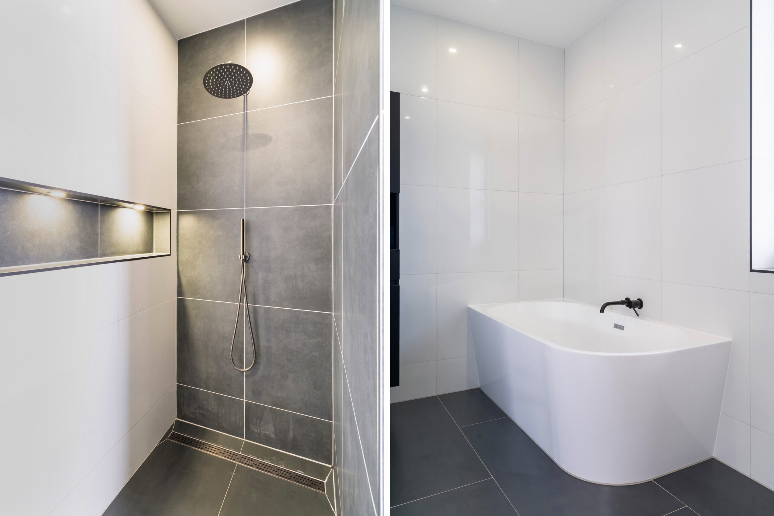 -Moderne lichte badkamer in lichte kleurstelling, toilet, inloopdouche, ligbad en wastafelmeubel met 2 spoelbakken