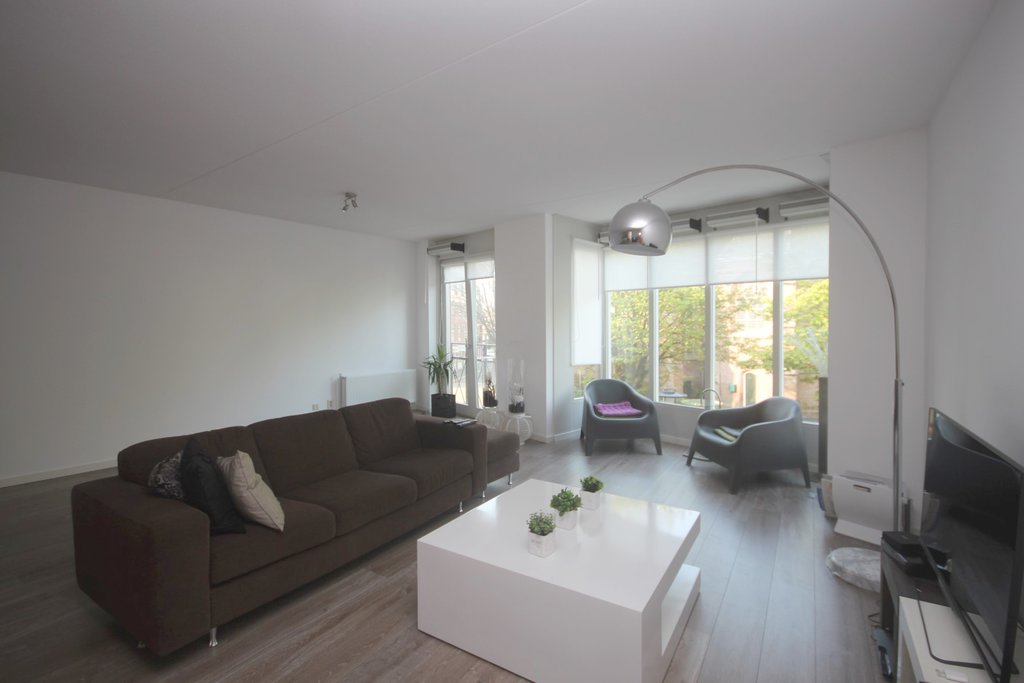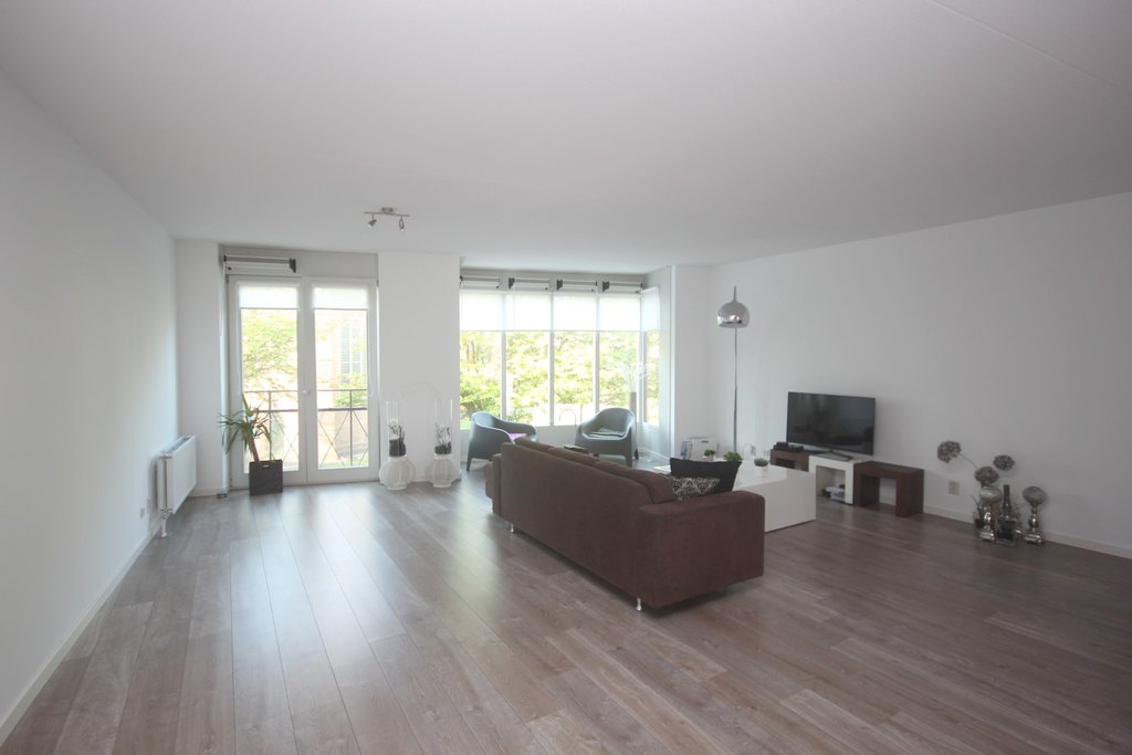 - Royale en lichte woonkamer met Frans balkon, mooie laminaatvloer, gordijnen en grote raampartijen.