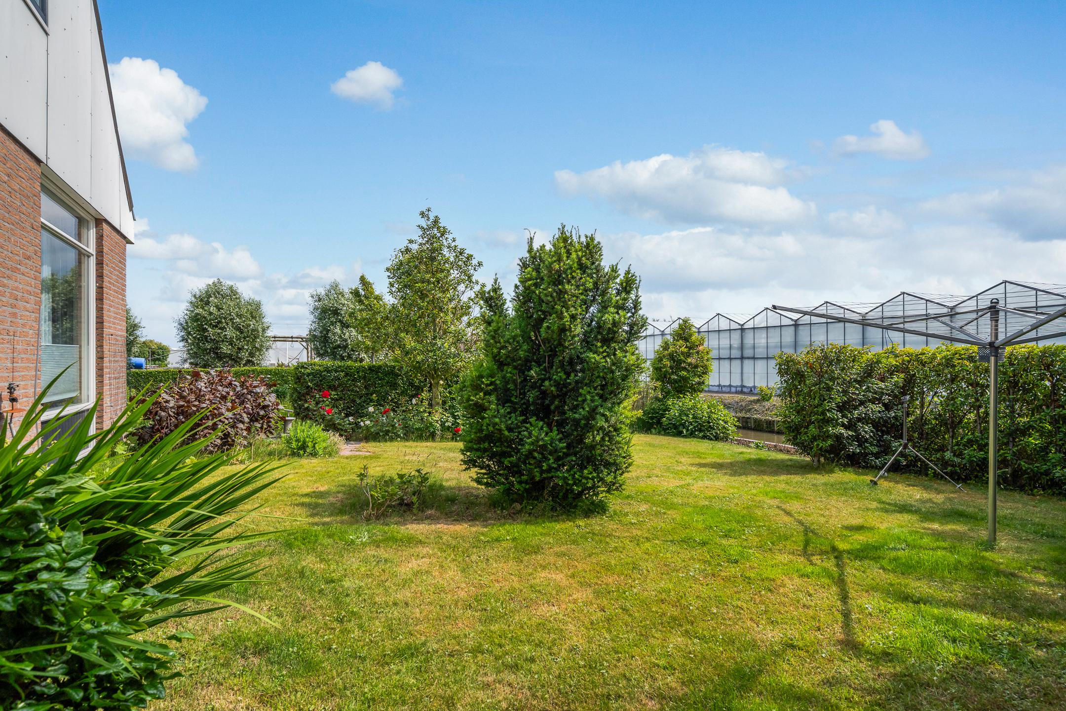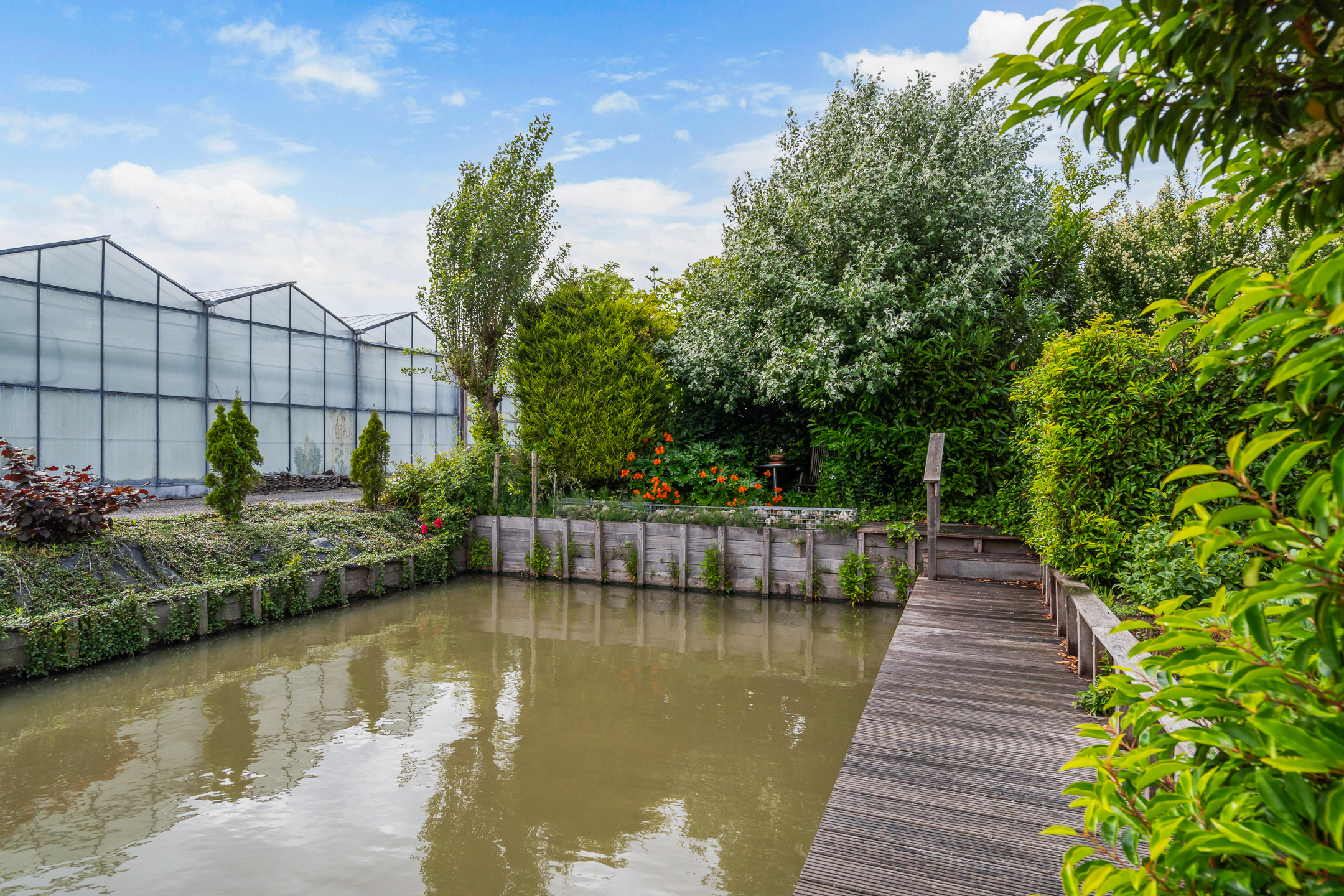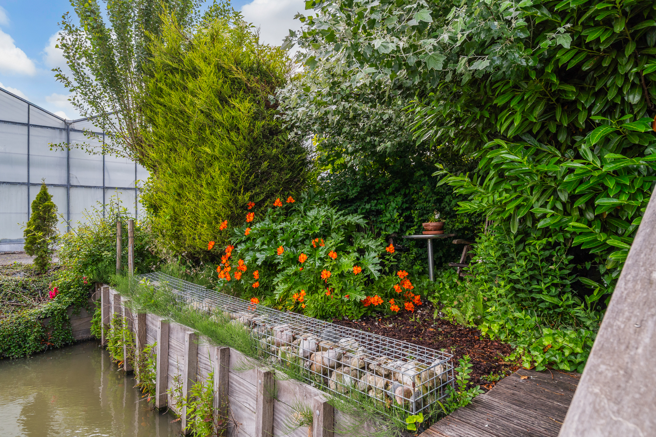 - Zeer royale achtertuin waar u op elk moment van de dag wel van het zonnetje kunt genieten. De tuin is verzorgd aangelegd en is voorzien van sierbestrating, diverse gazons, veel mooie groenborders, diverse gezellige zitjes, een moestuin en een ruime hobbykas die ook als garage kan worden gebruikt. De tuin is gelegen aan vaarwater en heeft een grote steiger.