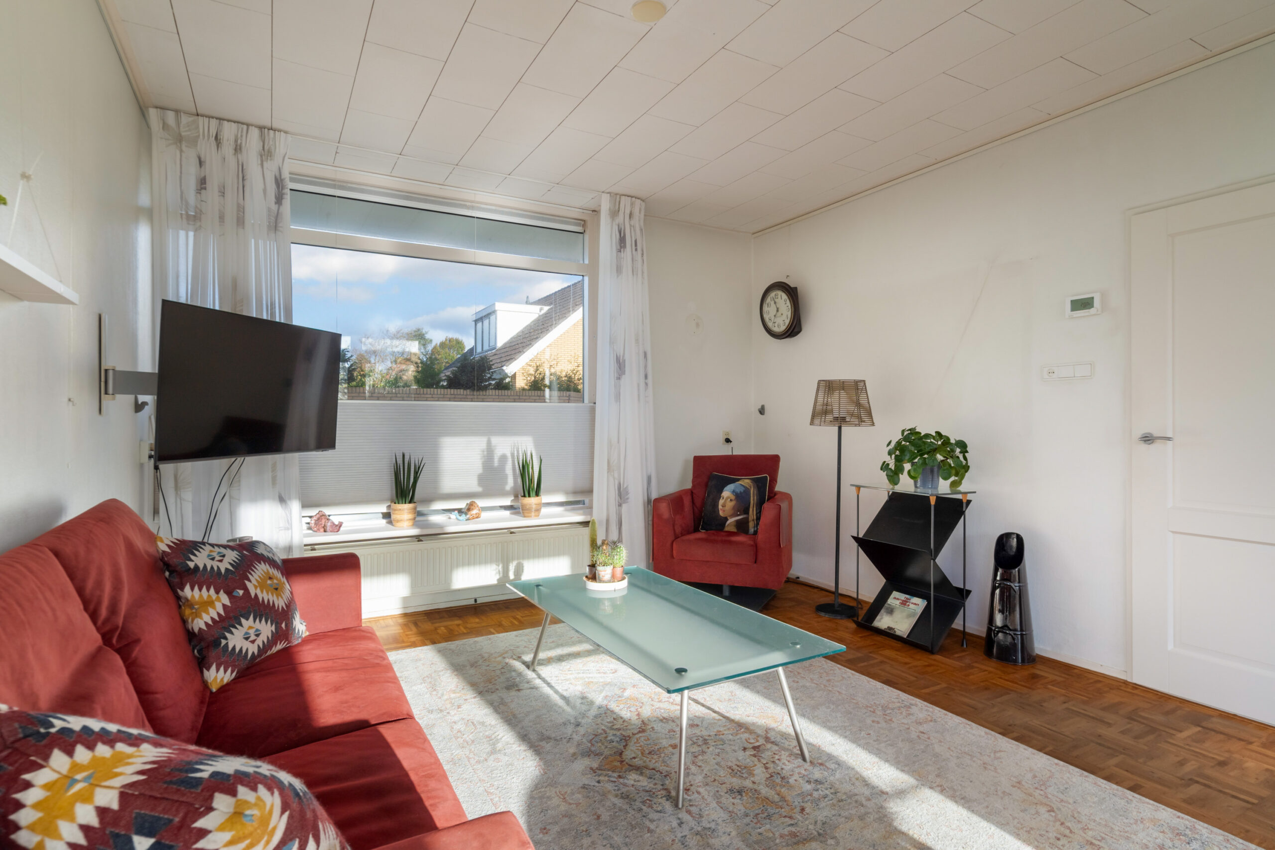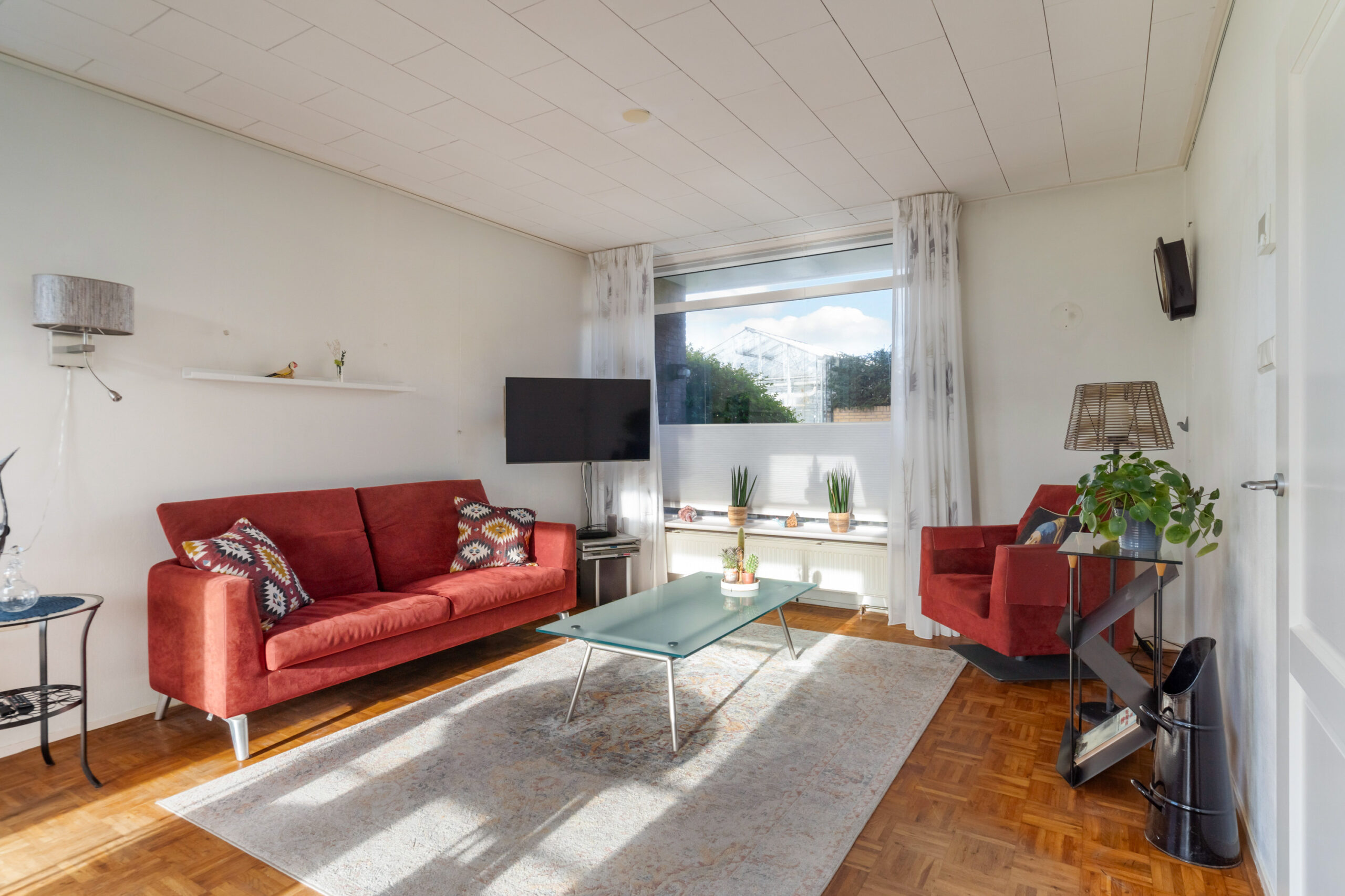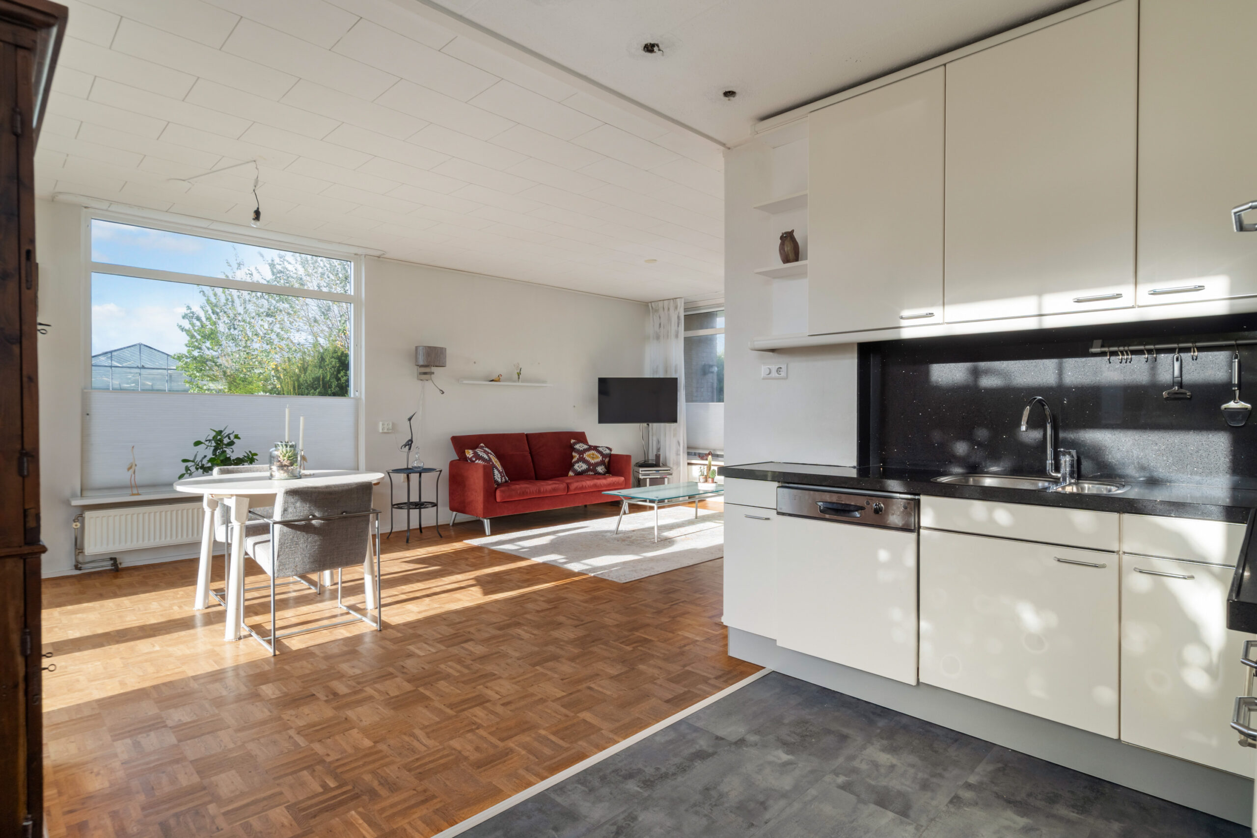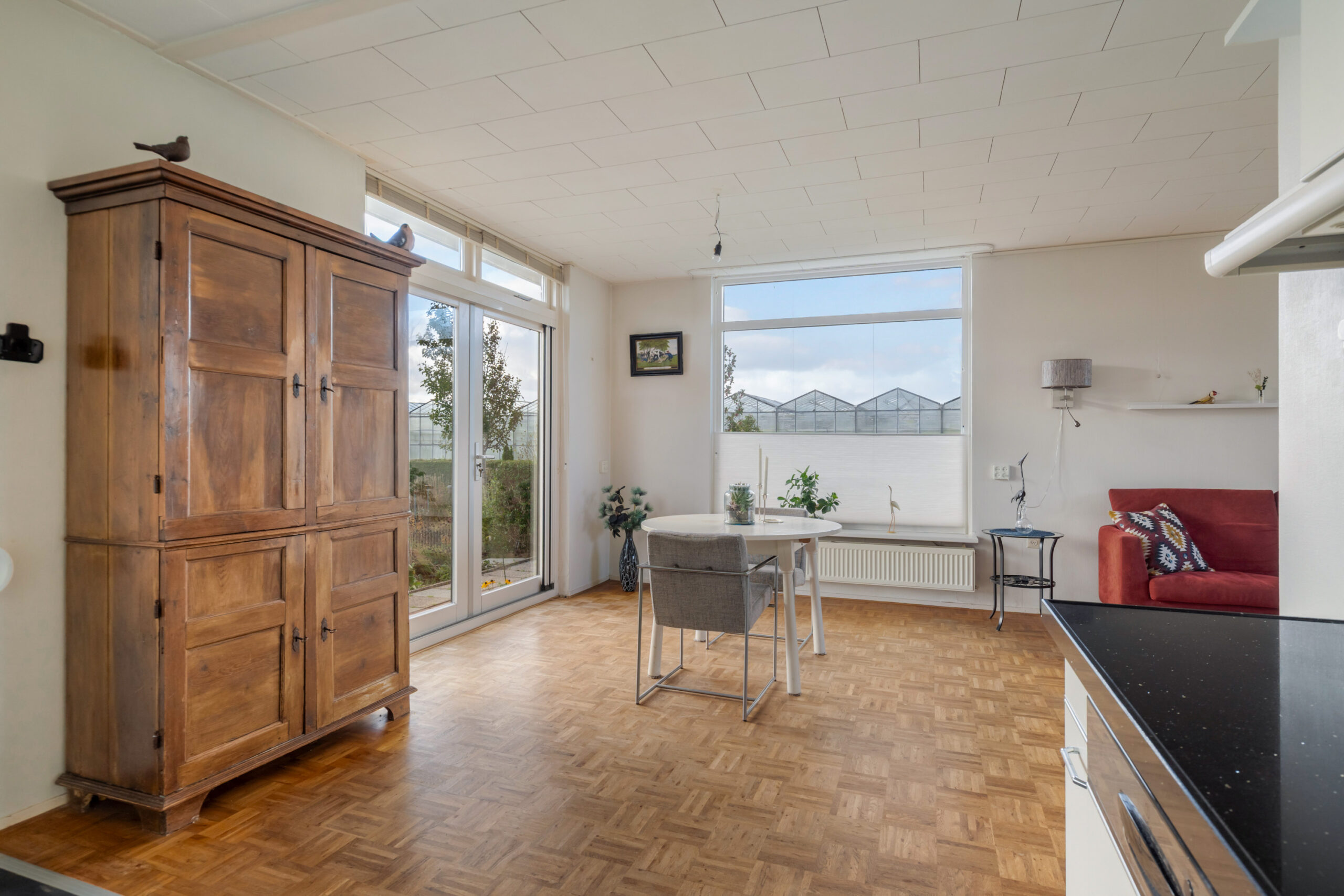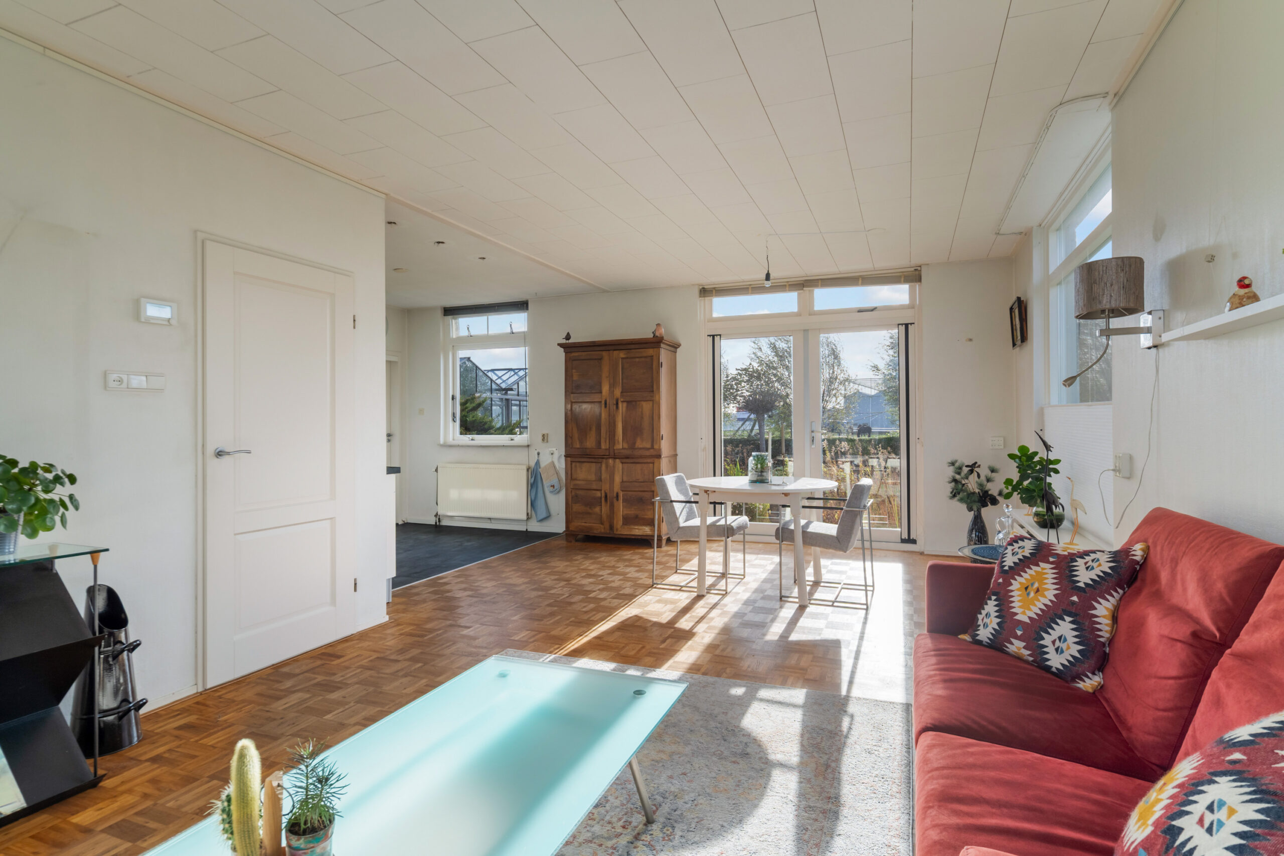 - Lichte woonkamer met grote raampartijen, parketvloer en openslaande deuren naar de achtertuin.