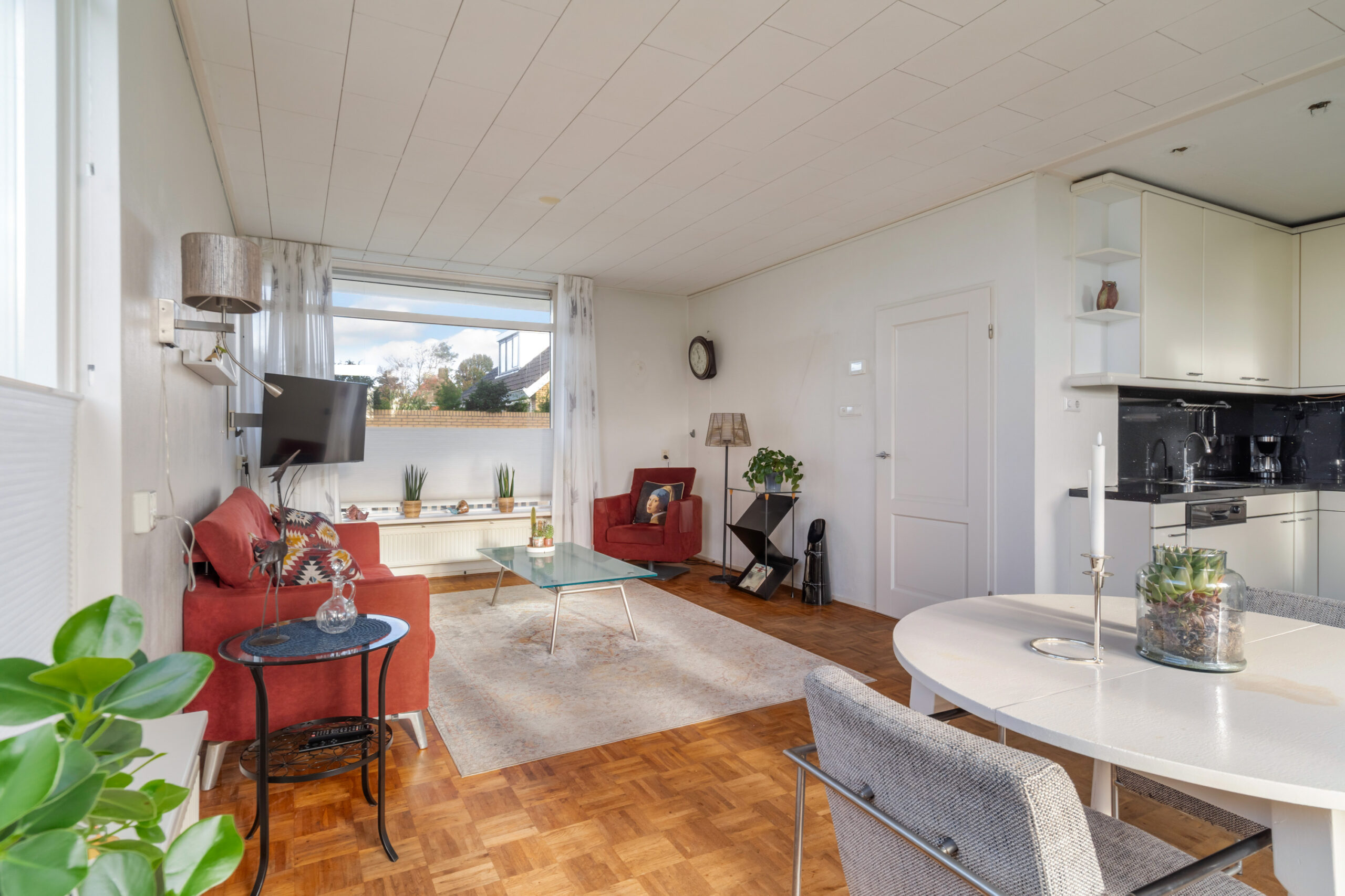 - Lichte woonkamer met grote raampartijen, parketvloer en…