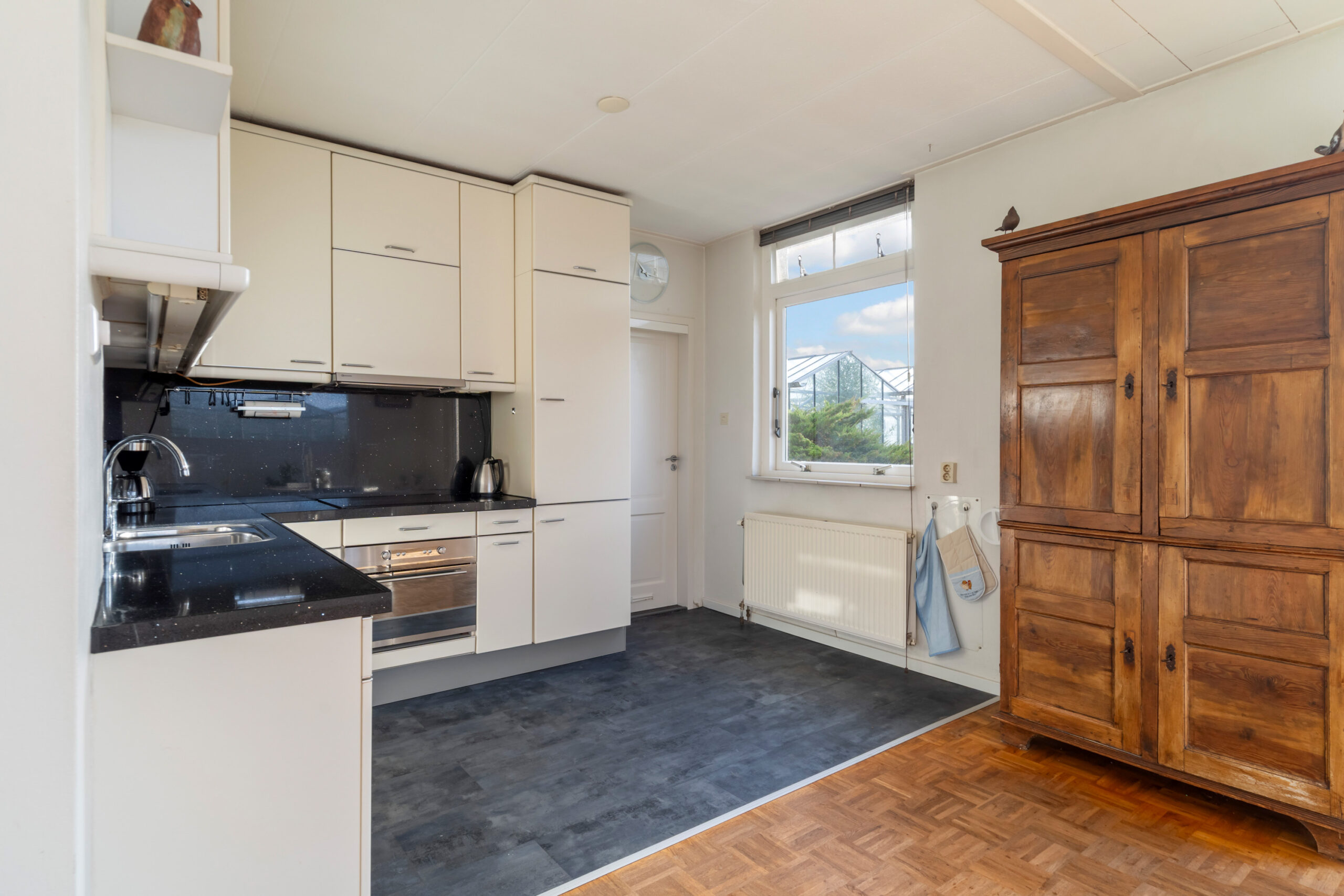 - Bijkeuken met wasmachineaansluiting, opstelplaats van de c.v.-ketel (Remeha Avanta, circa 2011), vaste kast en deur naar de achtertuin.