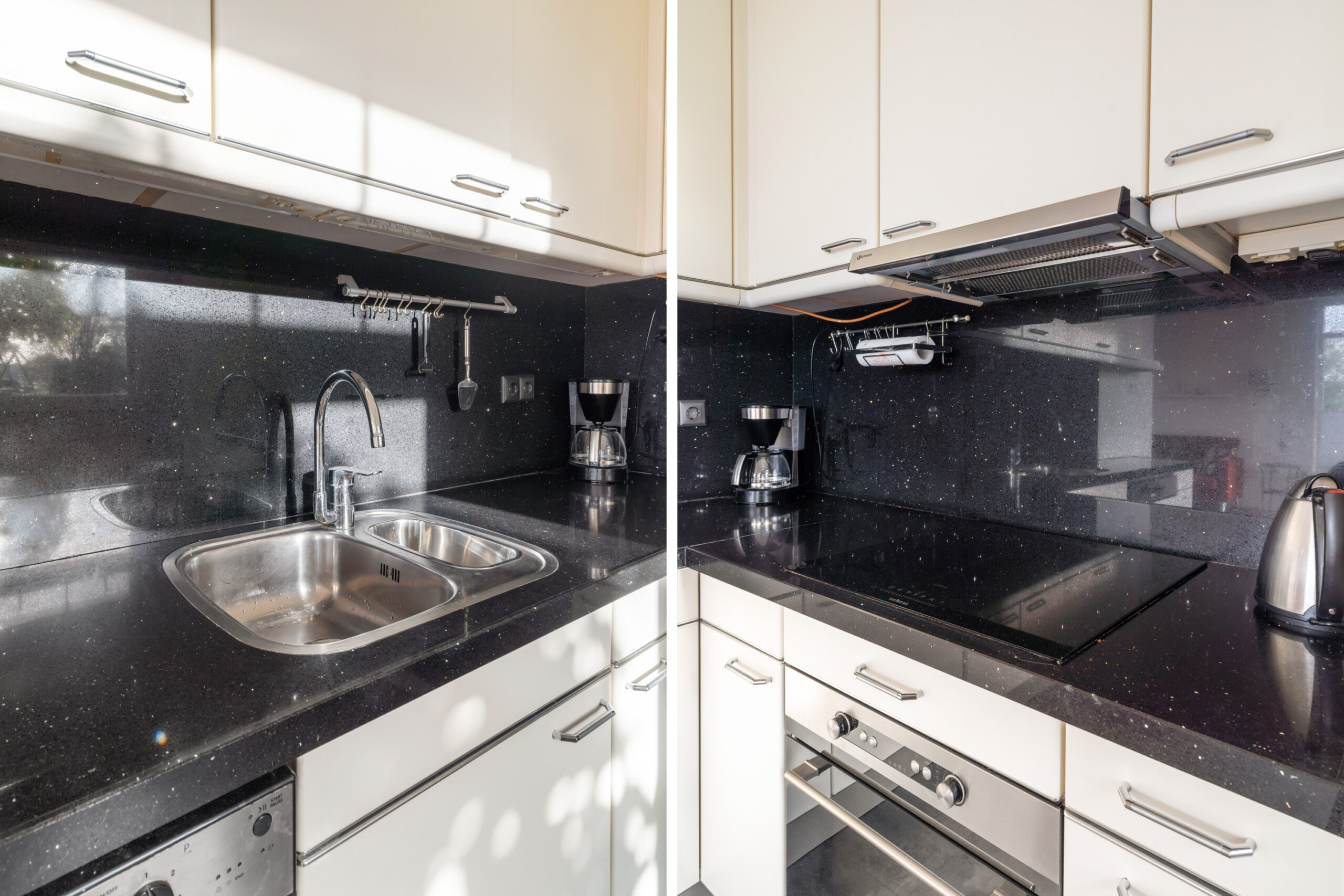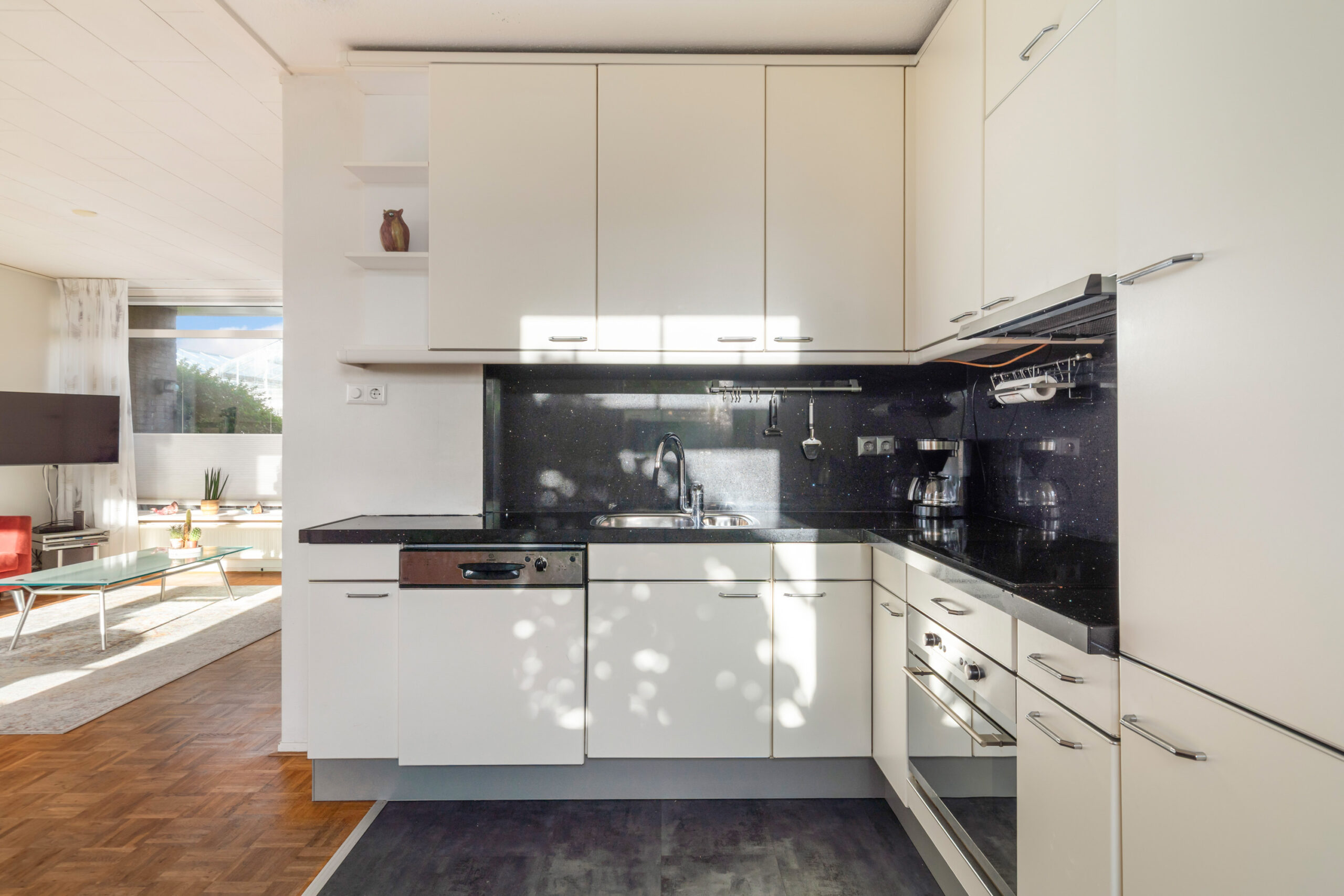 - Open keuken in lichte kleurstelling en voorzien van een composiet blad, inbouwapparatuur en toegangsdeur naar de praktische bijkeuken.