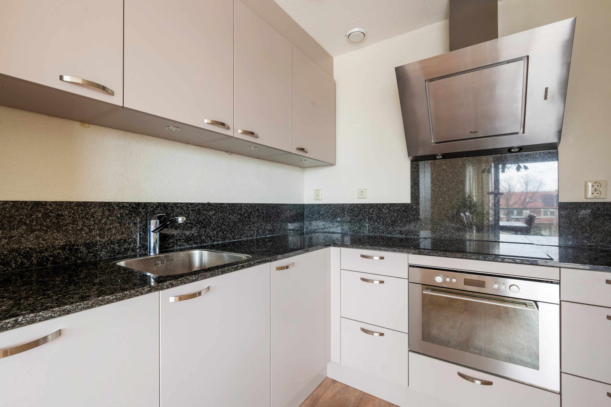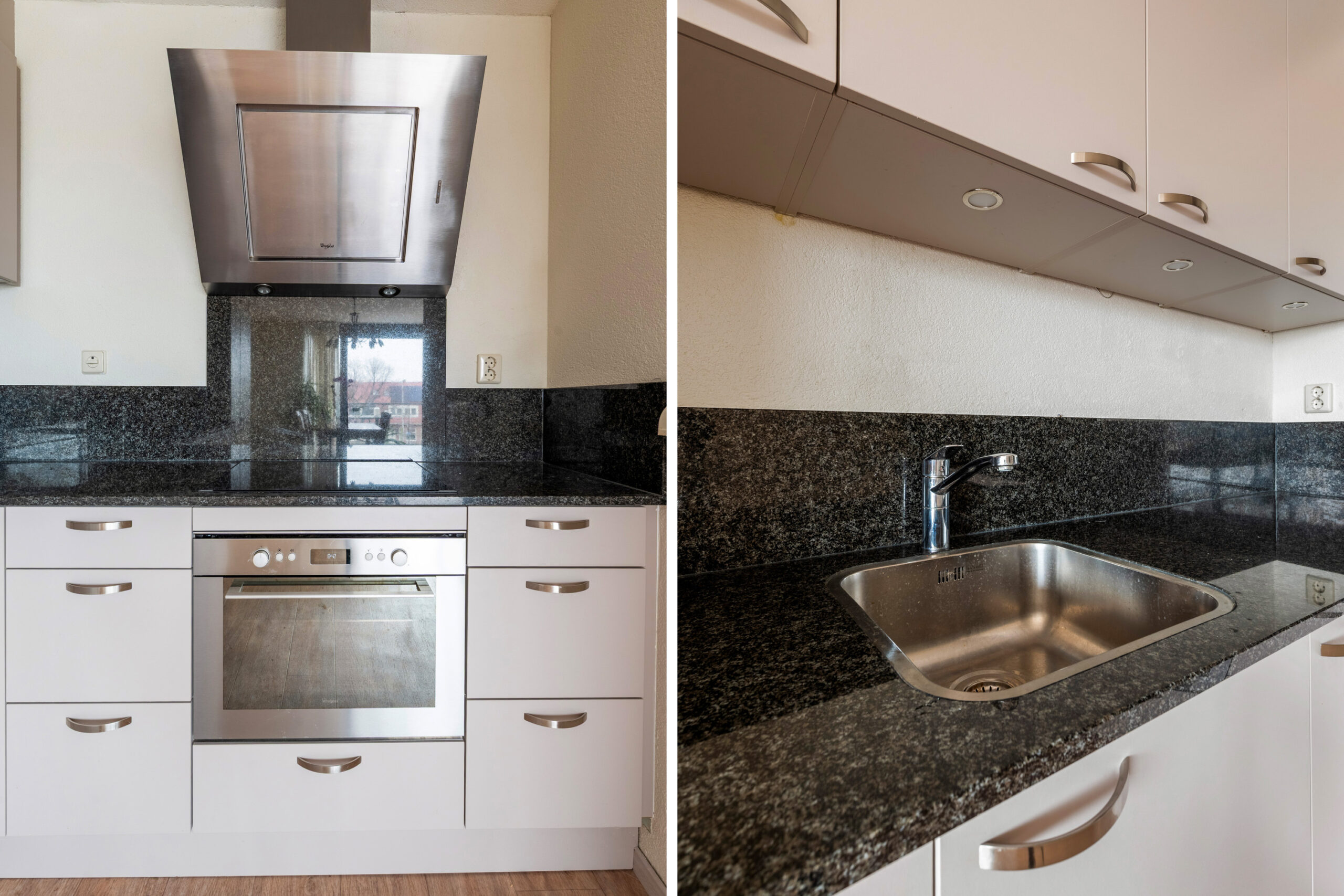 - Halfopen keuken in lichte kleurstelling, voorzien van diverse inbouwapparatuur, zoals een koel-vriescombinatie, vaatwasser, oven, gasfornuis en afzuigkap.