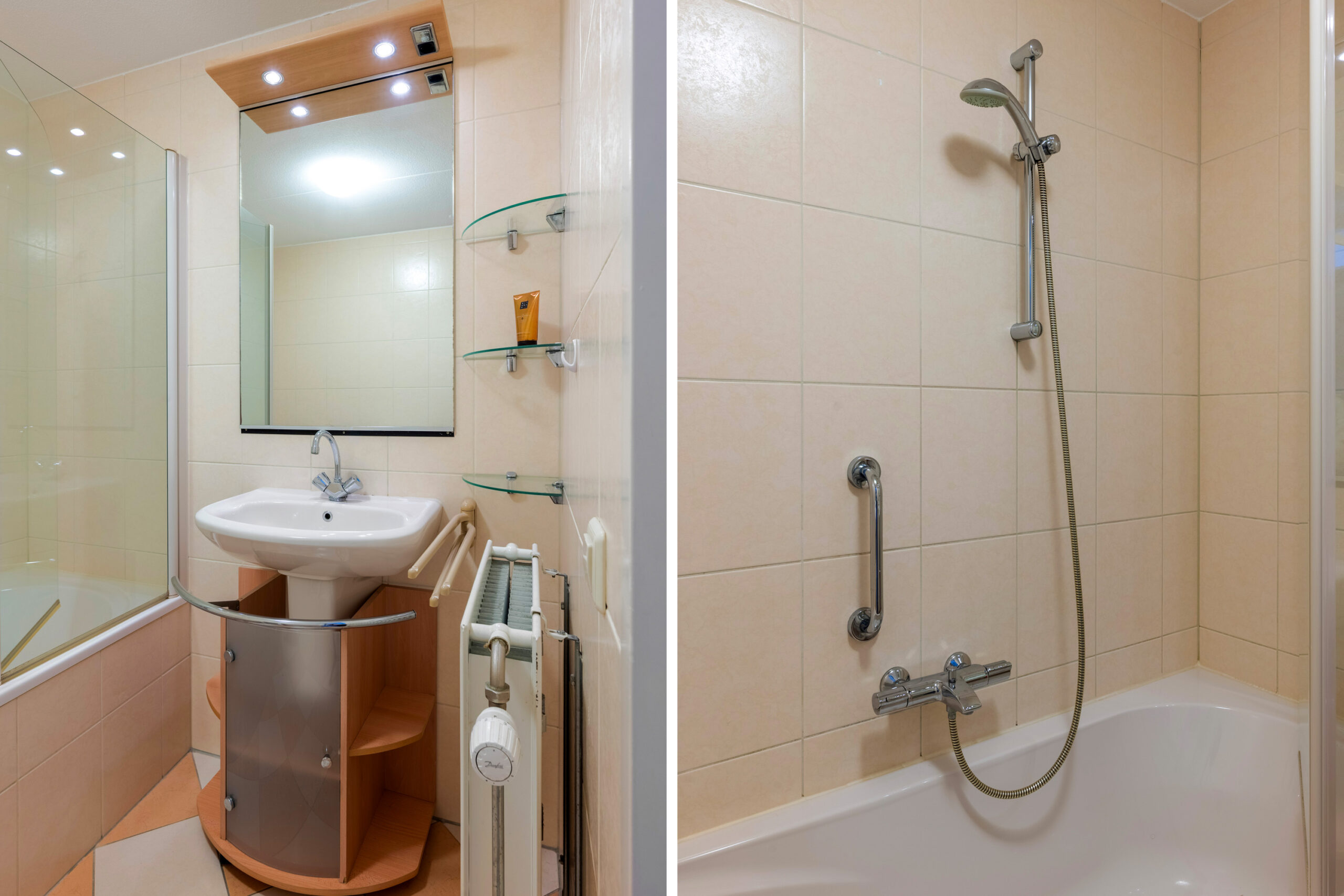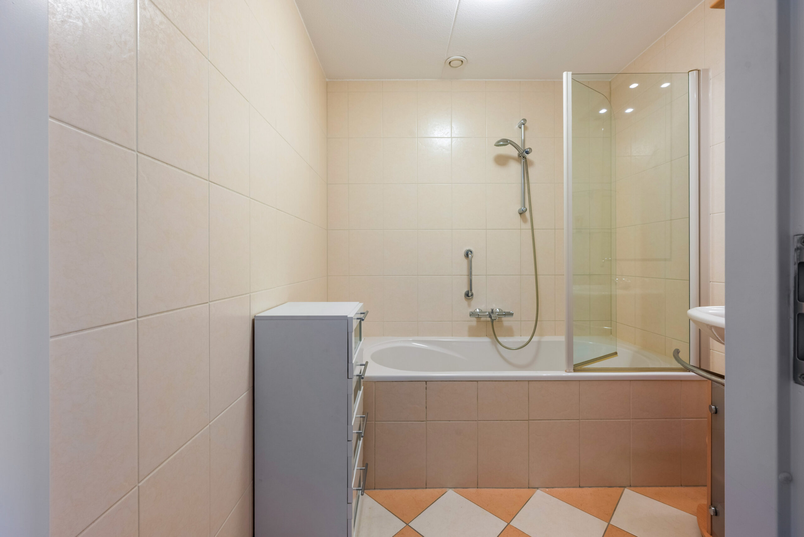 - Inpandige, geheel betegelde badkamer voorzien van ligbad, wastafel en radiator.
