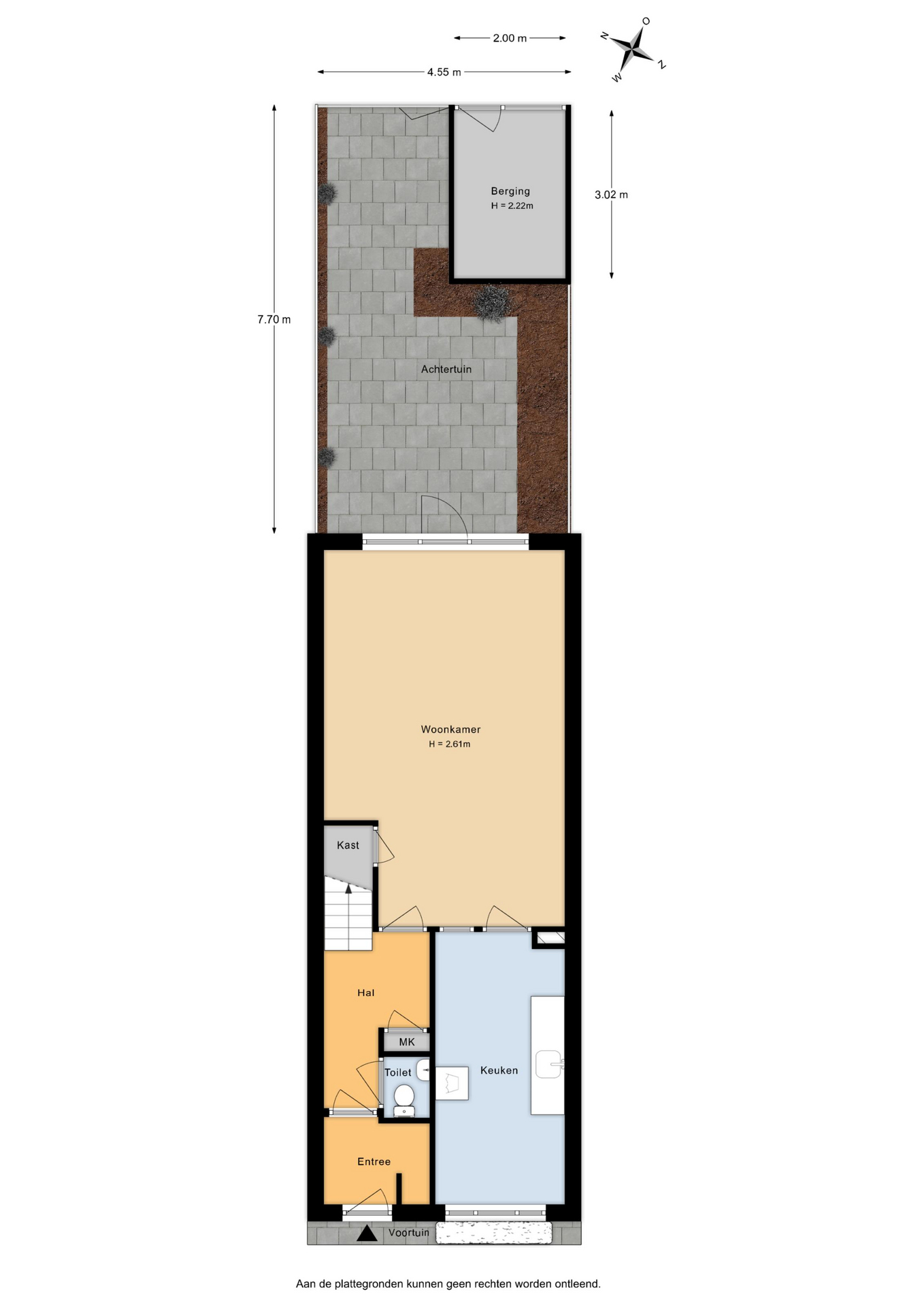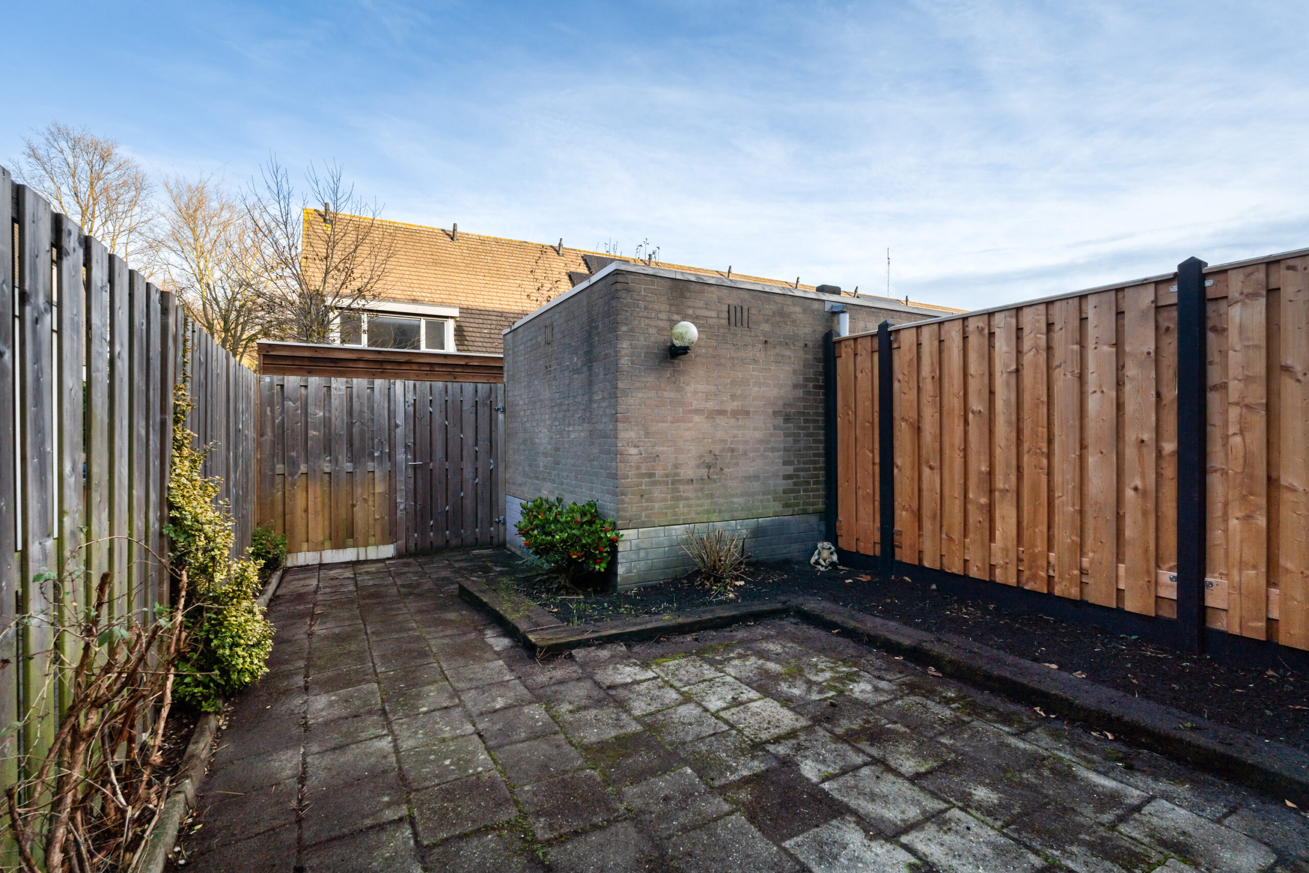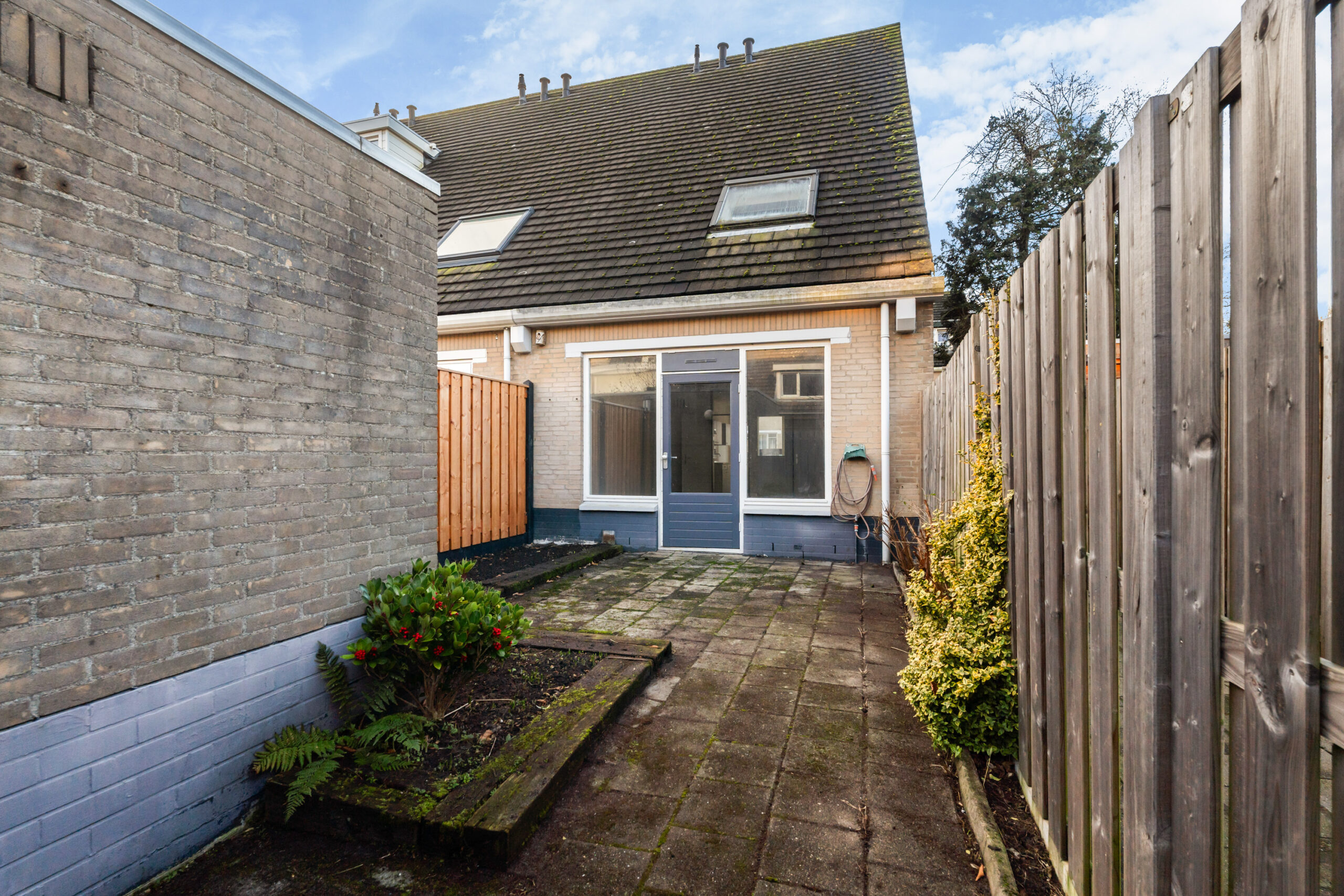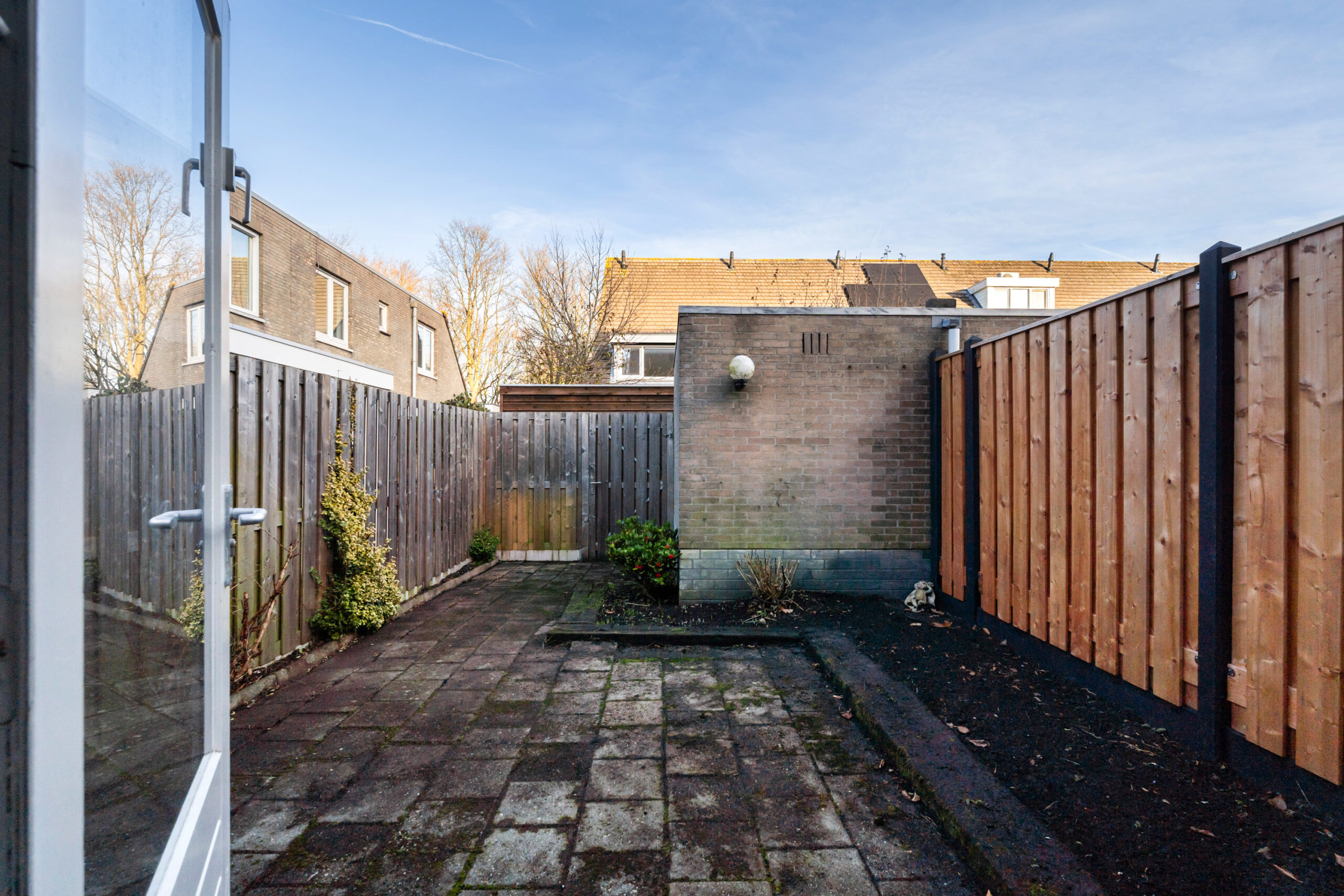 - Vanuit de woonkamer is de achtertuin, gelegen op het Oosten, te bereiken. De tuin is voorzien van een stenen berging en achterom.