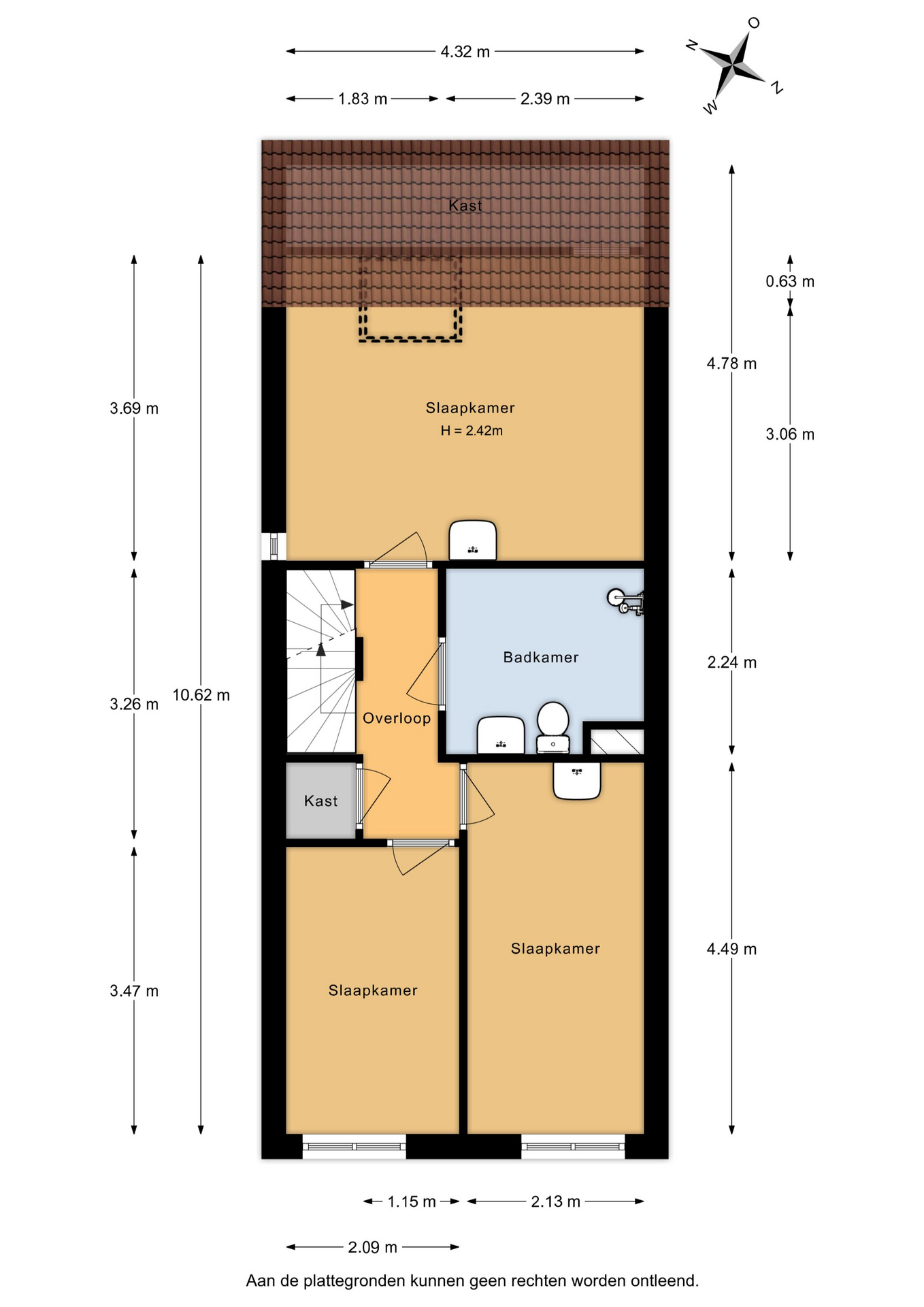 - Aan de voorzijde bevinden zich twee slaapkamers (ca. 4,49 x 2,13 m en 3,47 x 2,09 m);