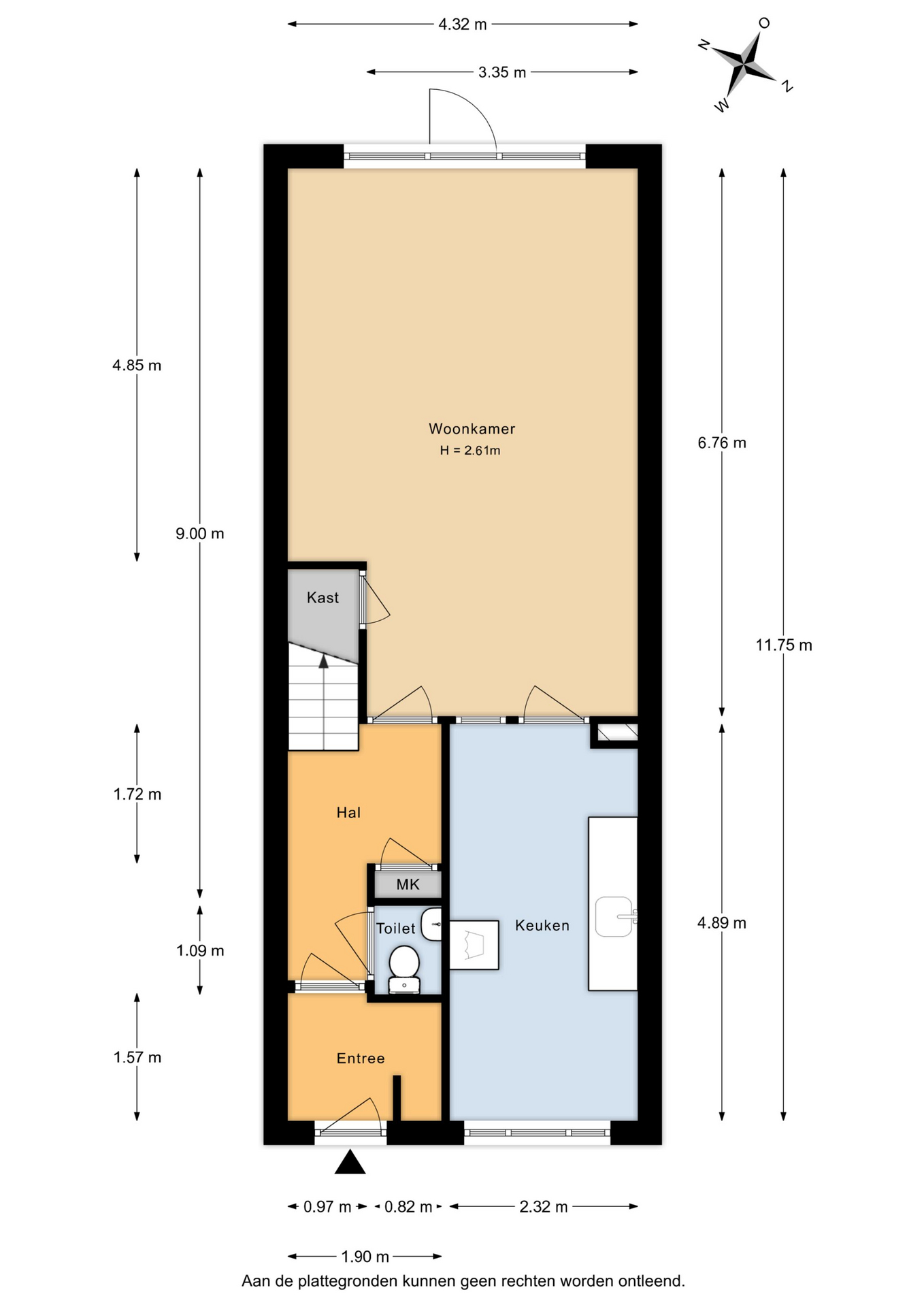 - Ruime woonkamer (ca. 6,76 x 4,32 m) met trapkast en toegang tot de achtertuin (O);