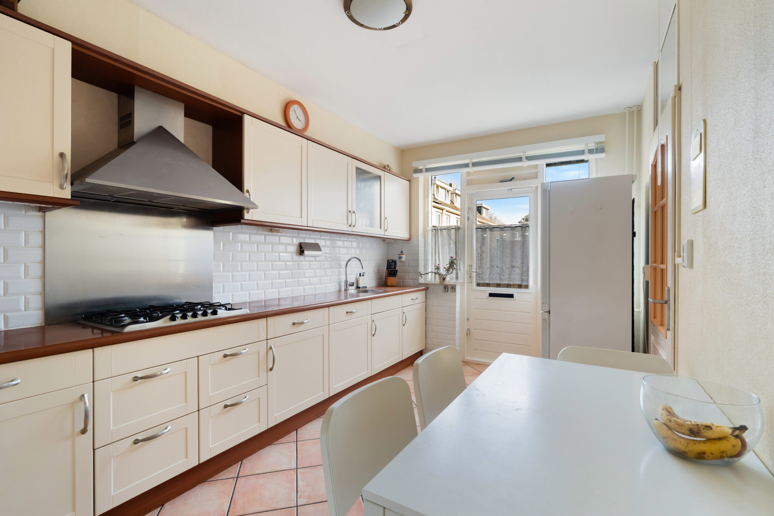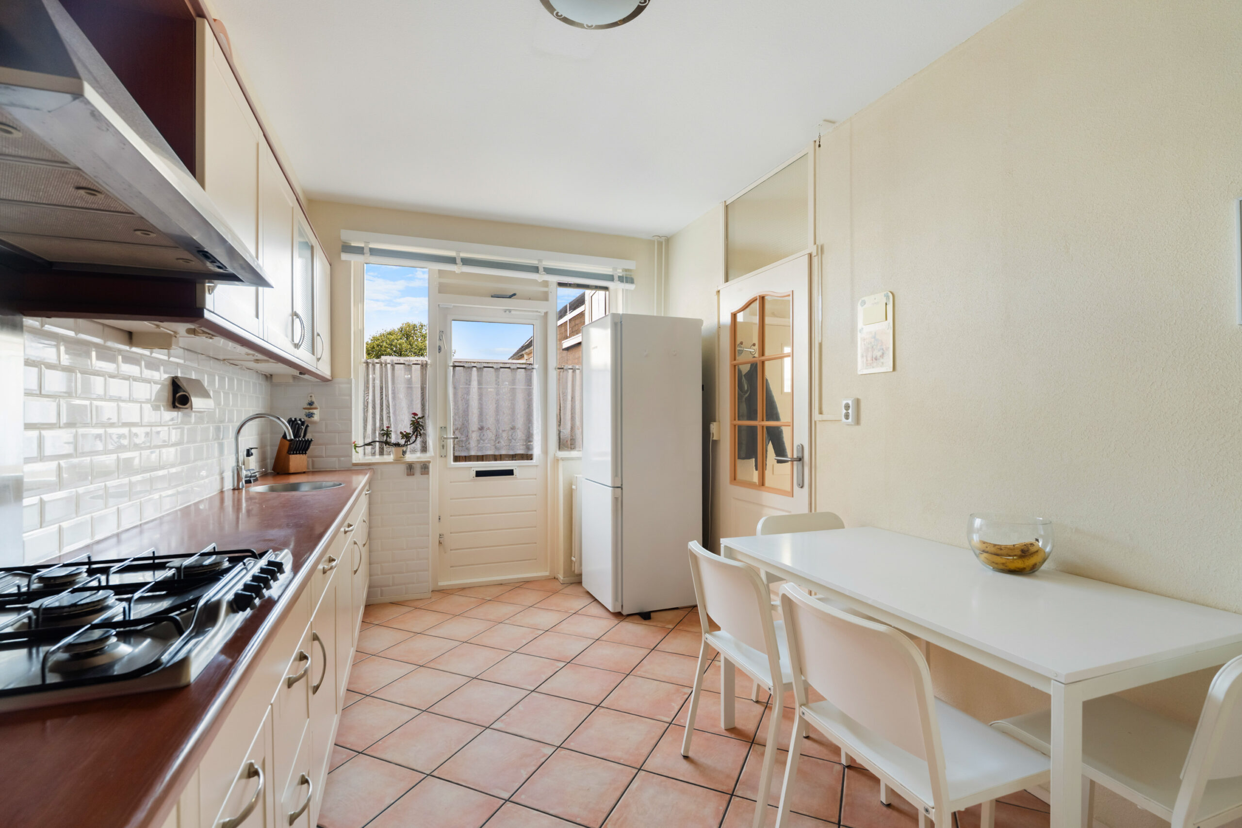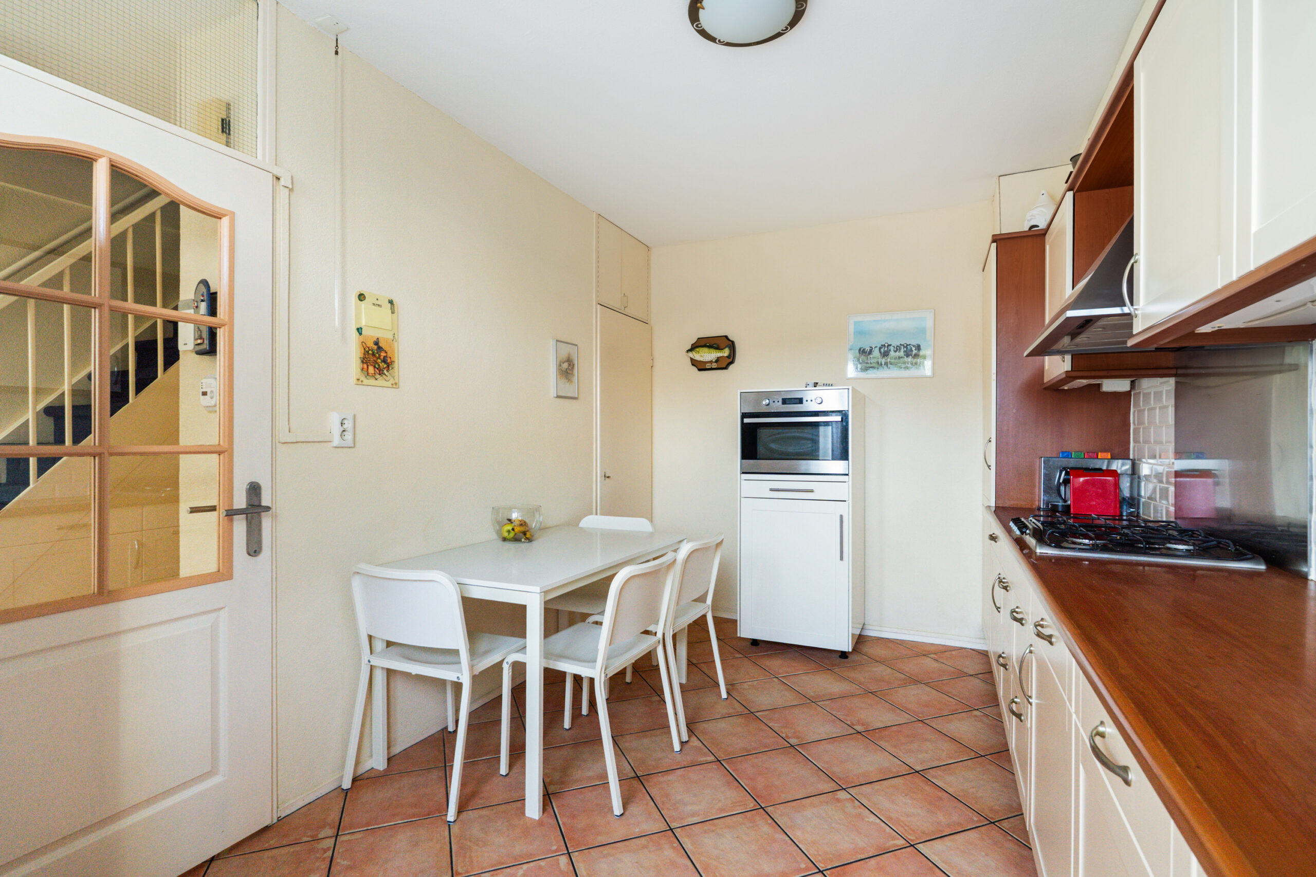 - De dichte keuken (ca. 2,66 x 4,54 m) is voorzien van diverse inbouwapparatuur, zoals een 5-pits gaskookplaat, afzuigkap, vaatwasser, combimagnetron, losse koel-vriescombinatie;