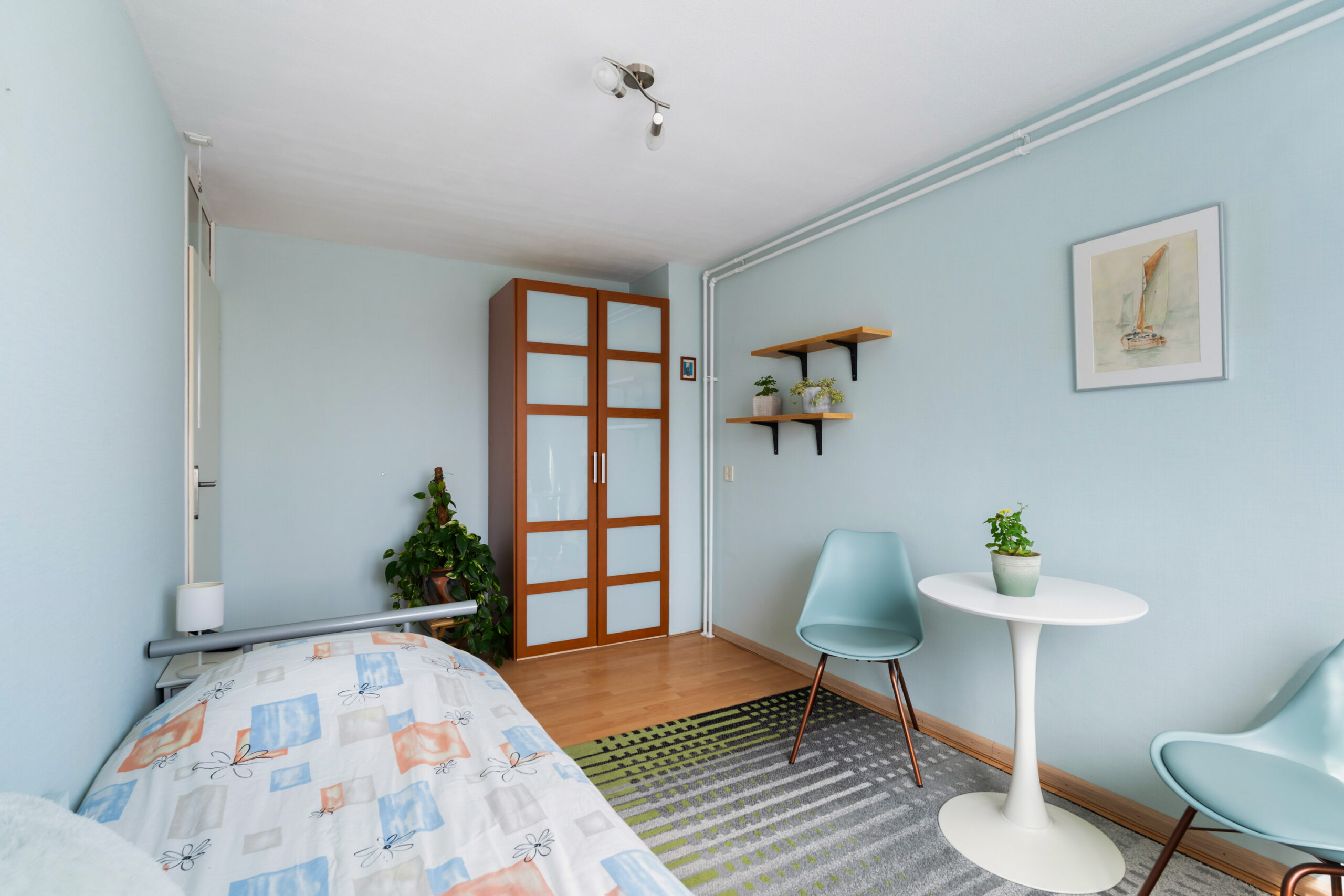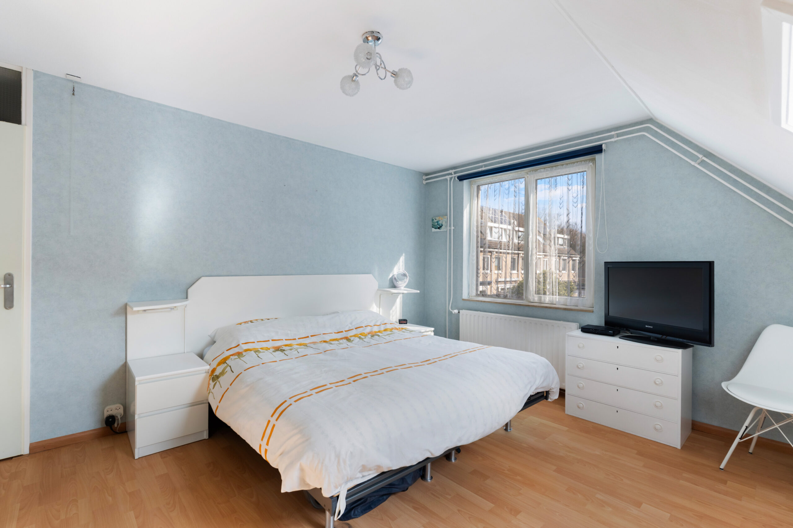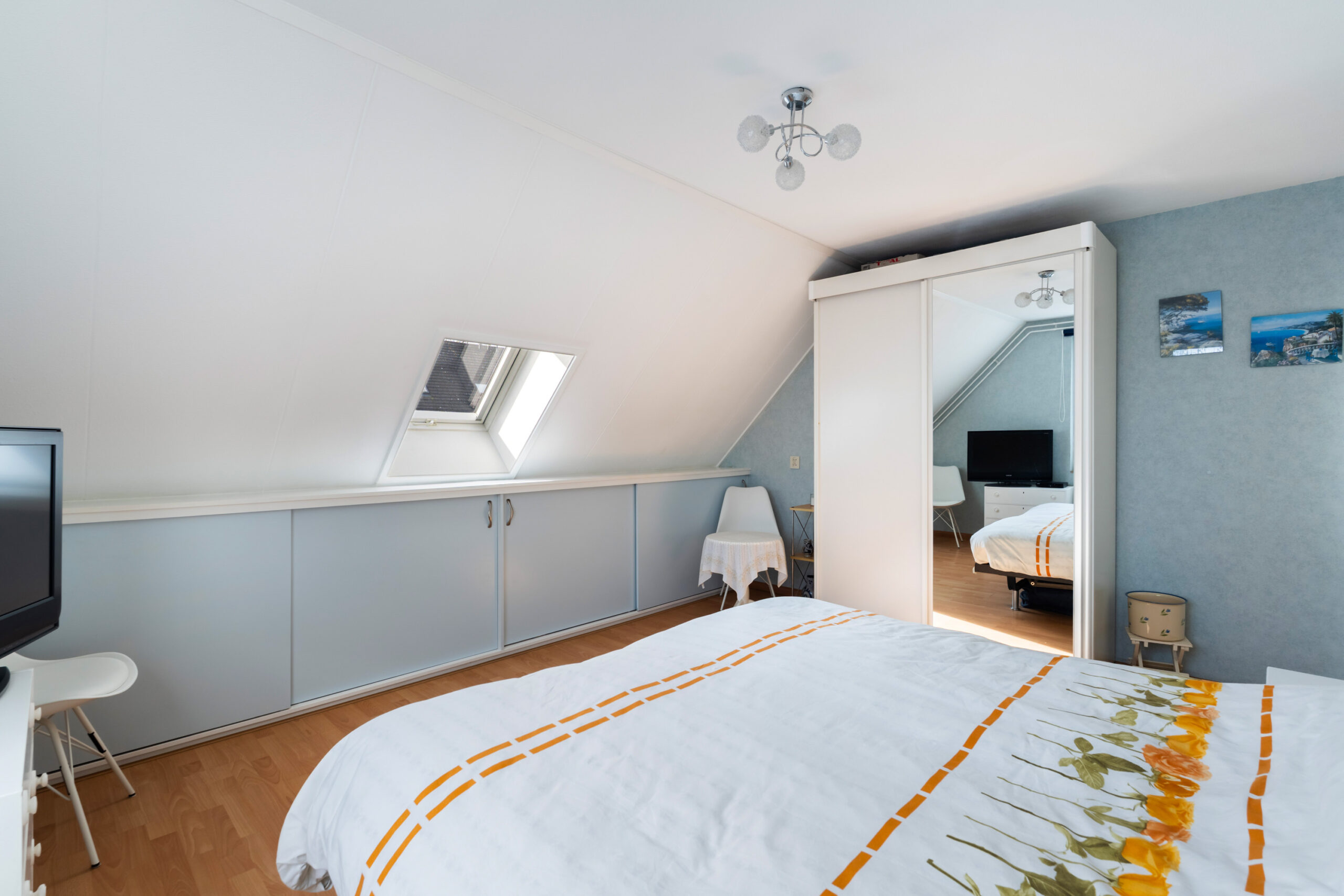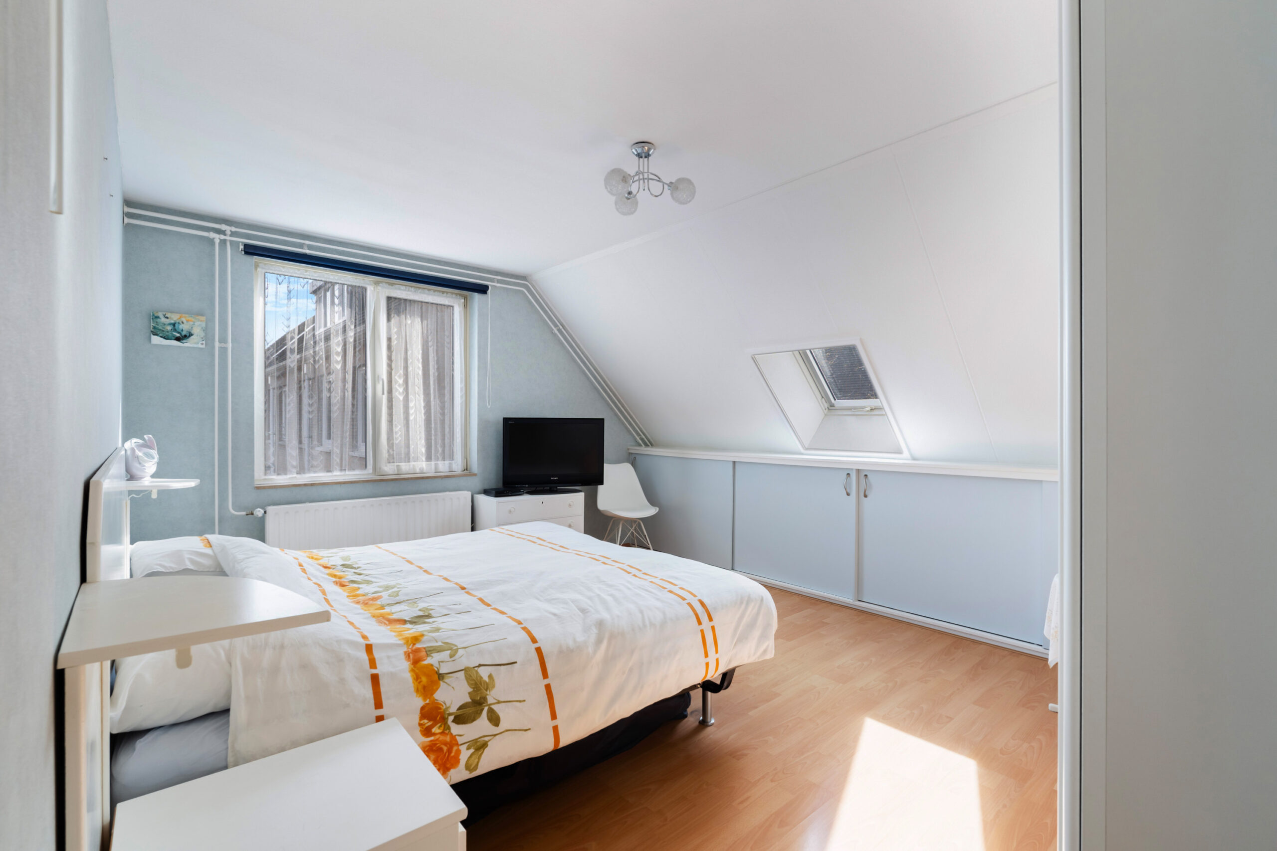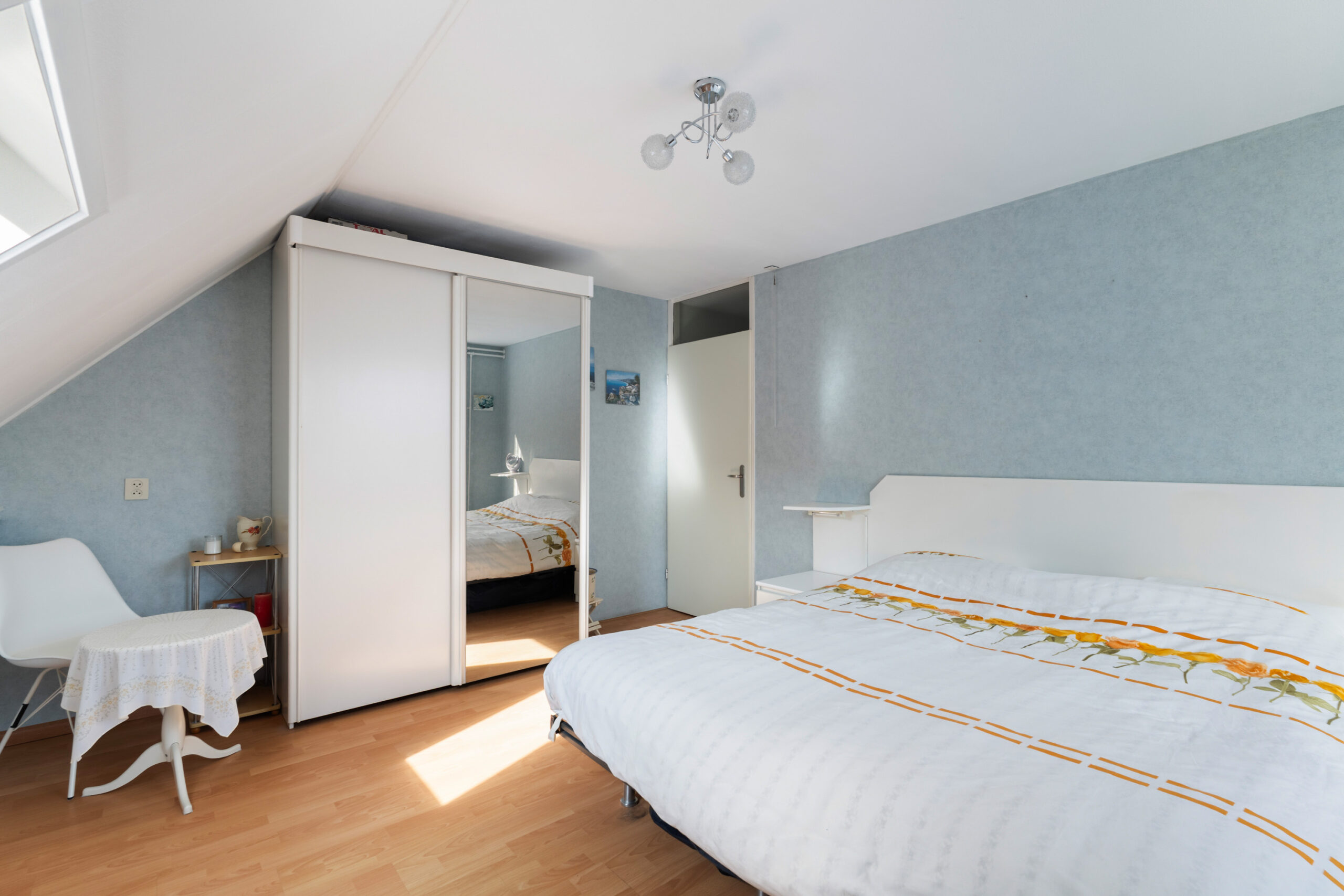 - De 1e slaapkamer (ca. 3,37 x 4,54 m) is ruim en voorzien van knieschotten voor veel opbergruimte;