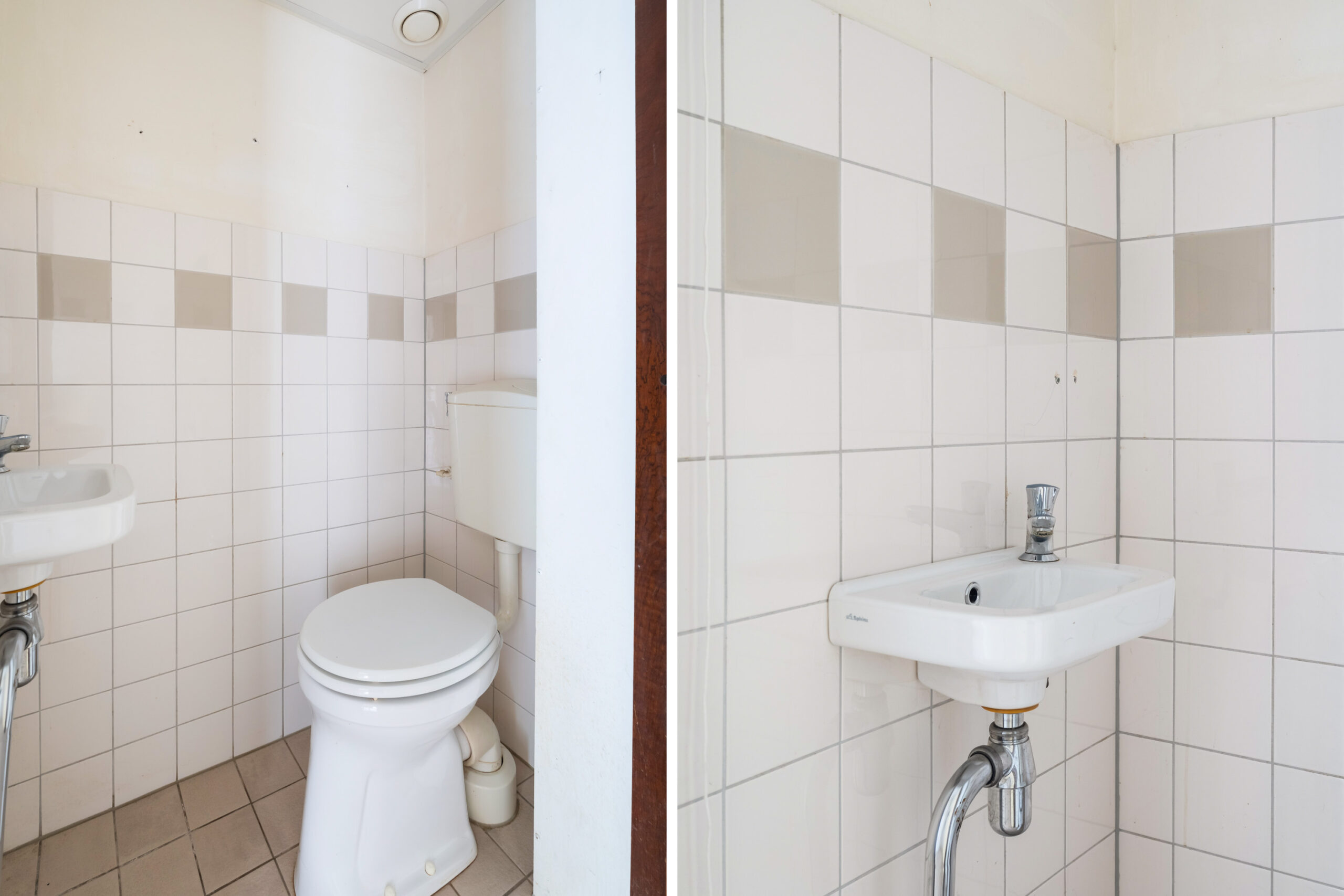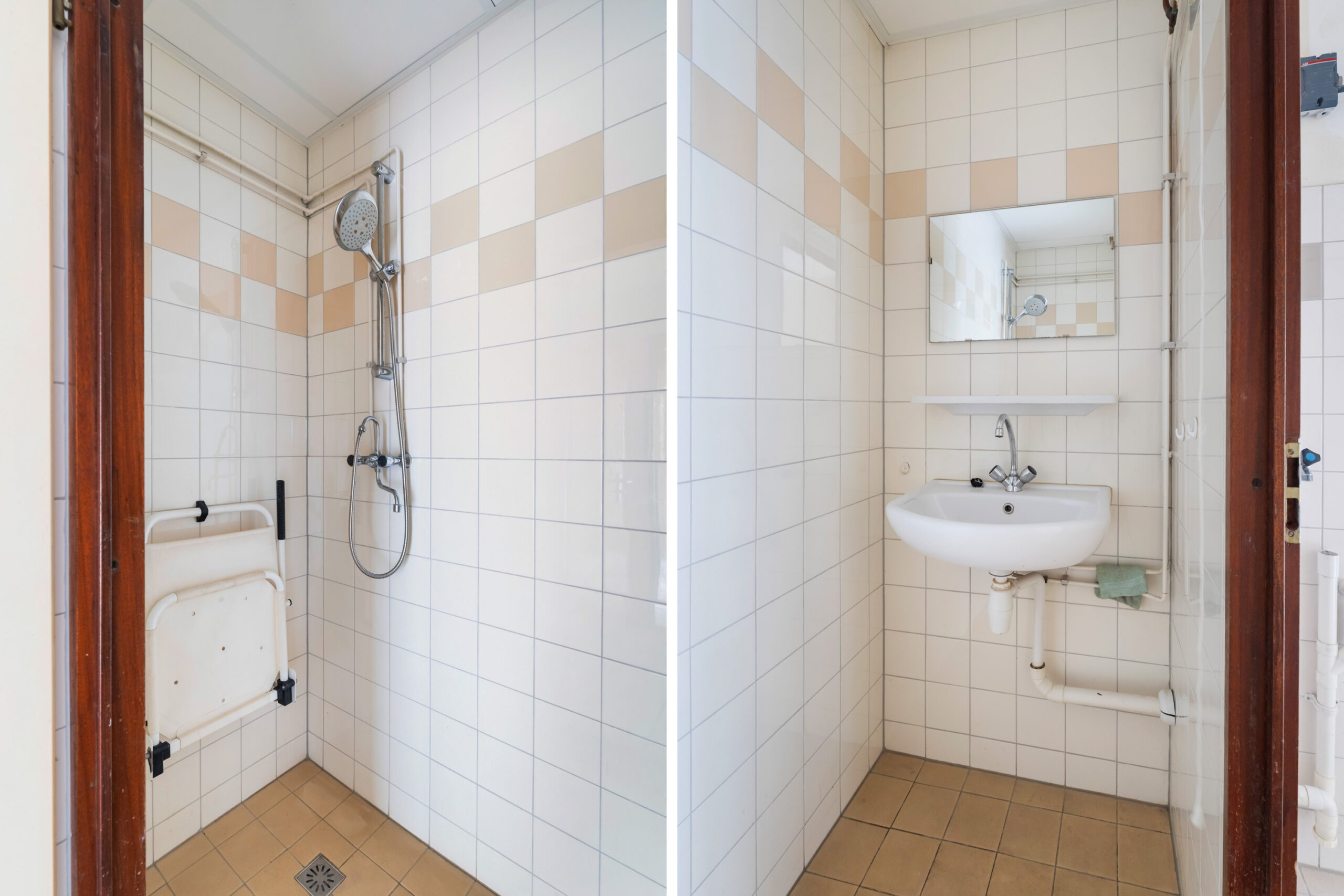 - Inpandige licht betegelde badkamer voorzien van douche en wastafel en een voorruimte met separaat toilet en wasmachine-aansluiting.