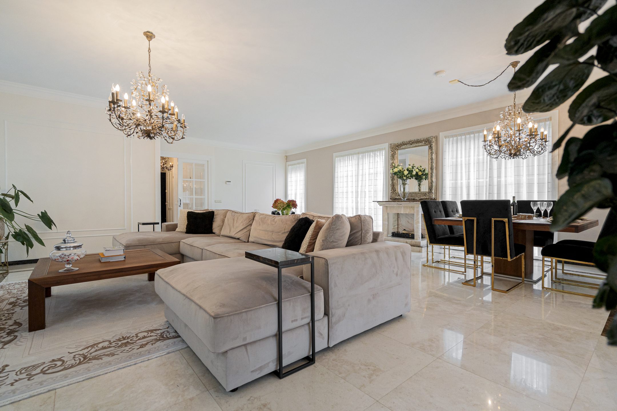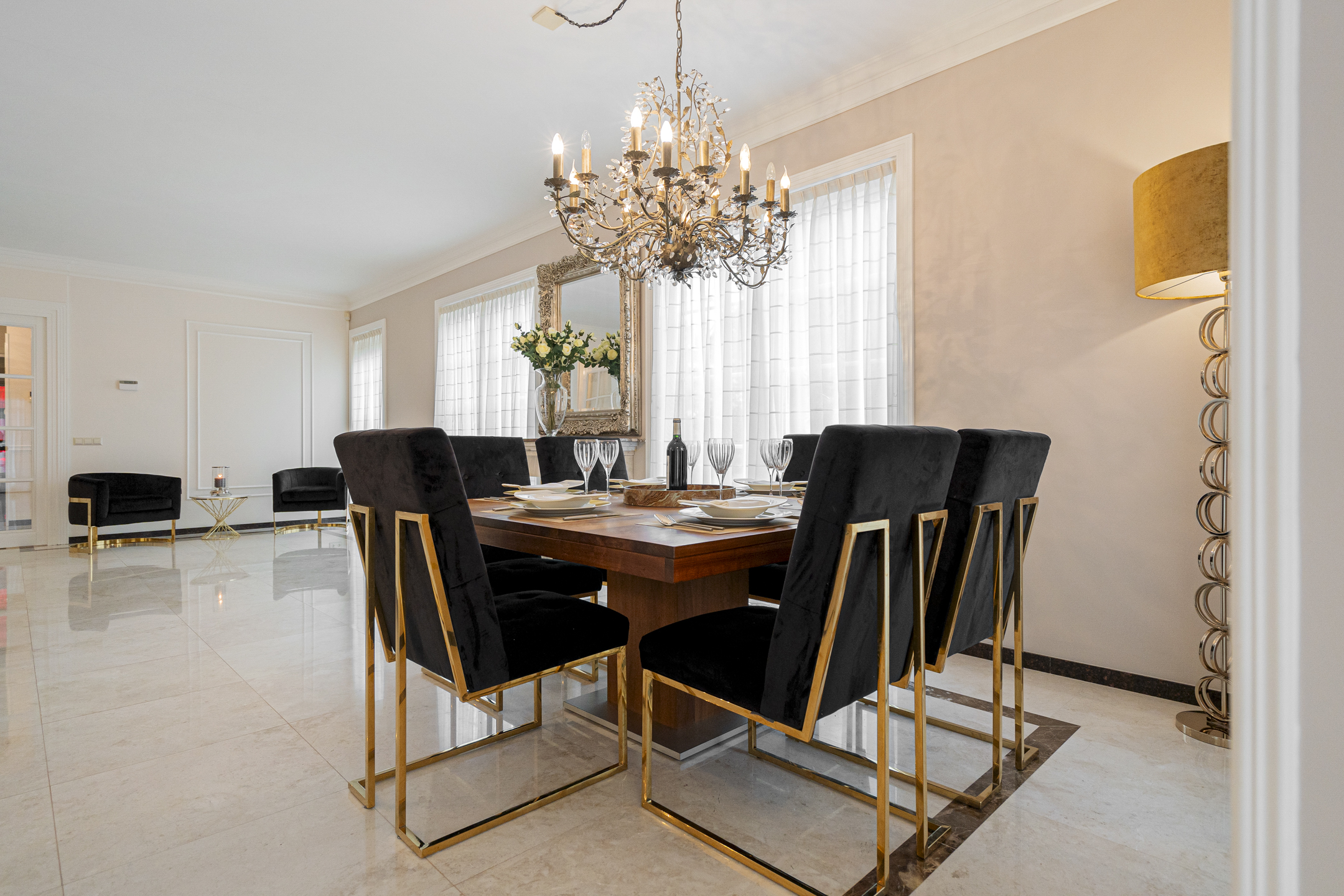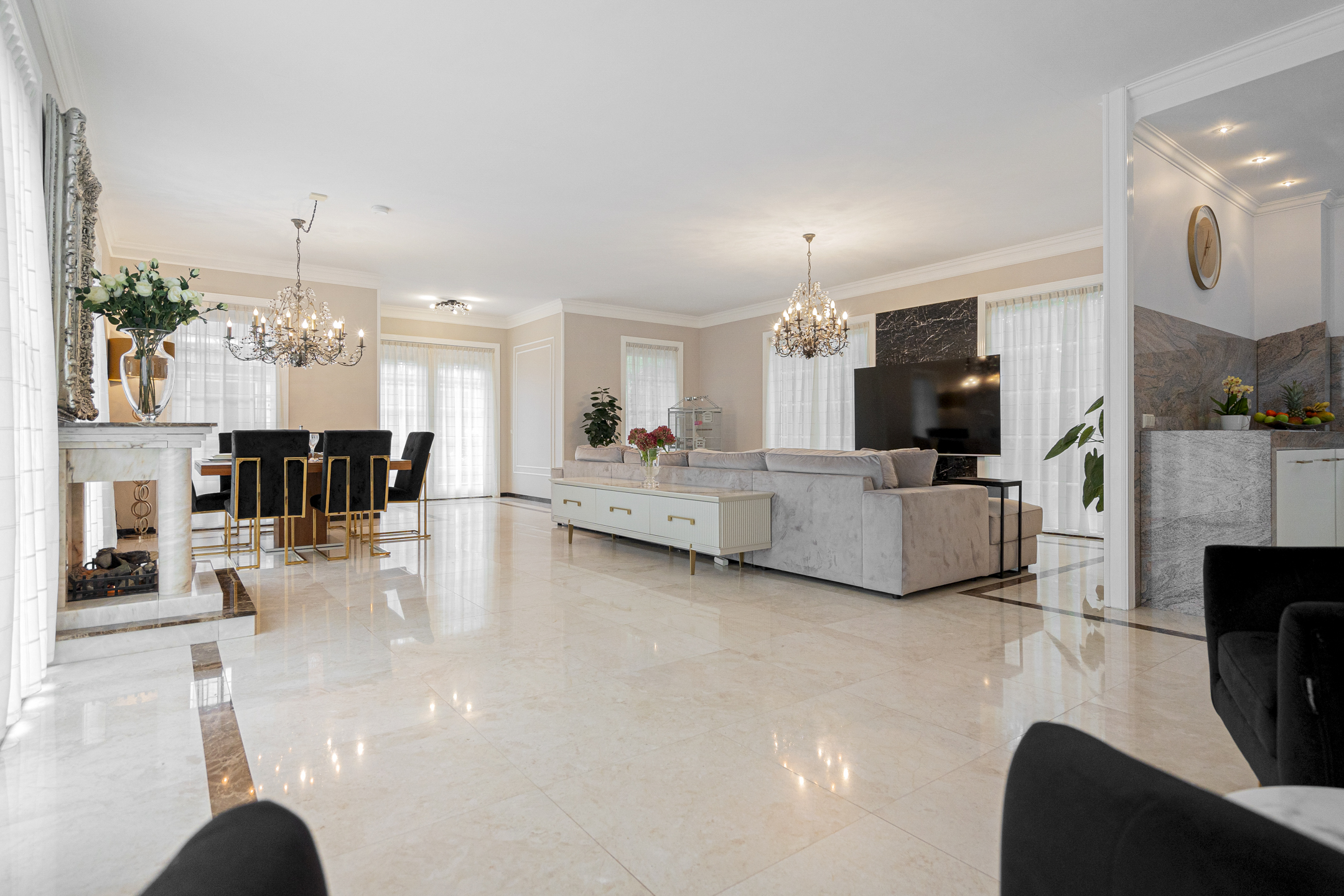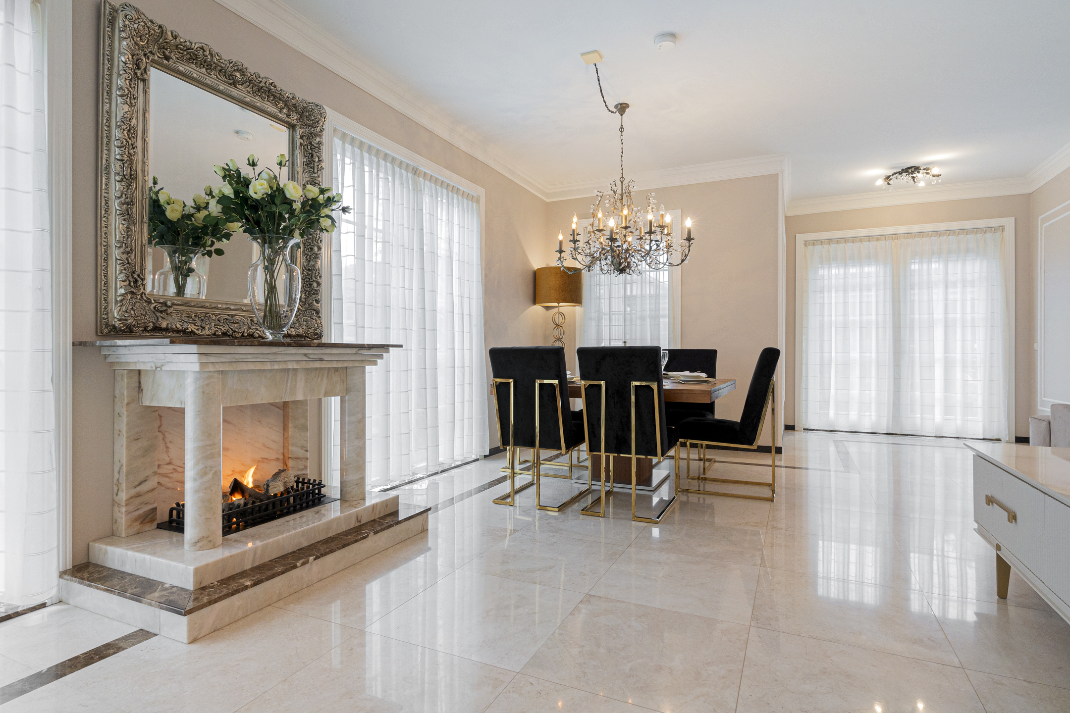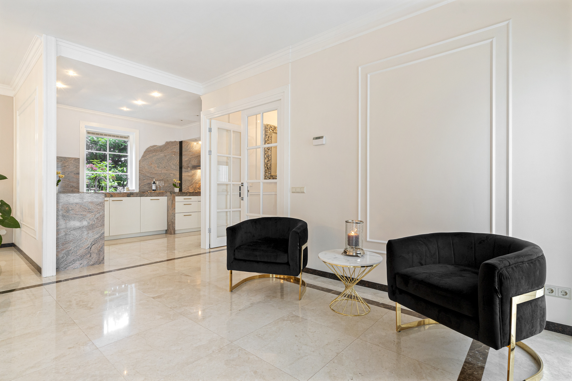- De meeste vloeren op de begane grond en de eerste etage zijn uitgevoerd in luxe wit en bruin “Crèma Marvil” marmer van 2,5 cm dik;