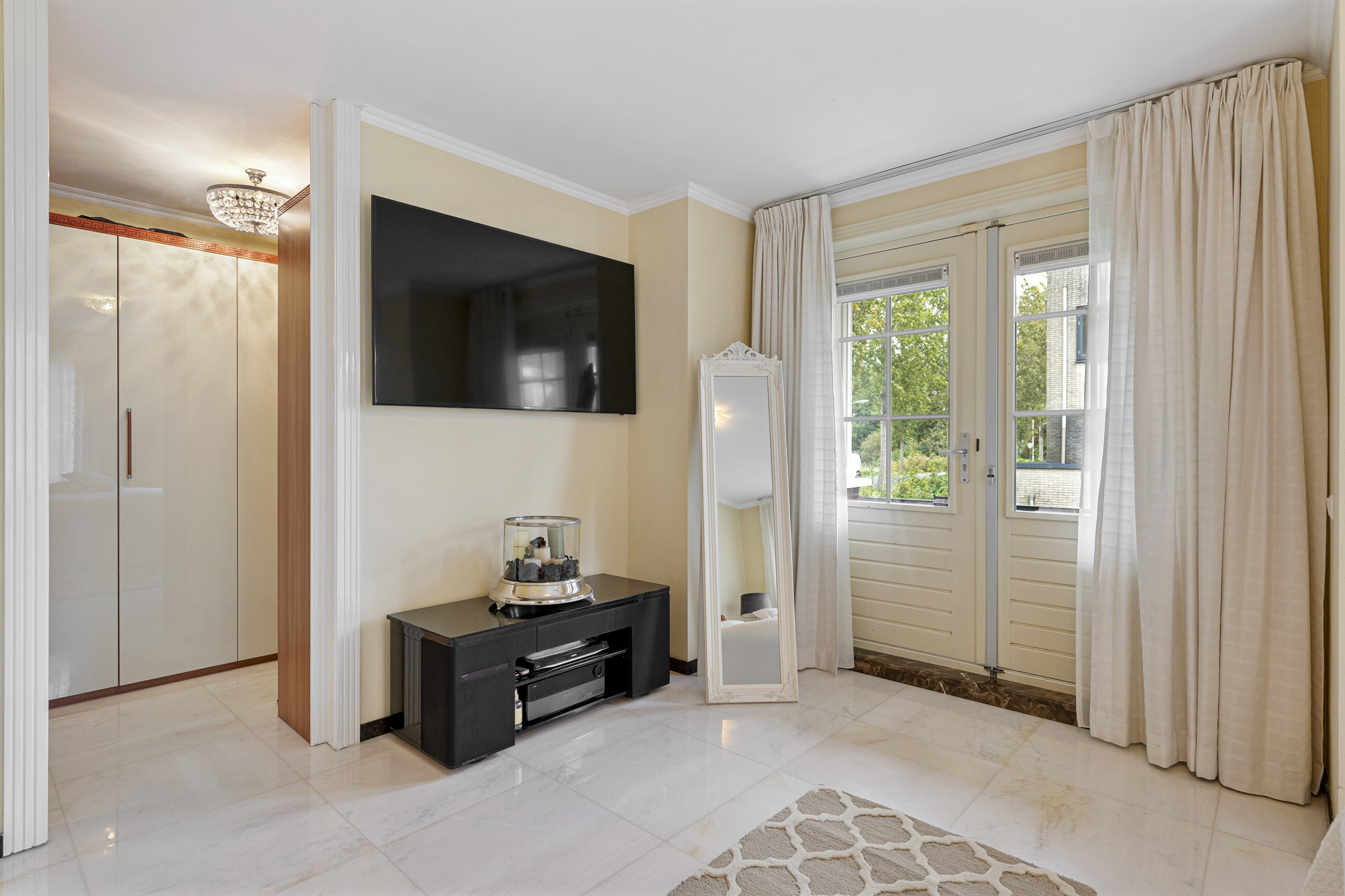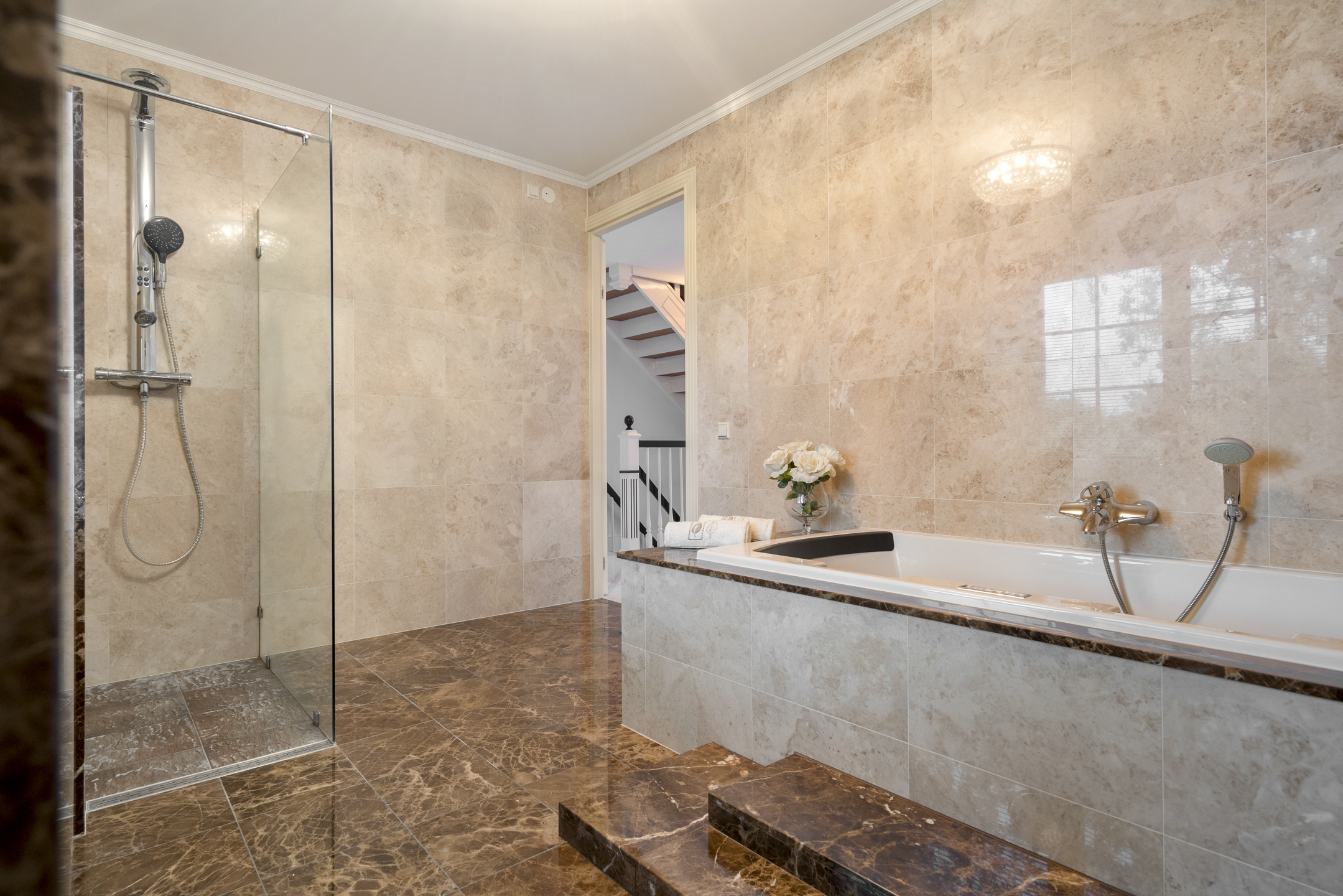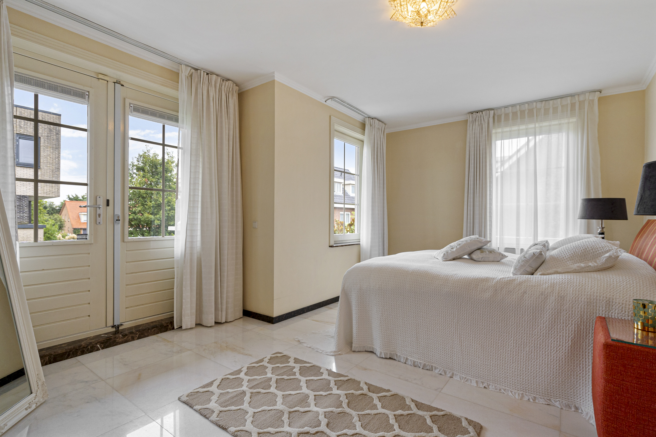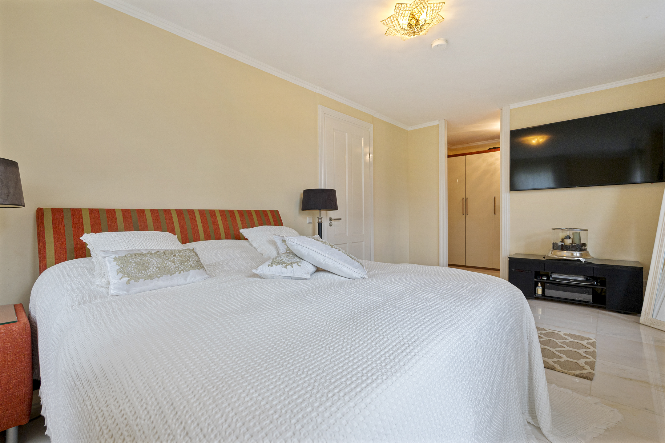 - Aan de voorzijde is de hoofdslaapkamer gesitueerd. Deze beschikt over een balkon, inloop-kleedruimte en een eigen badkamer met ligbad, inloopdouche, wandcloset en wastafel. De badkamer is voorzien van exclusief Emperador marmer;