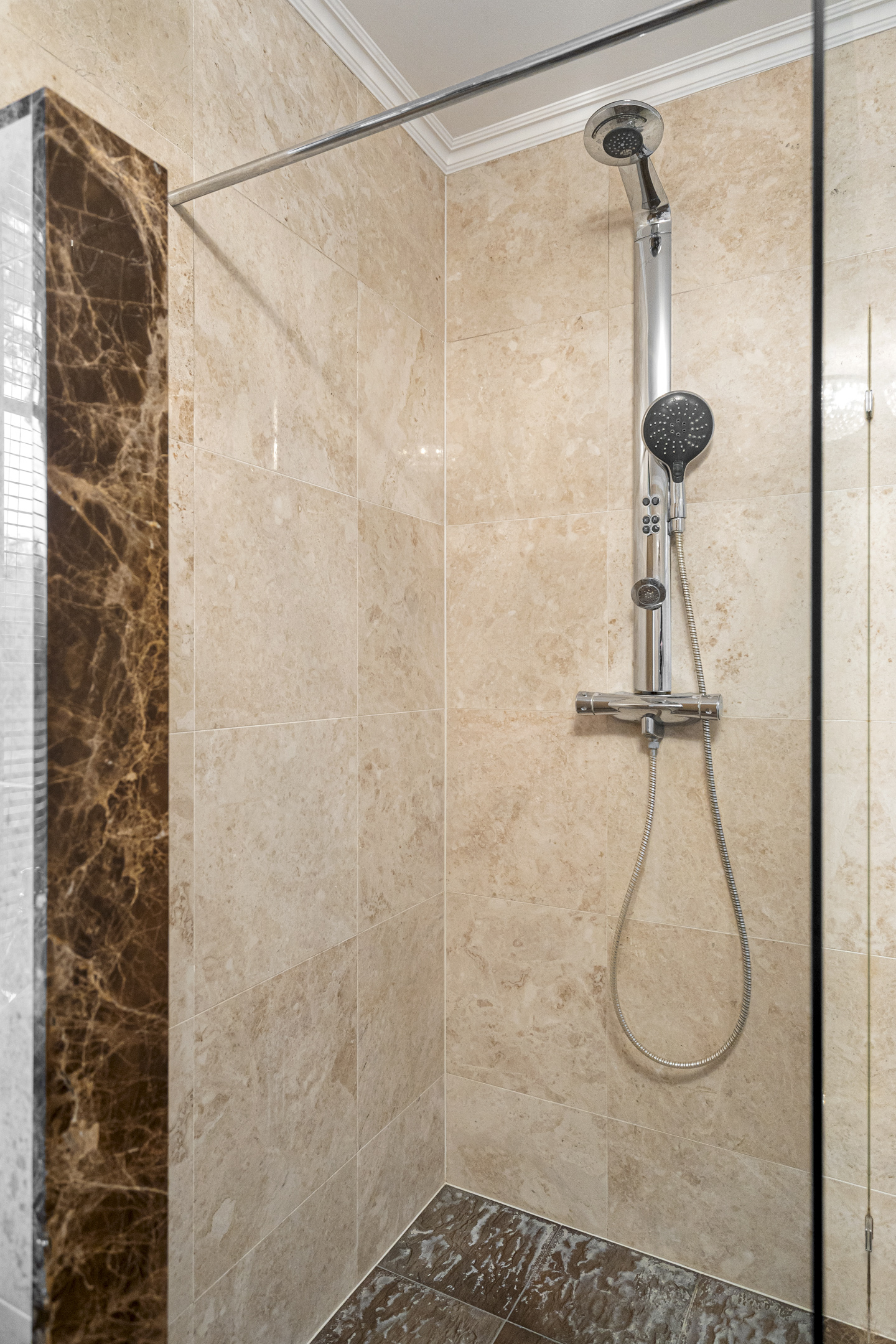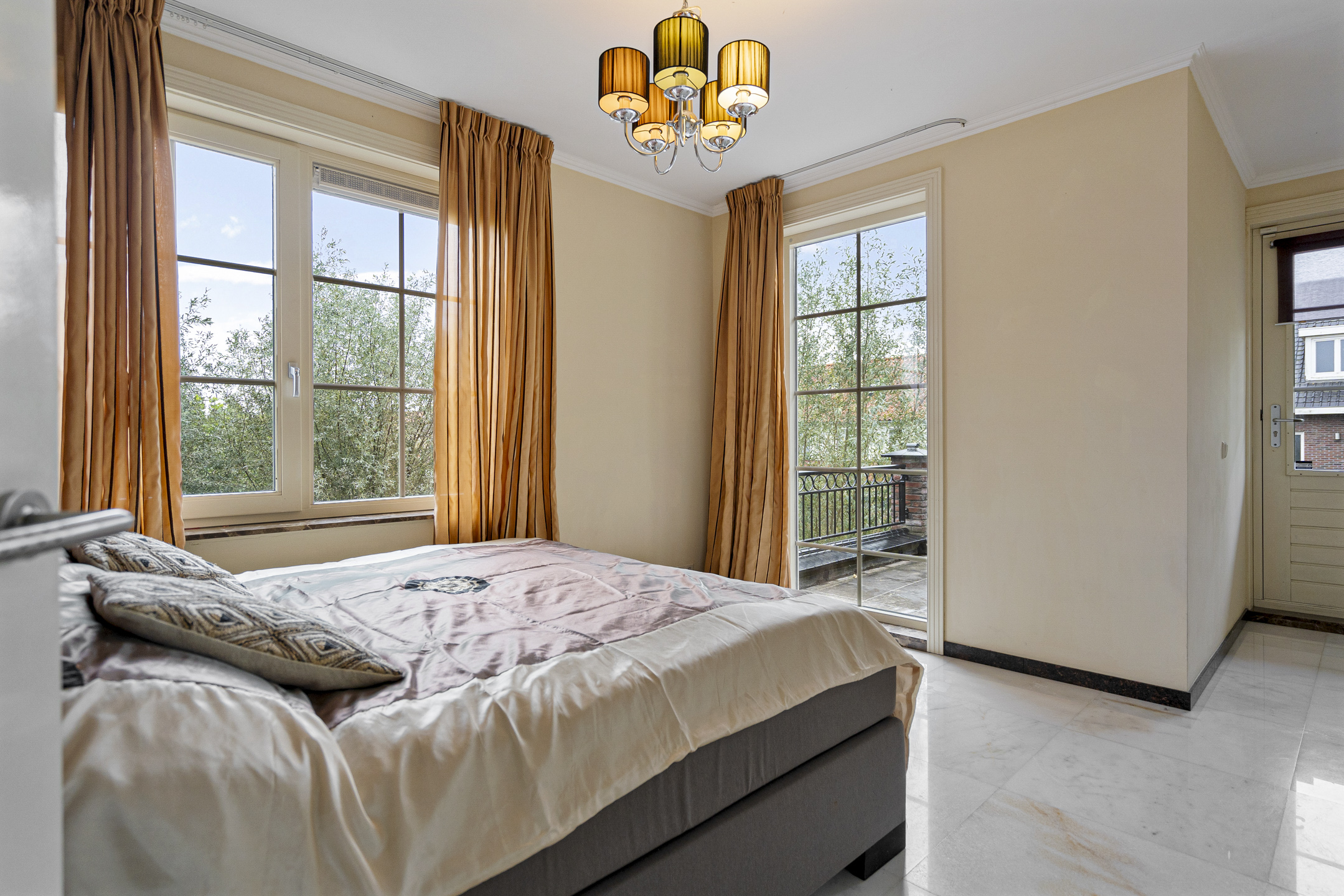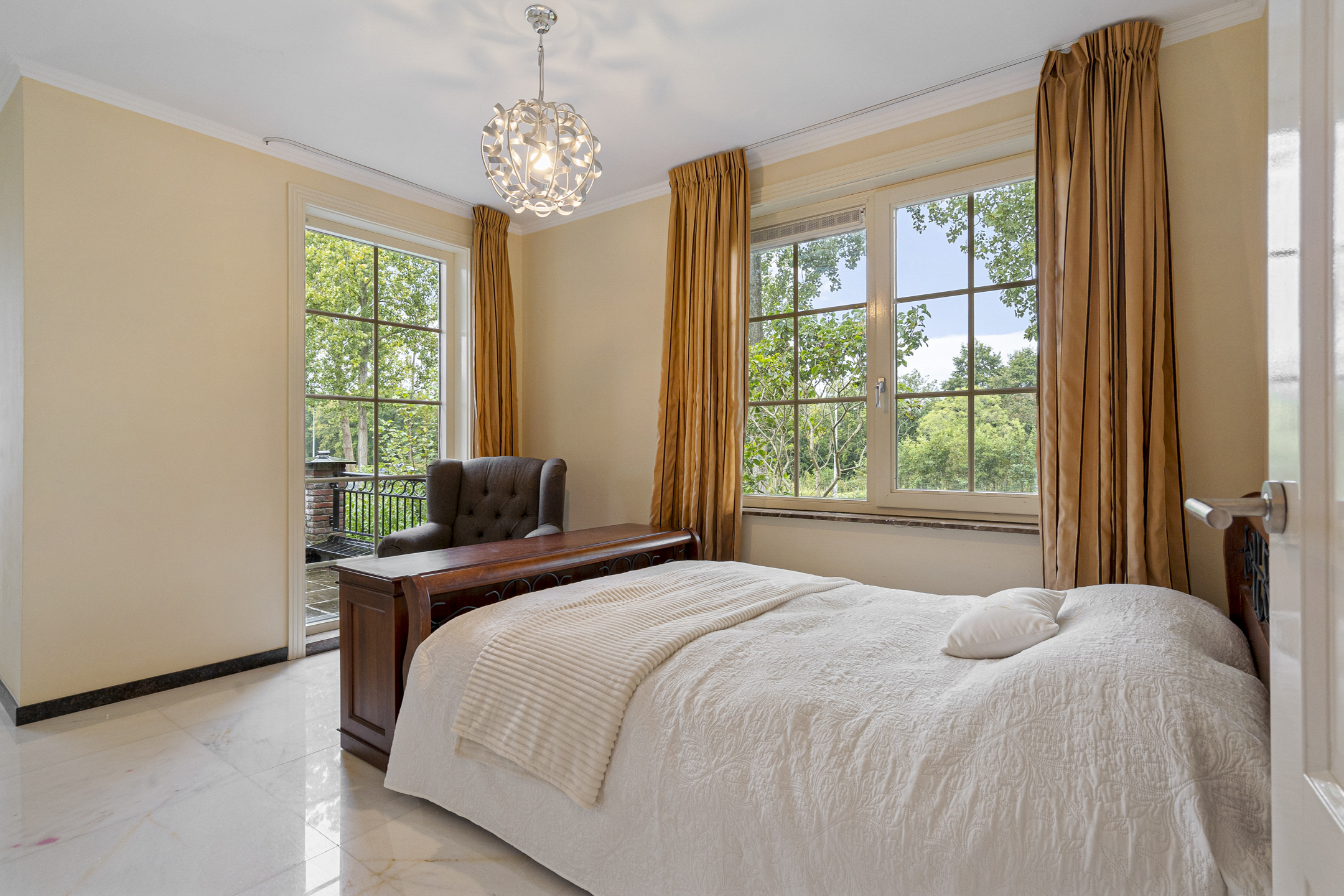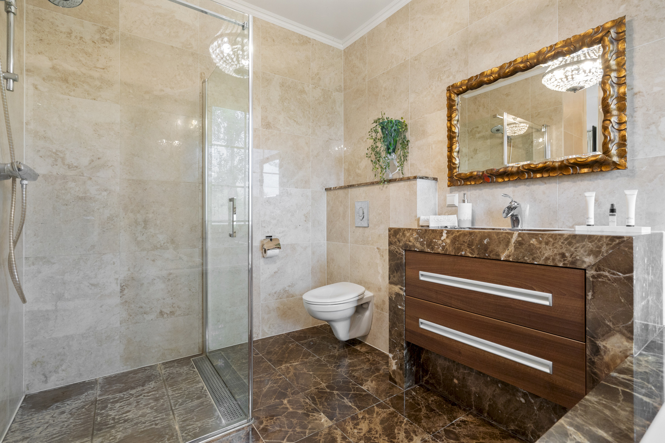 - Aan de voorzijde is de hoofdslaapkamer gesitueerd. Deze beschikt over een balkon, inloop-kleedruimte en een eigen badkamer met ligbad, inloopdouche, wandcloset en wastafel. De badkamer is voorzien van exclusief Emperador marmer;