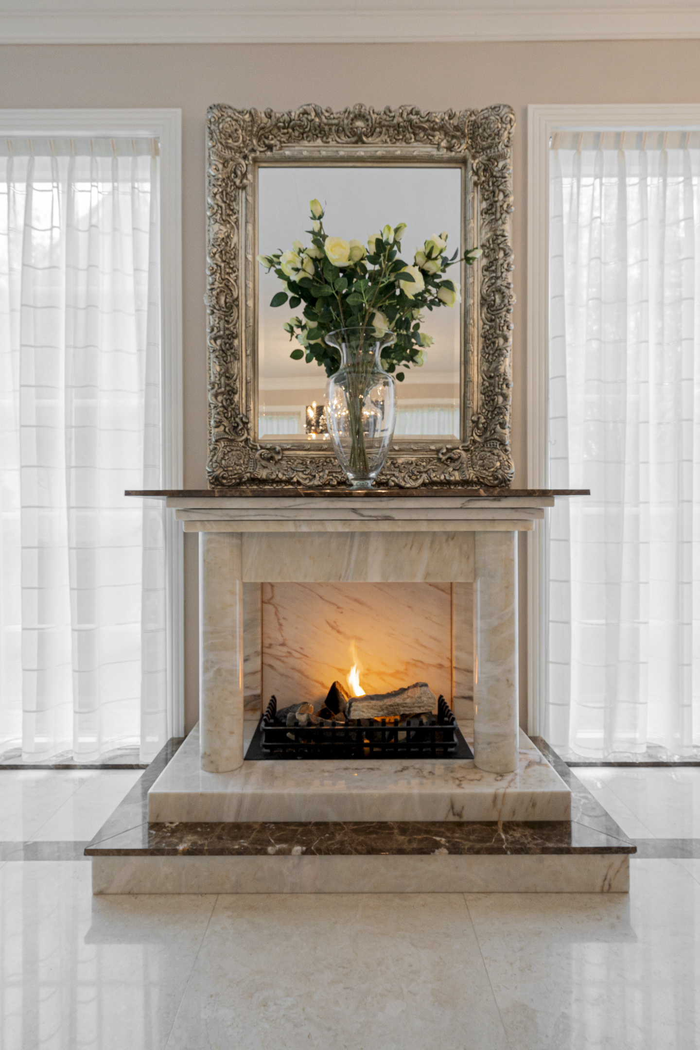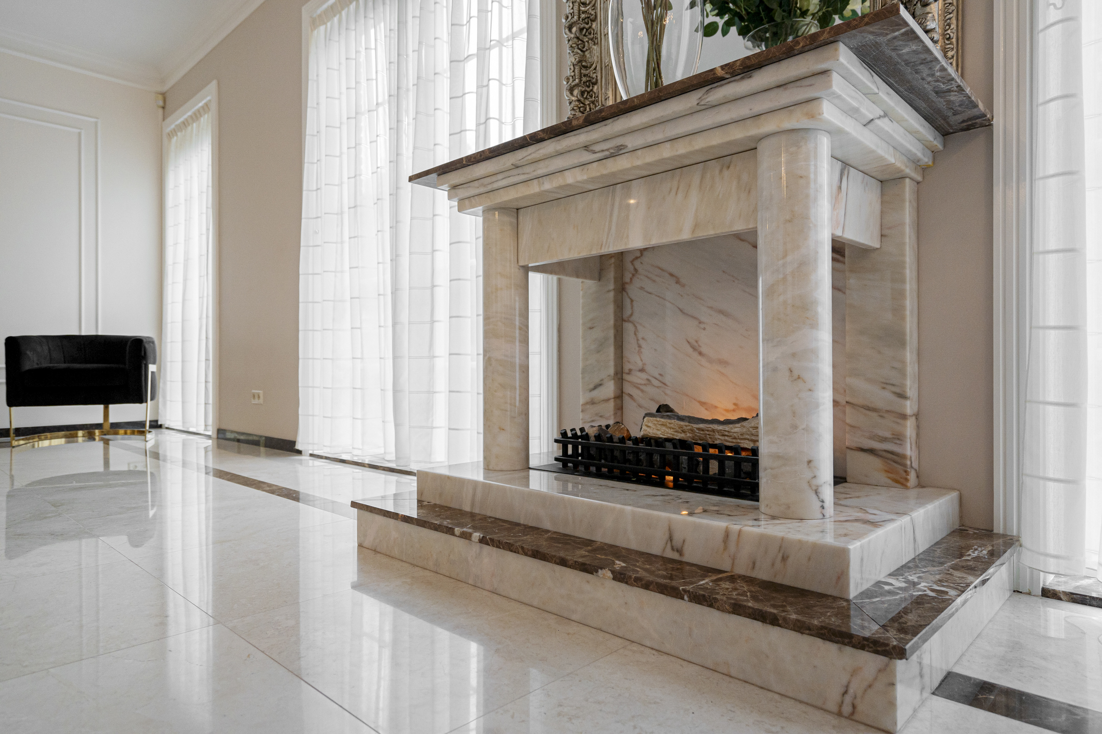 - De schouw is vervaardigd uit Italiaans marmer en afgewerkt met exclusief Emperador marmer;