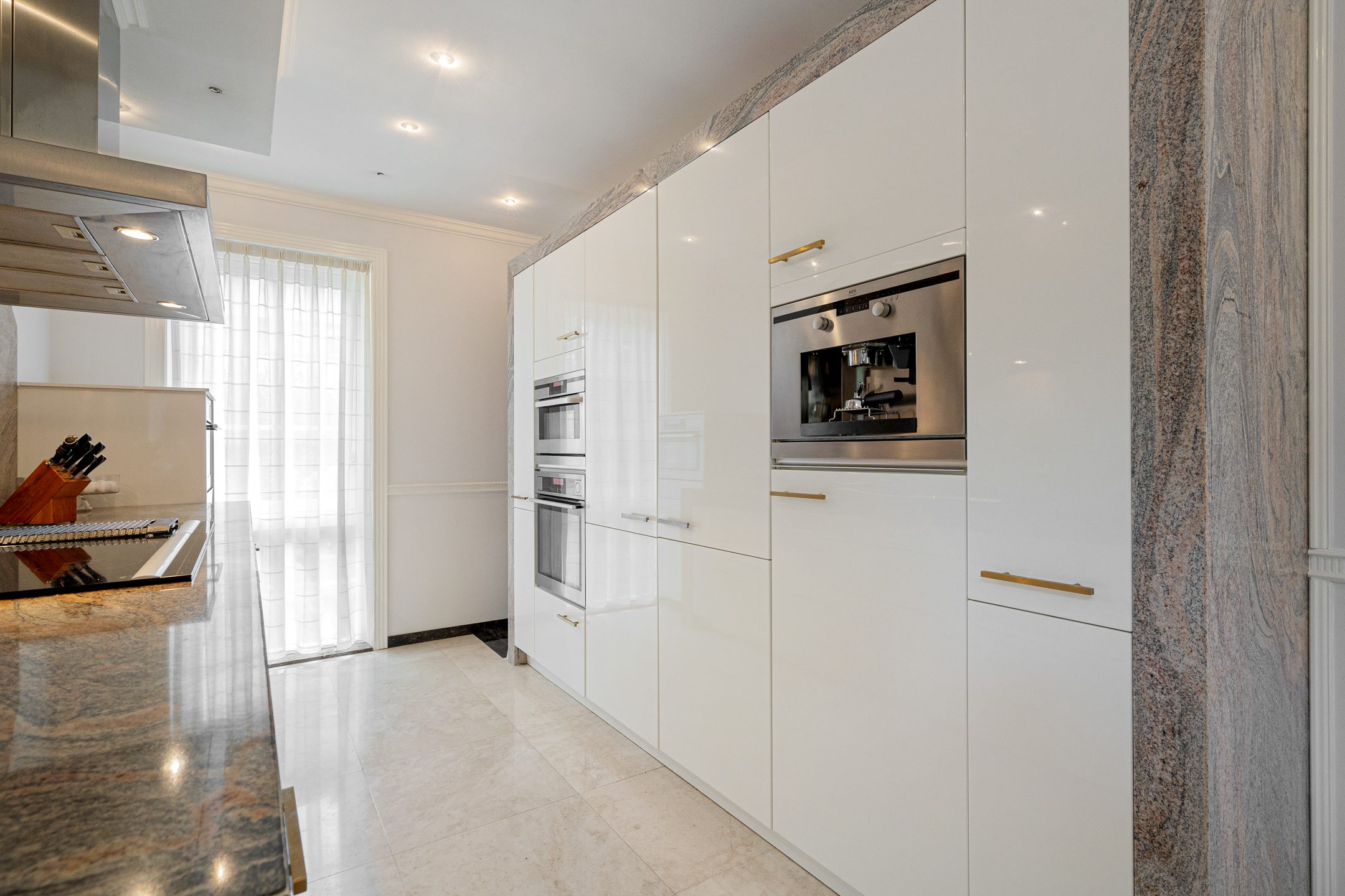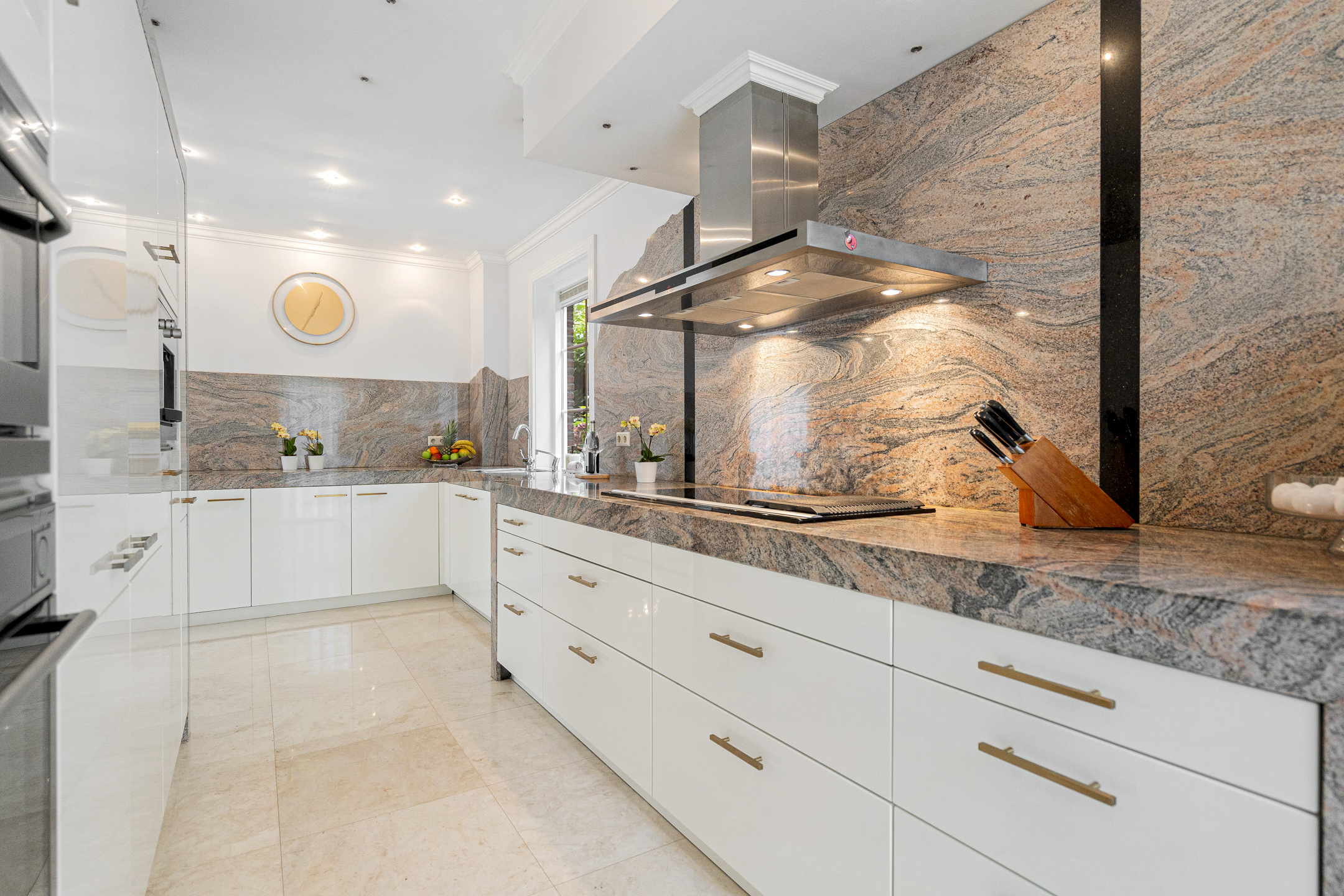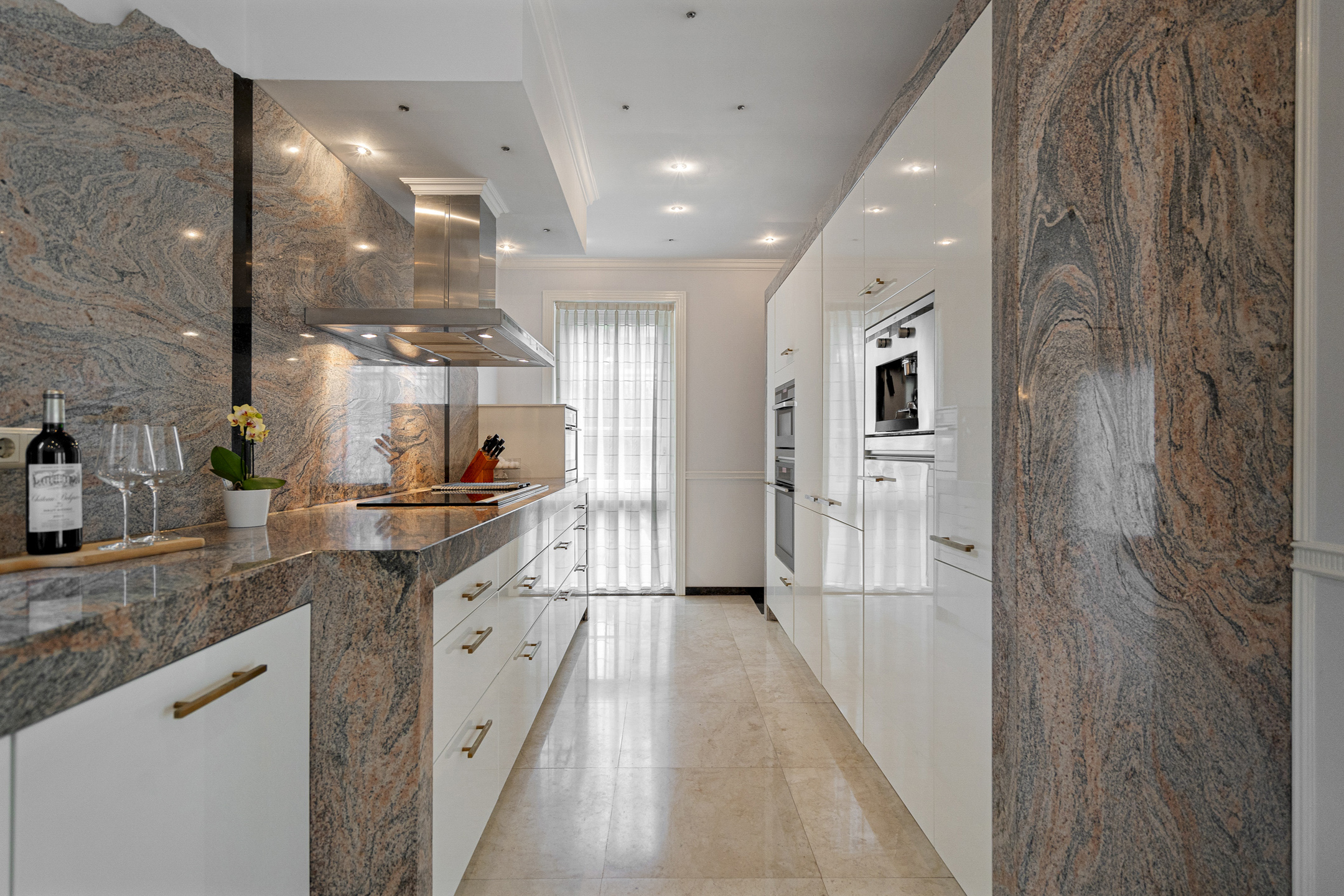 - De luxe keuken is voorzien van een werkblad dat op ambachtelijke wijze is uitgevoerd met grote platen Indiaas Juparana graniet. Het graniet kenmerkt zich door zijn unieke structuur met vegen en golven in zwarte en rode kleuren. De keuken bevat diverse inbouwapparatuur, waaronder een inductiekookplaat met gril en frituur, 2 combiovens, een stoomoven, een koffieapparaat, een warmhoudlade, een vaatwasser en een Quooker;