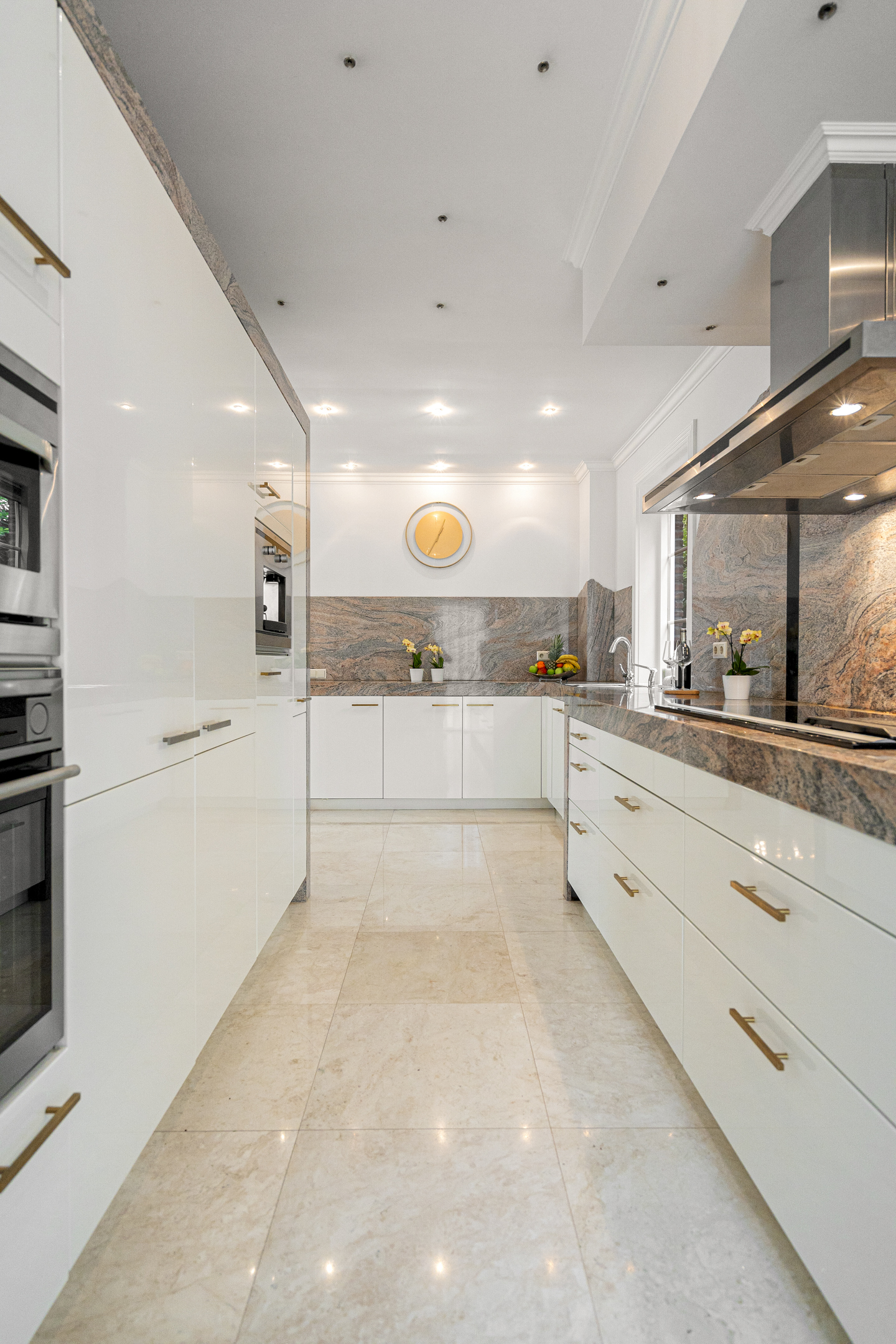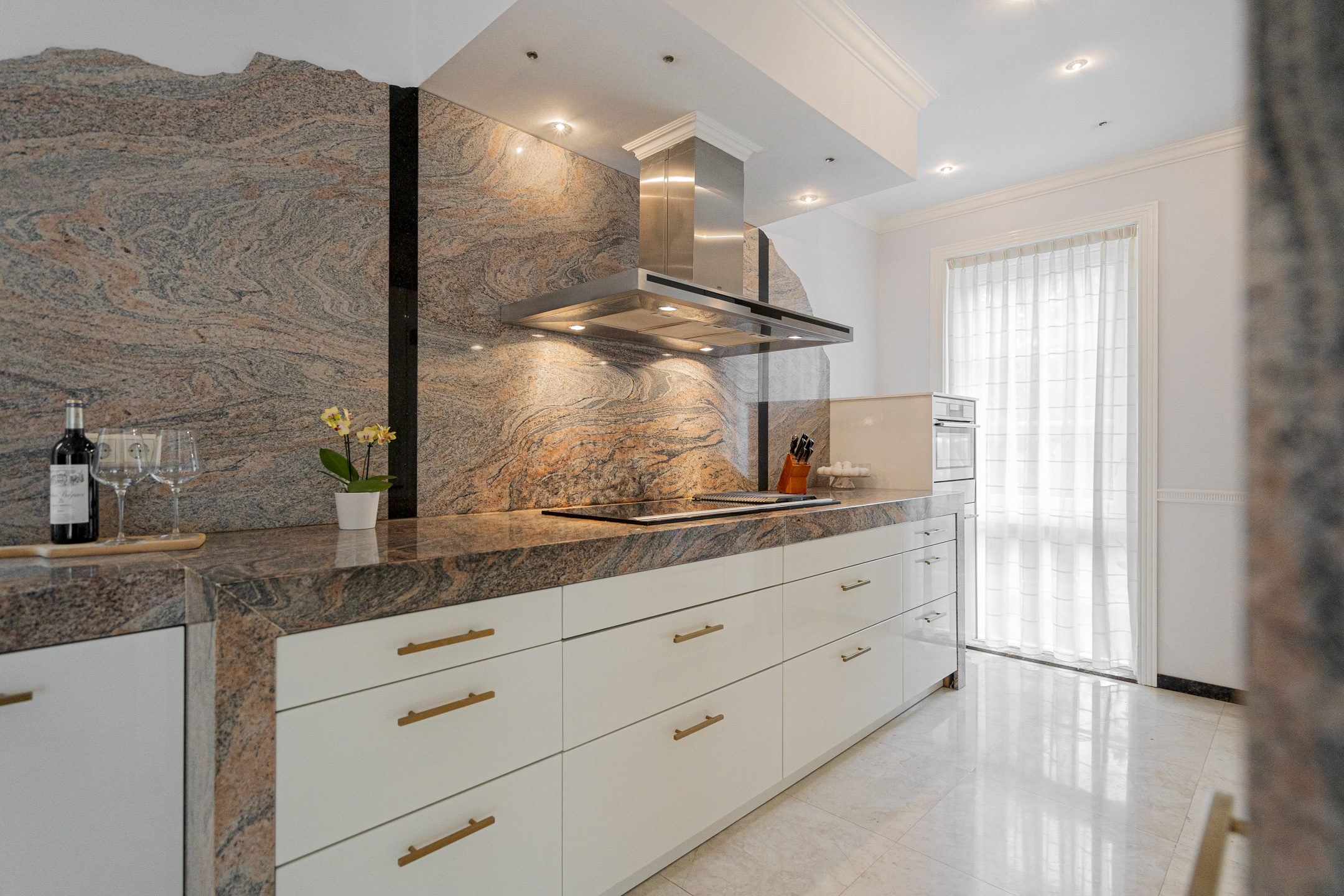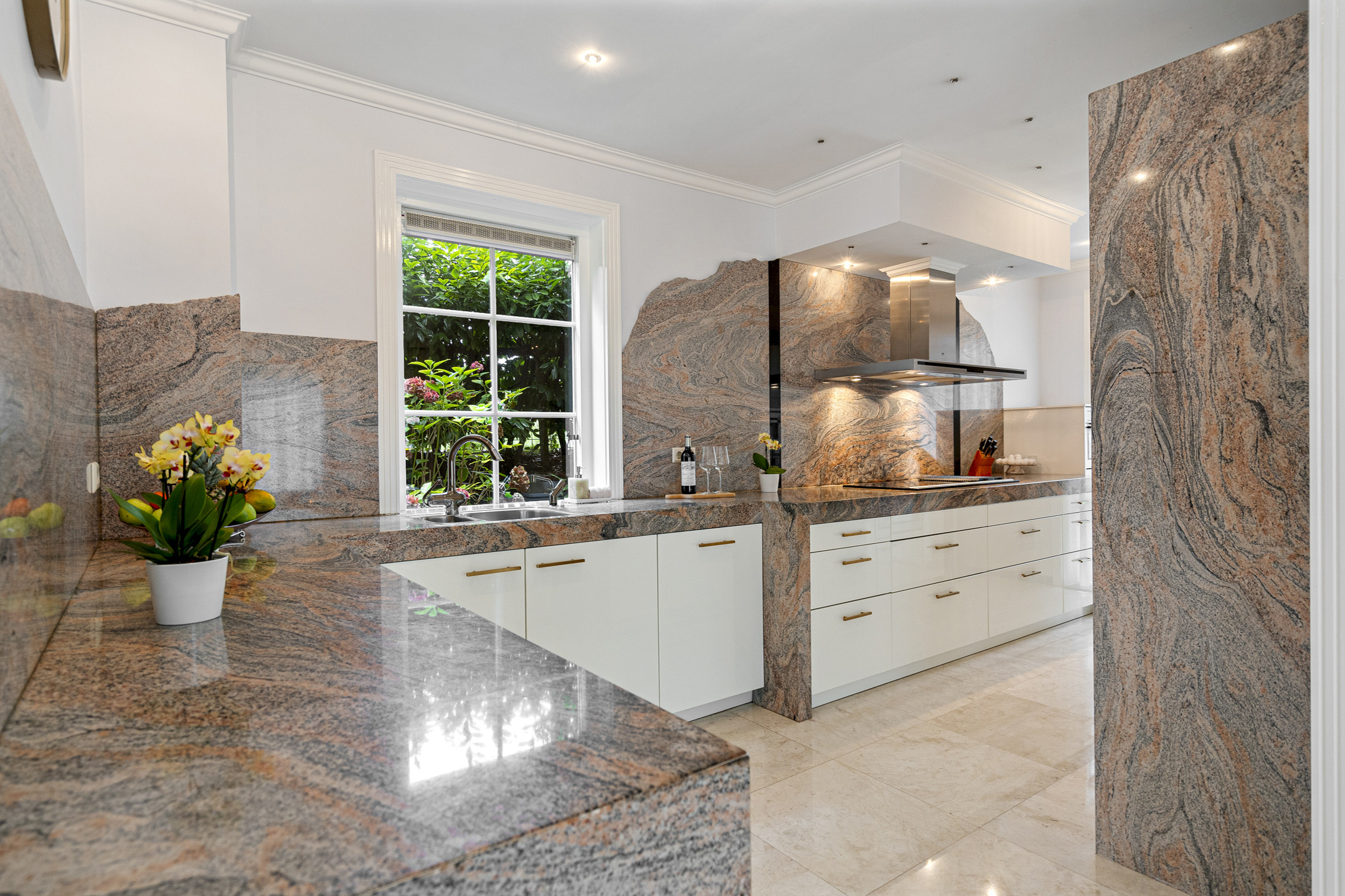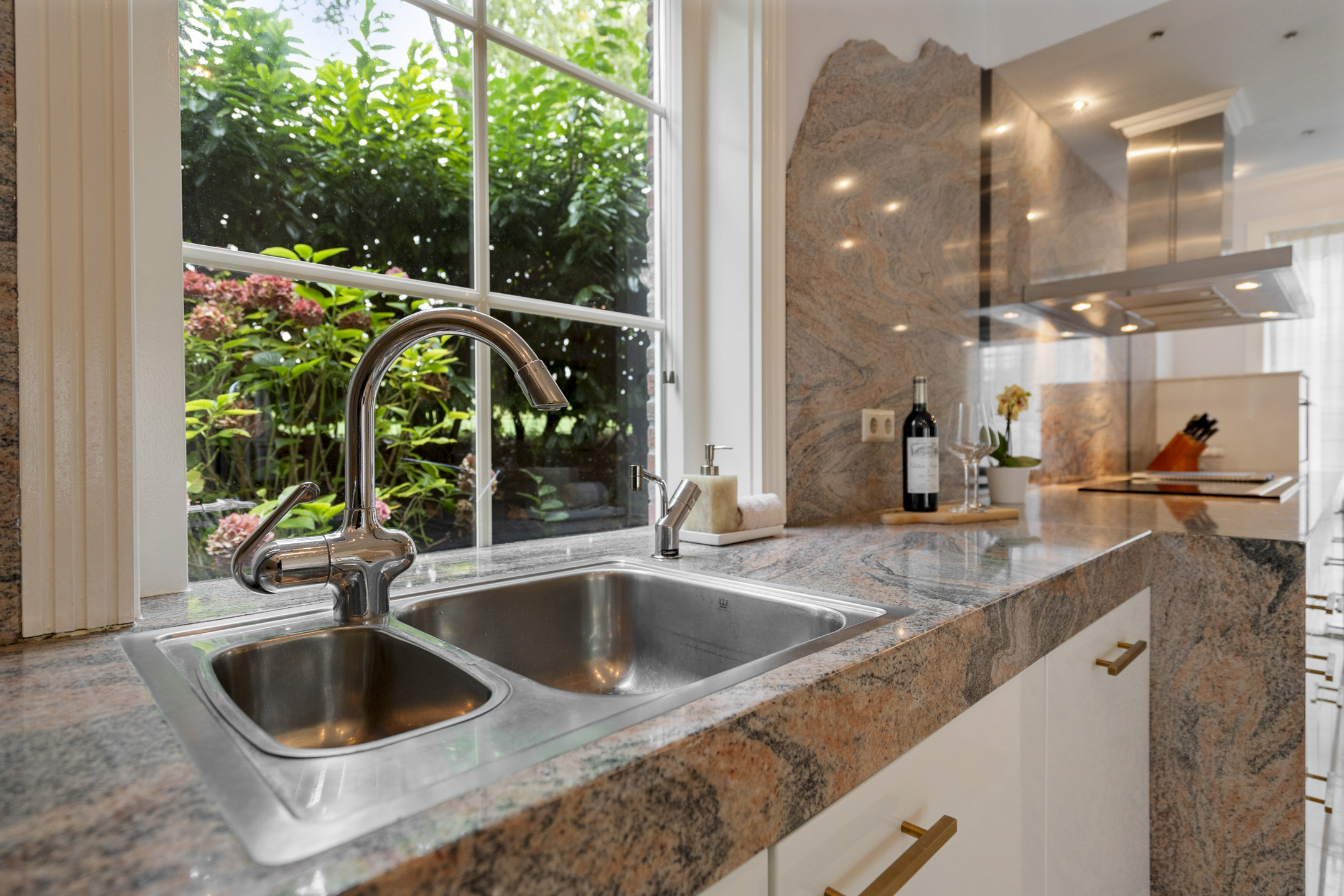 - De luxe keuken is voorzien van een werkblad dat op ambachtelijke wijze is uitgevoerd met grote platen Indiaas Juparana graniet. Het graniet kenmerkt zich door zijn unieke structuur met vegen en golven in zwarte en rode kleuren. De keuken bevat diverse inbouwapparatuur, waaronder een inductiekookplaat met gril en frituur, 2 combiovens, een stoomoven, een koffieapparaat, een warmhoudlade, een vaatwasser en een Quooker;
