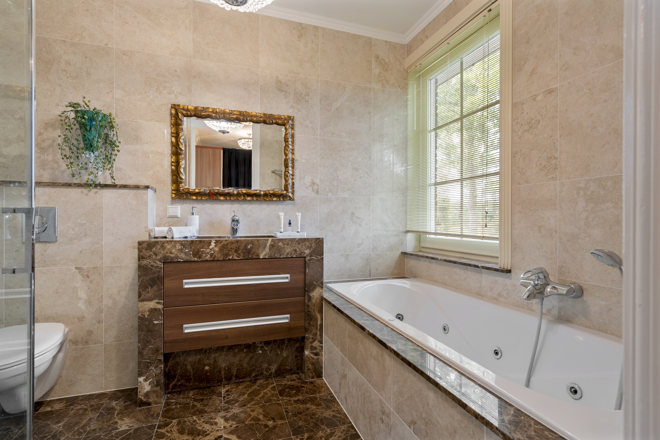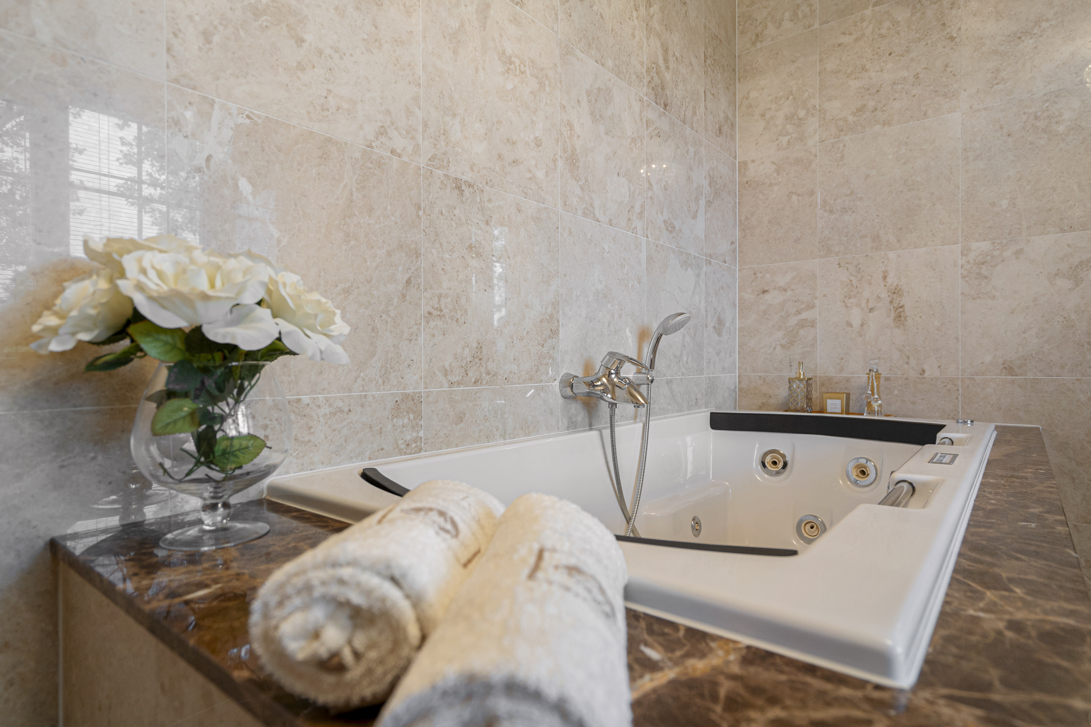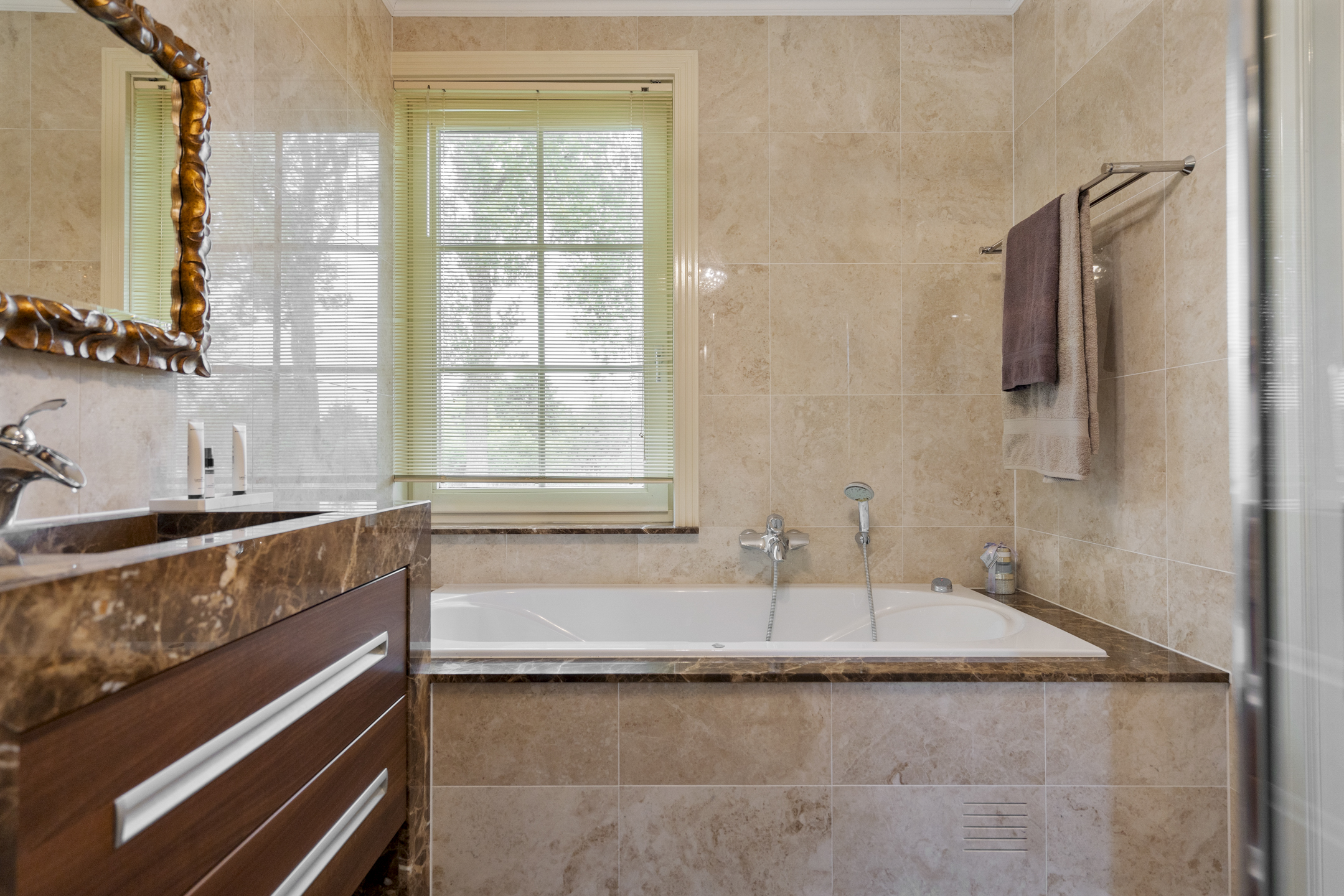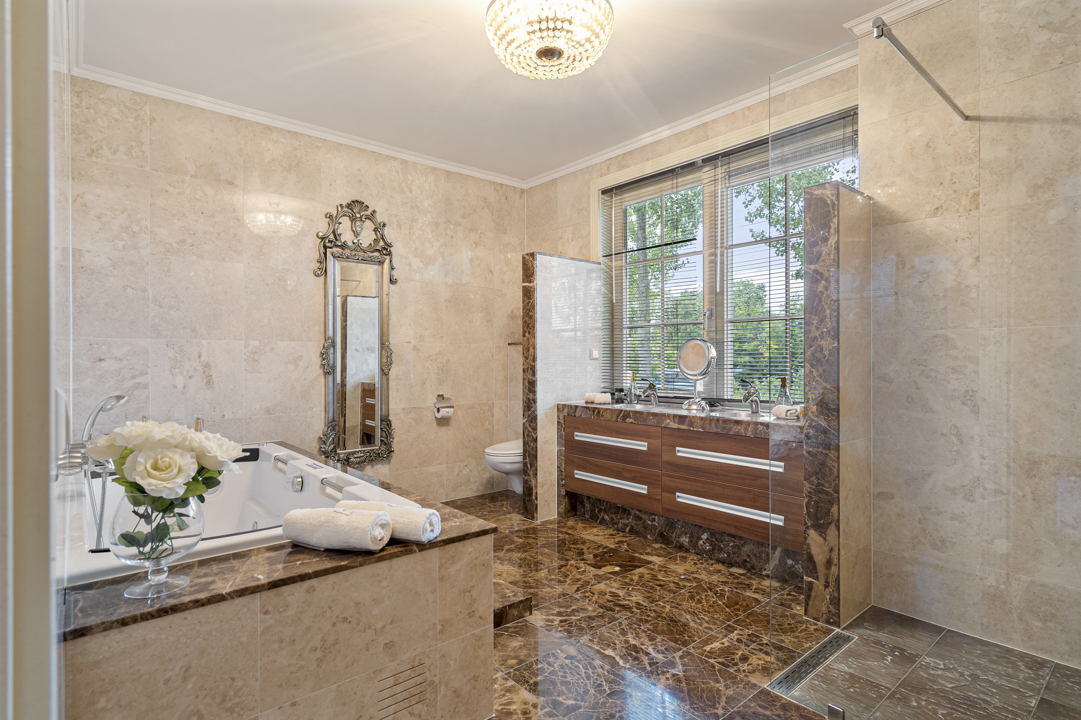 - Via de overloop is de hoofdbadkamer bereikbaar. Deze is voorzien van een bubbelbad, dubbele wastafel, inloopdouche en wandcloset.