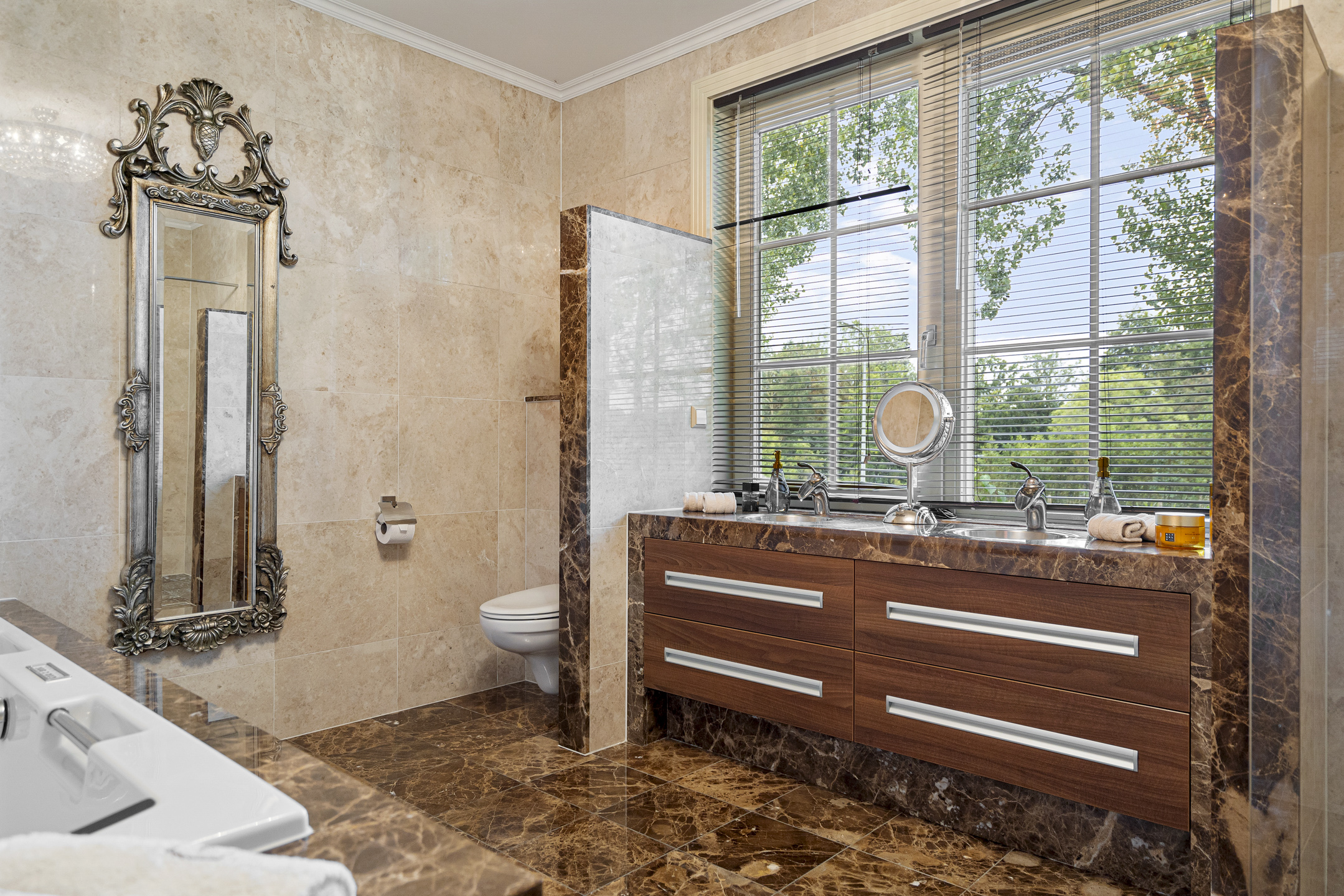 - Badkamervoorzieningen Toilet, jacuzzi, dubbele wastafel, wastafelmeubel, inloopdouche, vloerverwarming, ligbad, toilet, wastafel, wastafelmeubel, inloopdouche, vloerverwarming