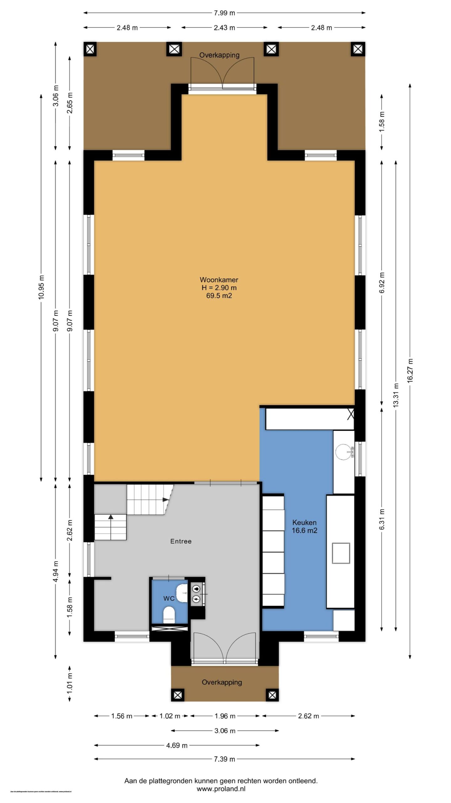 - Entree van de woning met meterkast, garderobe, toiletruimte, trapopgang en dubbele openslaande deuren richting de woonkamer;