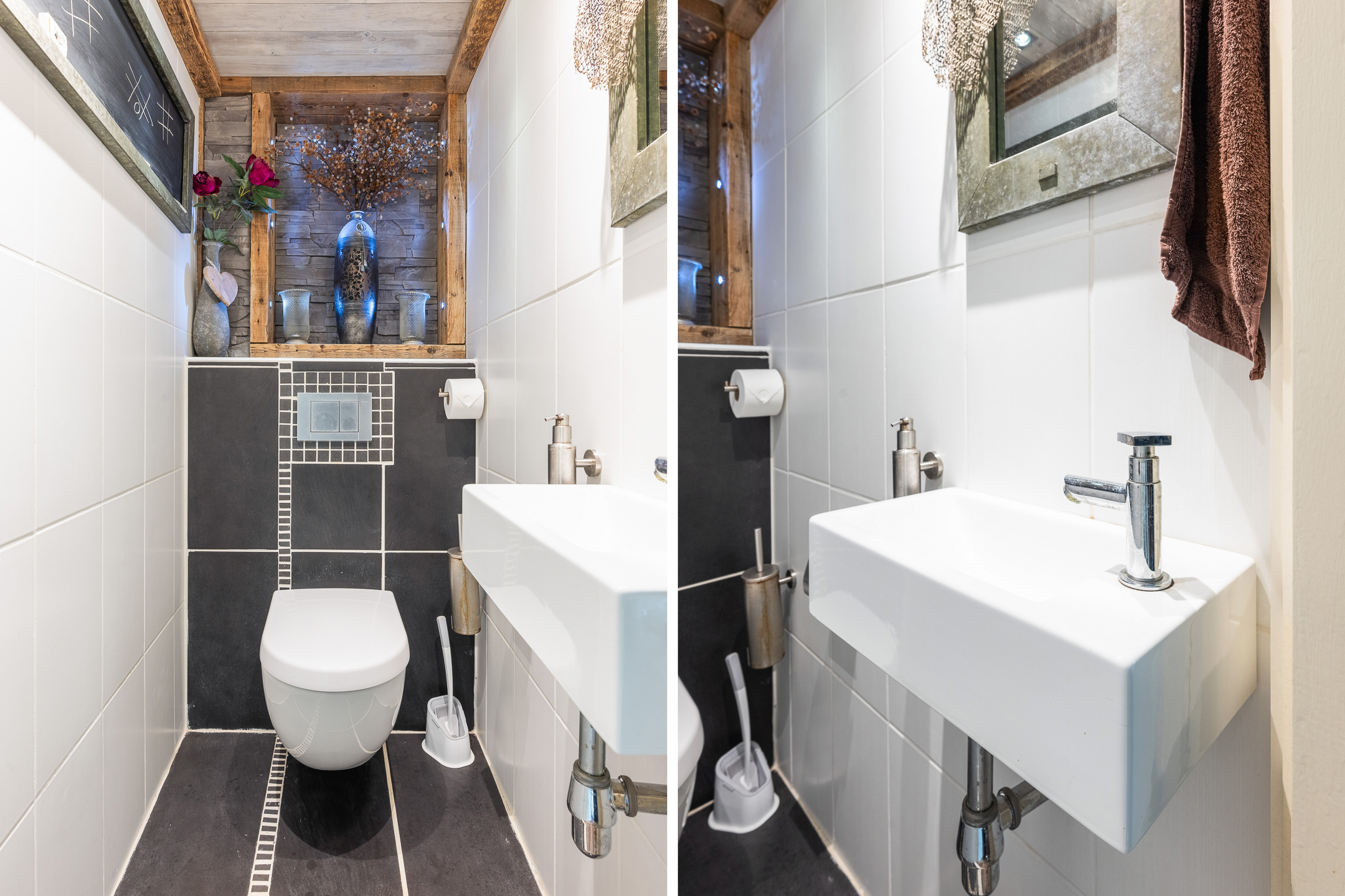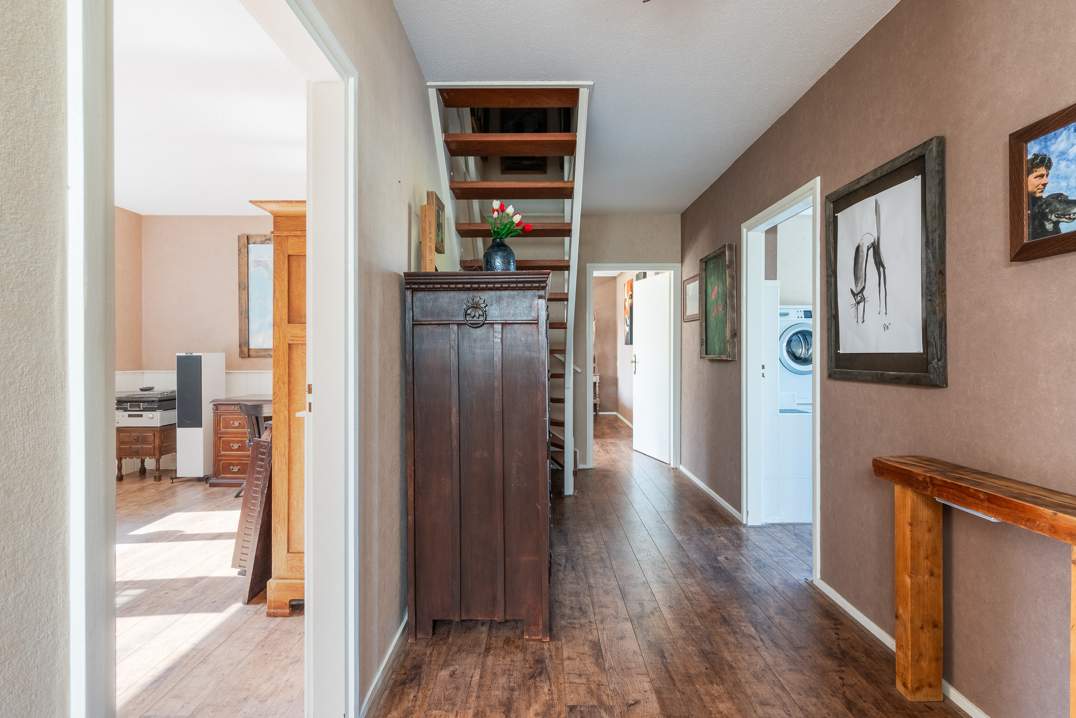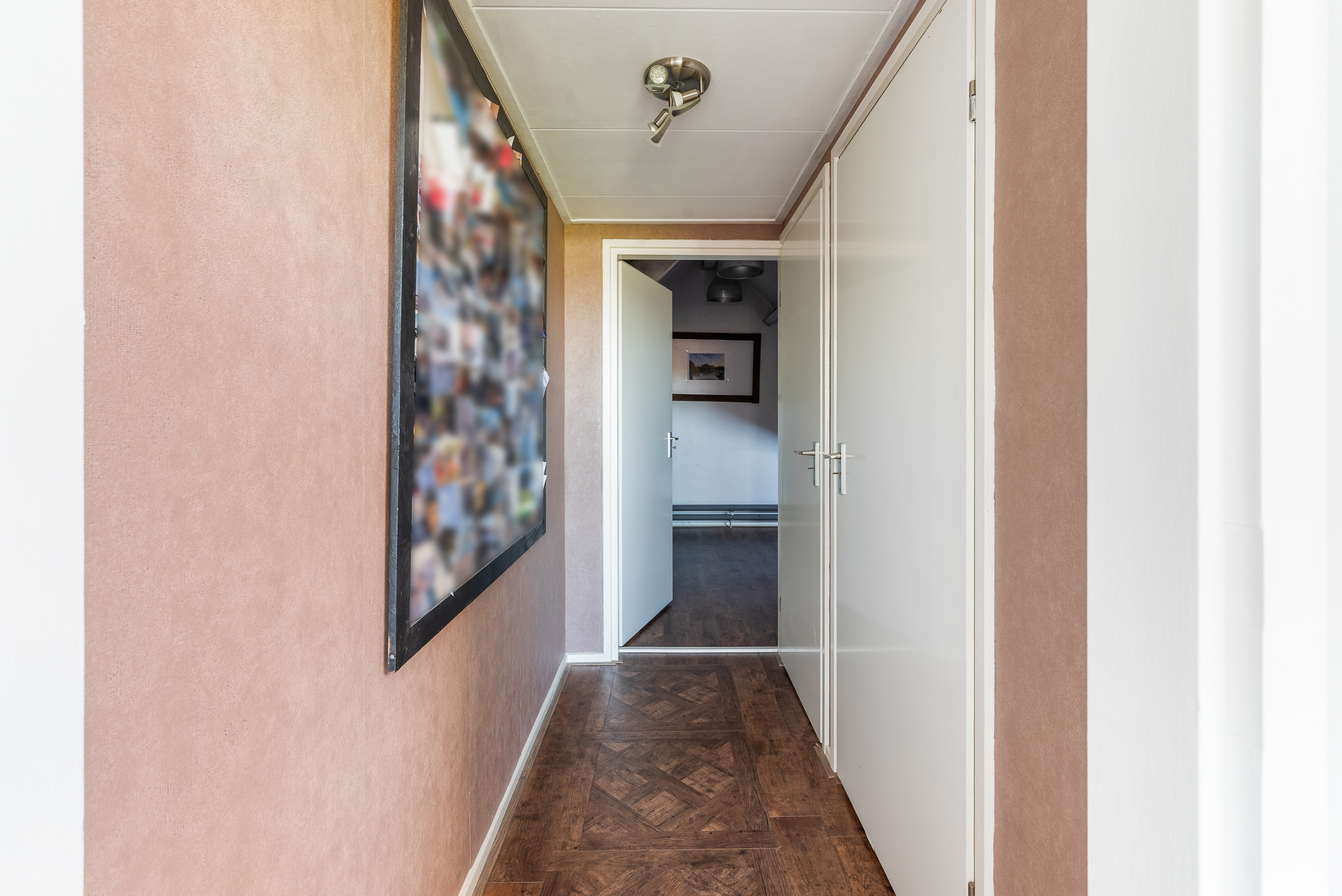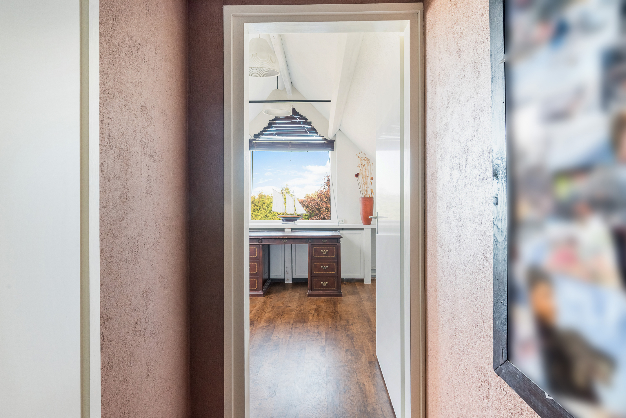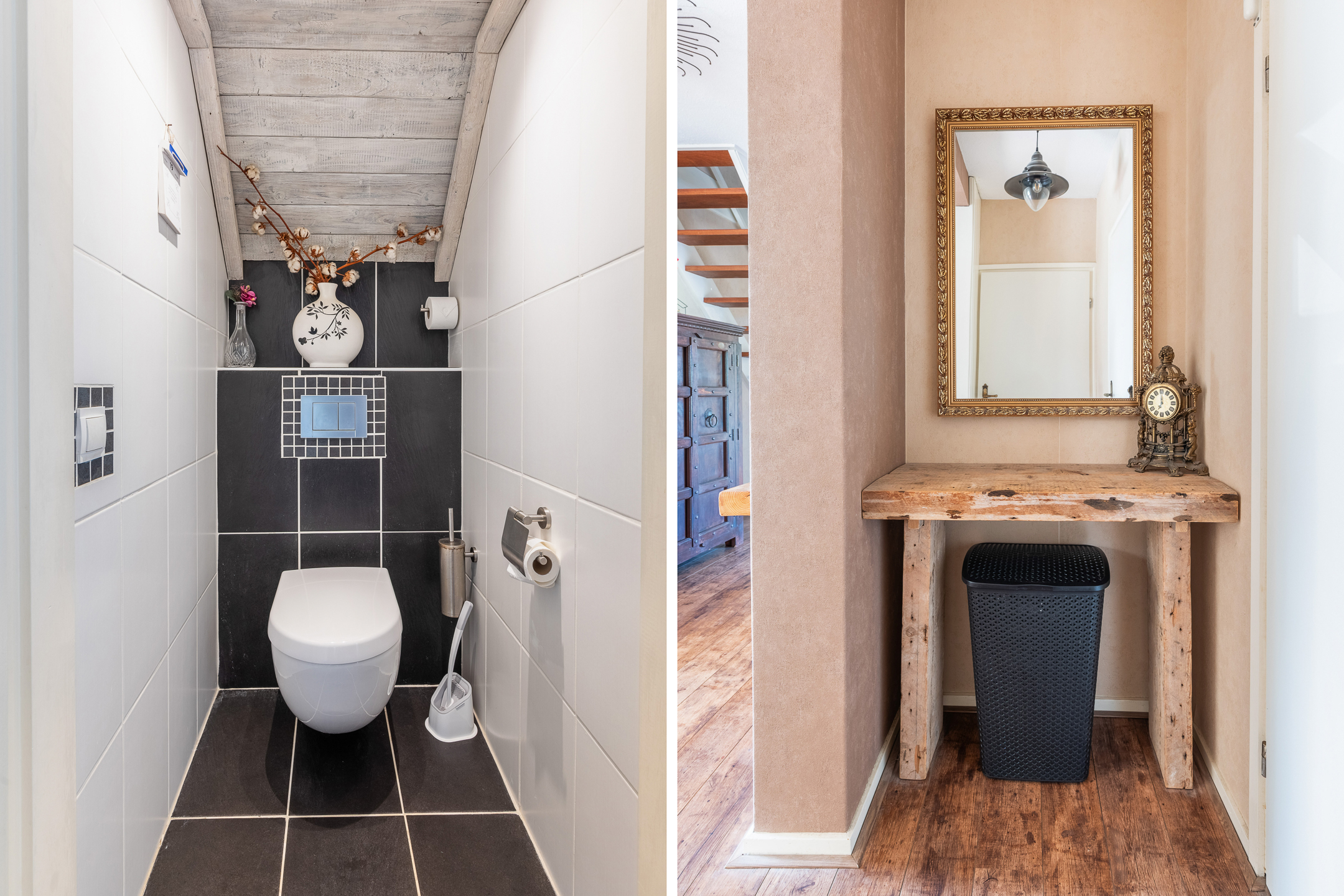 - Overloop met grote vaste kast, moderne toiletruimte en trapopgang naar de tweede verdieping.