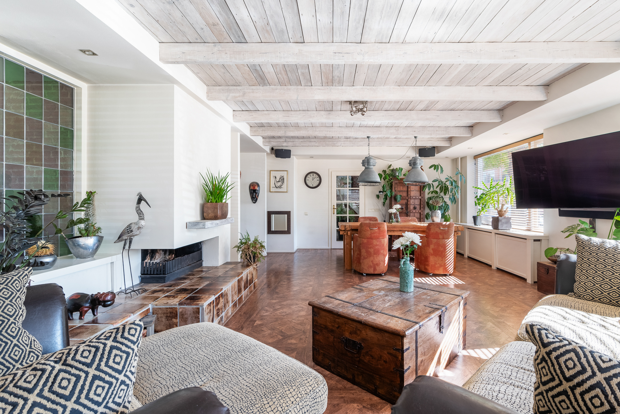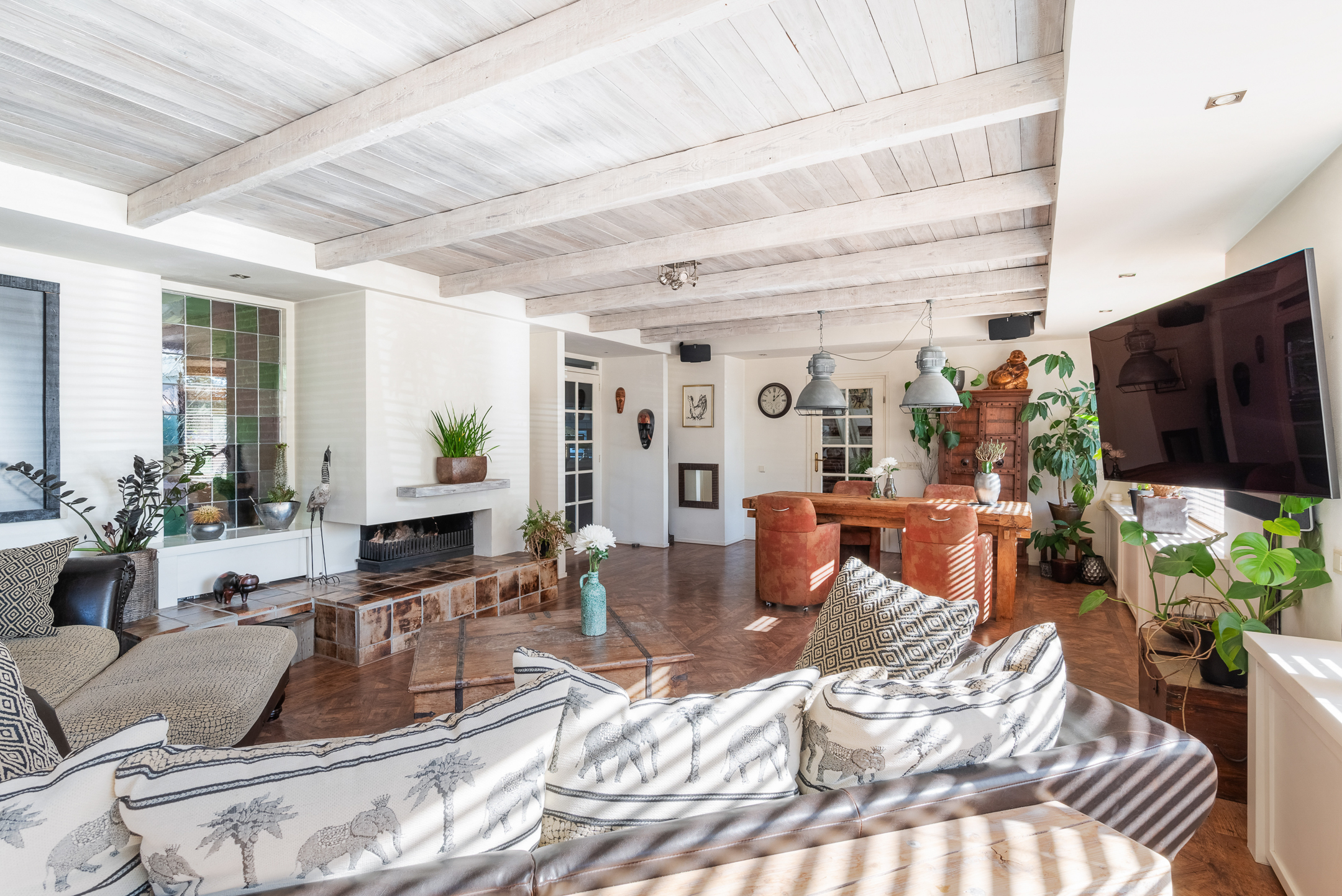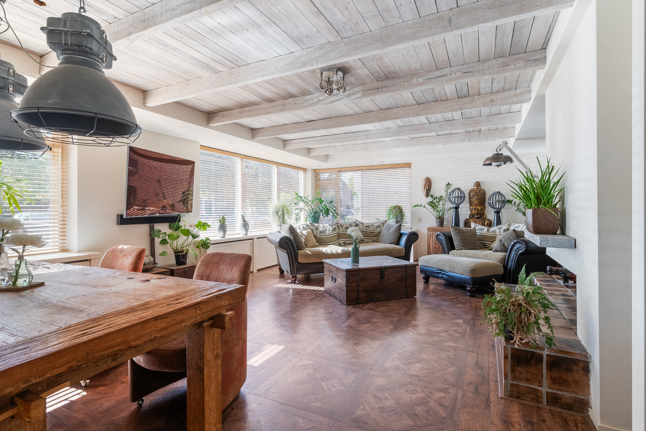 - Royale woonkamer met mooie laminaat vloer, balkenplafond, sfeervolle gas/houthaard en grote raampartijen.