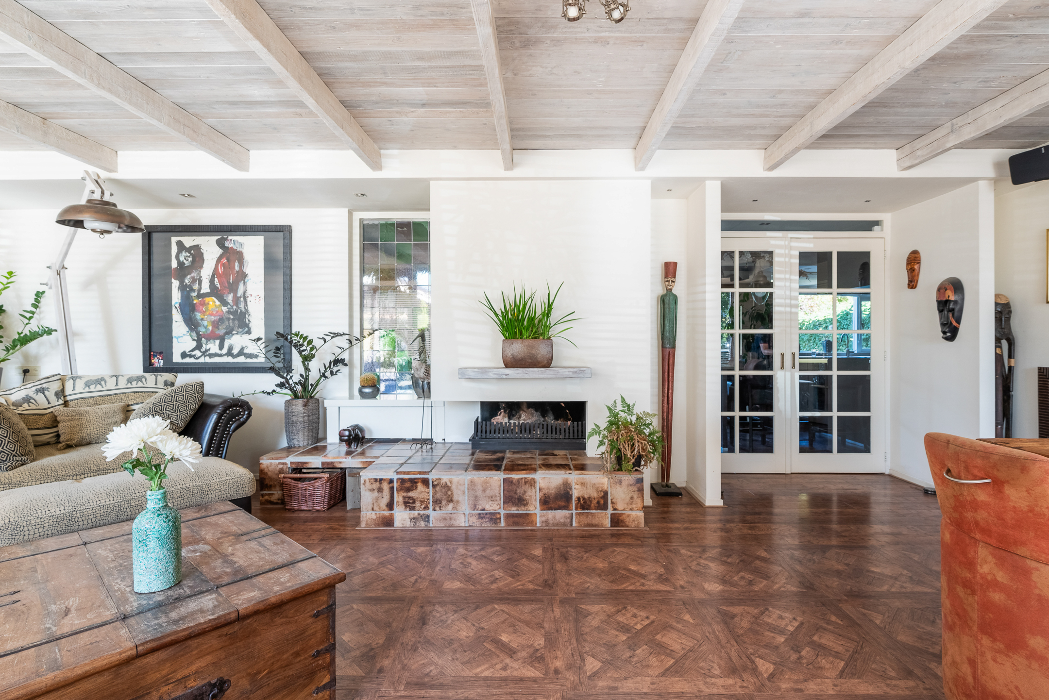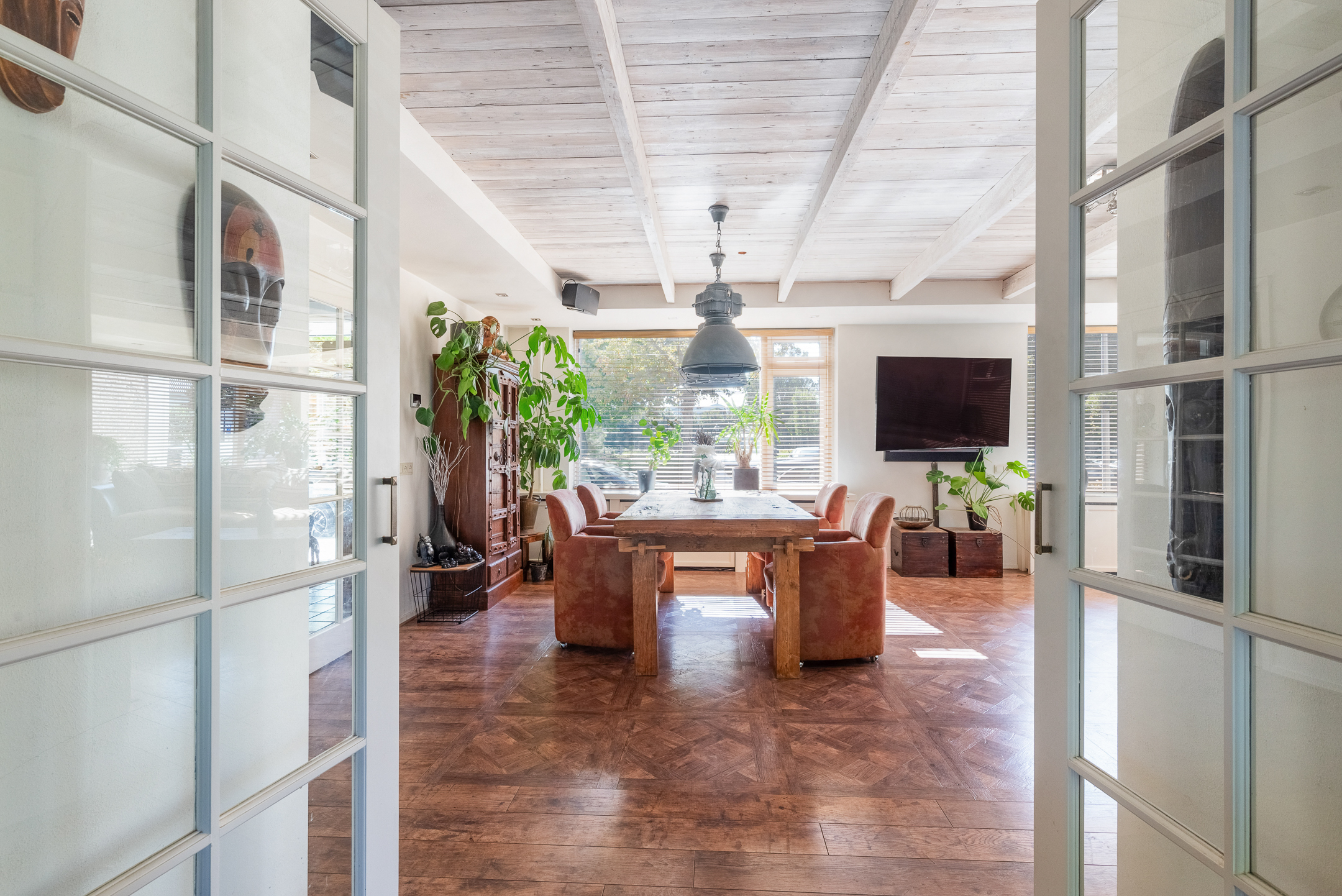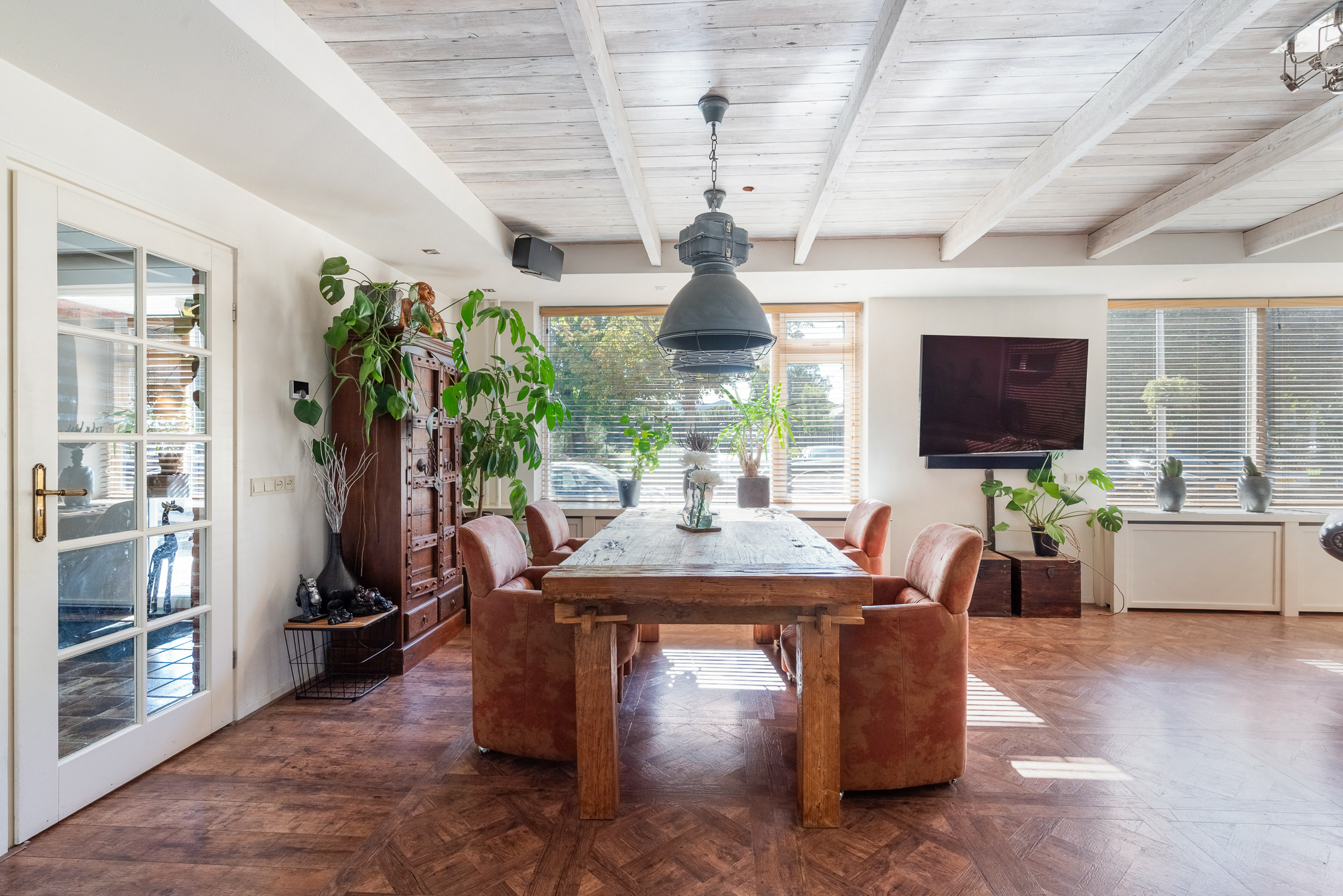 - Royale woonkamer met mooie laminaat vloer, balkenplafond, sfeervolle gas/houthaard en grote raampartijen.