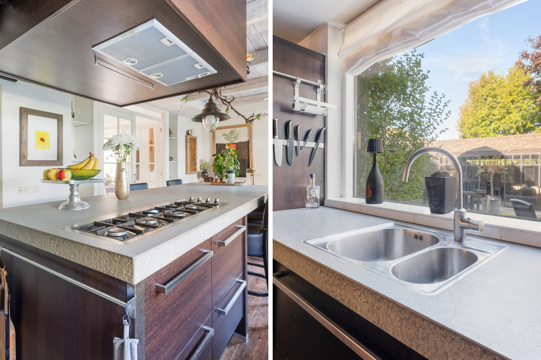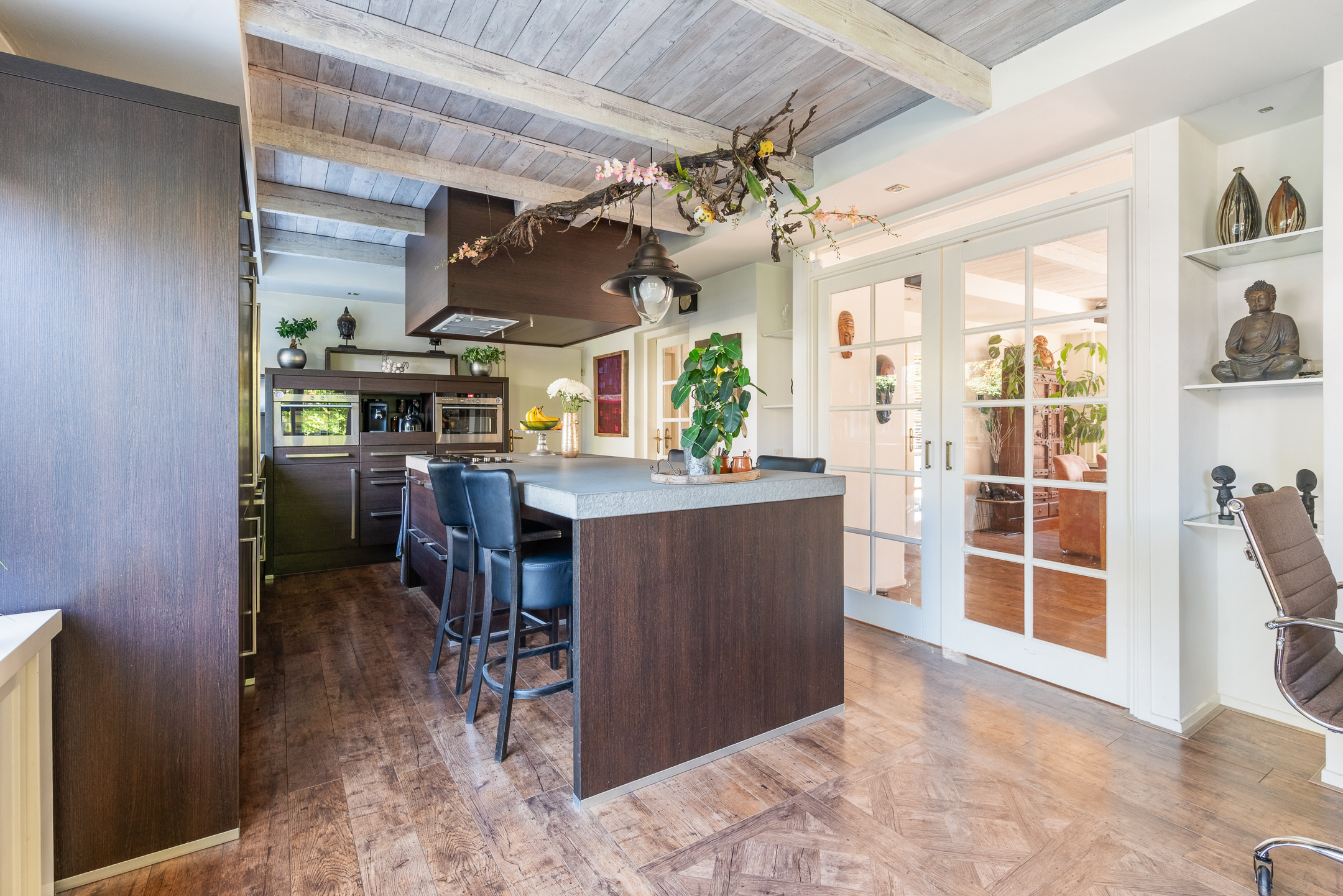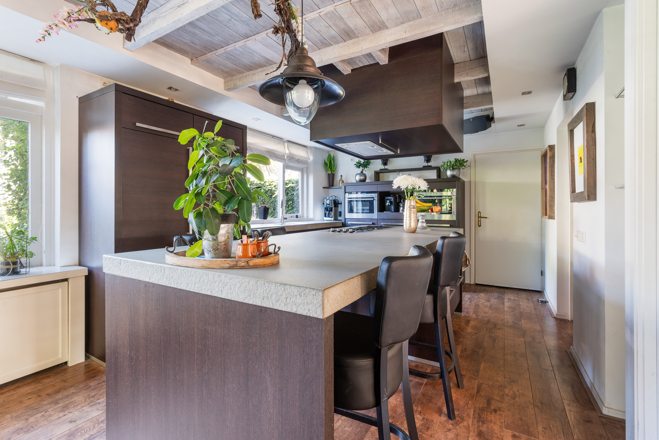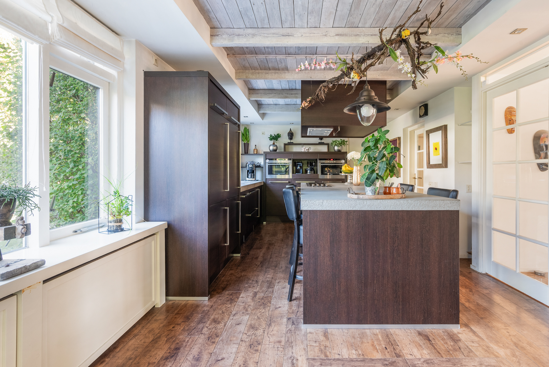 - Luxe woonkeuken voorzien van kookeiland, diverse inbouwapparatuur en grote raampartijen met fraai zicht over de achtertuin.