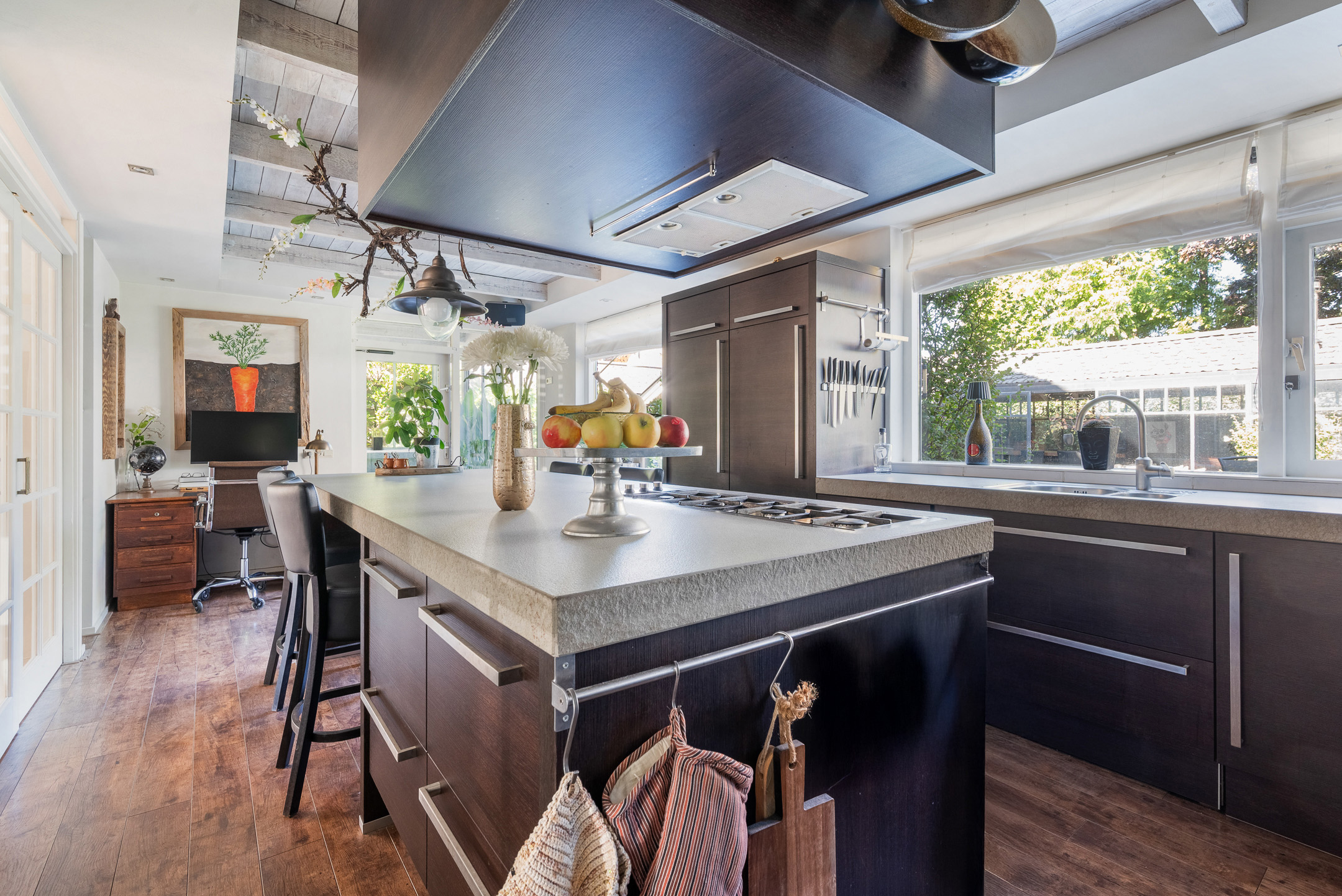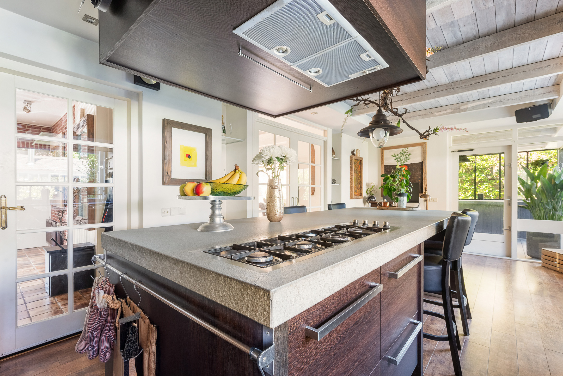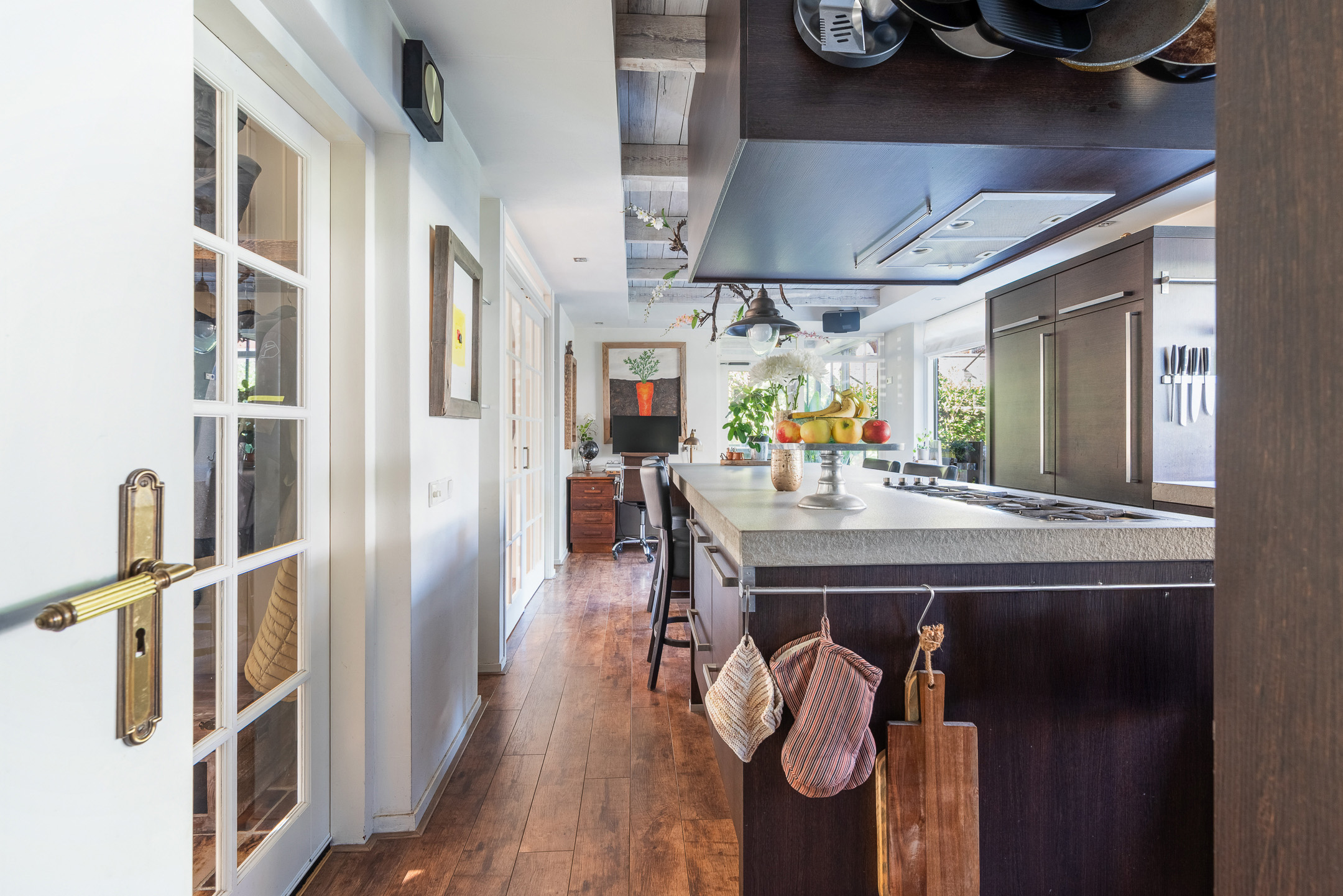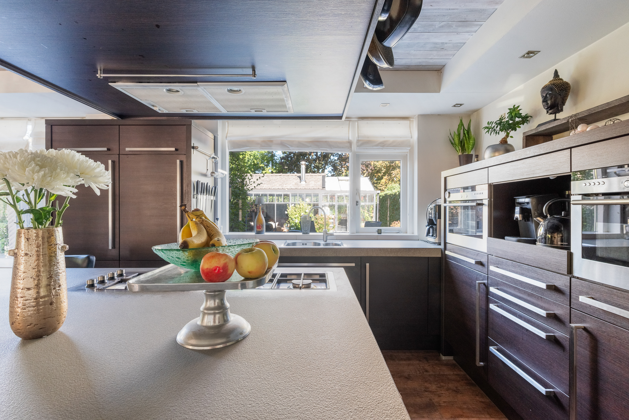 - Luxe woonkeuken voorzien van kookeiland, diverse inbouwapparatuur en grote raampartijen met fraai zicht over de achtertuin.