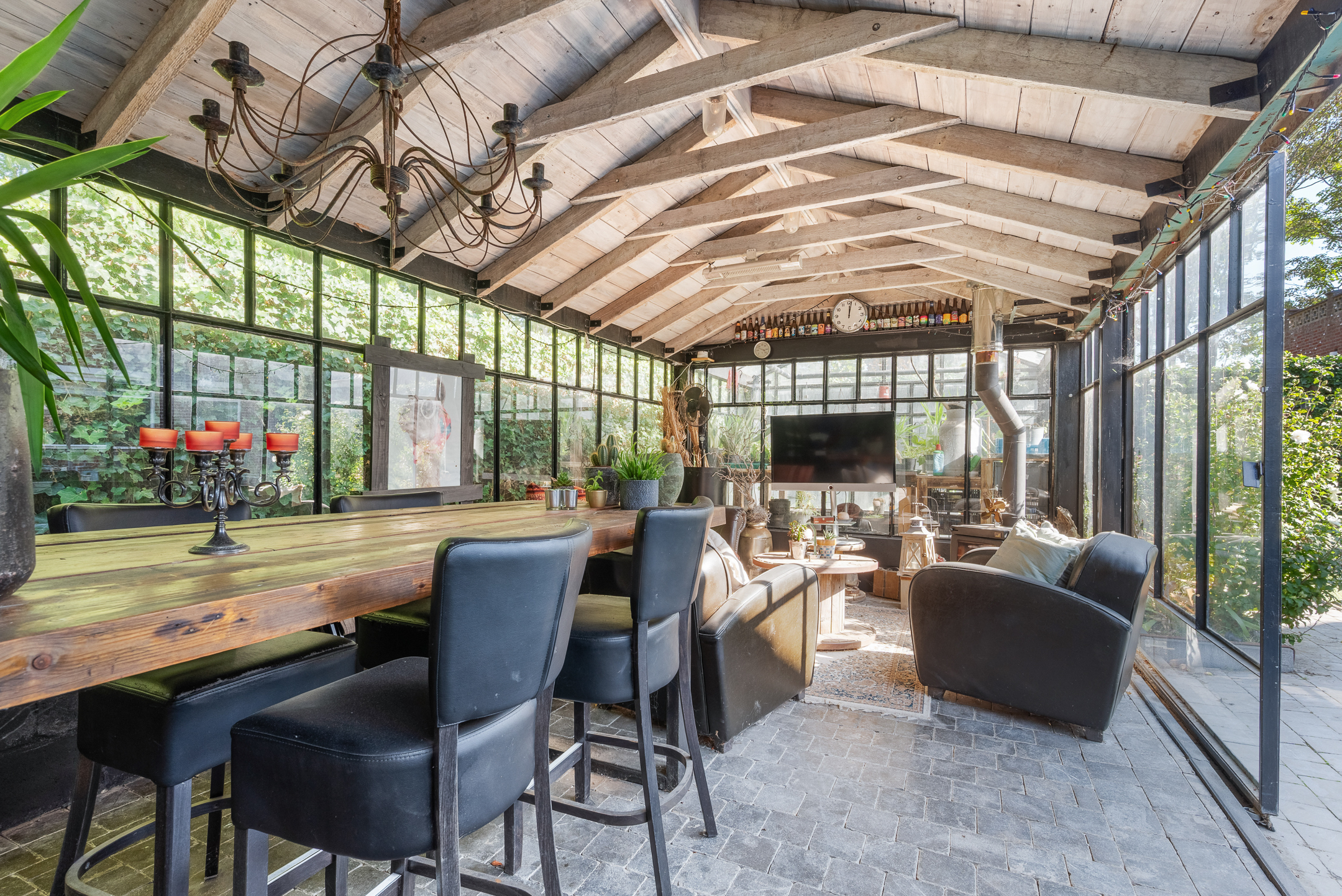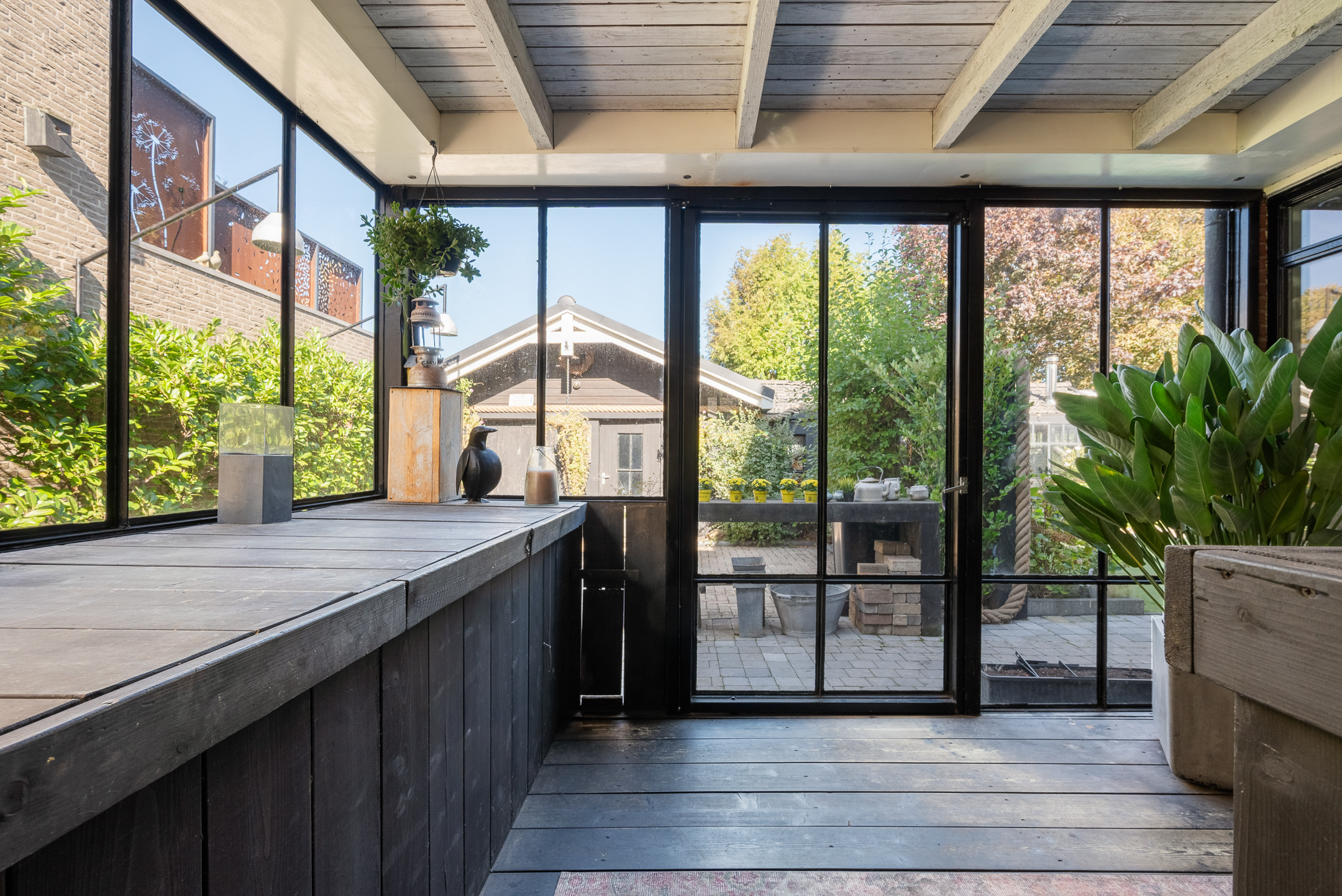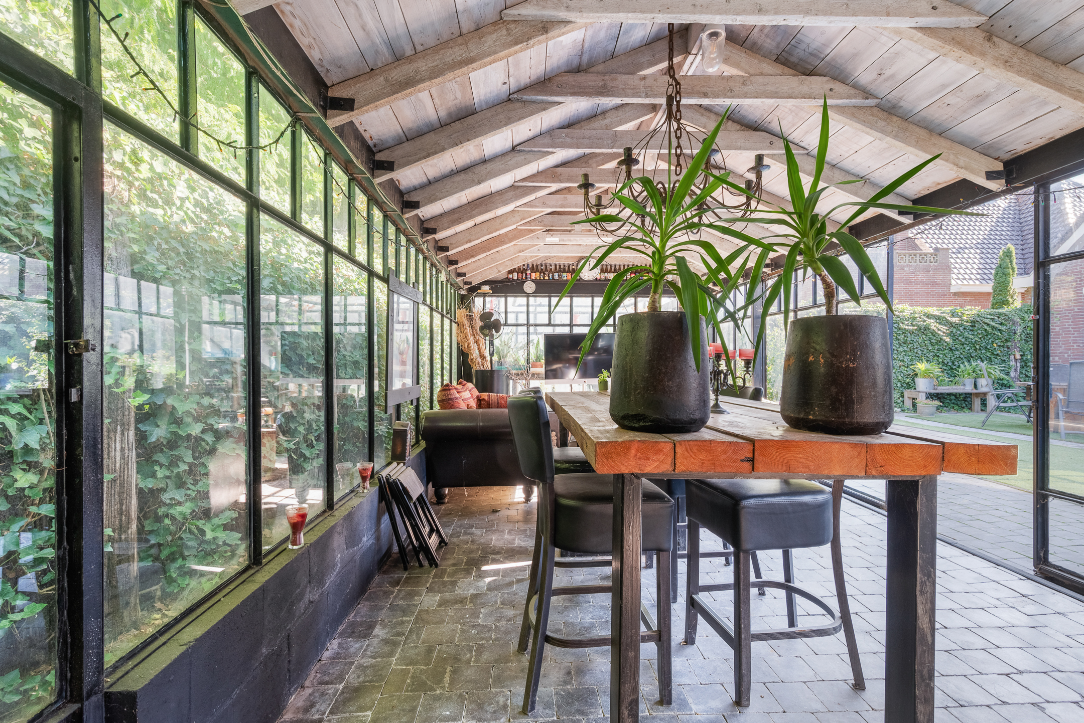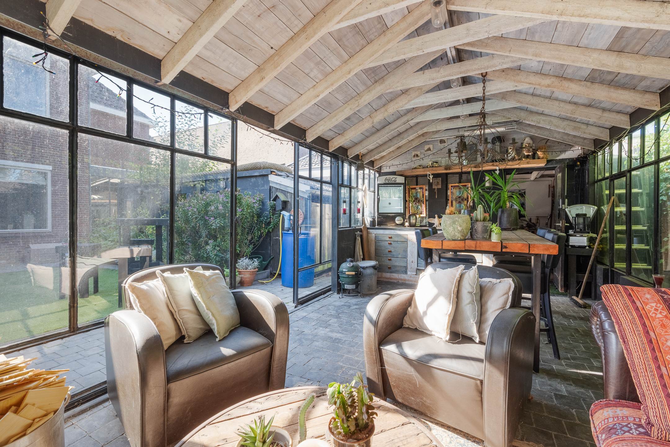- Gezellige tuingerichte serre met veel ramen en toegang tot de achtertuin.
