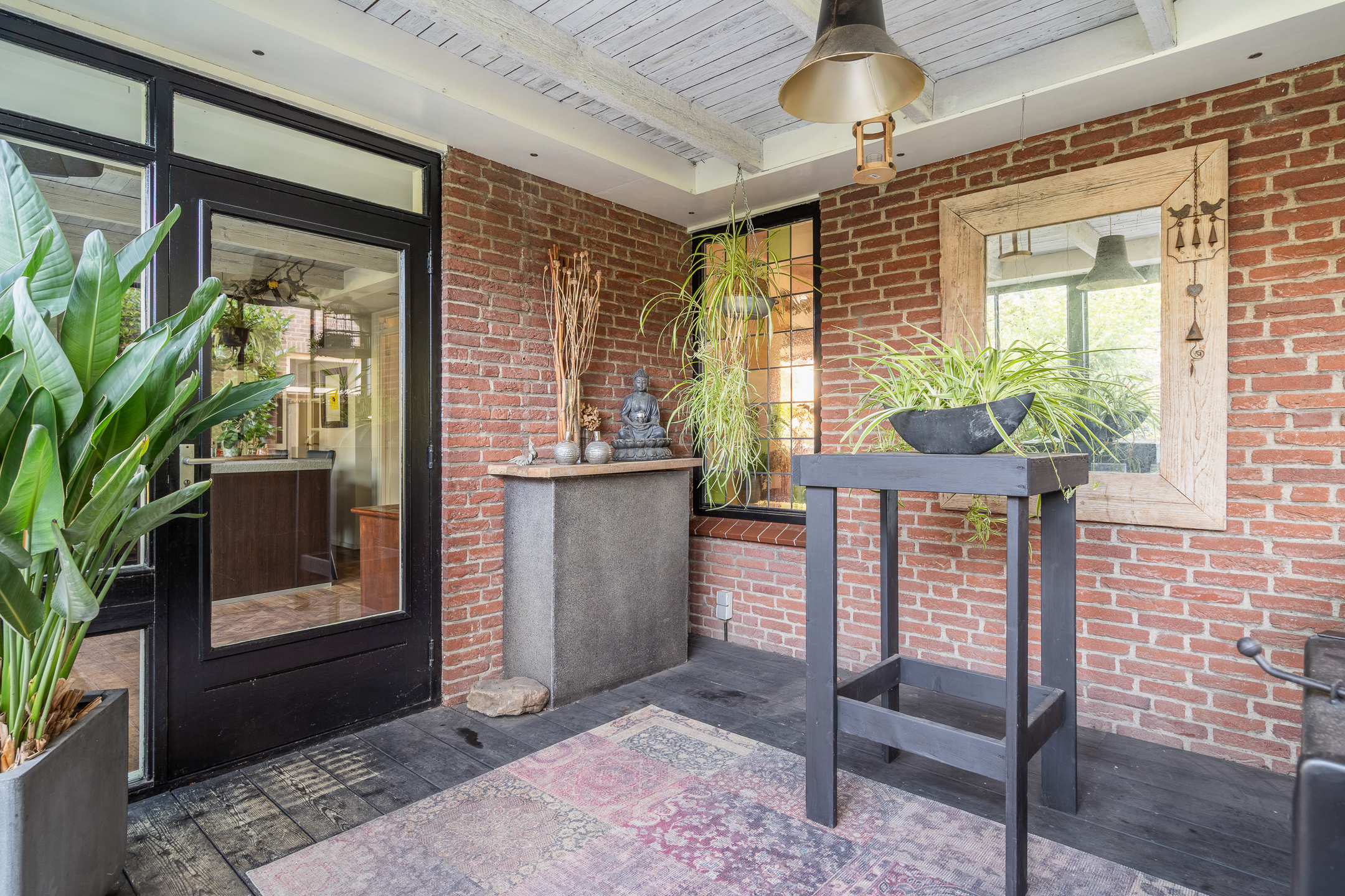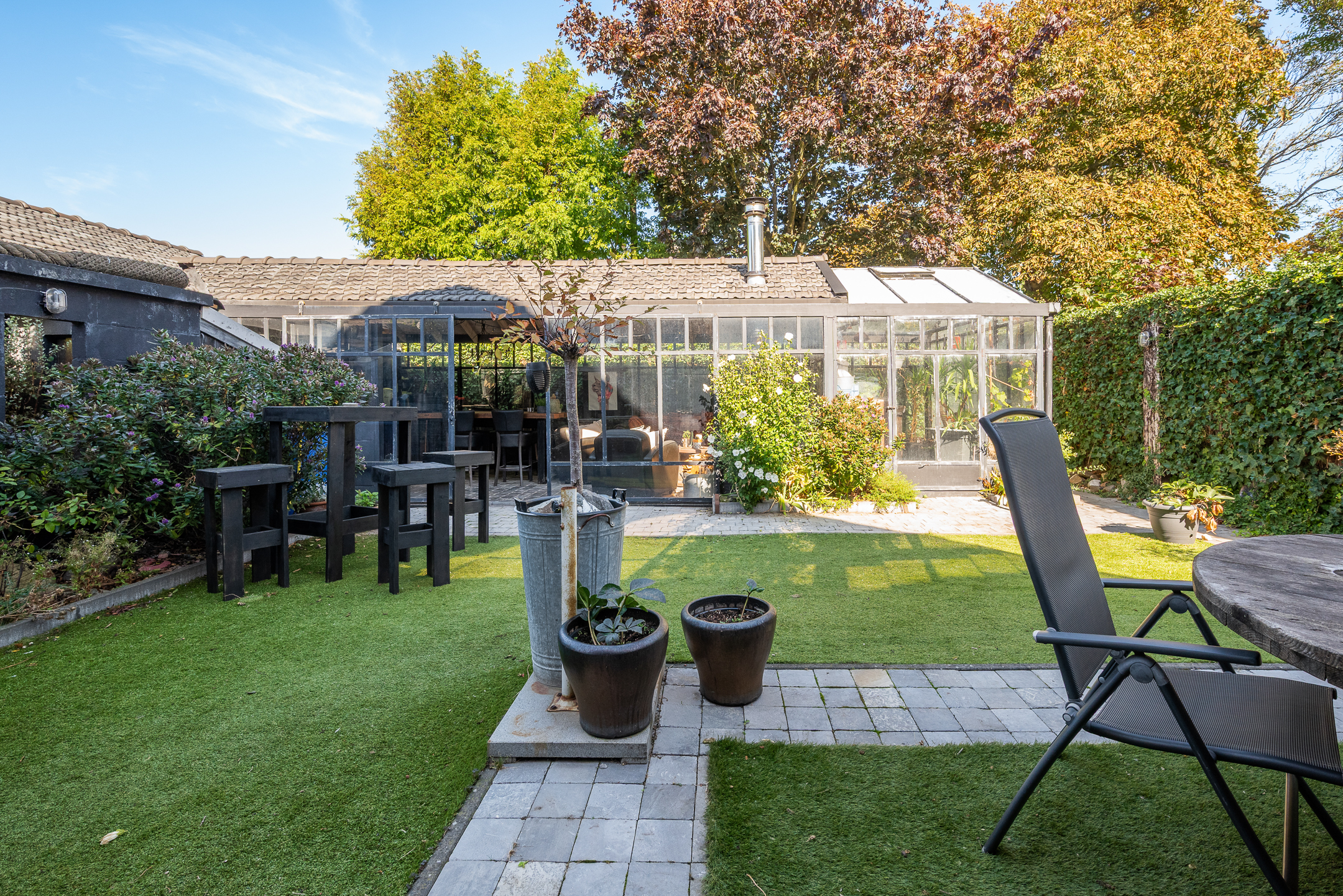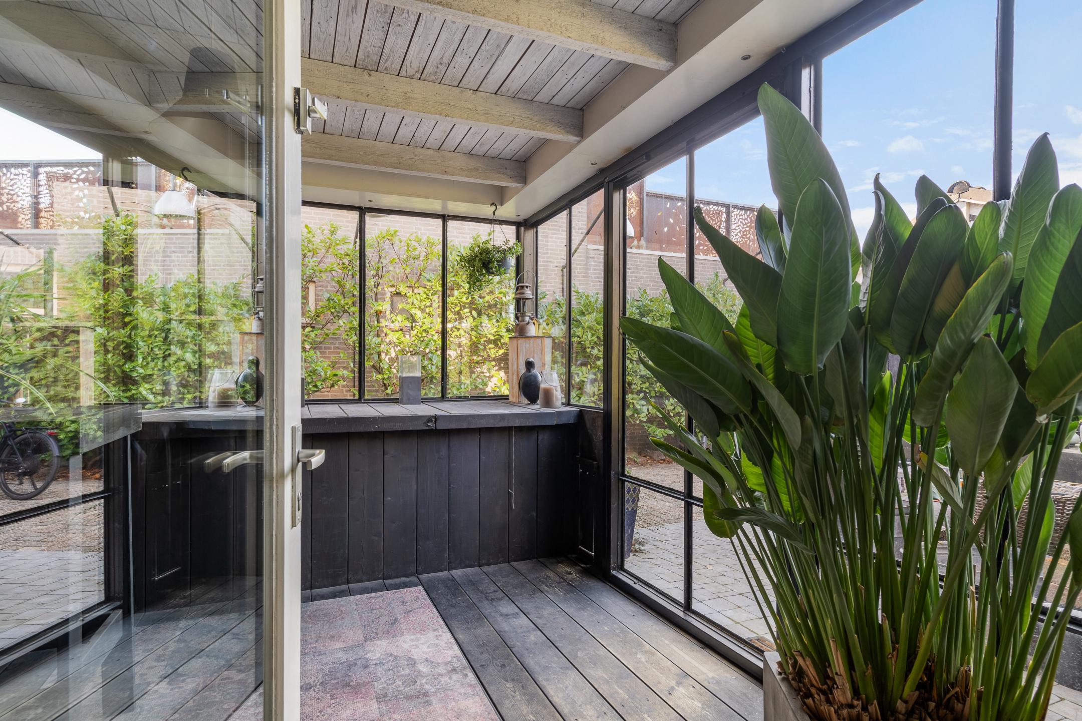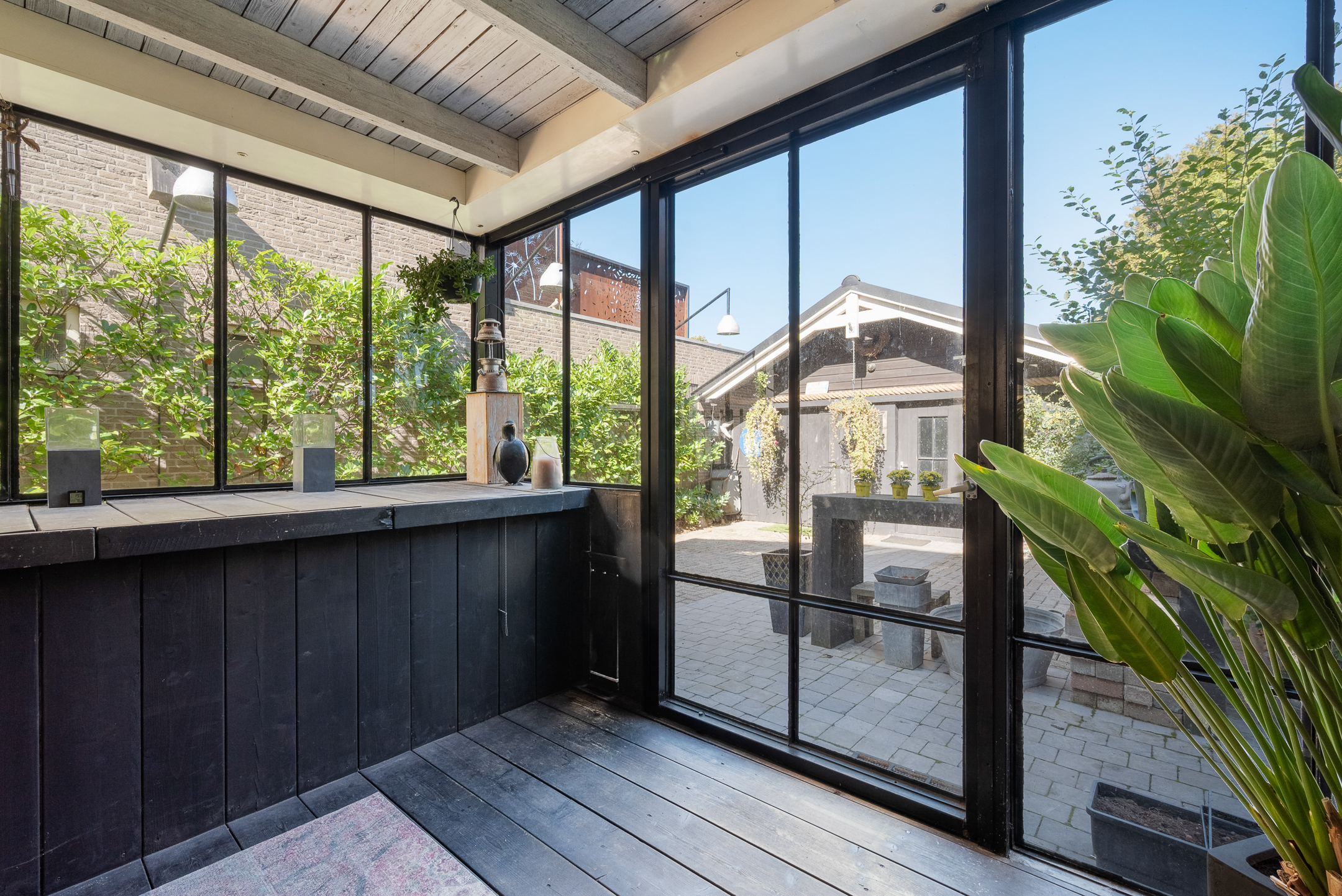 - Gezellige tuingerichte serre met veel ramen en toegang tot de achtertuin.