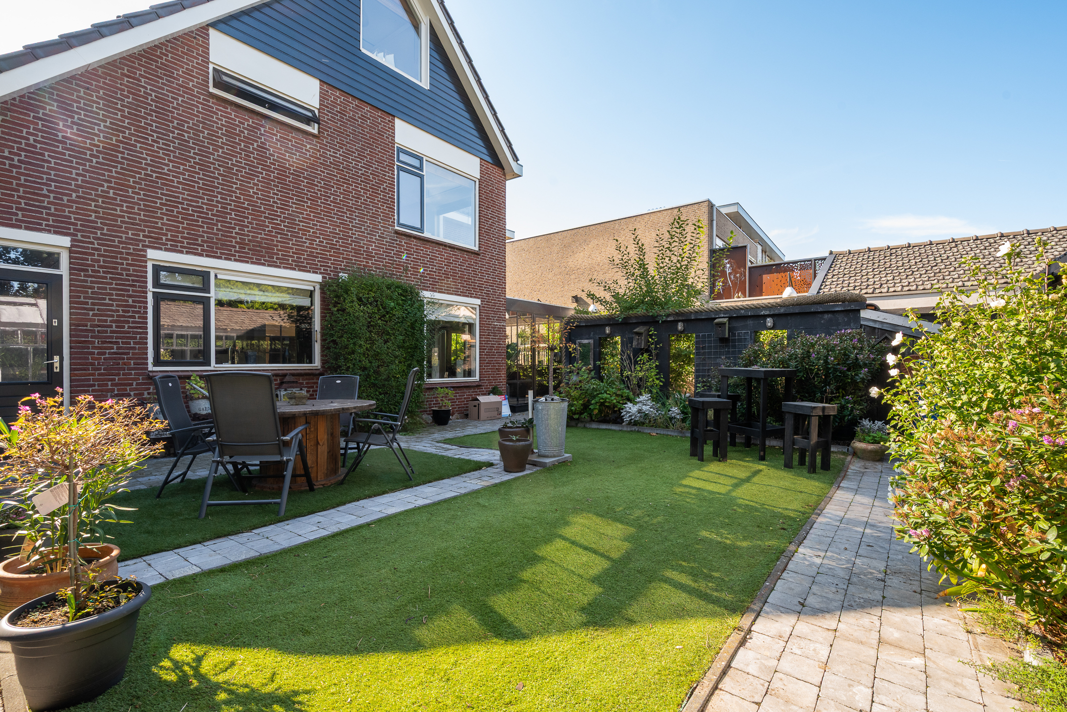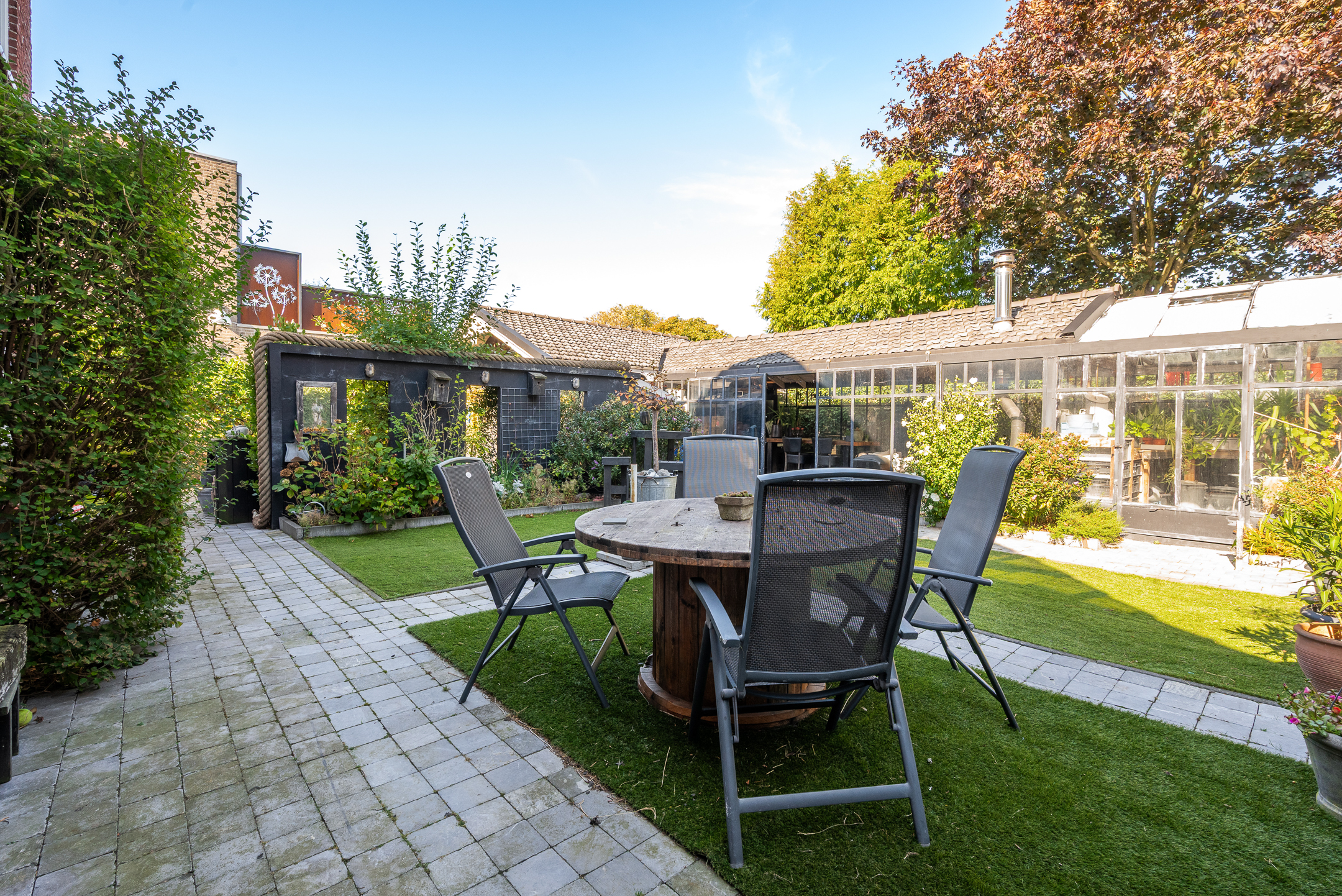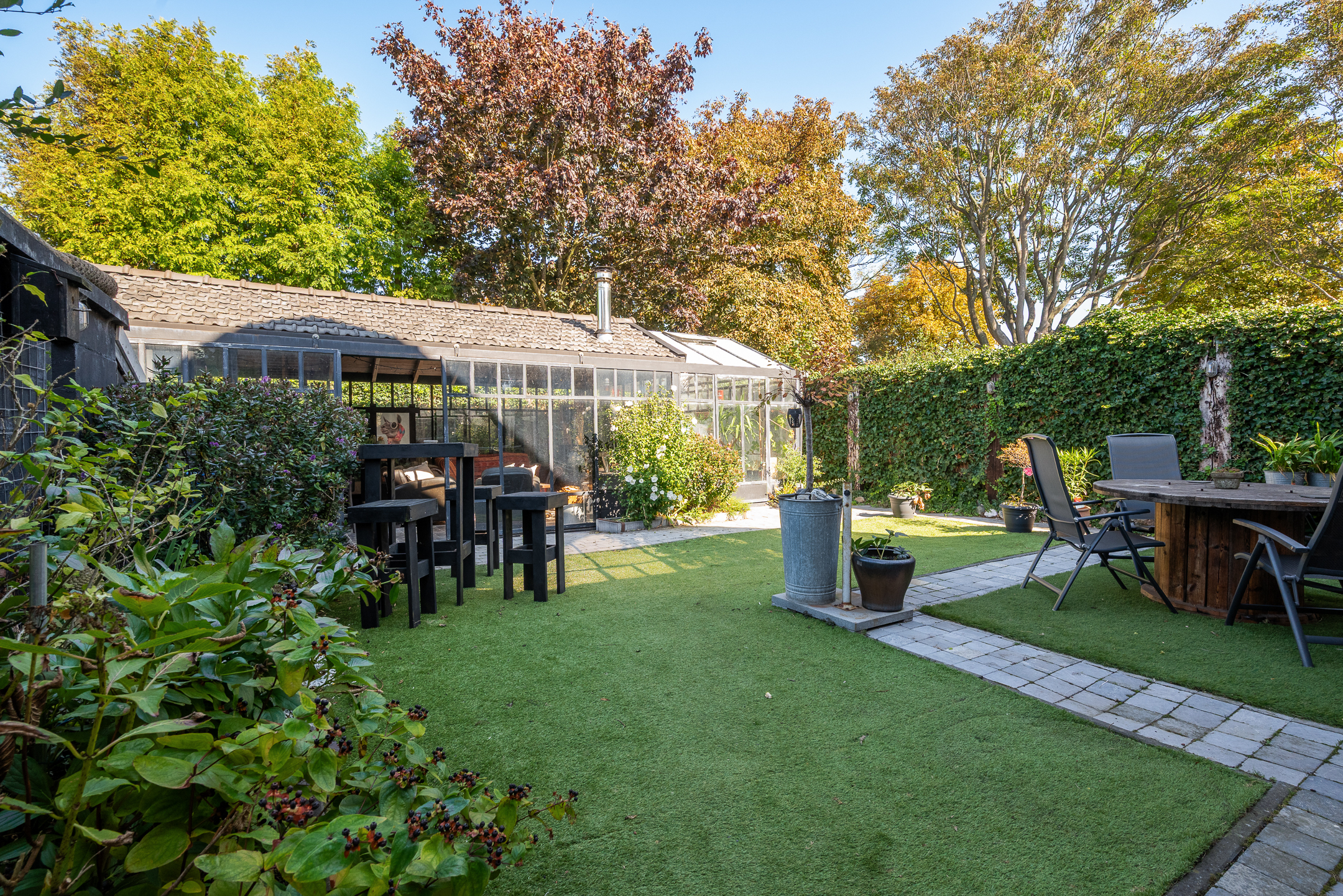 - Grote zonnige onderhoudsvriendelijk ingerichte achtertuin met groenborders, kunstgras, siertegels en hobbykasje.