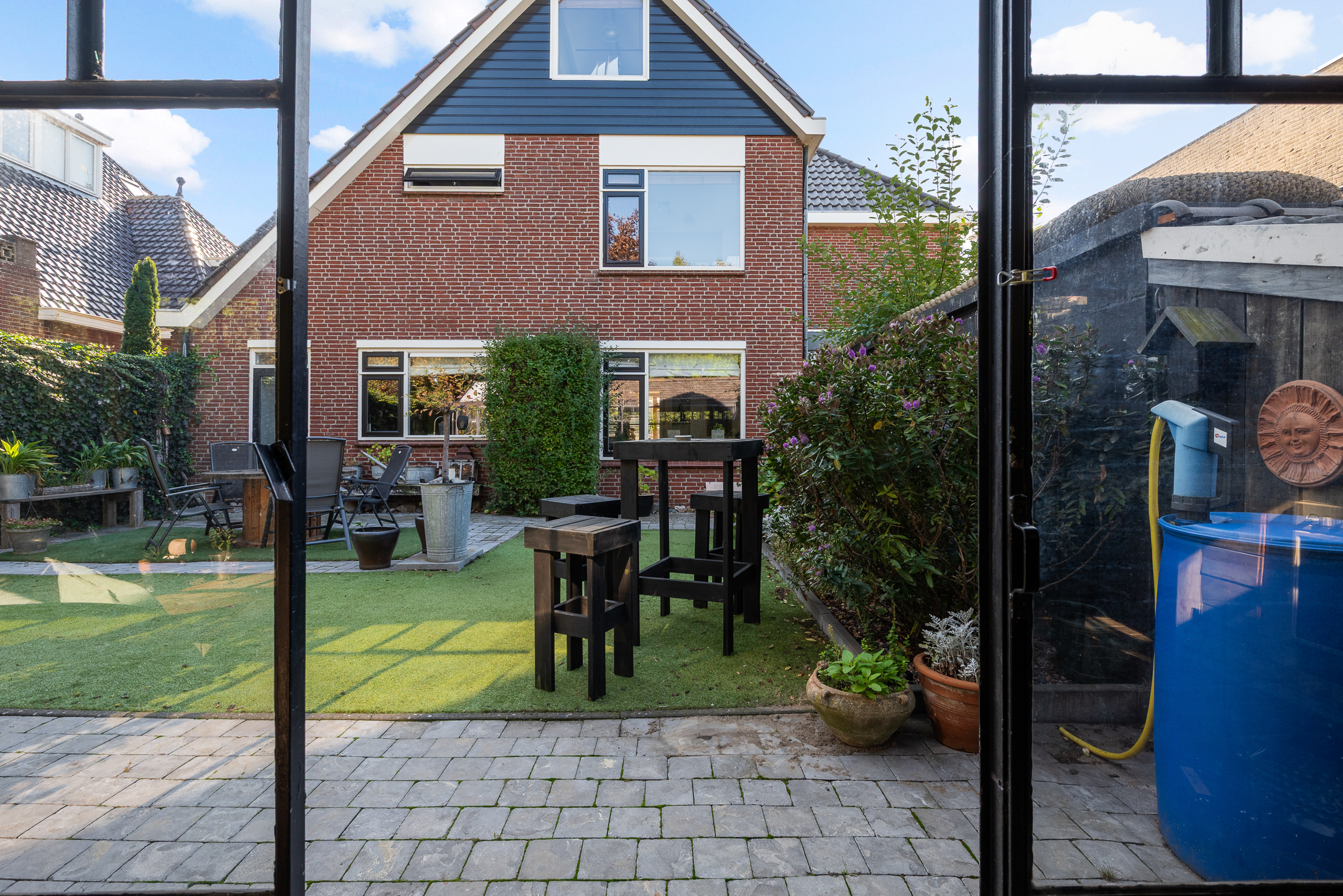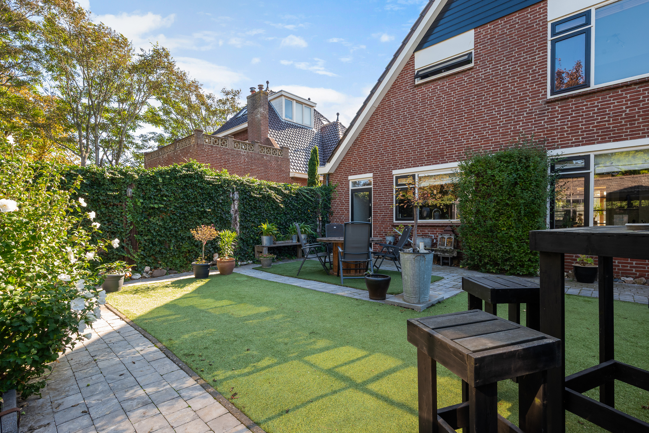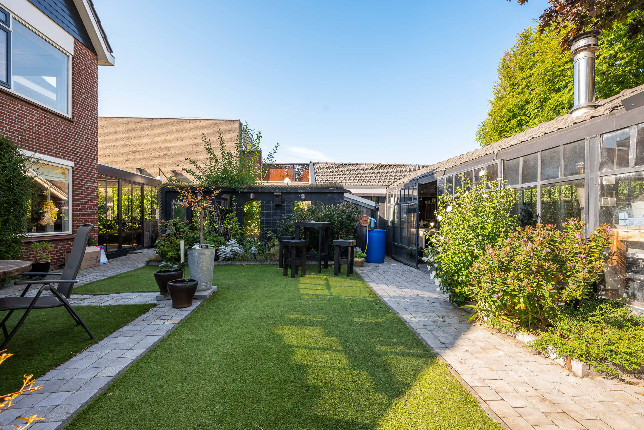 - Grote zonnige onderhoudsvriendelijk ingerichte achtertuin met groenborders, kunstgras, siertegels en hobbykasje.