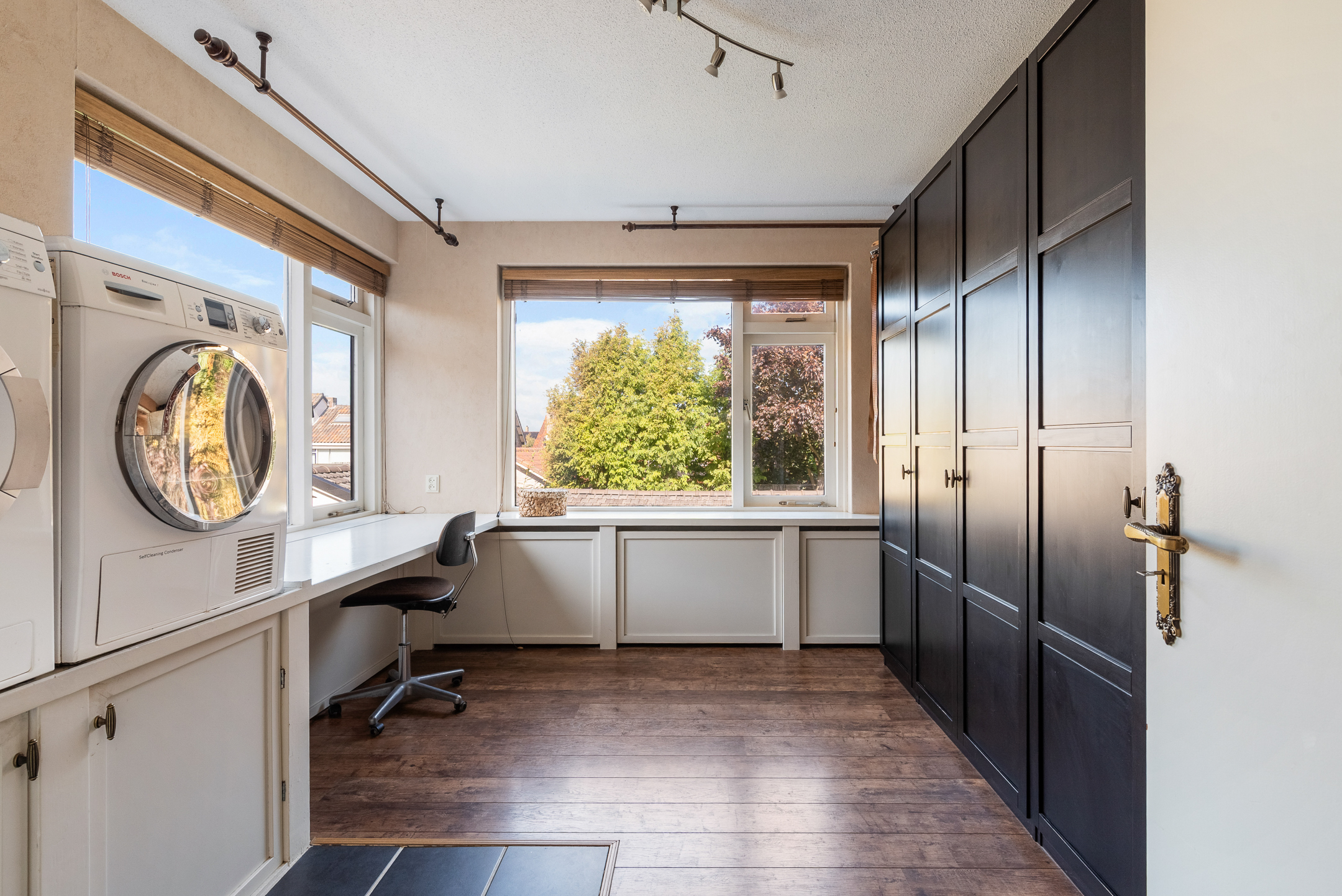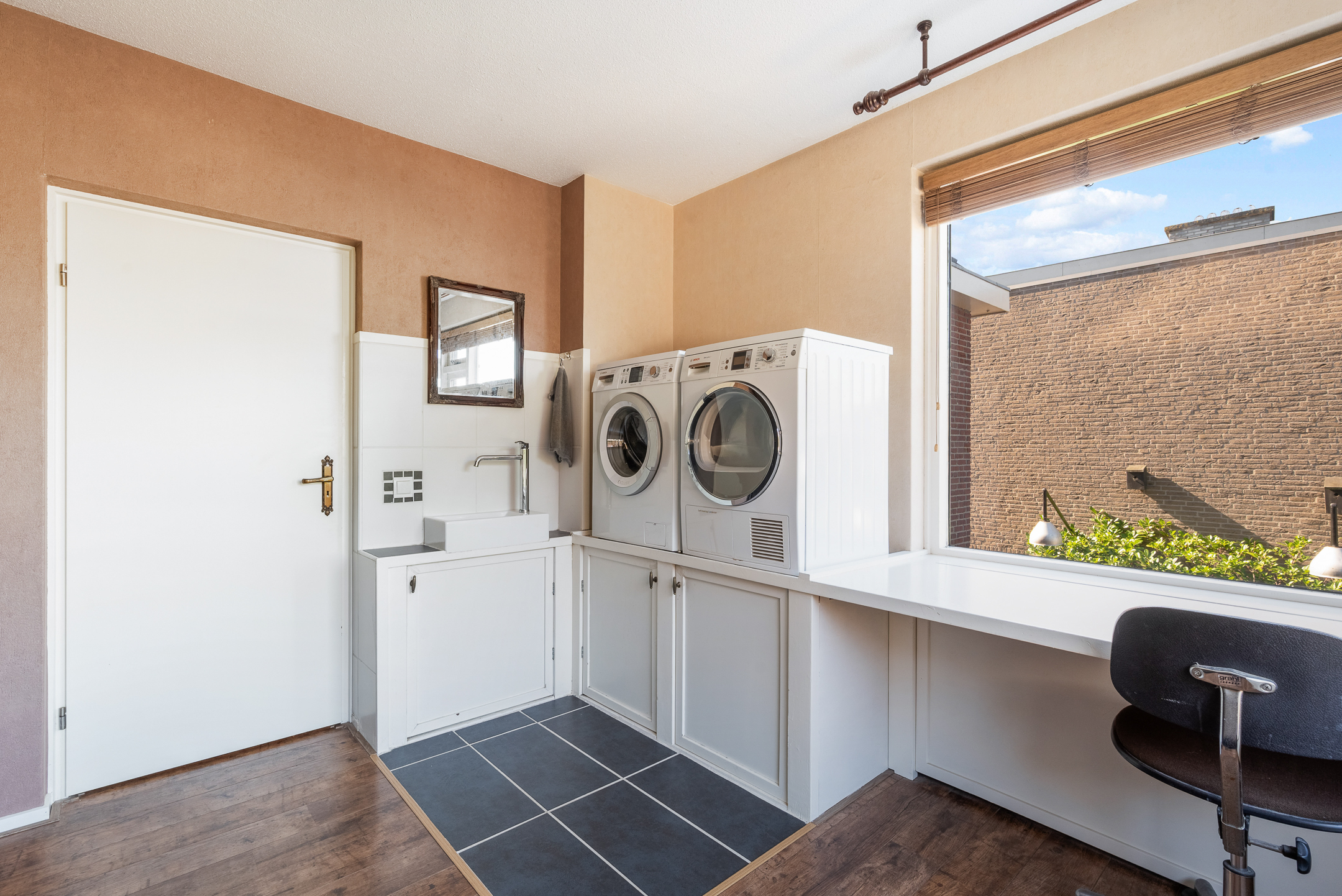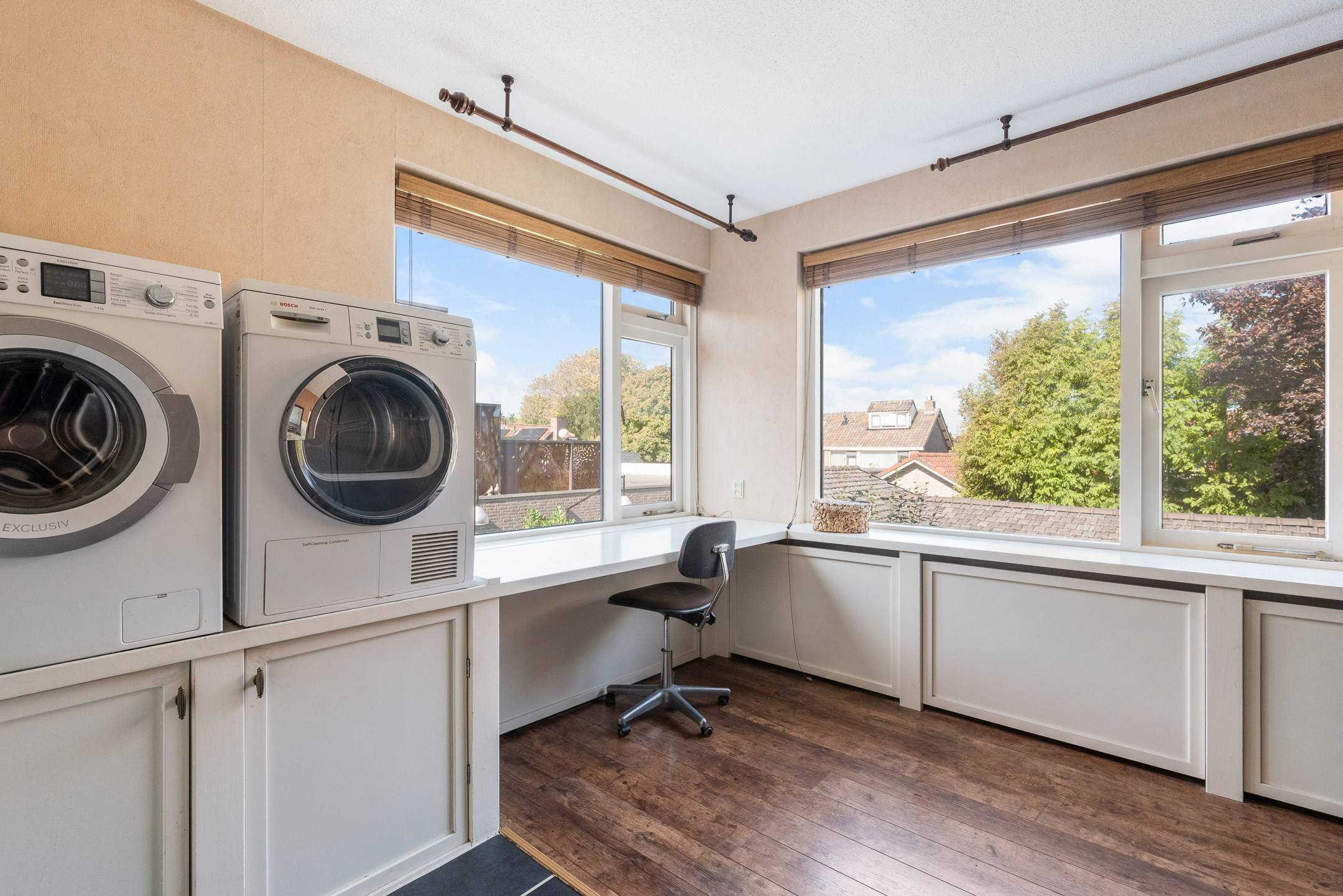 - Grote slaapkamer gelegen aan de achterzijde, momenteel in gebruik als wasruimte, met wasmachine-aansluiting, wastafel, laminaatvloer en grote raampartijen.