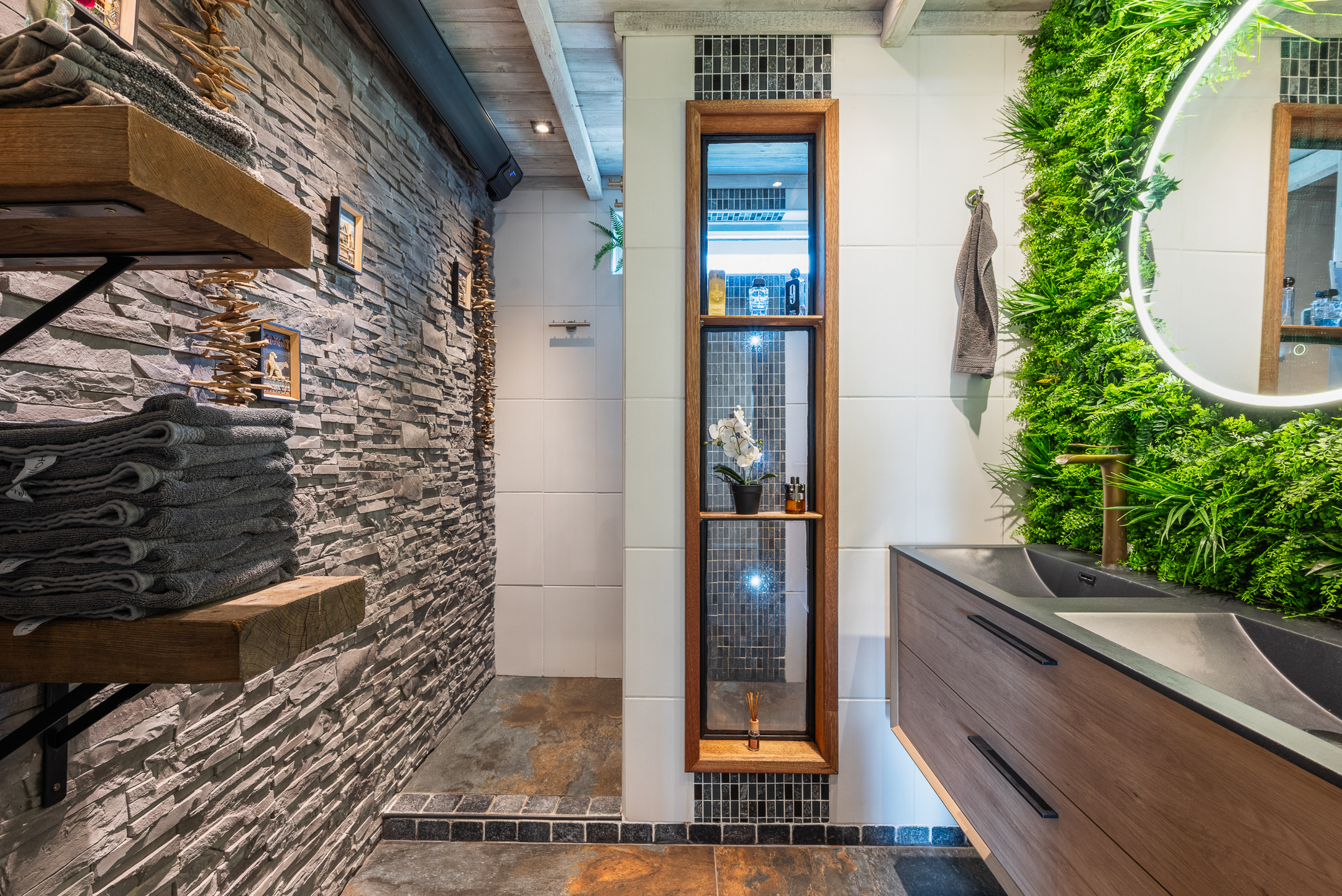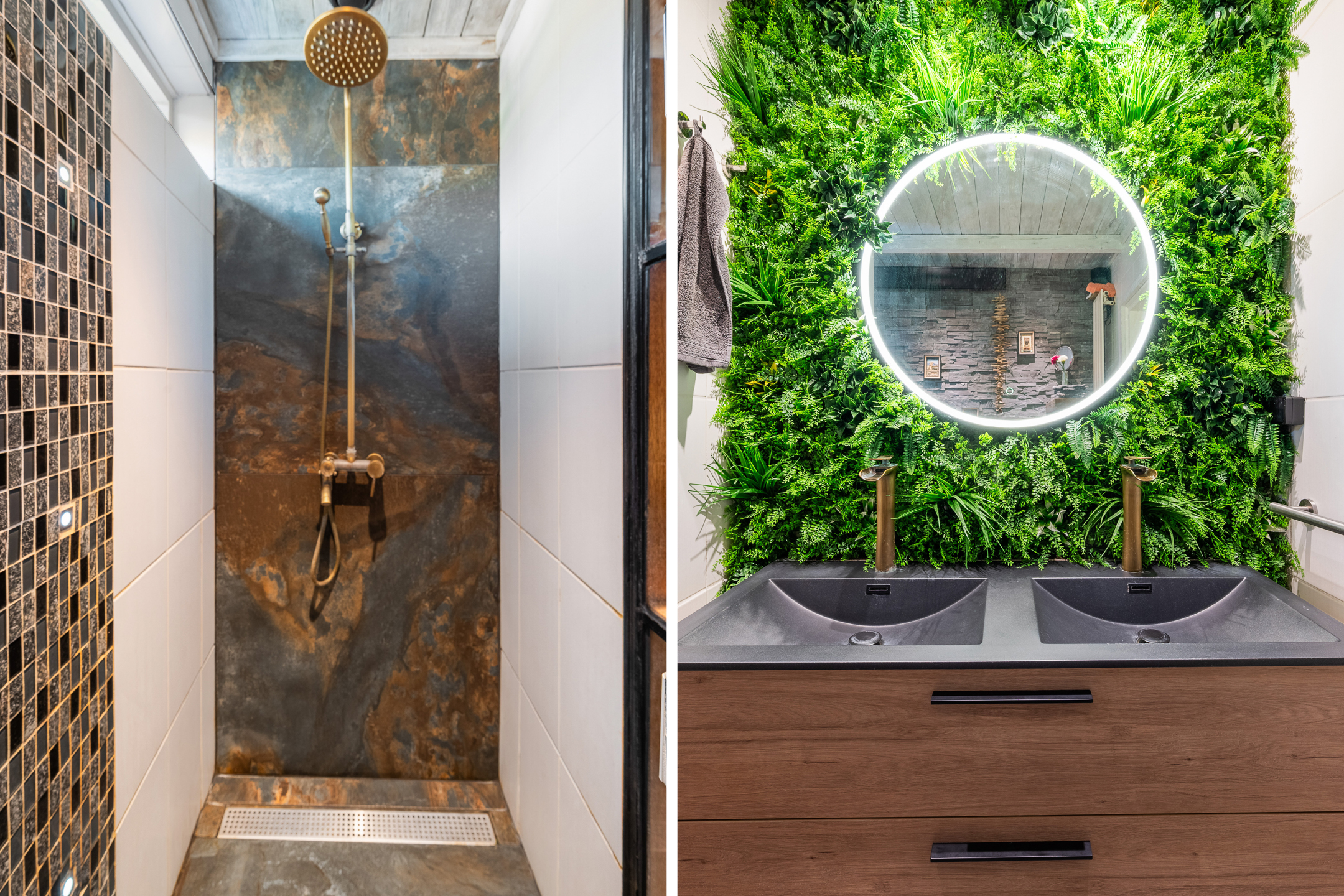 - Badkamervoorzieningen Douche, dubbele wastafel, inloopdouche