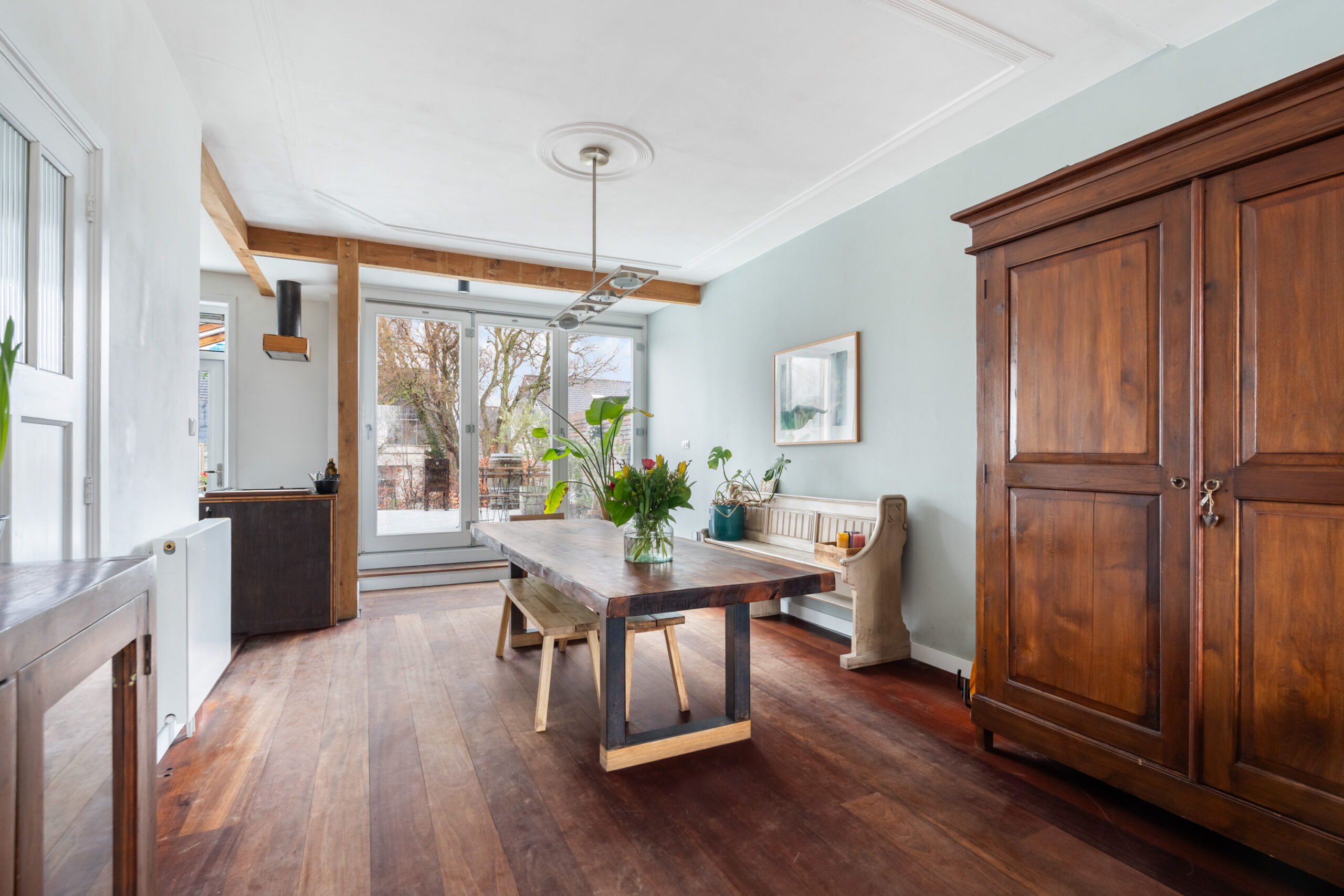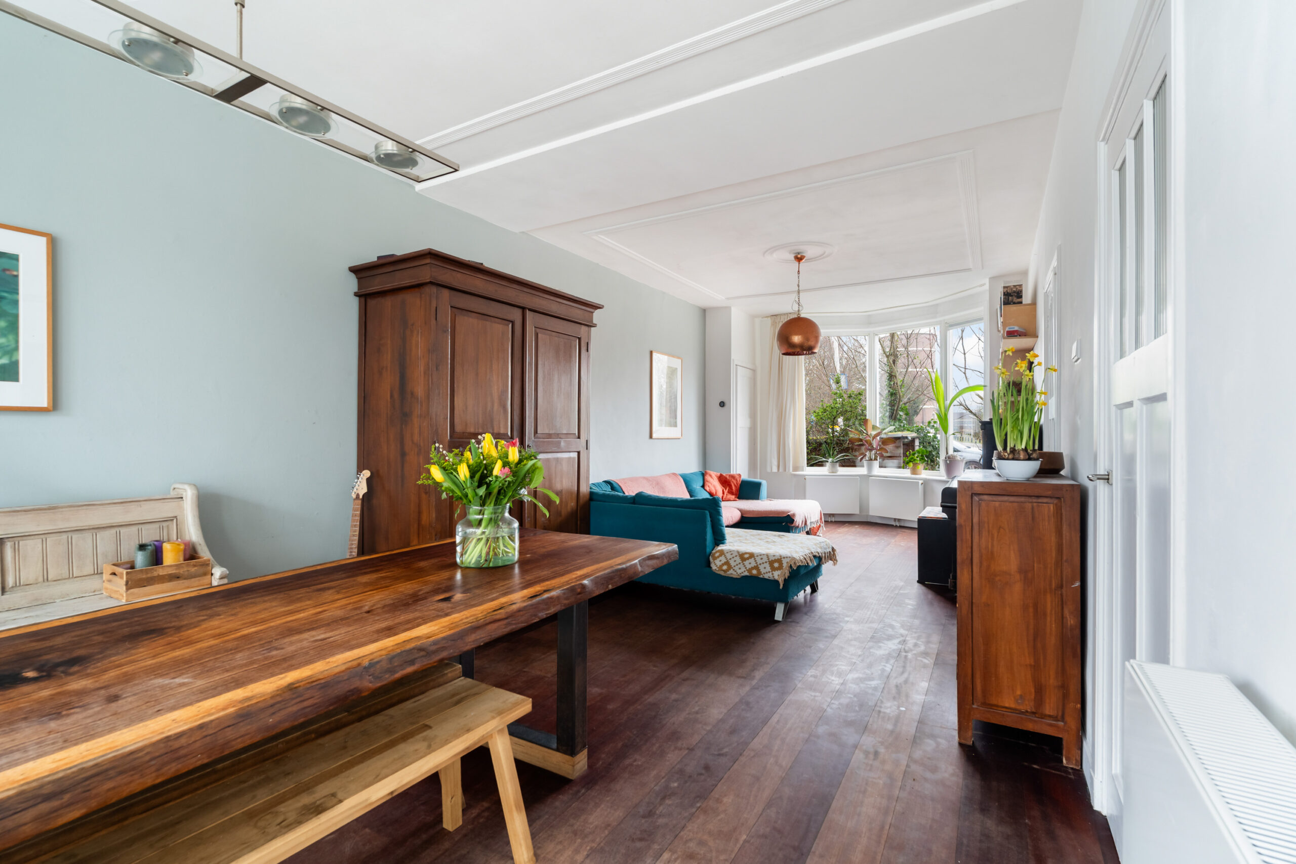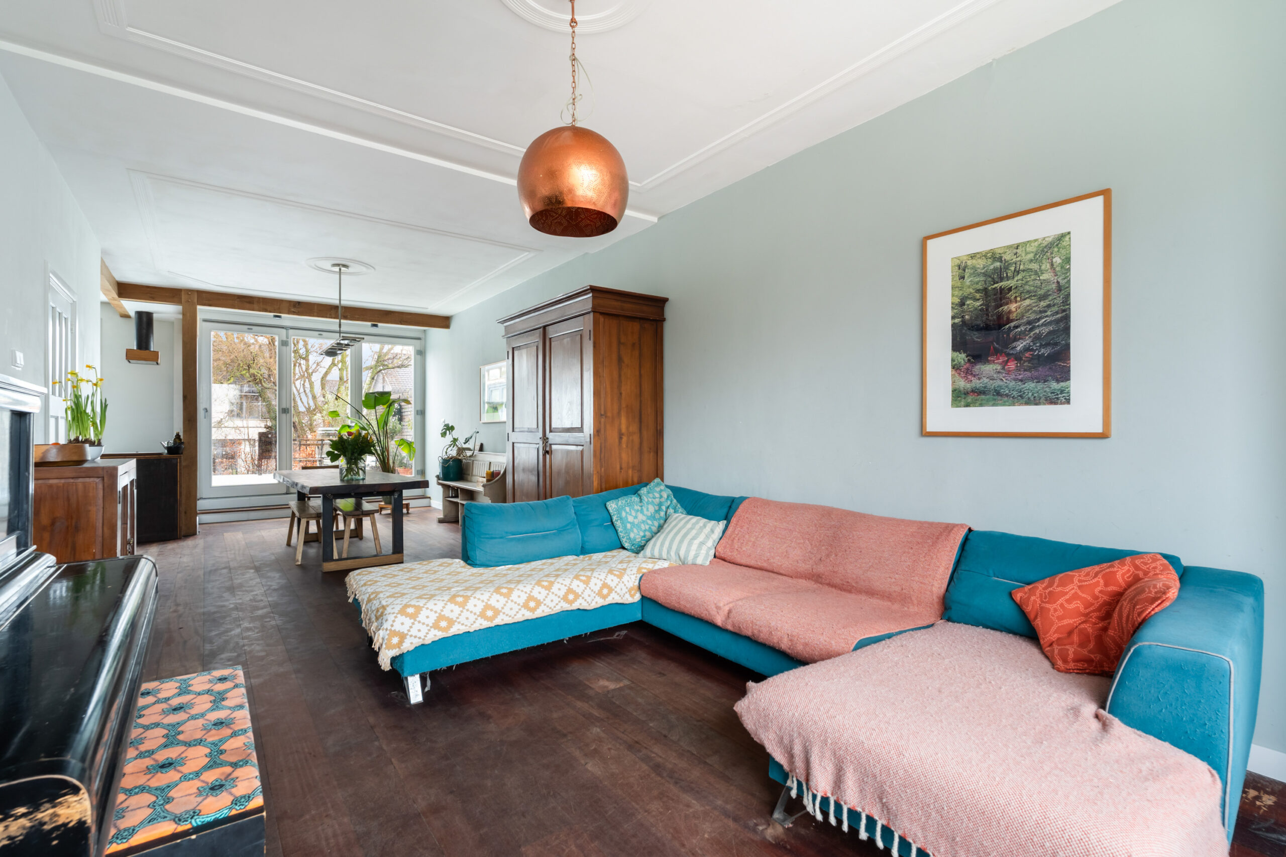 – In 2020 uitgebouwde woonkamer met sfeervolle erker aan de voorzijde en prachtig uitzicht op de Watertoren, houten vloerdelen van jatoba hardhout, gestuct plafond en harmonicadeuren naar het achterterras met een vrije opening van circa 3 meter
